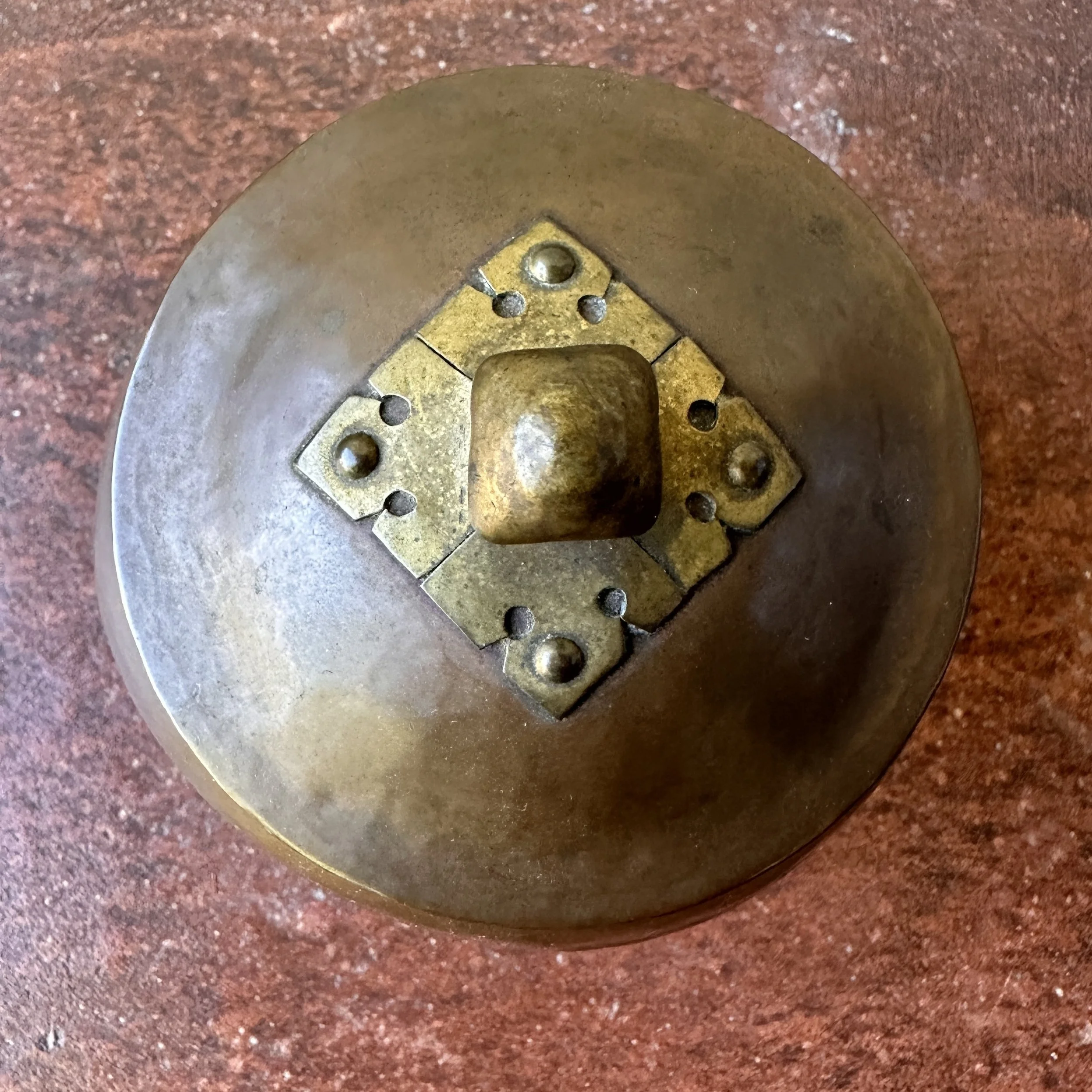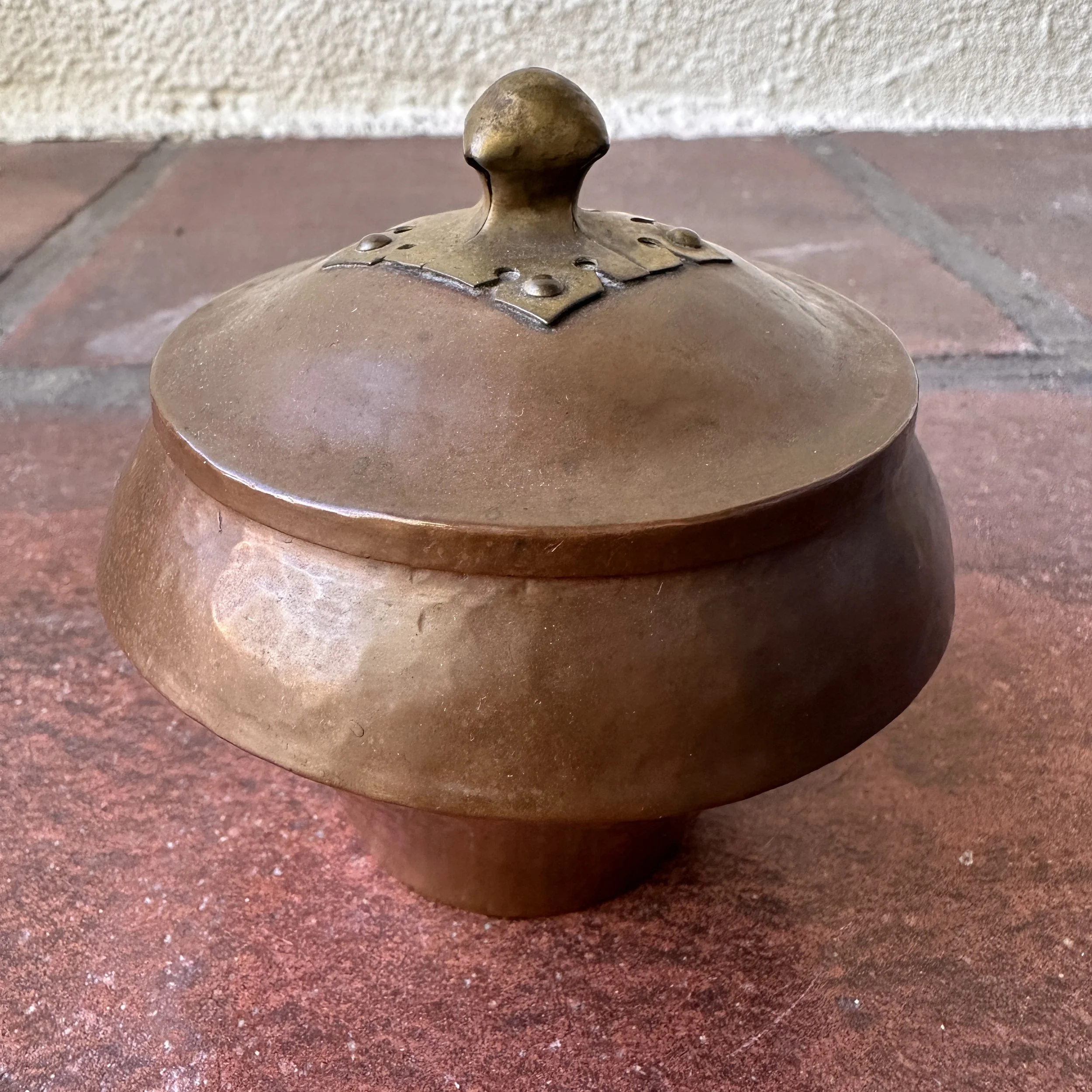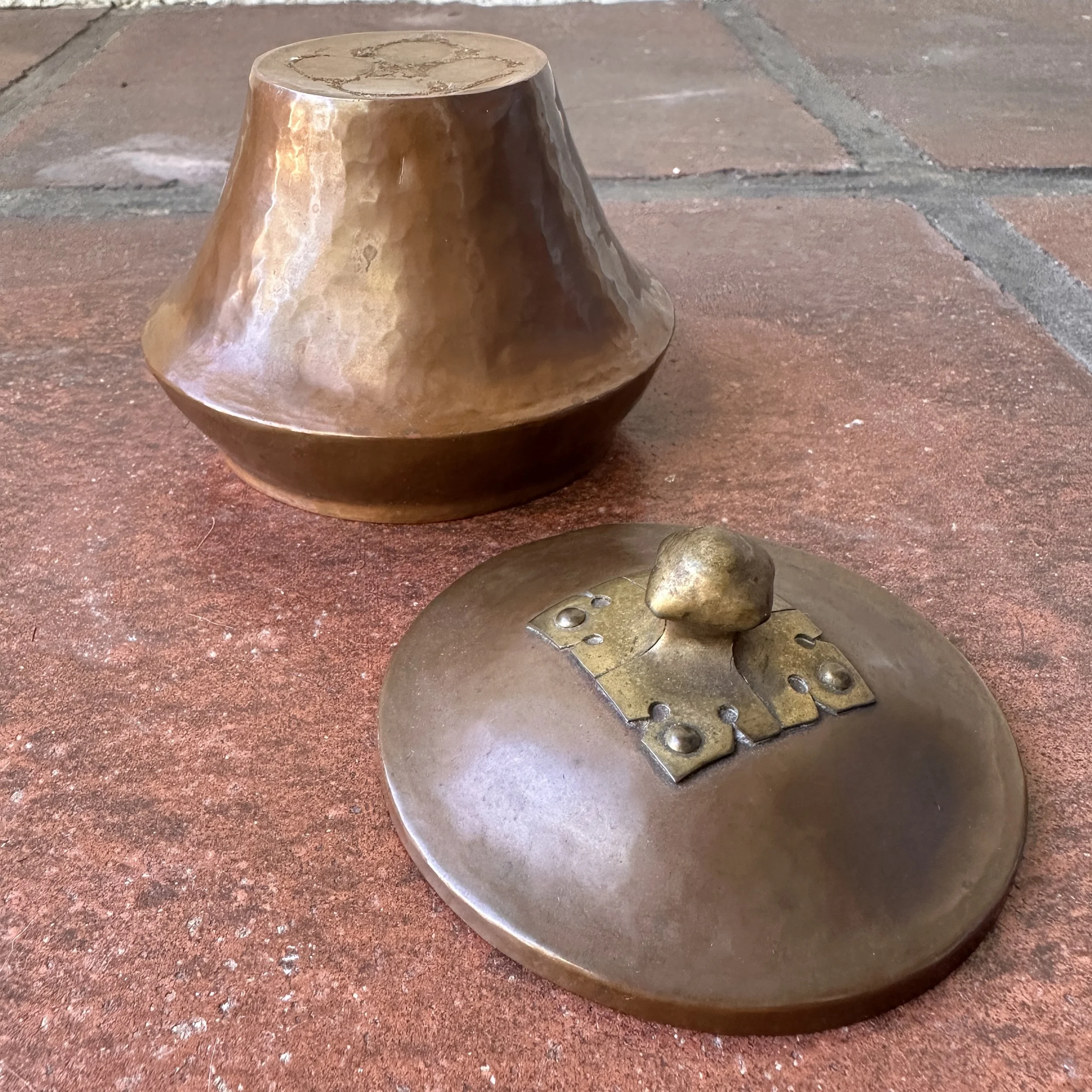 Arts & Crafts box circa 1910. A very unique hammered copper box, the lid with a fabulous handle crafted from a single piece of raised brass. Excellent original patina, unsigned. Measures 3.75” wide and tall. $275