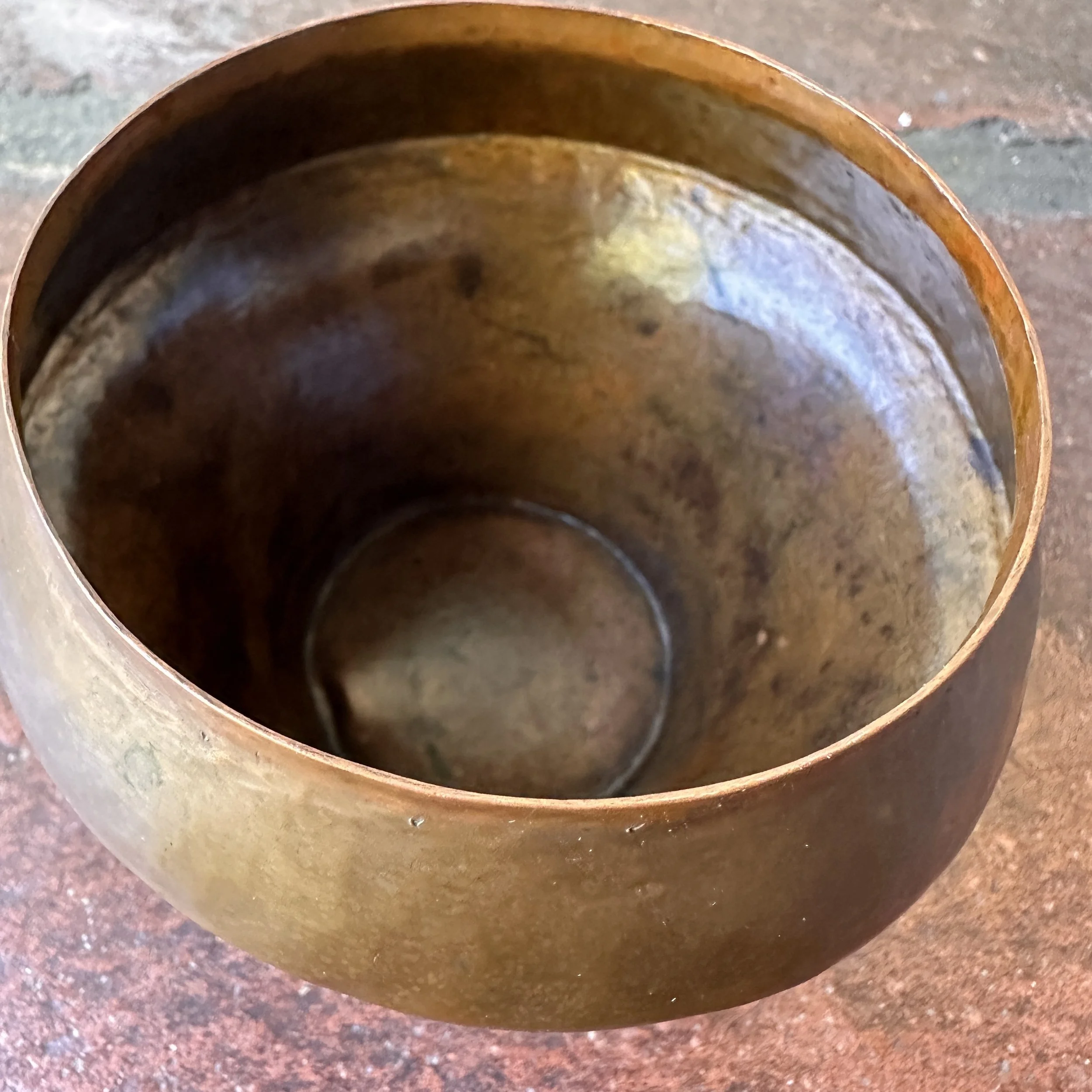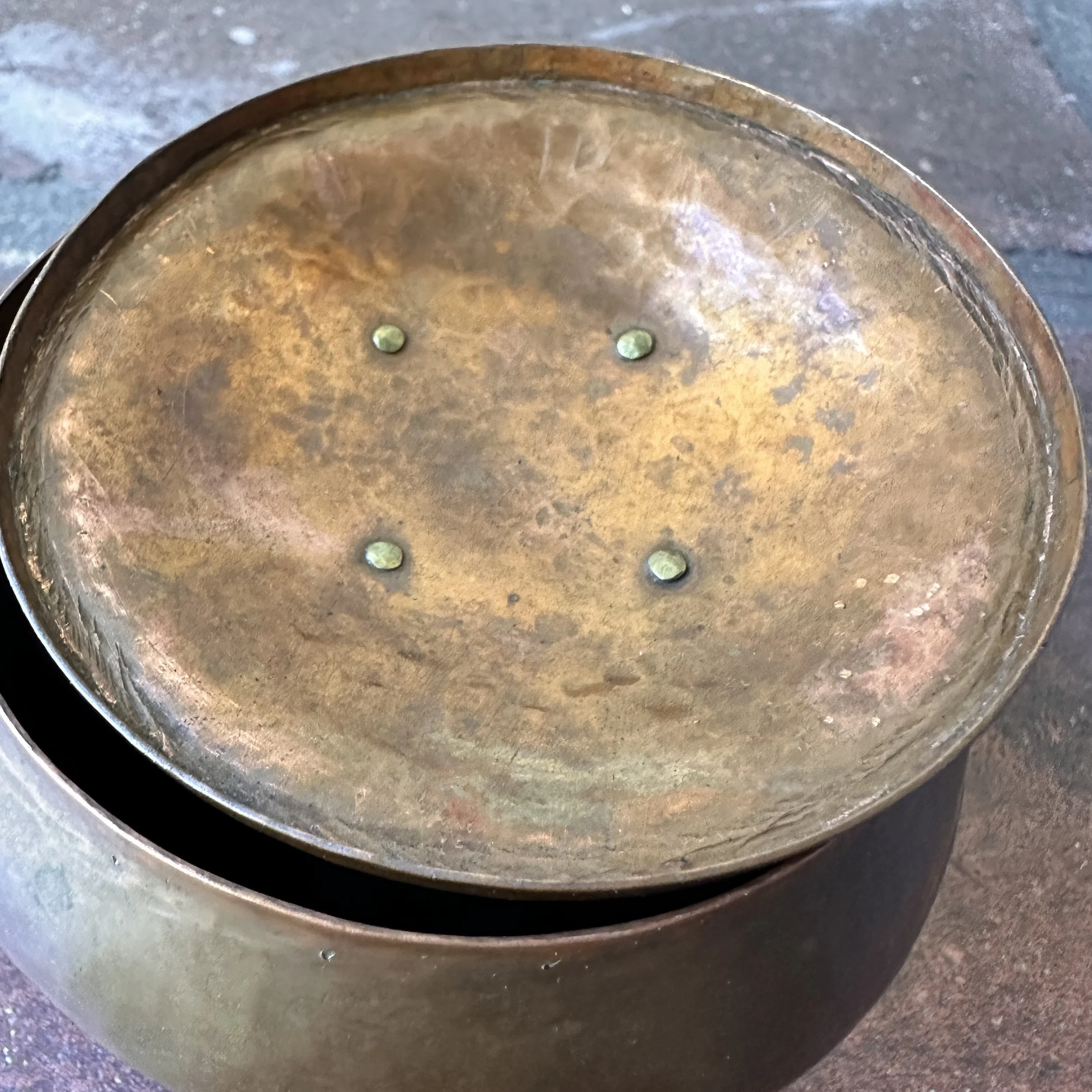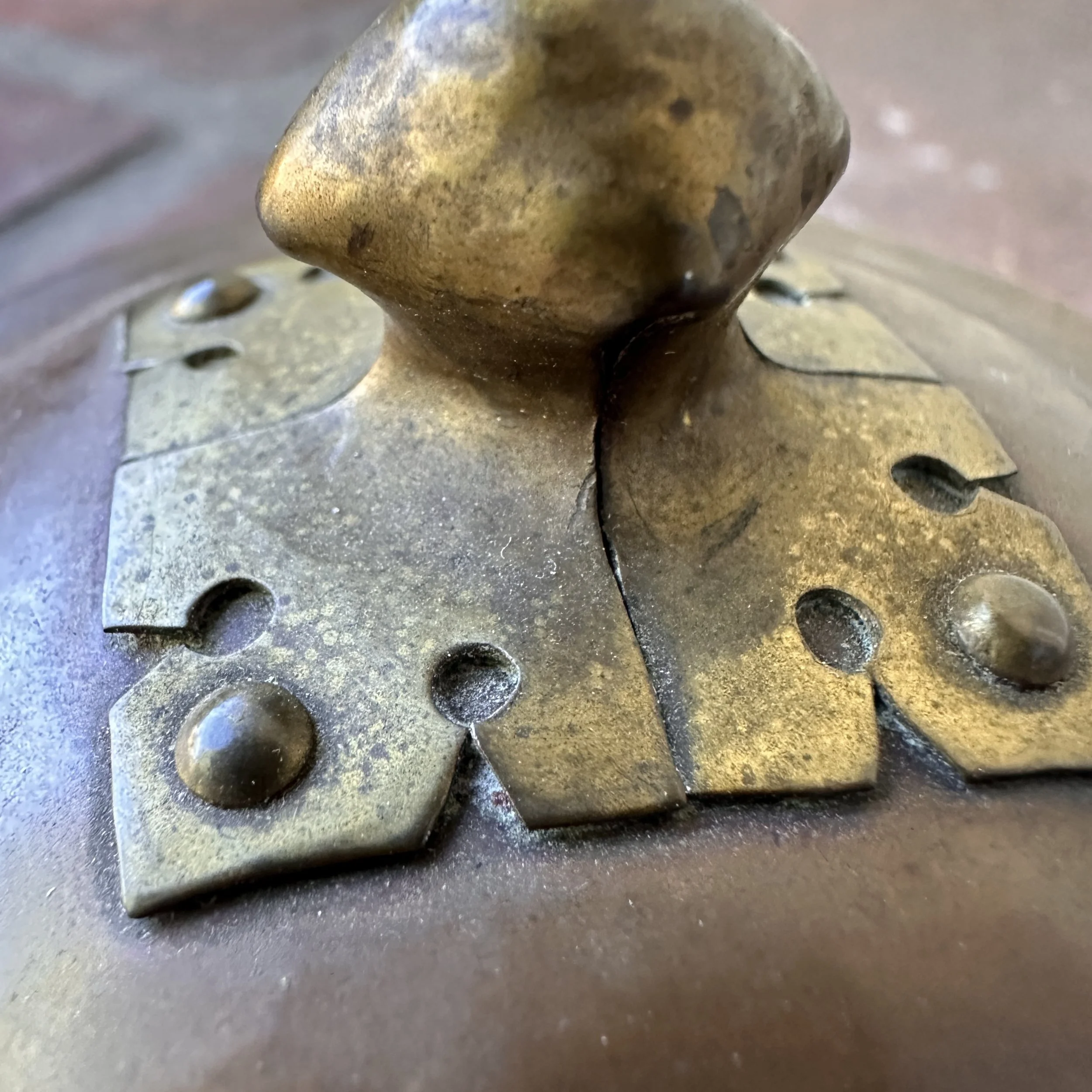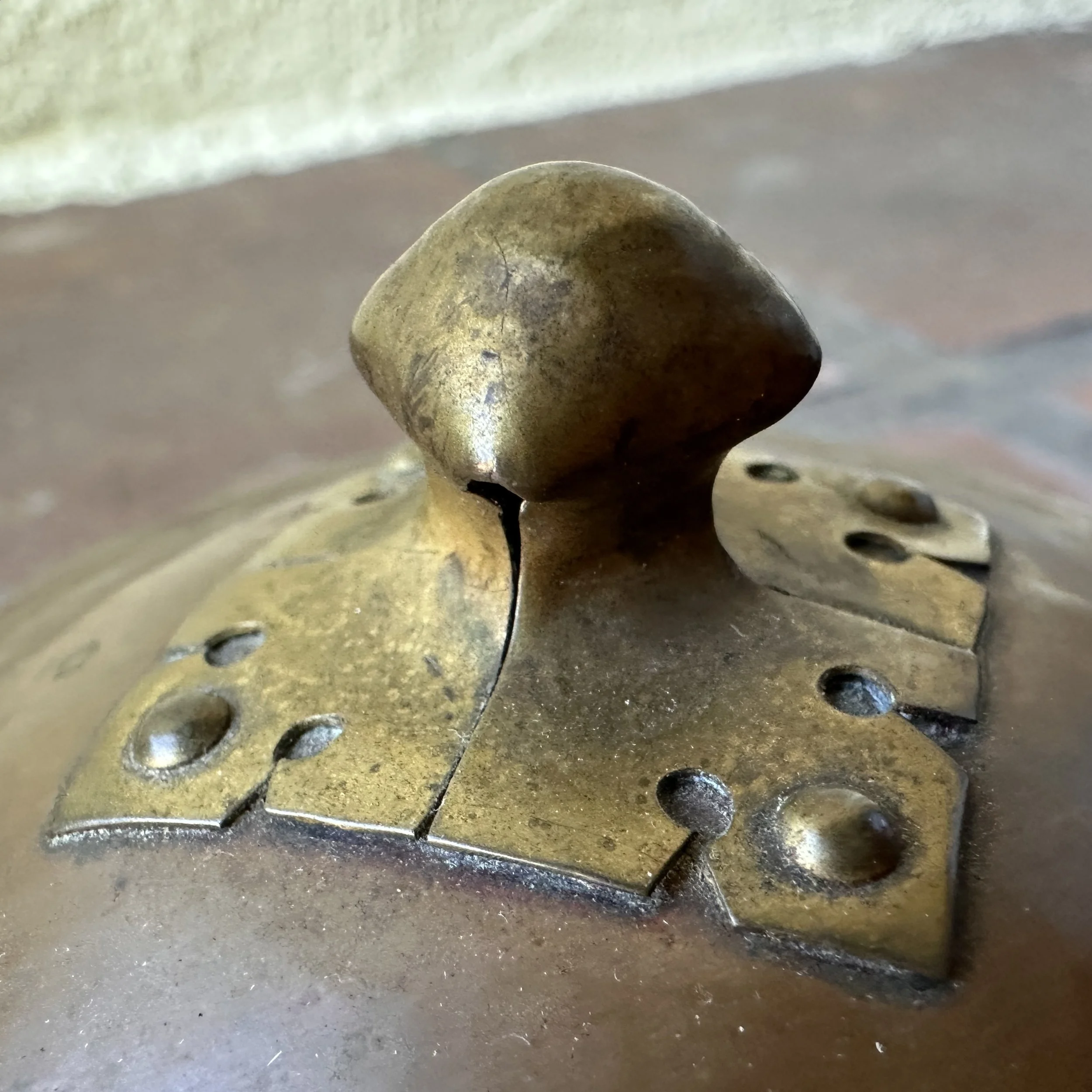Arts & Crafts box circa 1910. A very unique hammered copper box, the lid with a fabulous handle crafted from a single piece of raised brass. Excellent original patina, unsigned. Measures 3.75” wide and tall. $275