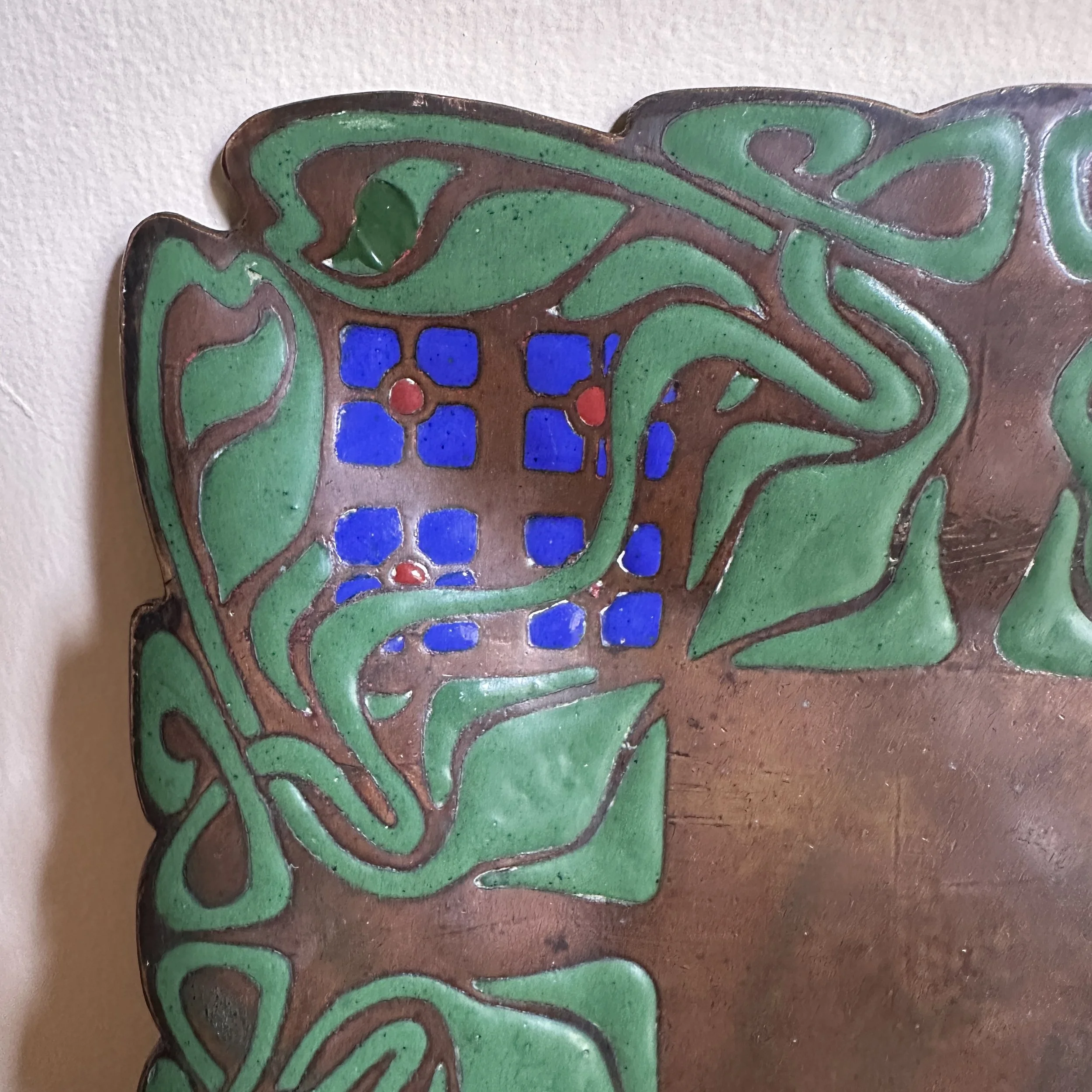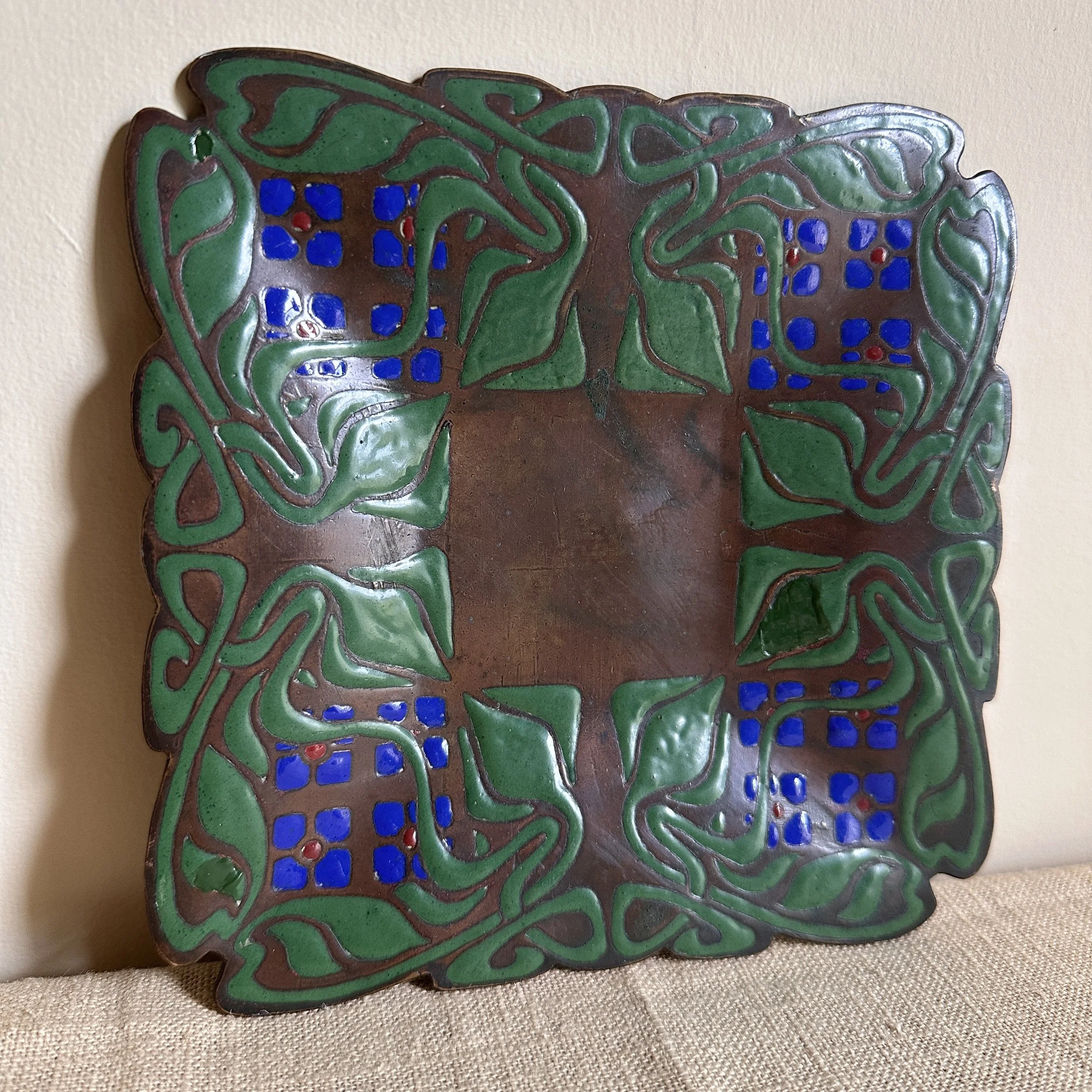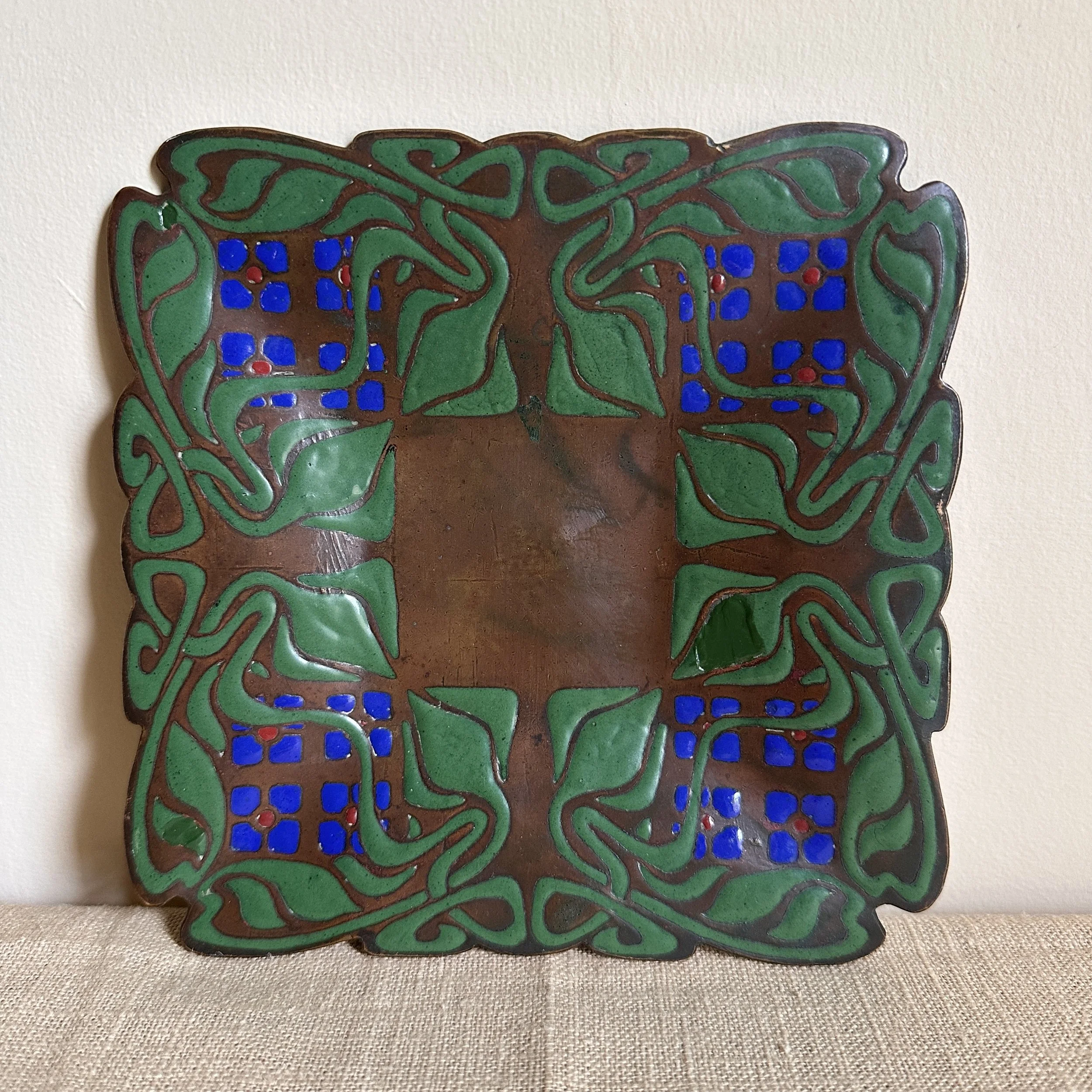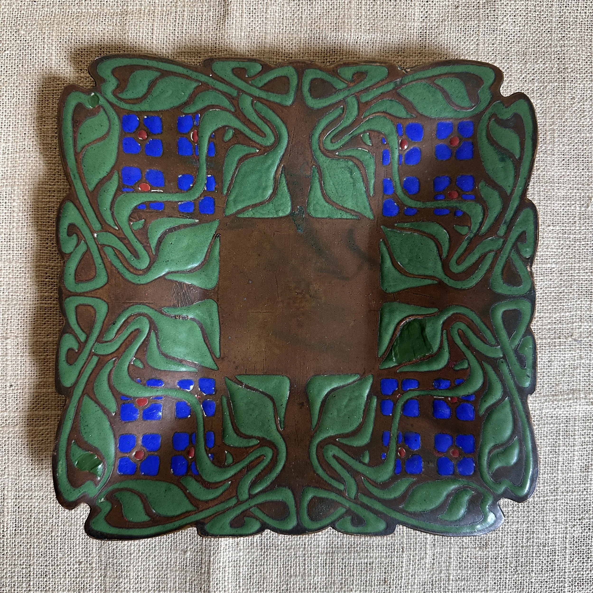 Art Crafts Shop tray, Buffalo NY circa 1901. This is one of the rarest items from the shop, a small number of these trays in various designs were crafted very early and only a handful have ever surfaced. The hammered copper is raised from the center so the tray “floats” around the edges, the thick and rich green, blue and red enamel decoration is dropped into recesses in the copper. The entire border is hand cut around the enamel pattern. Signed with a 410 model number. Original patina, there are two small enamel repairs and one larger leaf (see darker green repairs). Measures 6” square. SOLD