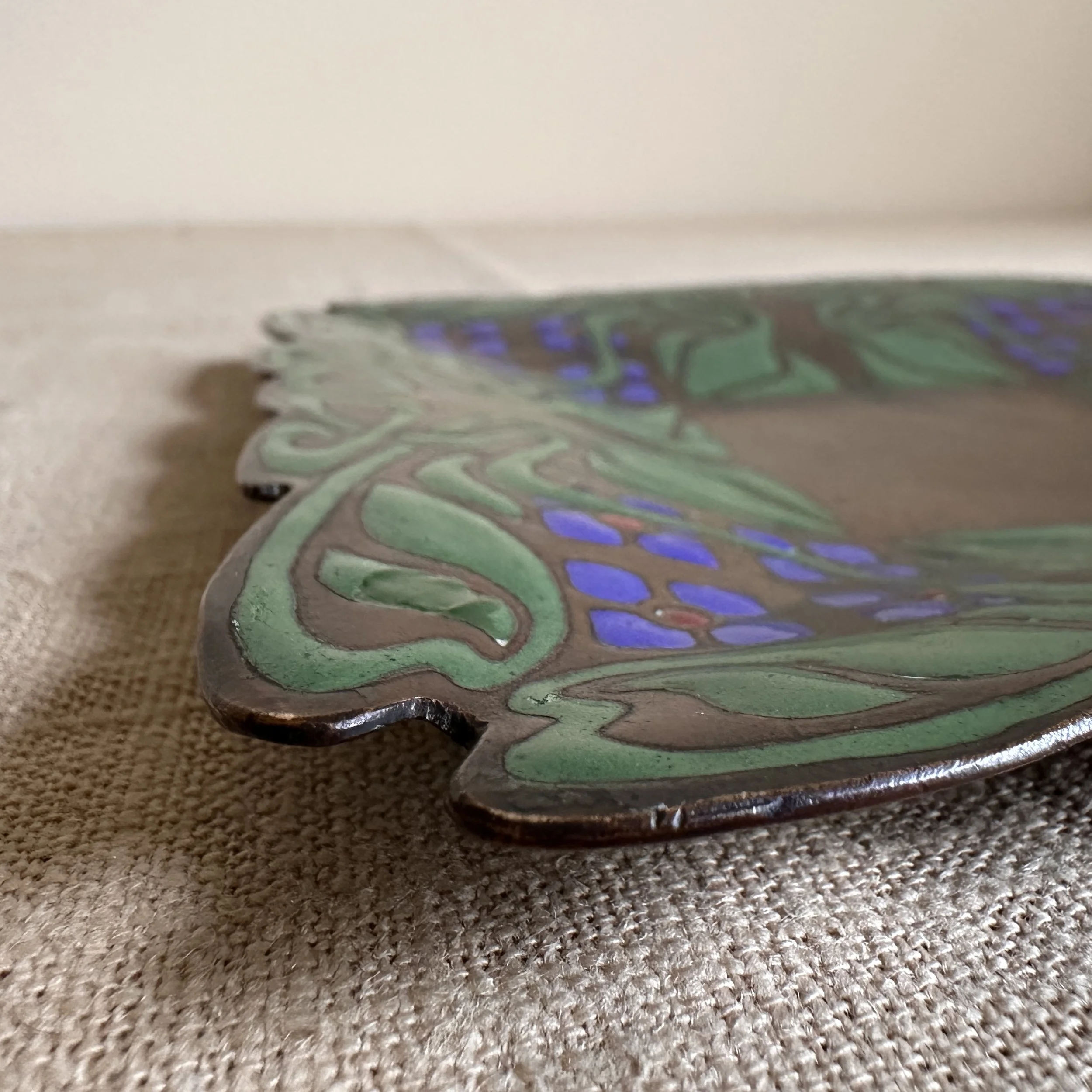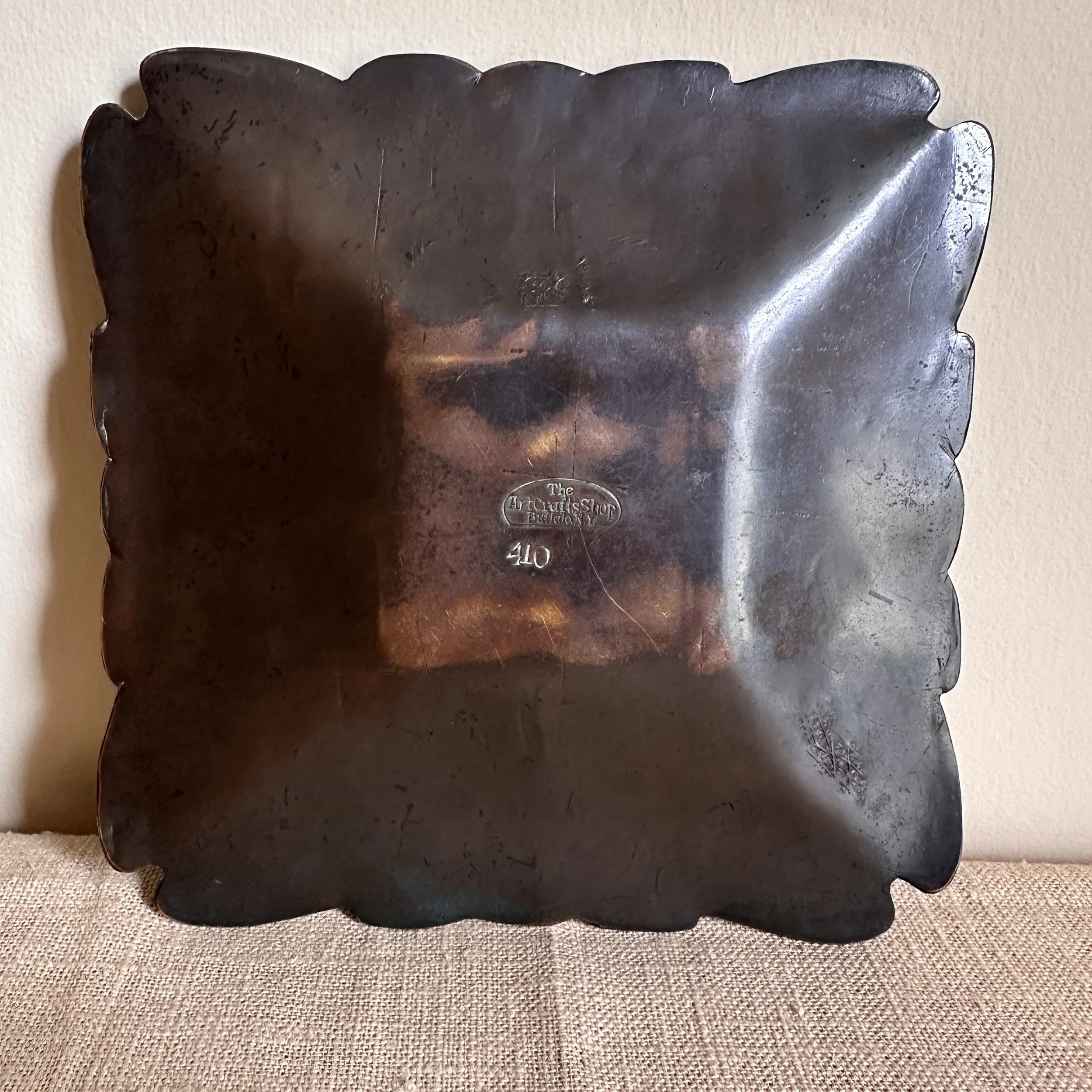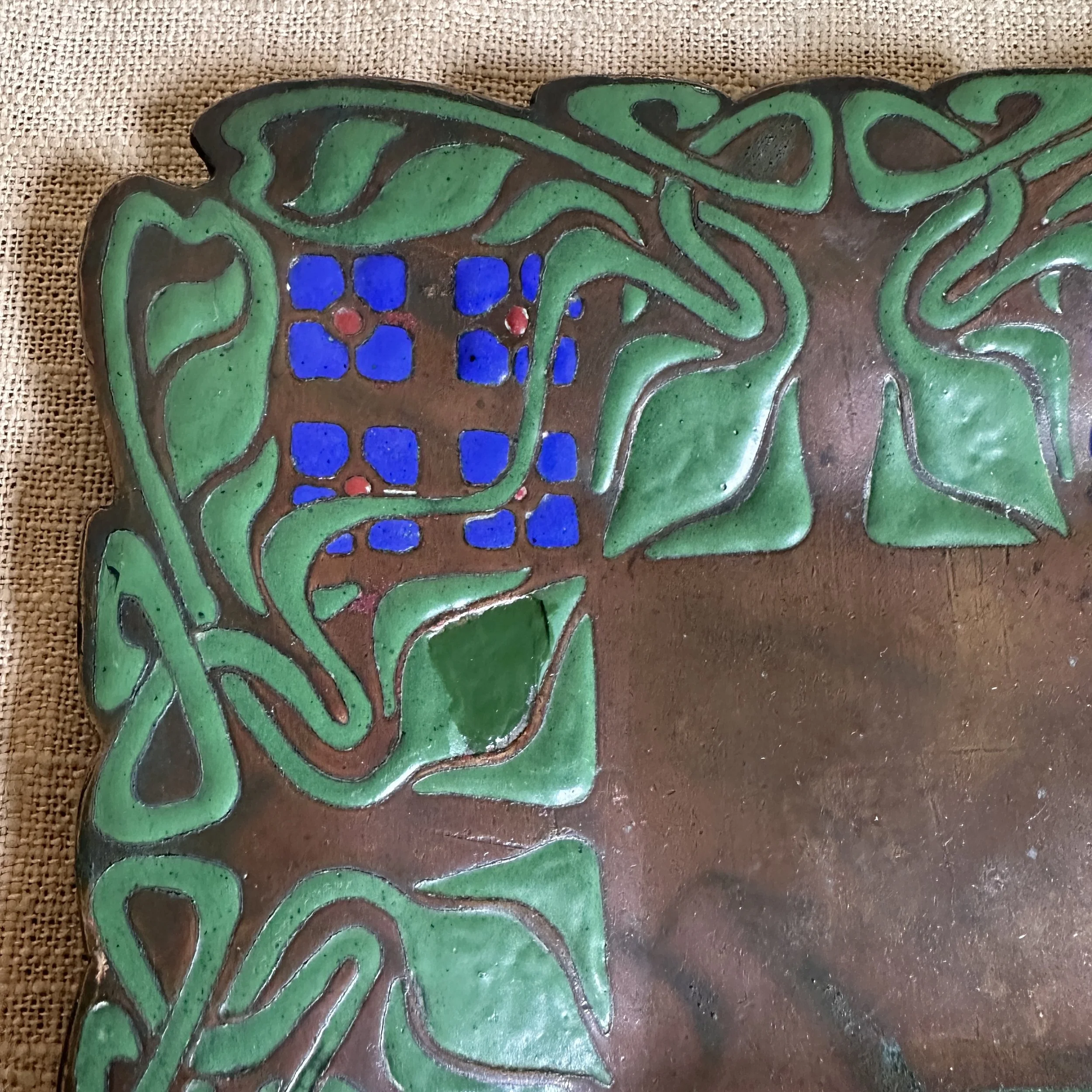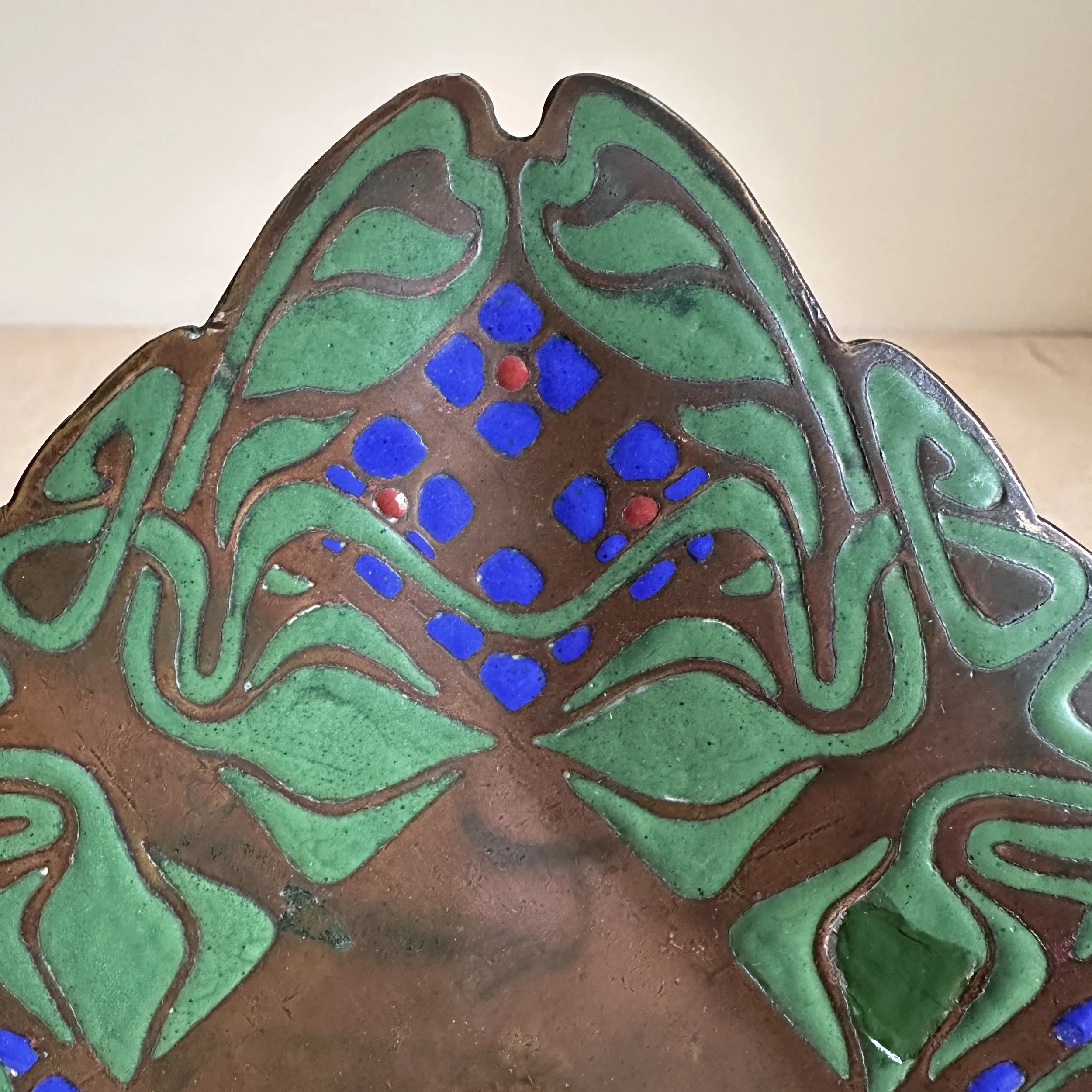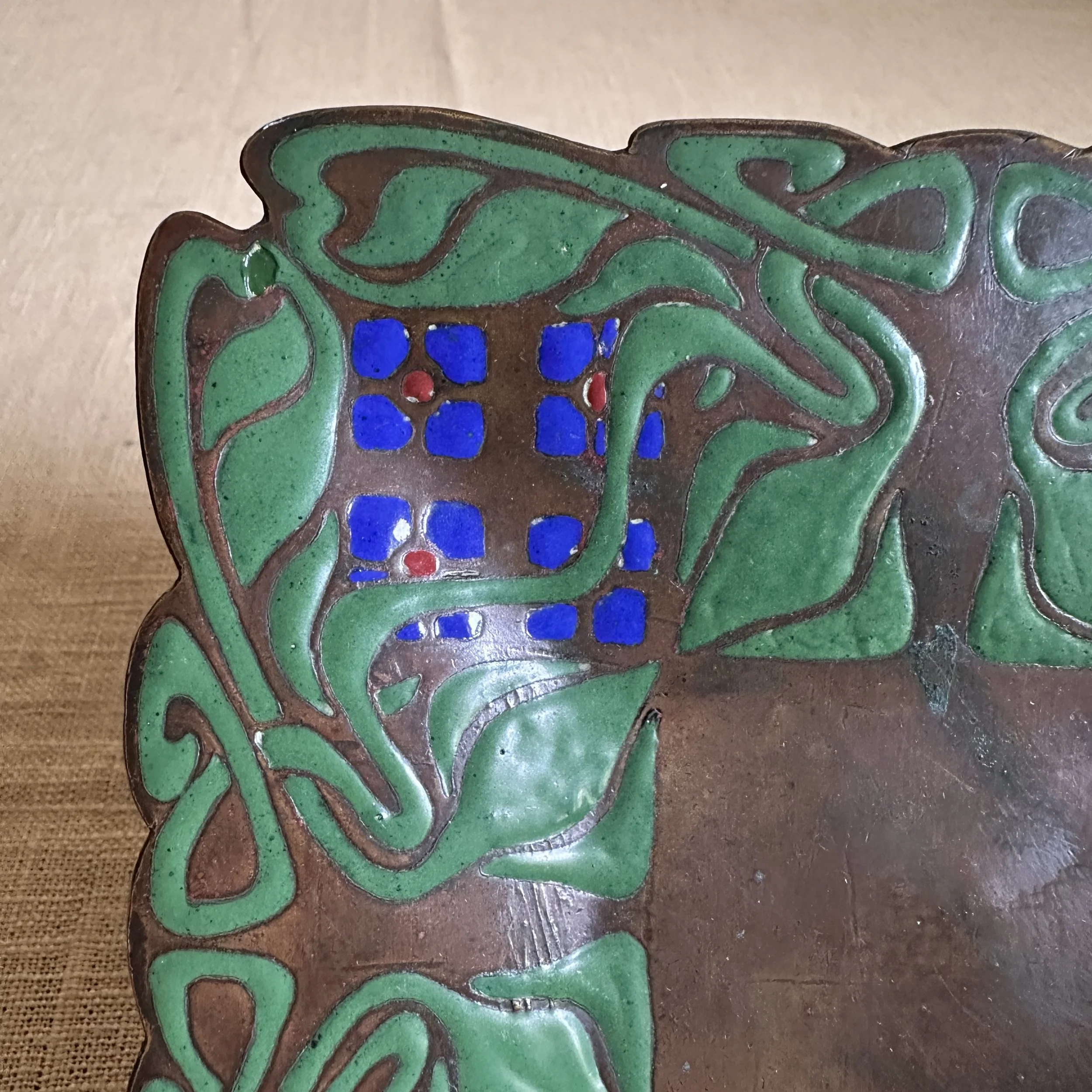 Art Crafts Shop tray, Buffalo NY circa 1901. This is one of the rarest items from the shop, a small number of these trays in various designs were crafted very early and only a handful have ever surfaced. The hammered copper is raised from the center so the tray “floats” around the edges, the thick and rich green, blue and red enamel decoration is dropped into recesses in the copper. The entire border is hand cut around the enamel pattern. Signed with a 410 model number. Original patina, there are two small enamel repairs and one larger leaf (see darker green repairs). Measures 6” square. SOLD