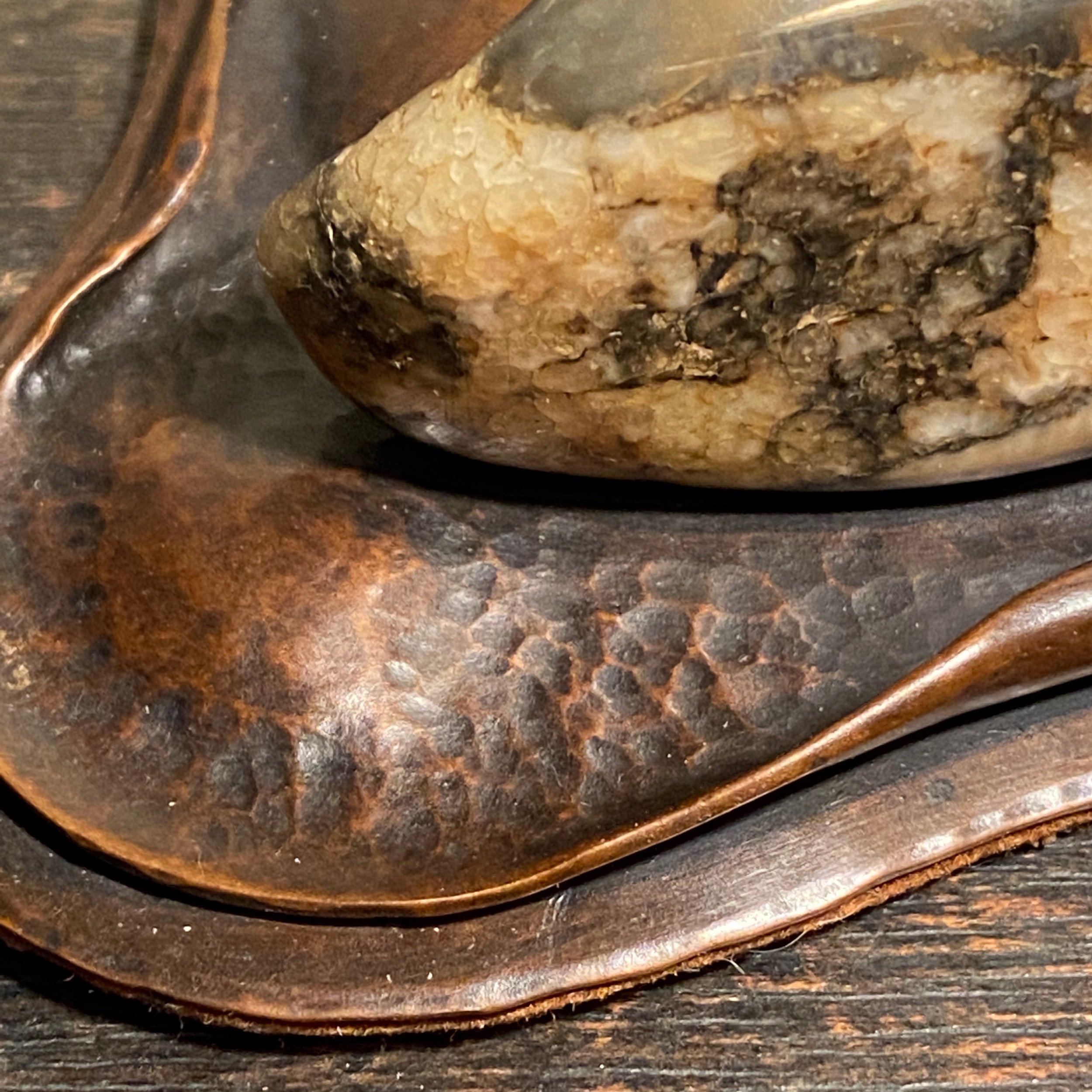 Albert Berry opened his first shop in Alaska before relocating to Seattle around 1910. His hammered copper work reflects these Northwest surrounding with both use of native motifs & materials such as local fossilized mastodon bones & Alaskan gold nuggets. The embodiment of creativity & inspiration in period craftsmanship.