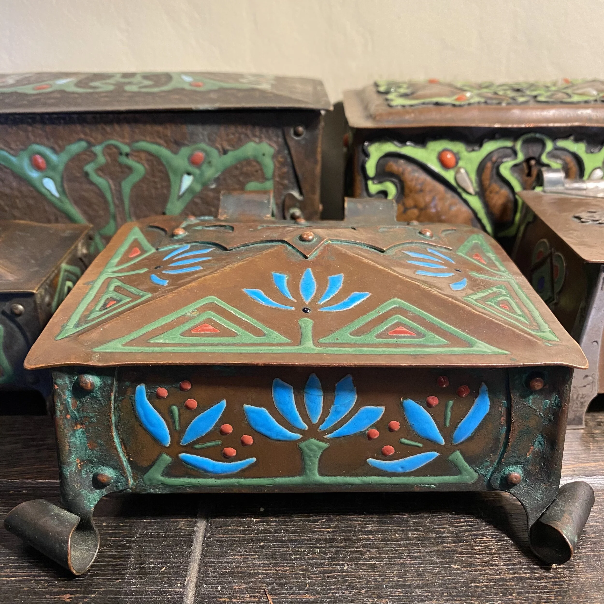 Art Crafts Shop items display one of two enameling techniques: One is simply laid right onto the copper (easily damaged); the other technique is when the copper item has actually been hand-worked or cast, leaving the enamel sitting slightly “down” in the metal – these forms are rarer and more desirable since the enamel is usually more intact.