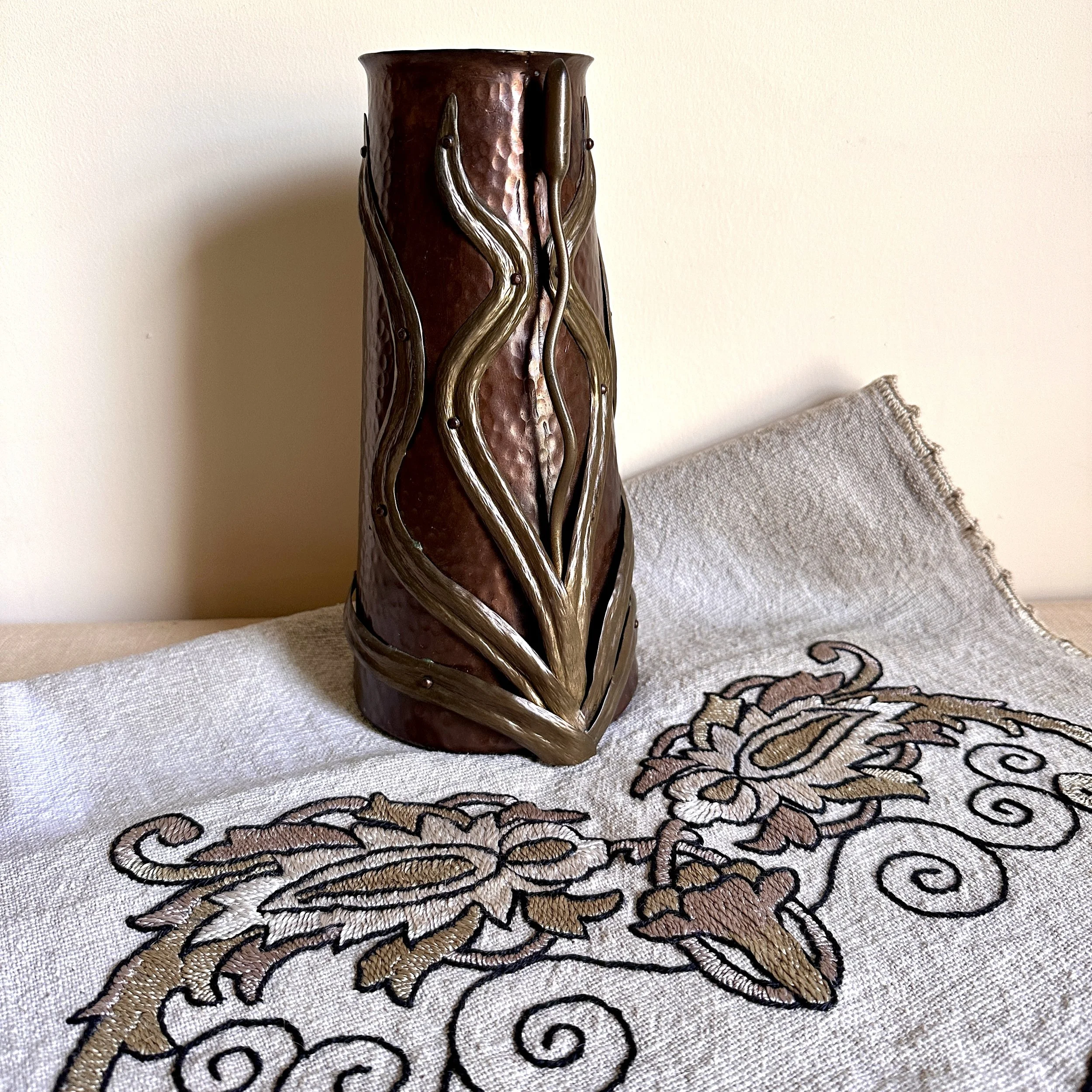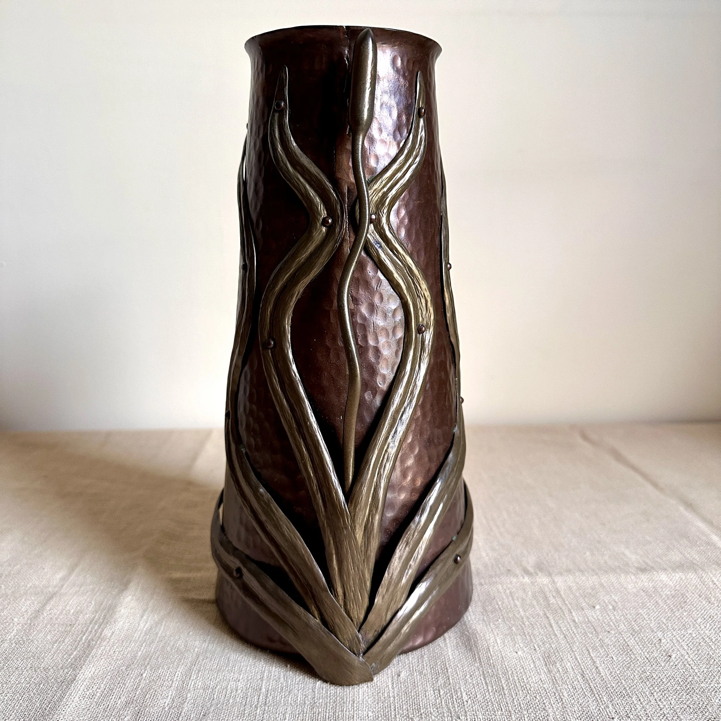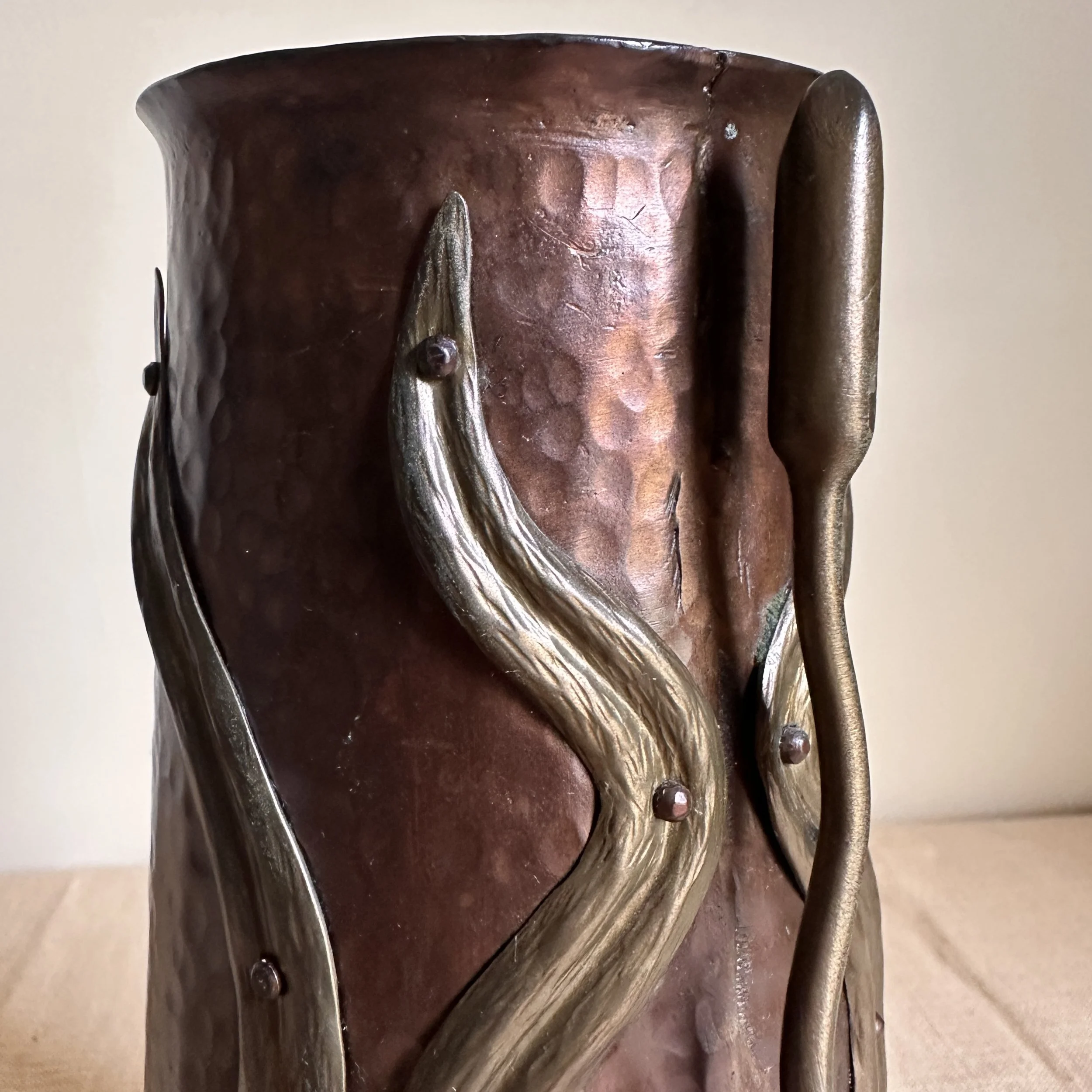 Art Nouveau vase circa 1902. Likely a European vase, heavy hammered copper body with hammered brass leaves and a central reed riveted to surface. Well executed and very unique design. Excellent condition and original patina. Measures 10” tall and 5” wide. SOLD