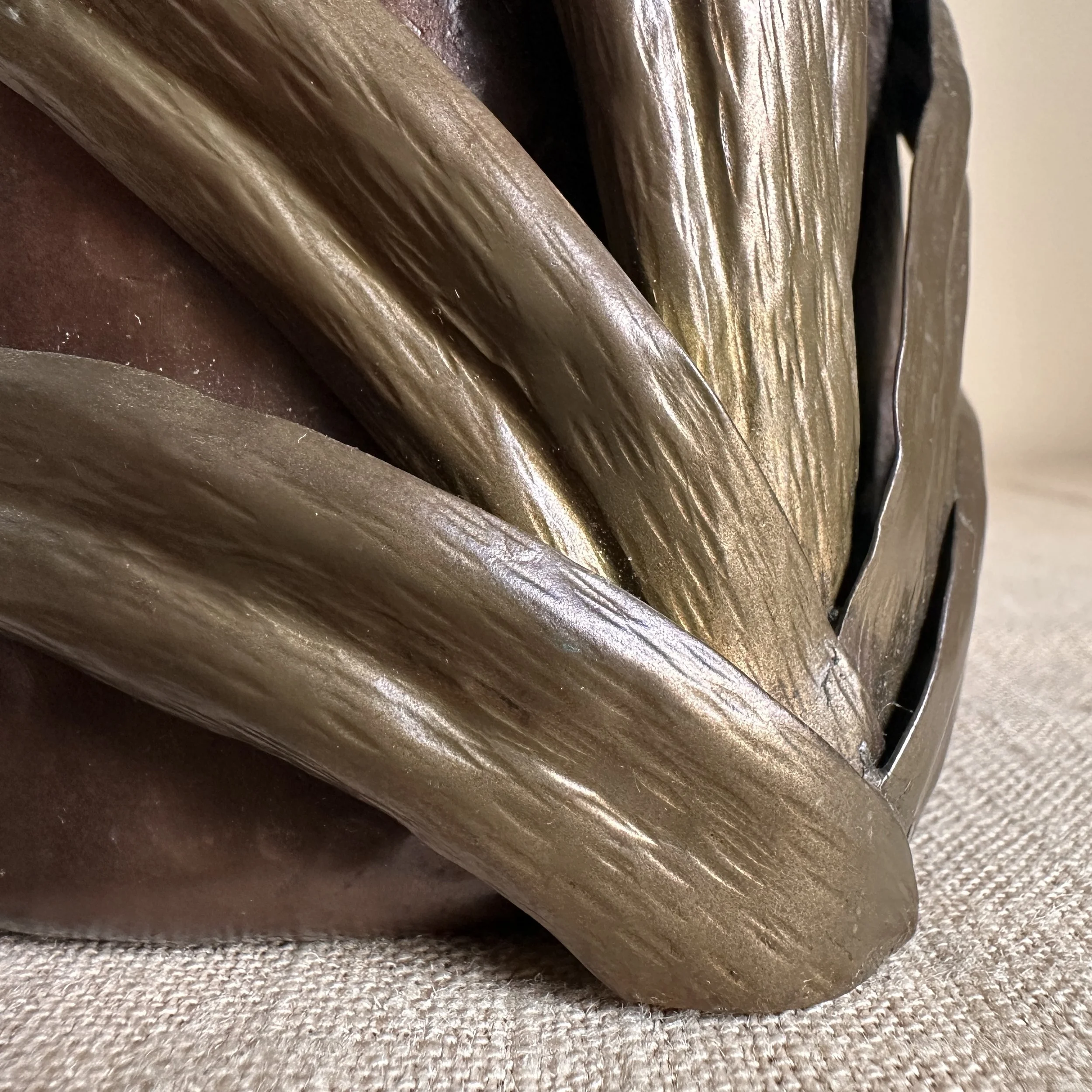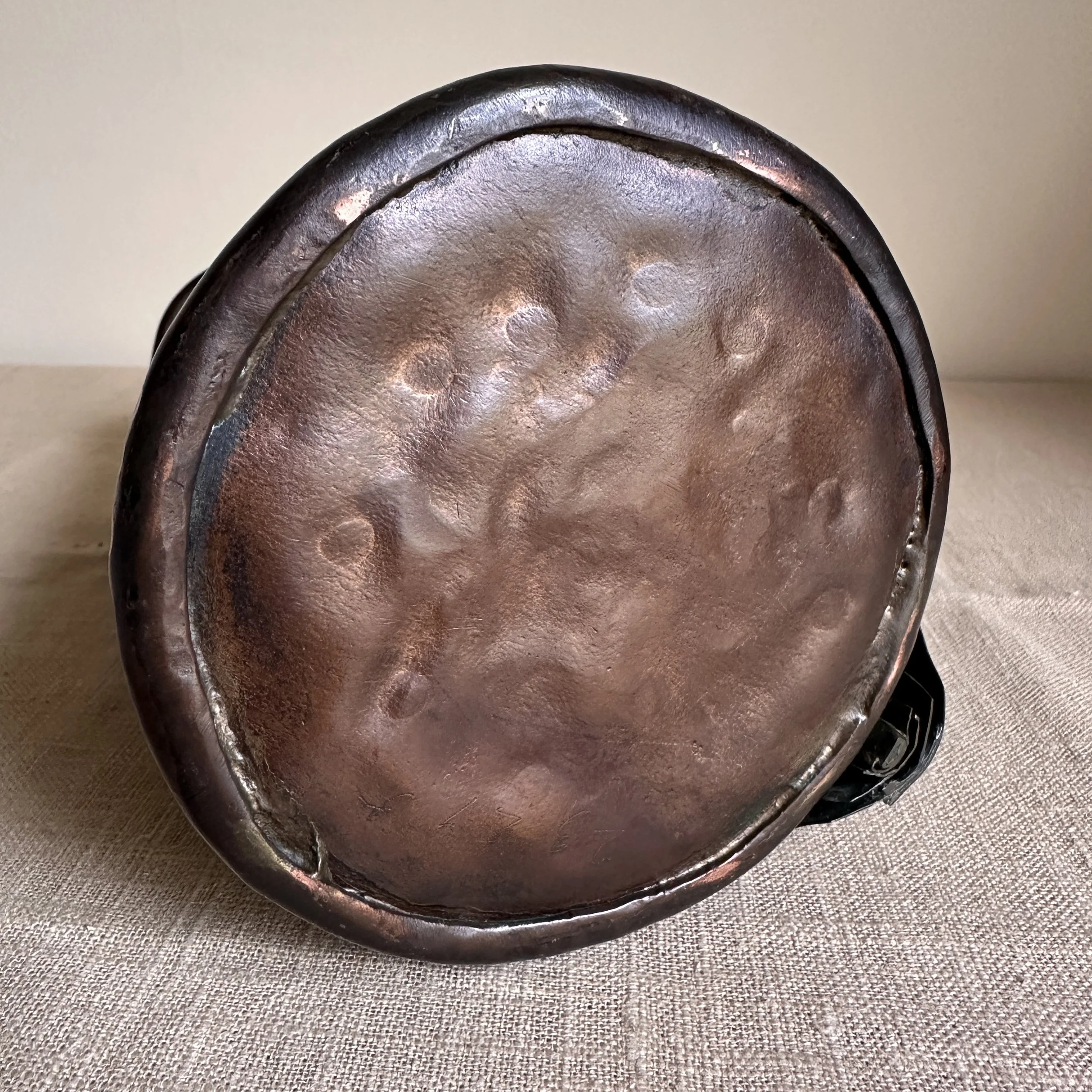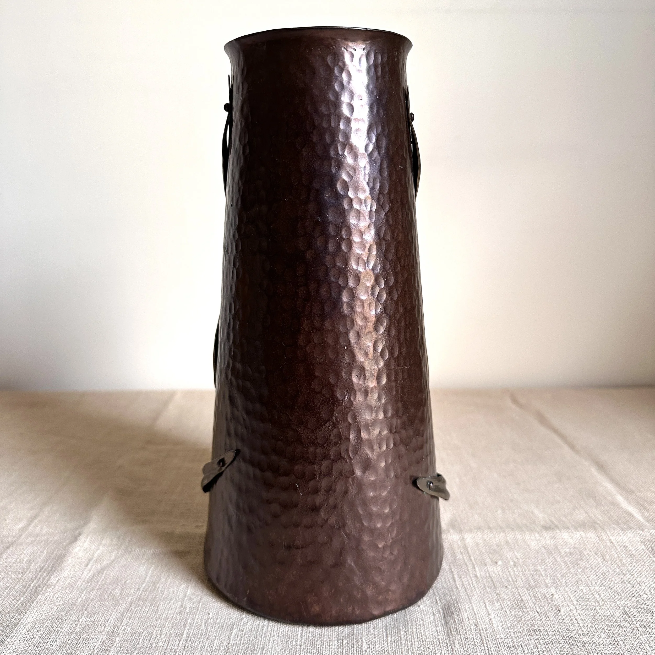 Art Nouveau vase circa 1902. Likely a European vase, heavy hammered copper body with hammered brass leaves and a central reed riveted to surface. Well executed and very unique design. Excellent condition and original patina. Measures 10” tall and 5” wide. SOLD