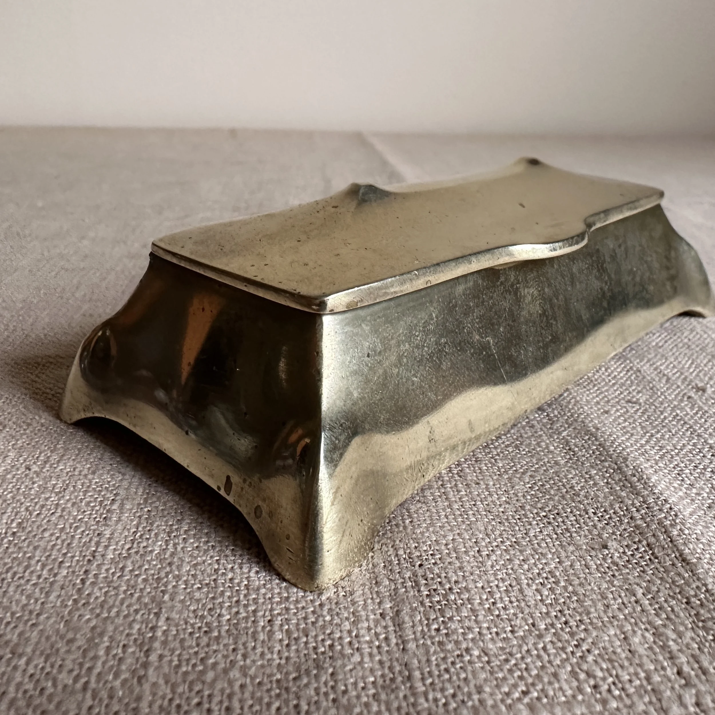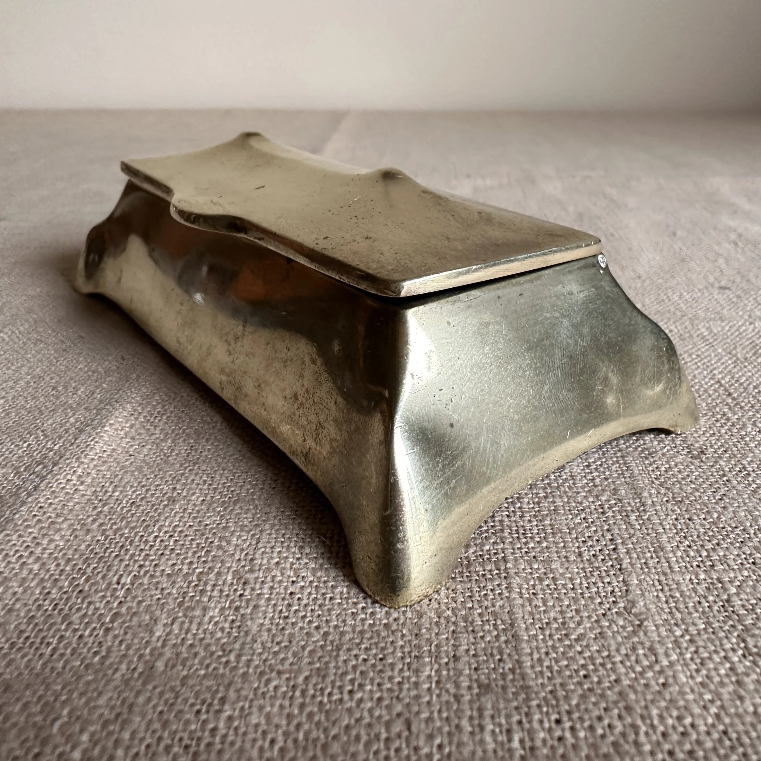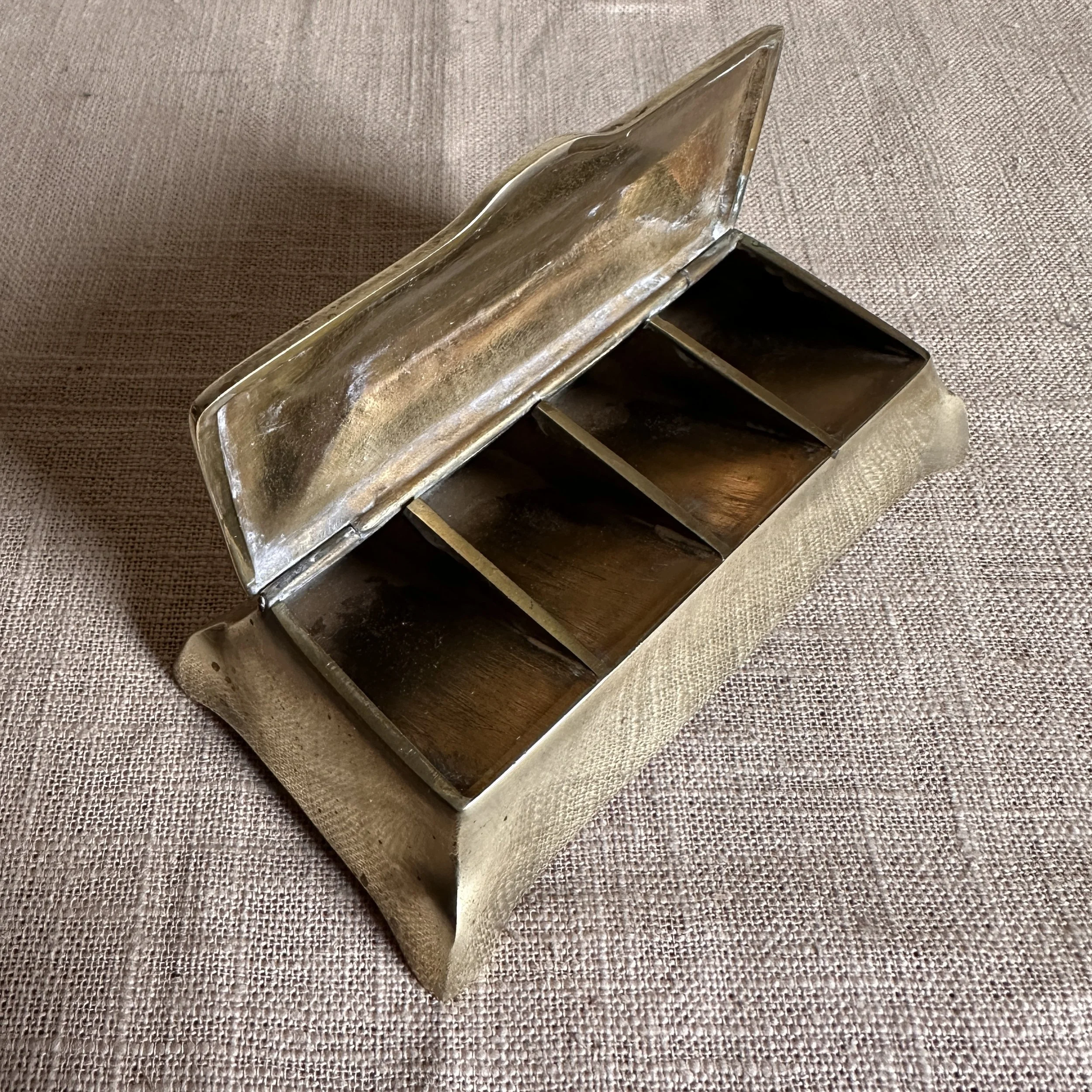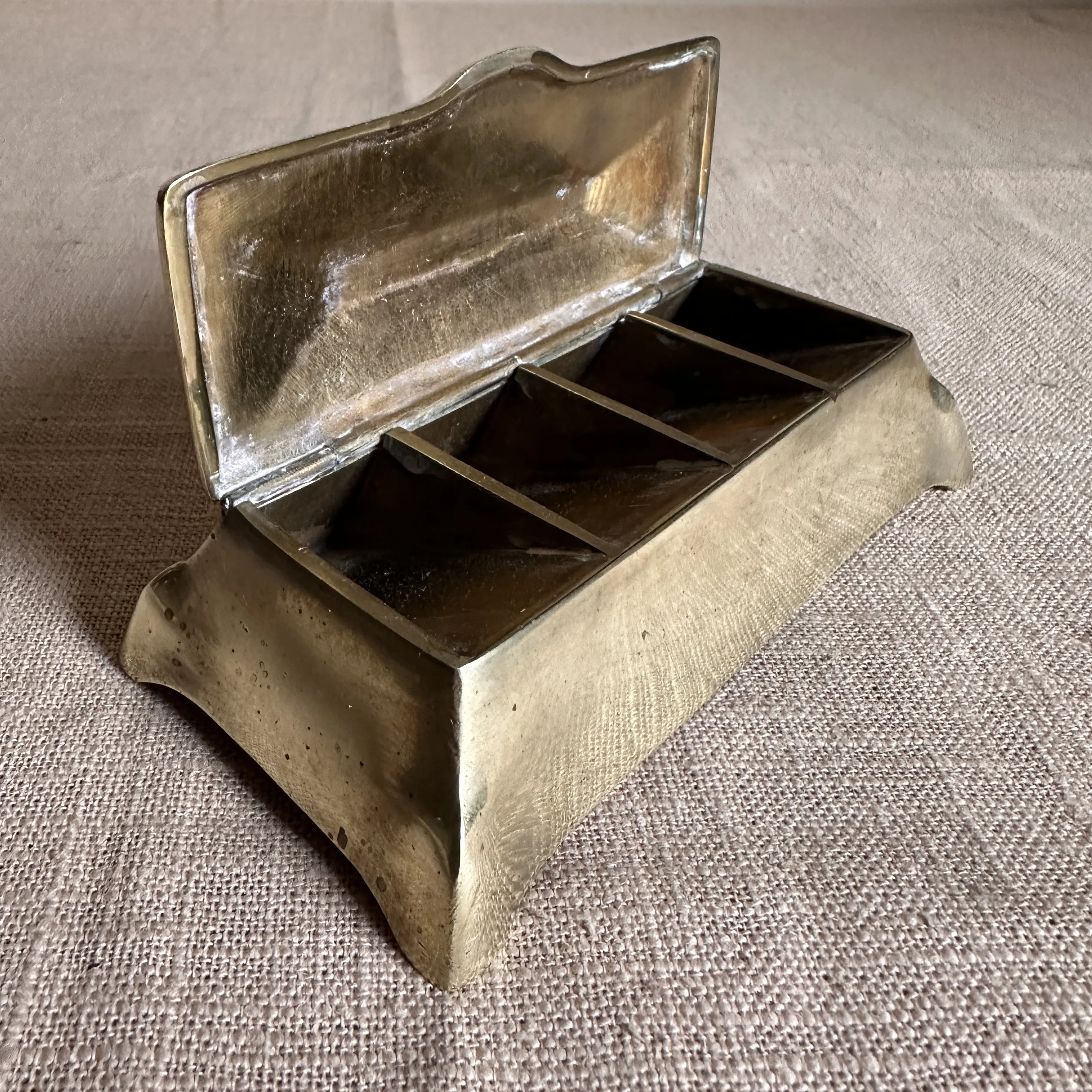 Austrian Art Nouveau stamp box circa 1900. A brass stamp box with curves legs and domed top, opens to reveal four stamp compartments. Unsigned, polished condition. Measures 5.25” long, 2.5” wide and 1.75” tall. $75