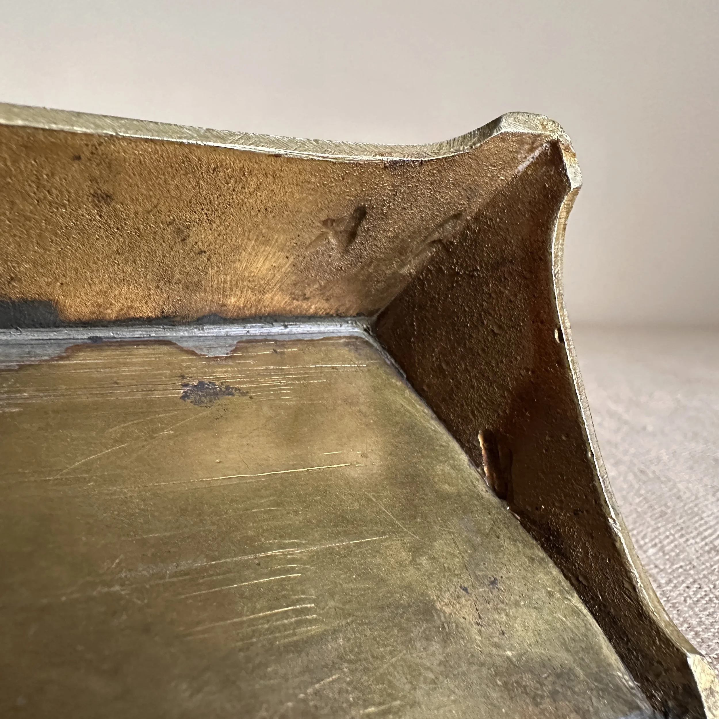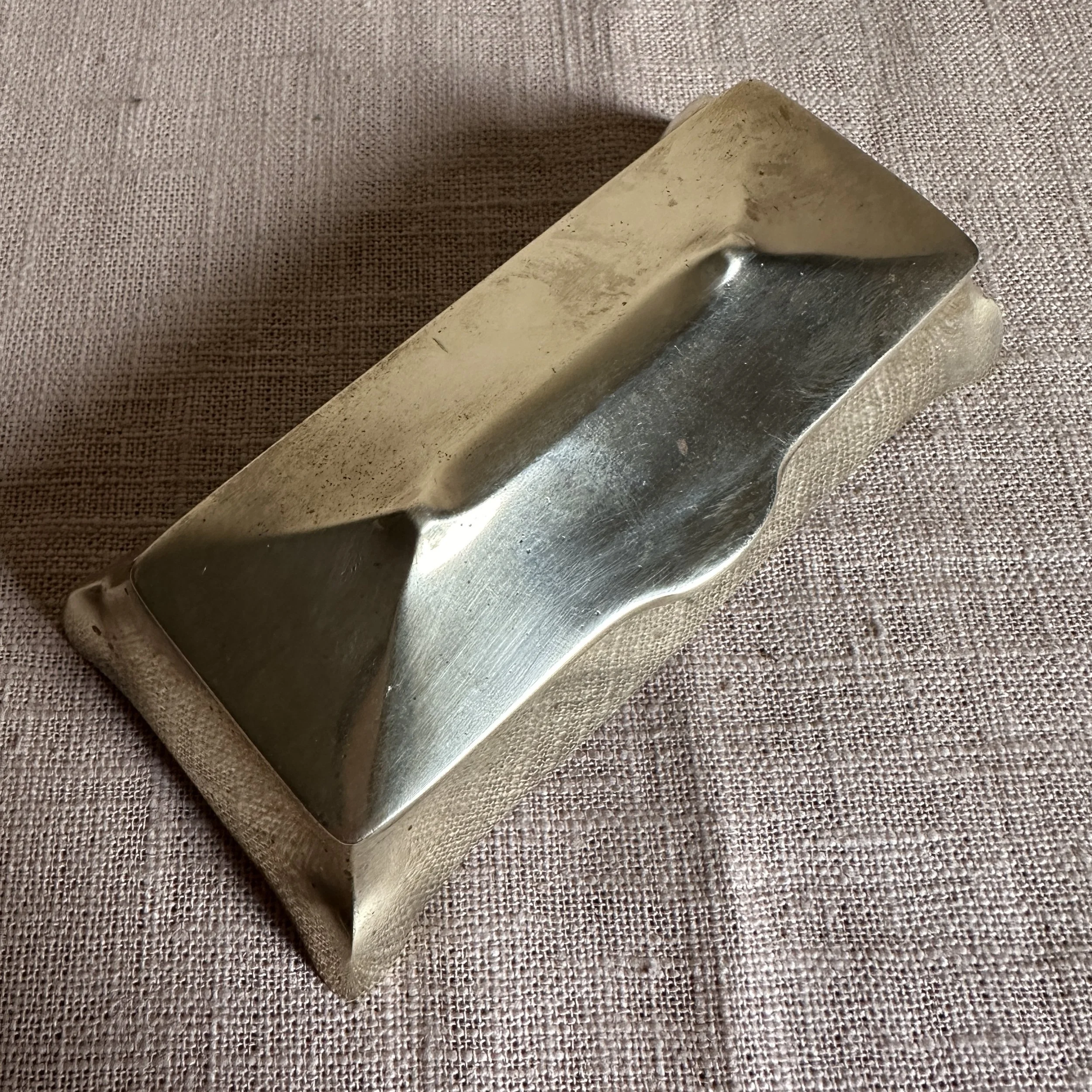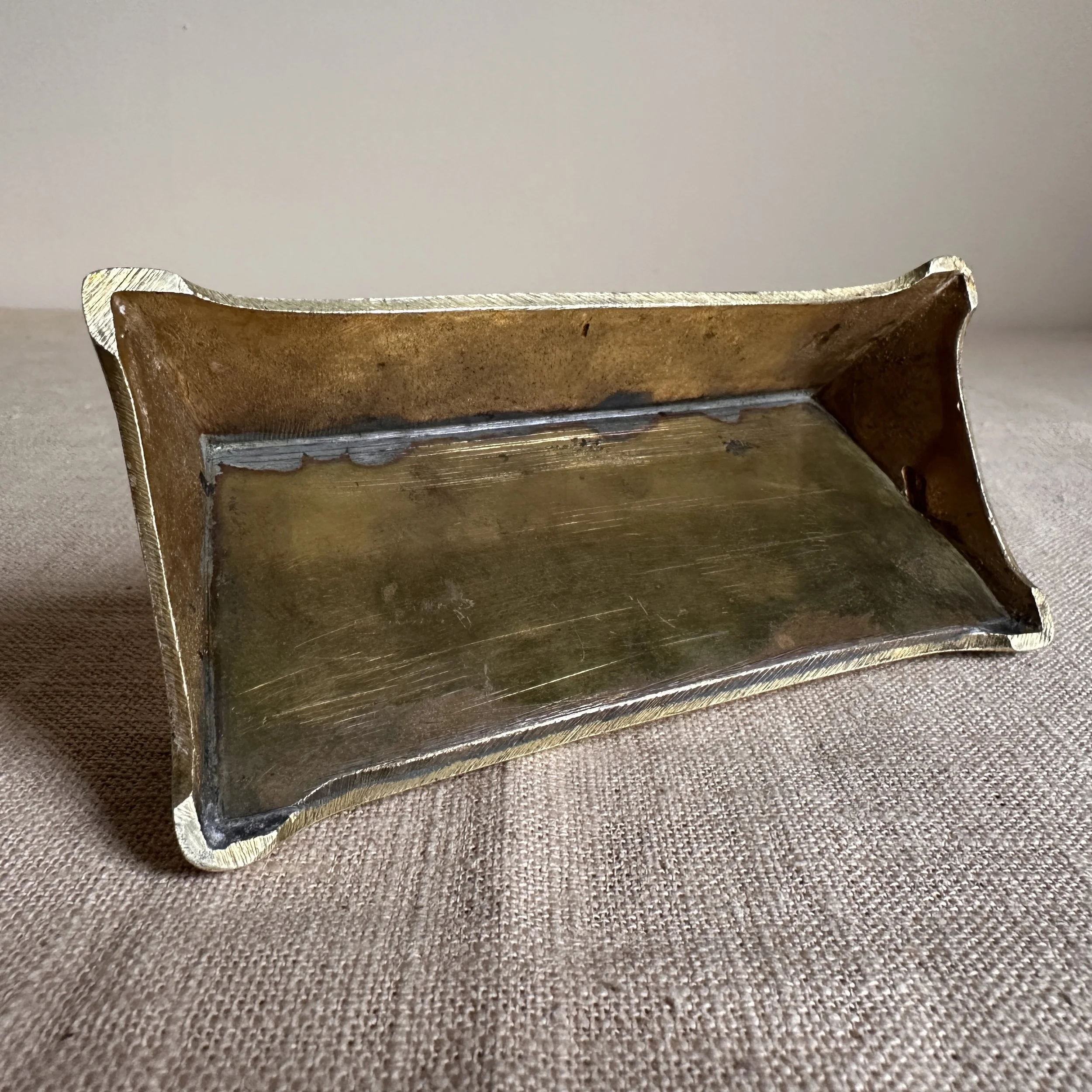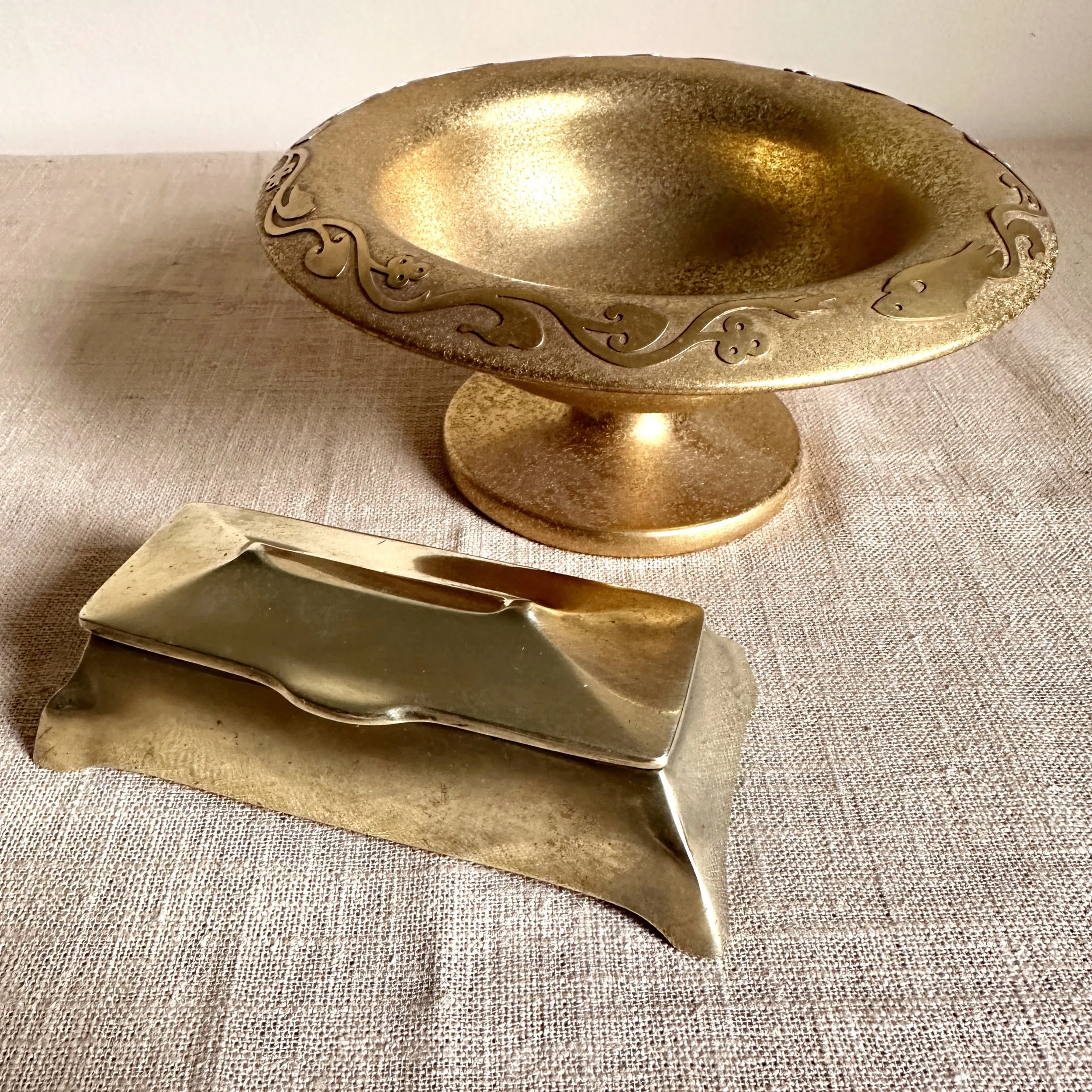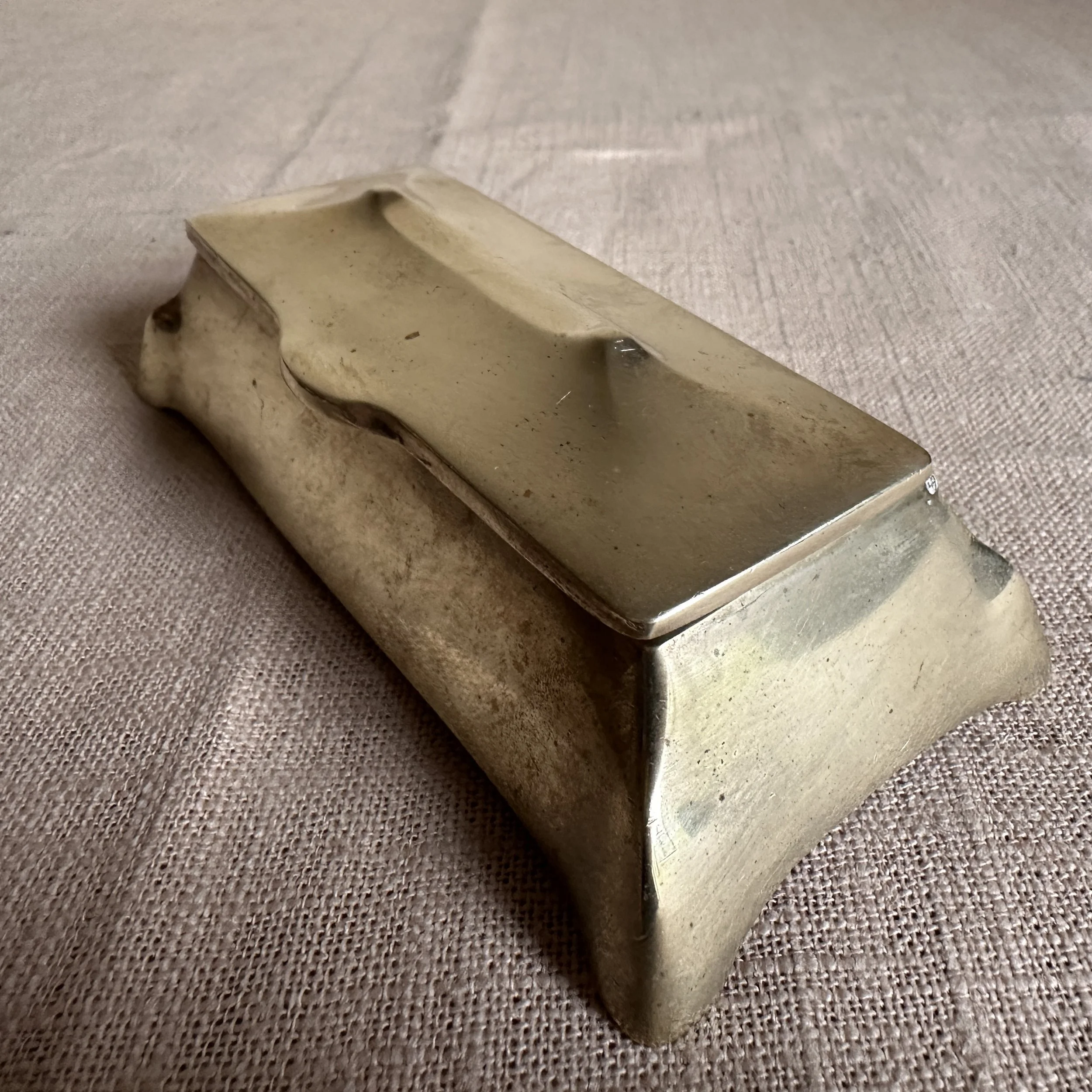 Austrian Art Nouveau stamp box circa 1900. A brass stamp box with curves legs and domed top, opens to reveal four stamp compartments. Unsigned, polished condition. Measures 5.25” long, 2.5” wide and 1.75” tall. $75