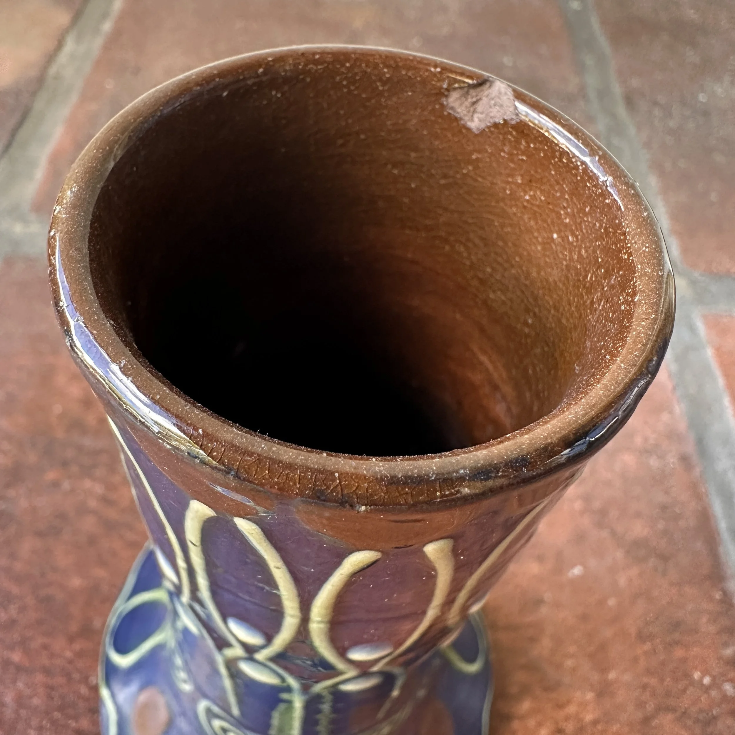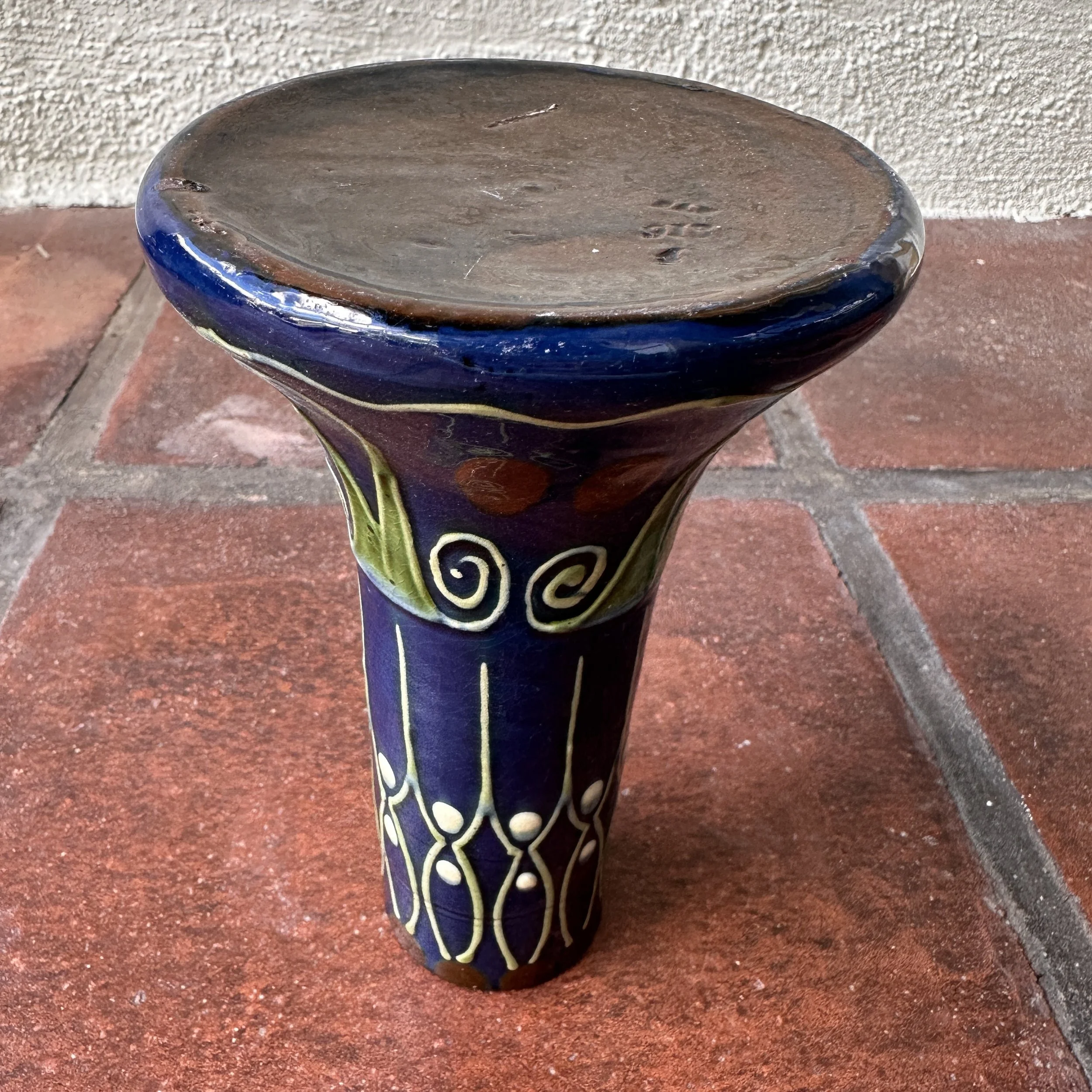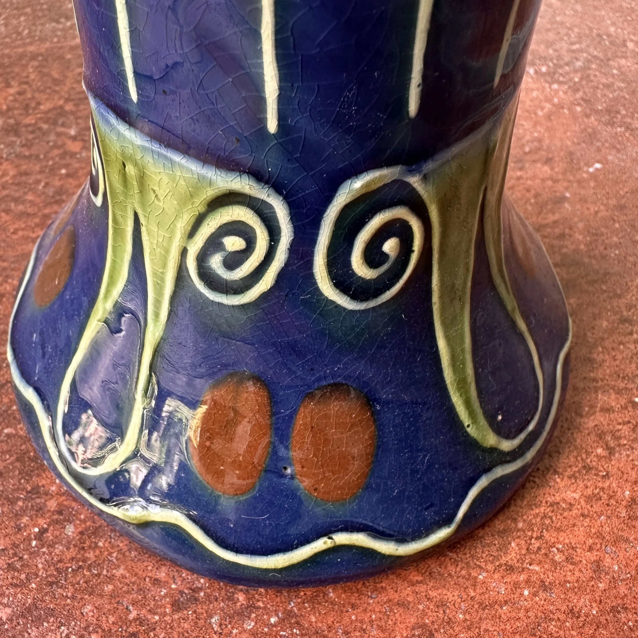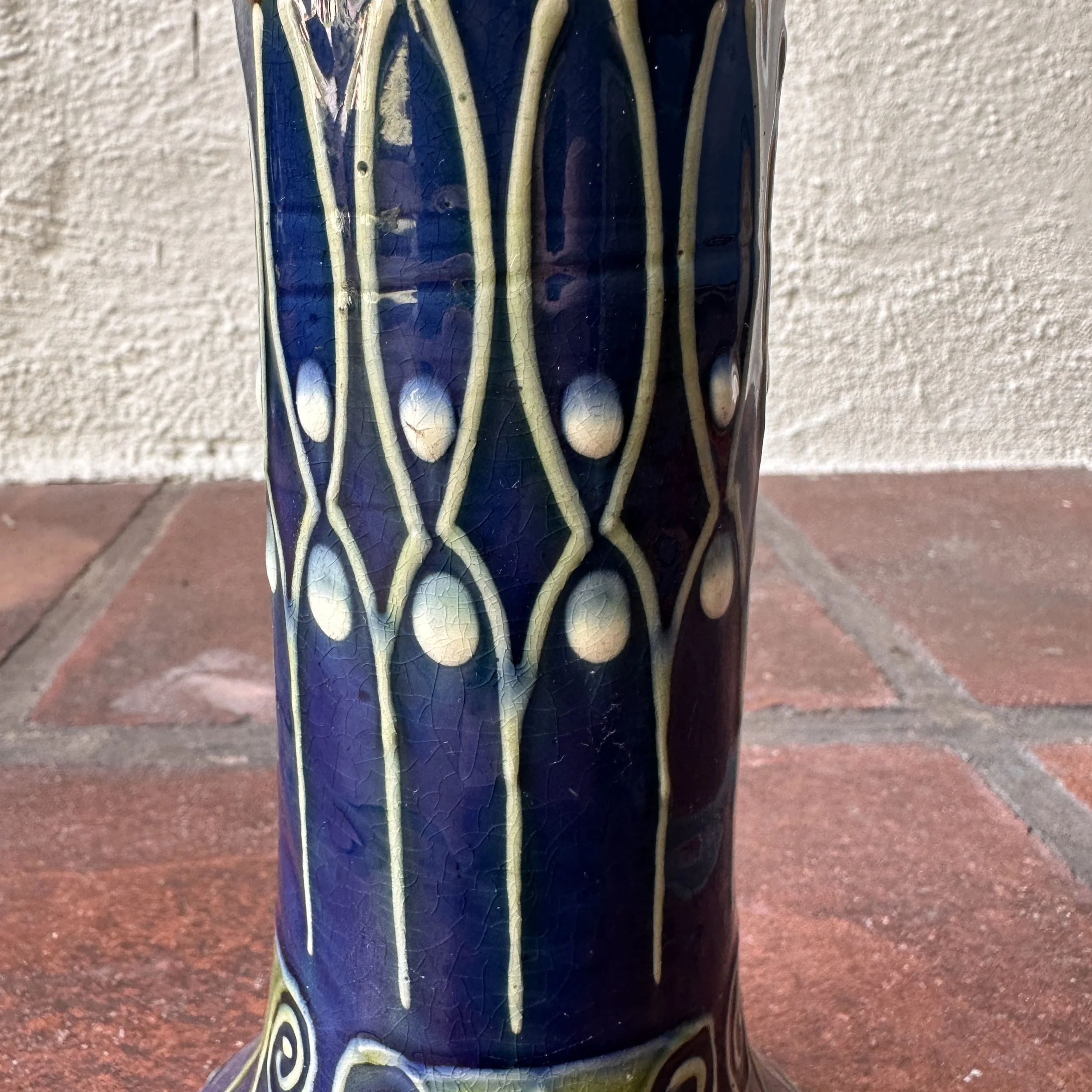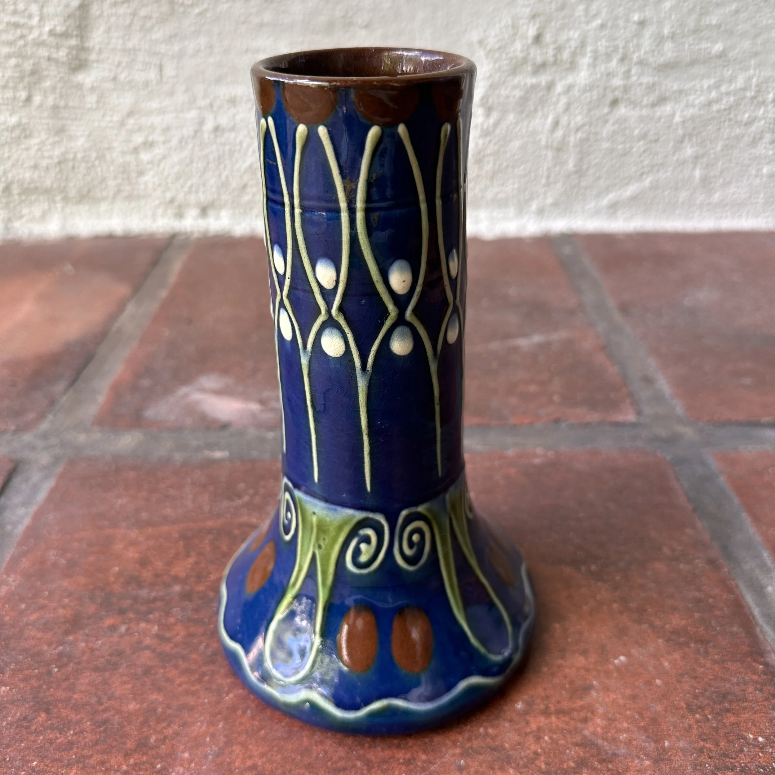 PAW Pottery vase circa 1904. A ceramic vase with a strong Secessionist raised line pattern in blues, greens, white and red glazes. PAW signature to base. A small edge chip at top, otherwise very good condition. Measures 7.5” tall and 4.5” wide. $225