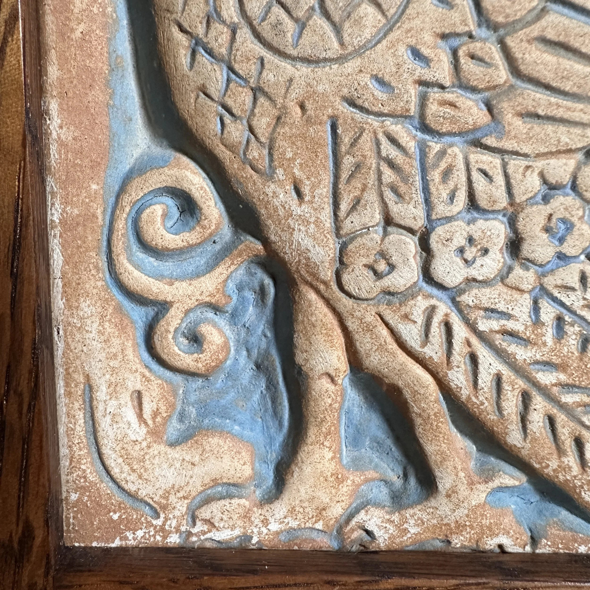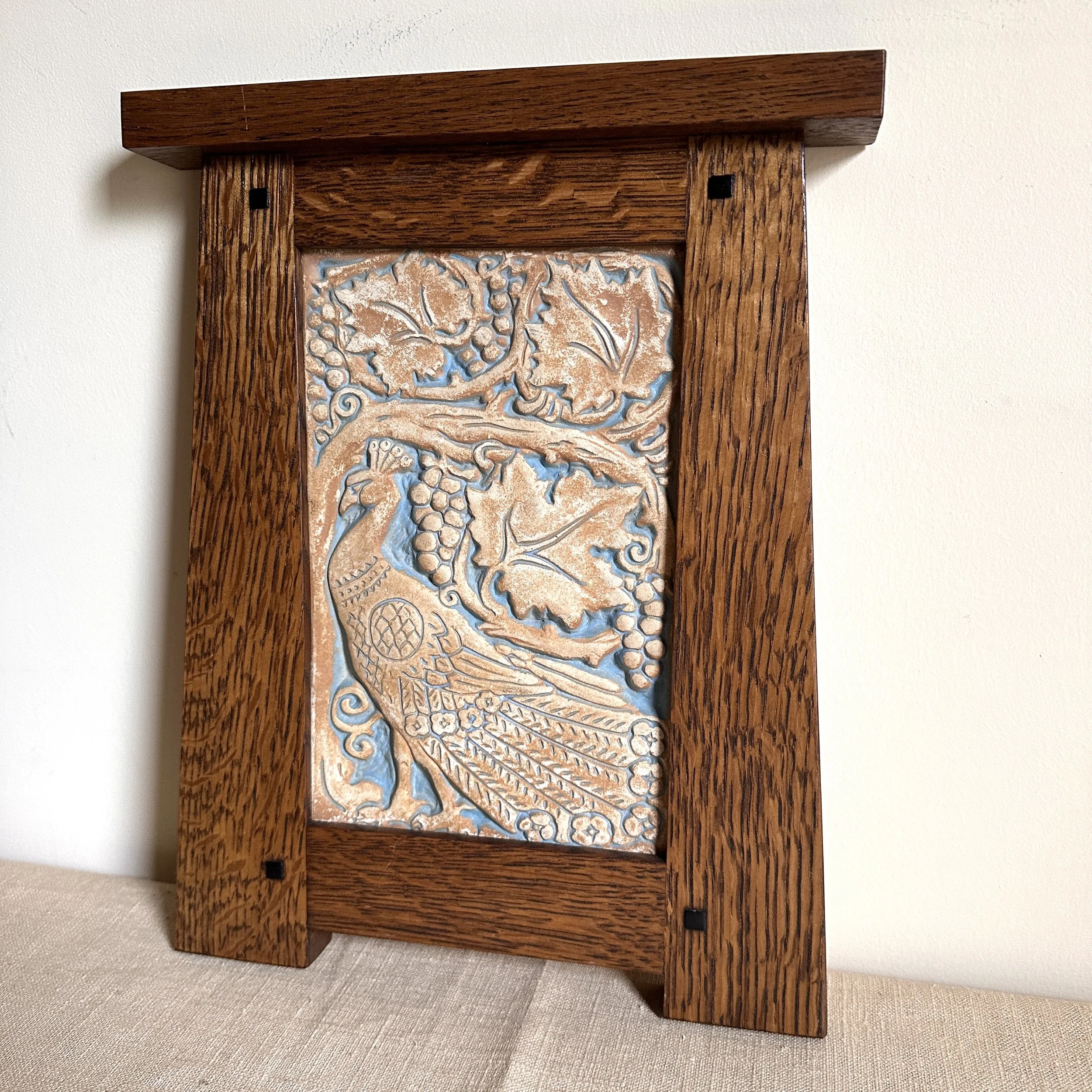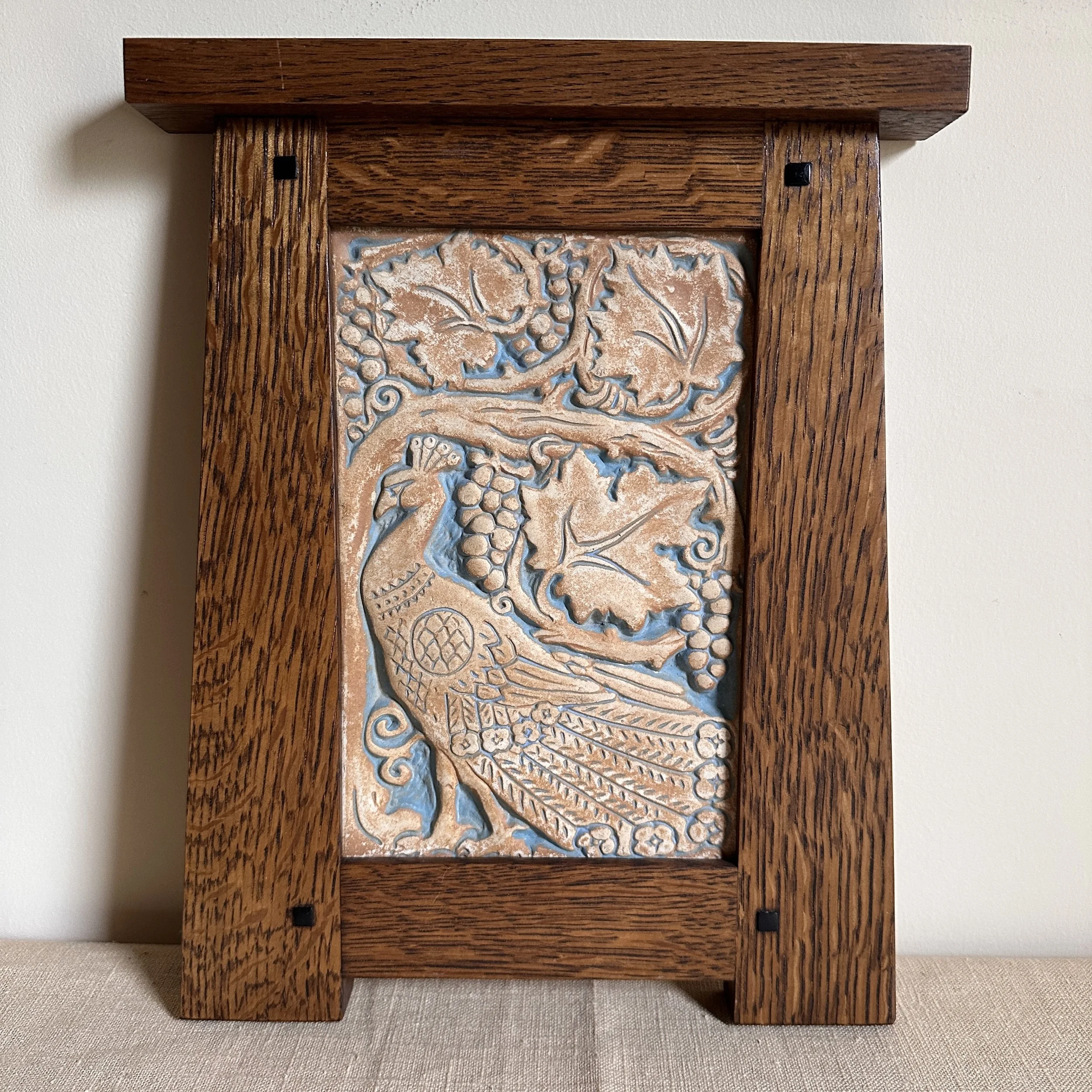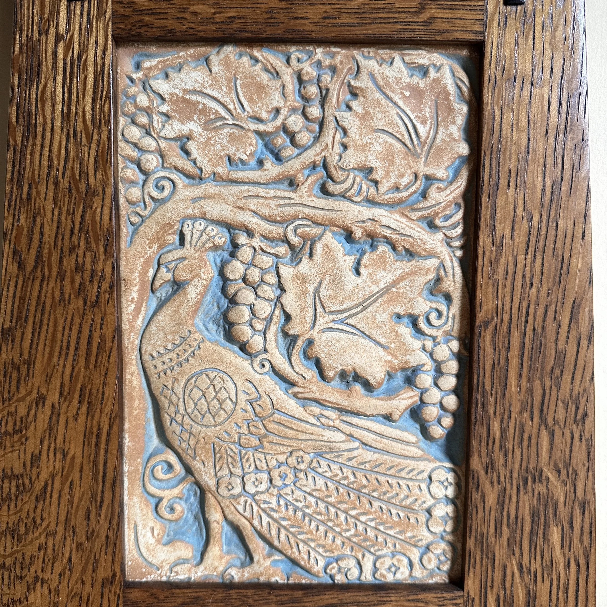 Batchelder tile, Los Angeles CA circa 1918. A large and heavy tile depicting a peacock under a grapevine. This is a strong impression with deep crevices and detail, beautiful tan and blue glazing. Custom oak frame with ebony pegging. Excellent condition and signed twice on reverse. Tile measures 9” by 6” wide, frame is 13” tall and 10.25” wide at top. $1,200
