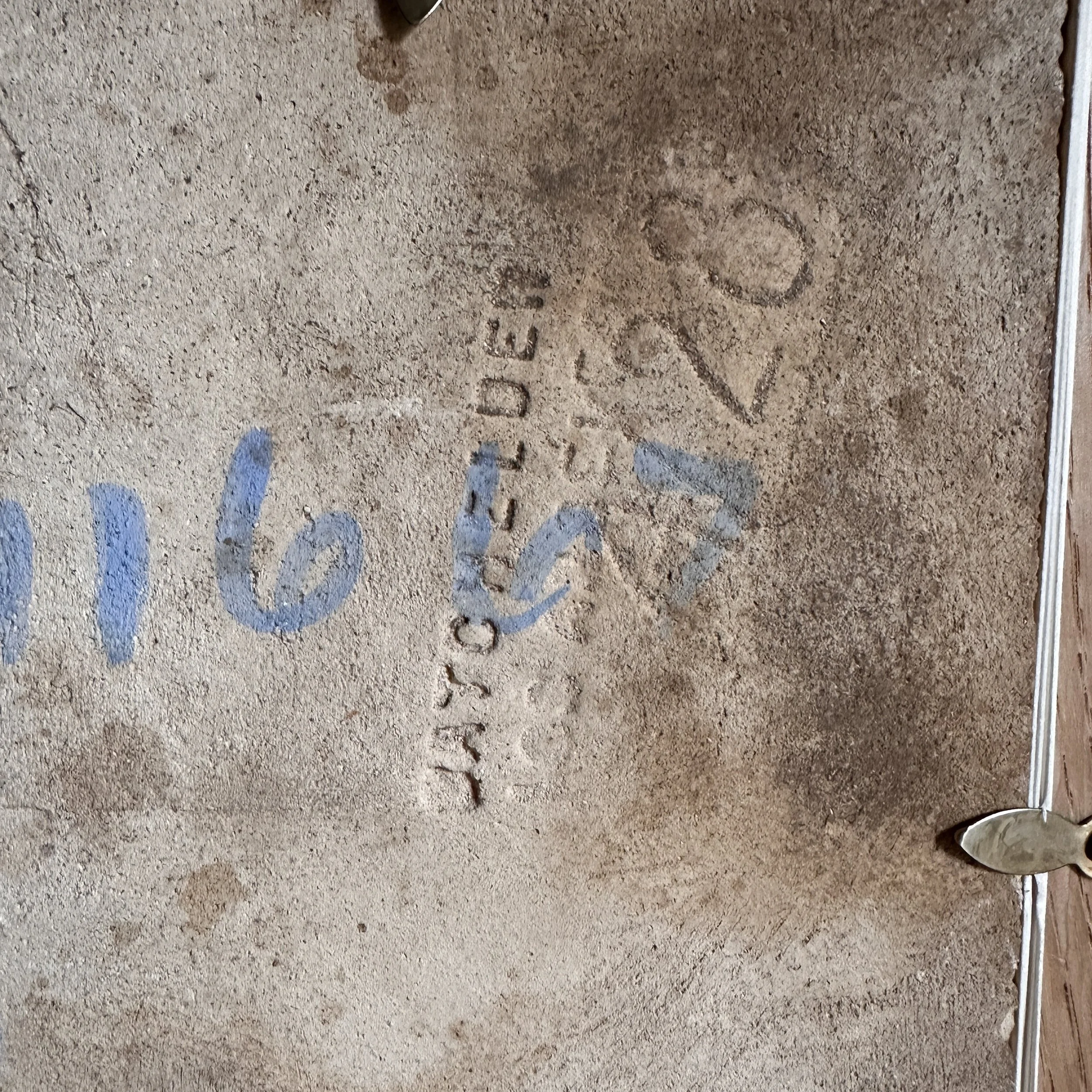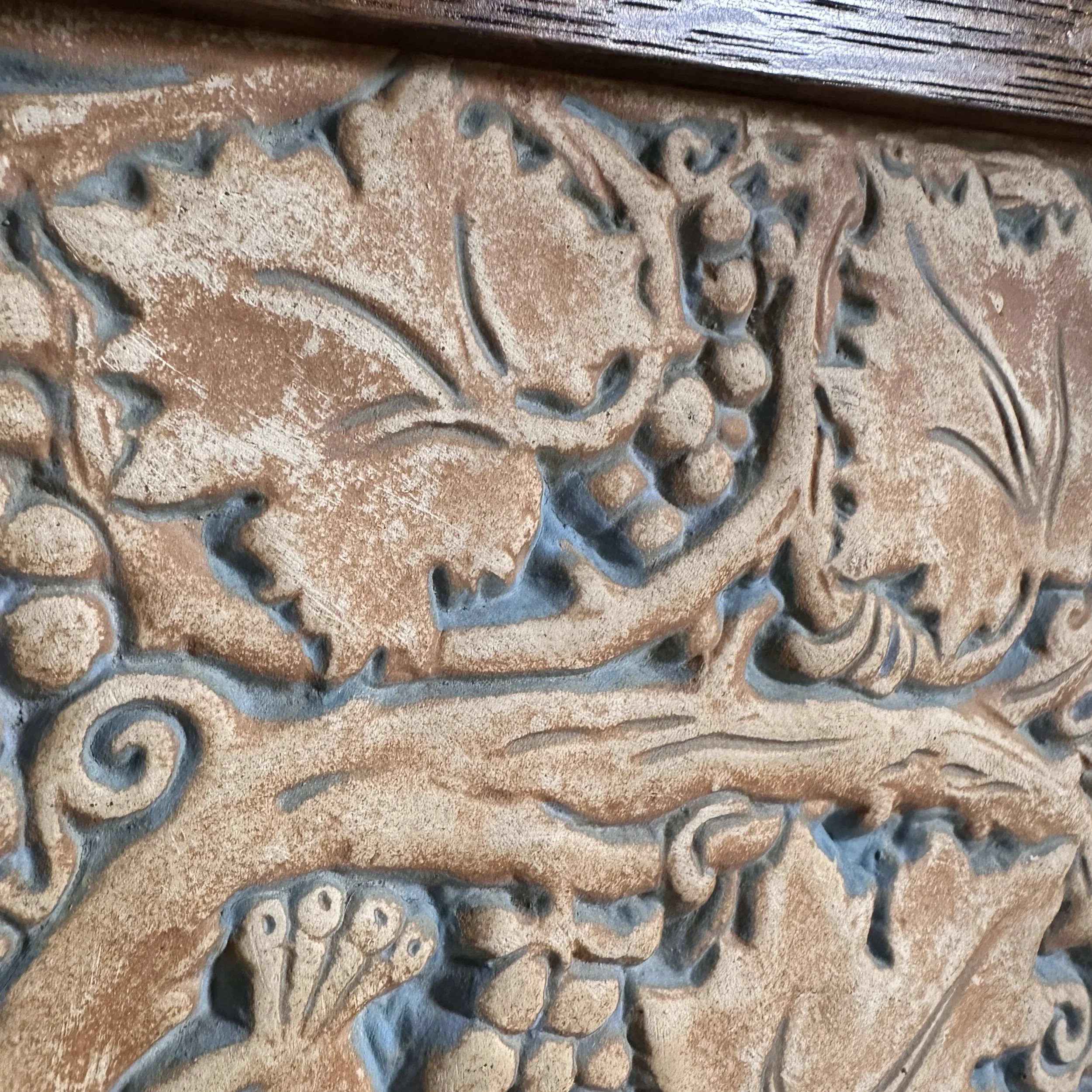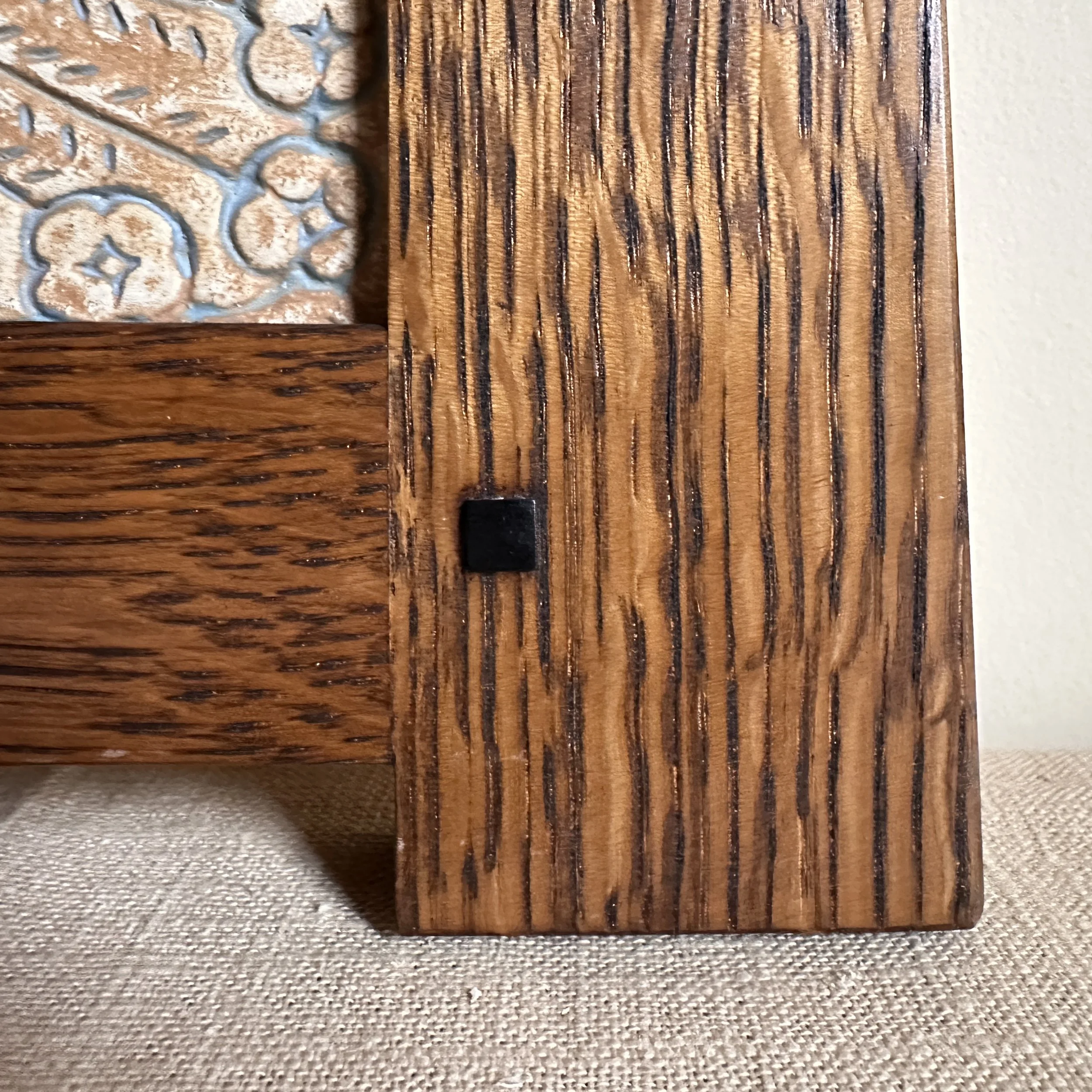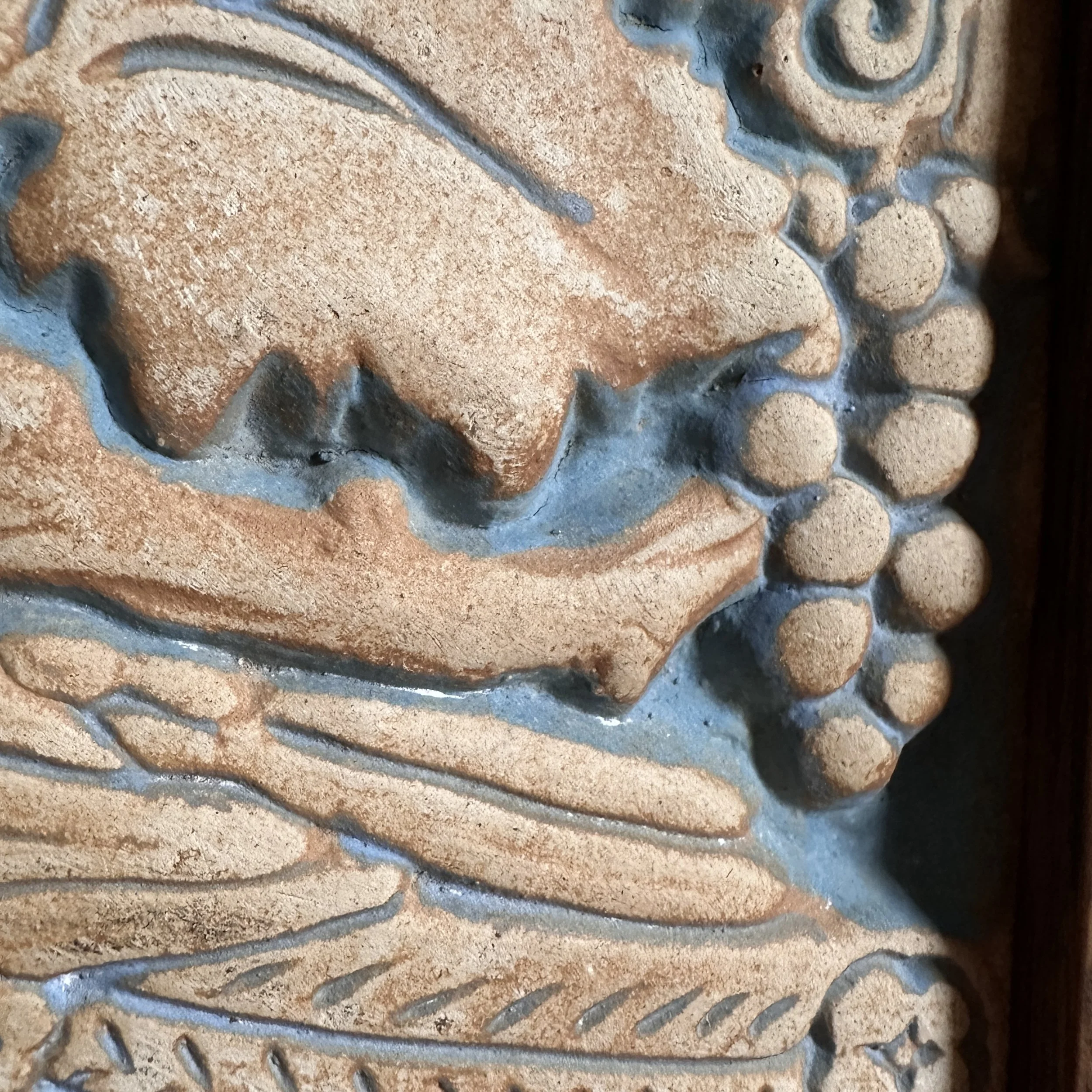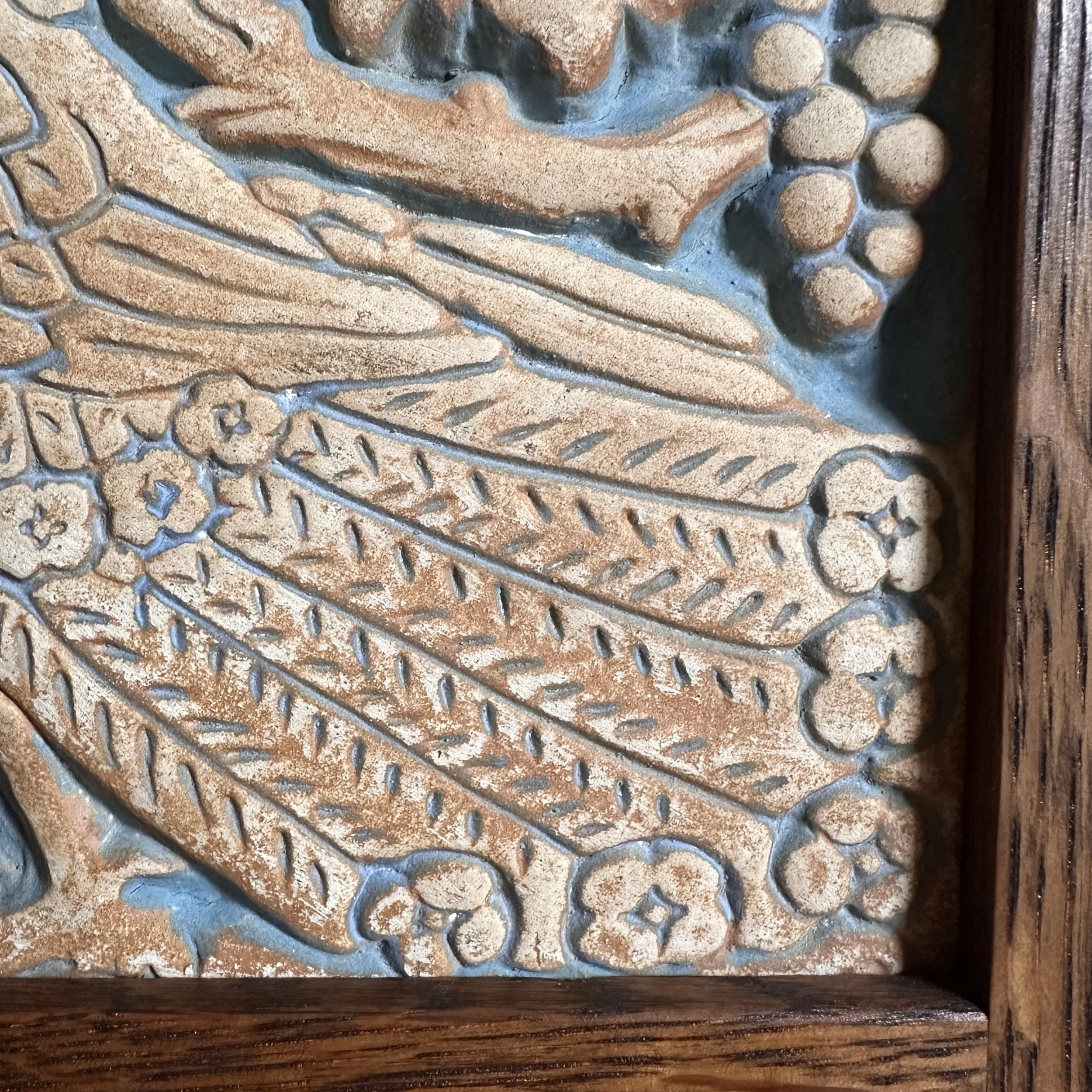 Batchelder tile, Los Angeles CA circa 1918. A large and heavy tile depicting a peacock under a grapevine. This is a strong impression with deep crevices and detail, beautiful tan and blue glazing. Custom oak frame with ebony pegging. Excellent condition and signed twice on reverse. Tile measures 9” by 6” wide, frame is 13” tall and 10.25” wide at top. $1,200