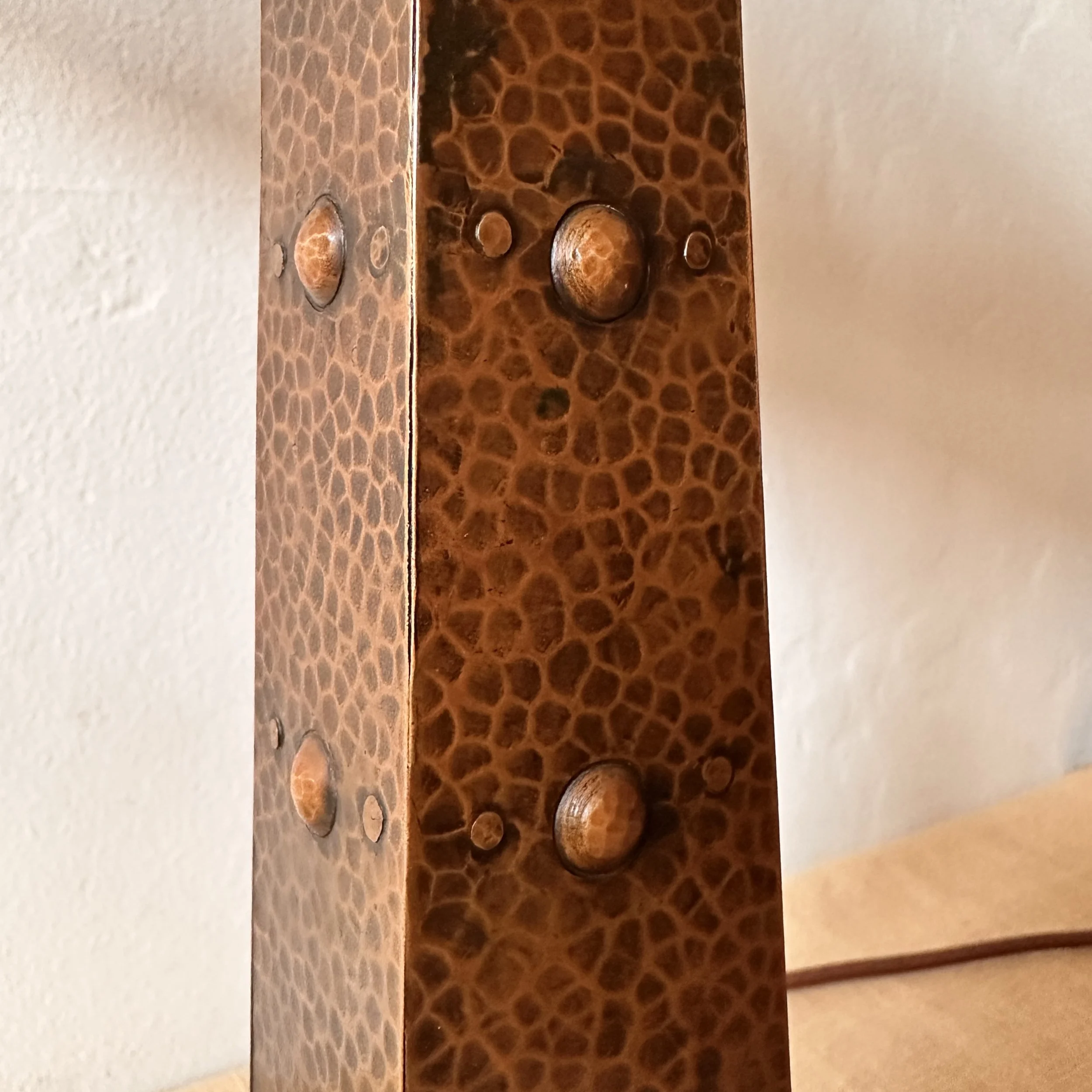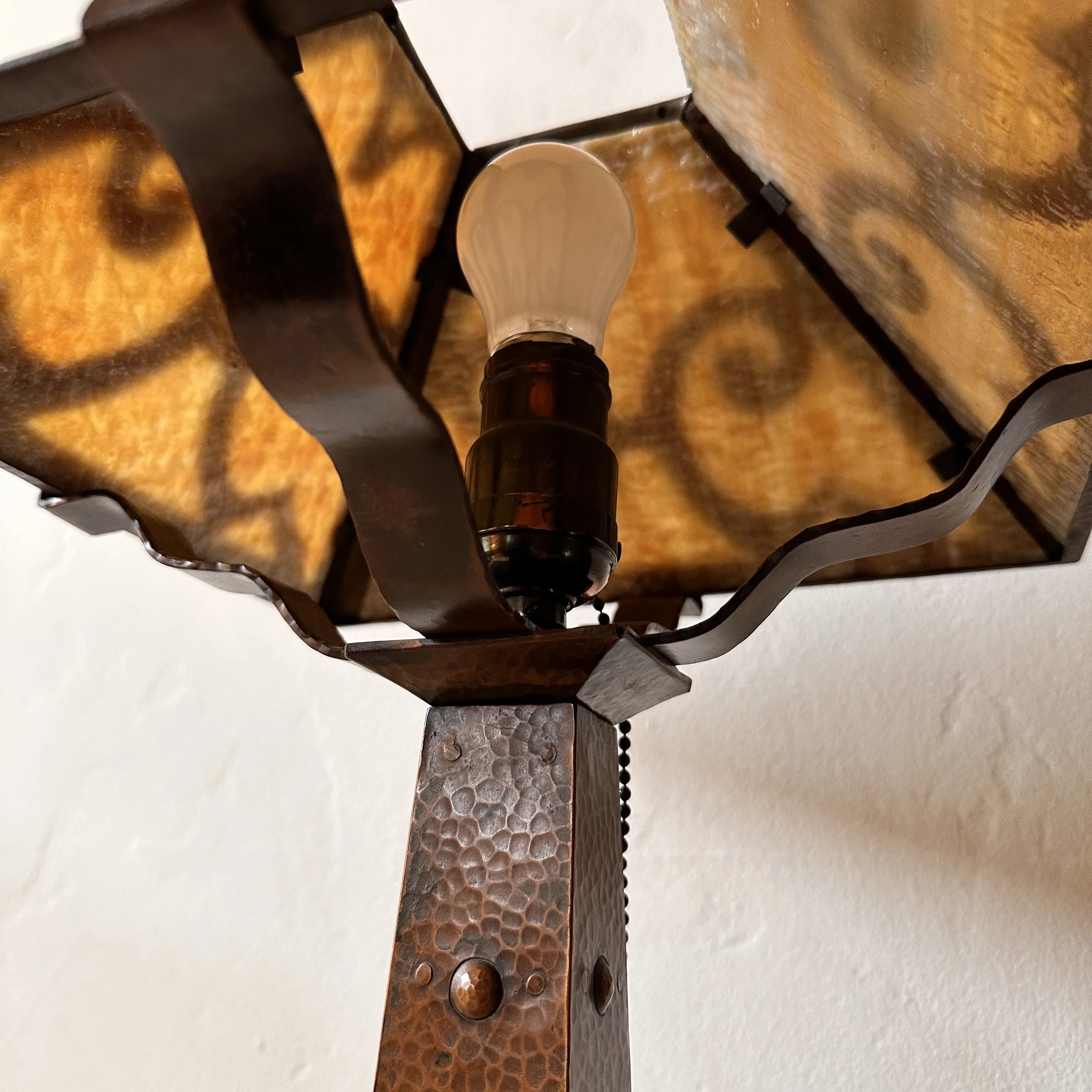 Benedict Art Studio hammered copper No. 231 lamp, Syracuse NY circa 1907. A near mint original condition hammered copper and cats paw kokomo glass table lamp. Sensational hammering and patina, wonderful dimensions and presence. Unsigned but pictured in period catalog. Measures 19” tall, shade is 11” square. SOLD