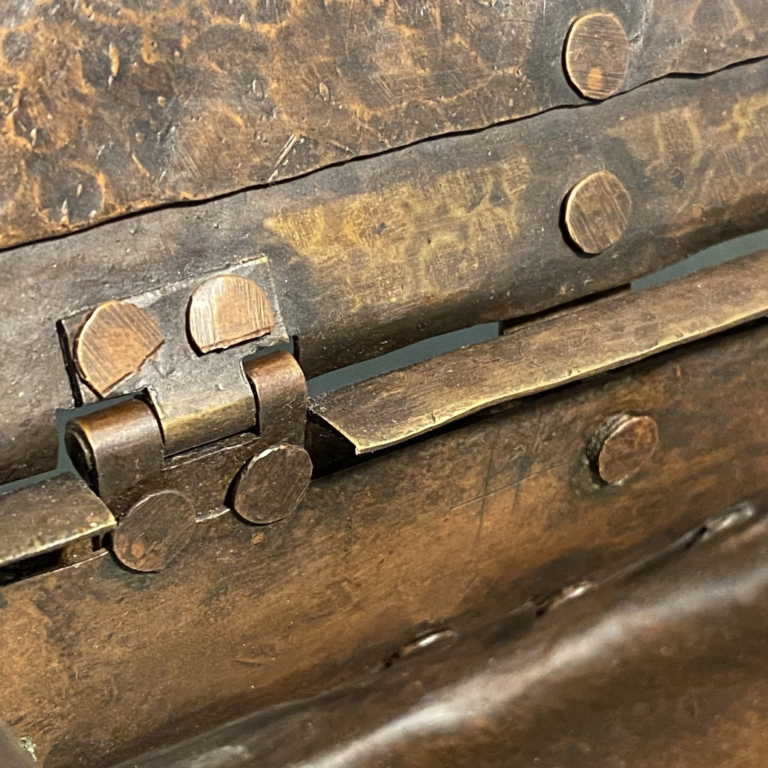 Benedict Art Studio handkerchief box, East Syracuse NY circa 1907. A stunning & detailed hammered copper box with brass trim and decorative floral designs on top and all four sides. The applied riveted designs also have additional detailed hammering done with a leather working tool. Lid has a small handle clasp and an arm used to hold the box lid open when it hits the back. Unsigned but pictured in the new Benedict catalog reprint where it cost $24 (which is around $750 today). One of the finest boxes of the Arts & Crafts movement. Measure 6.75” square and 3.75” tall. SOLD