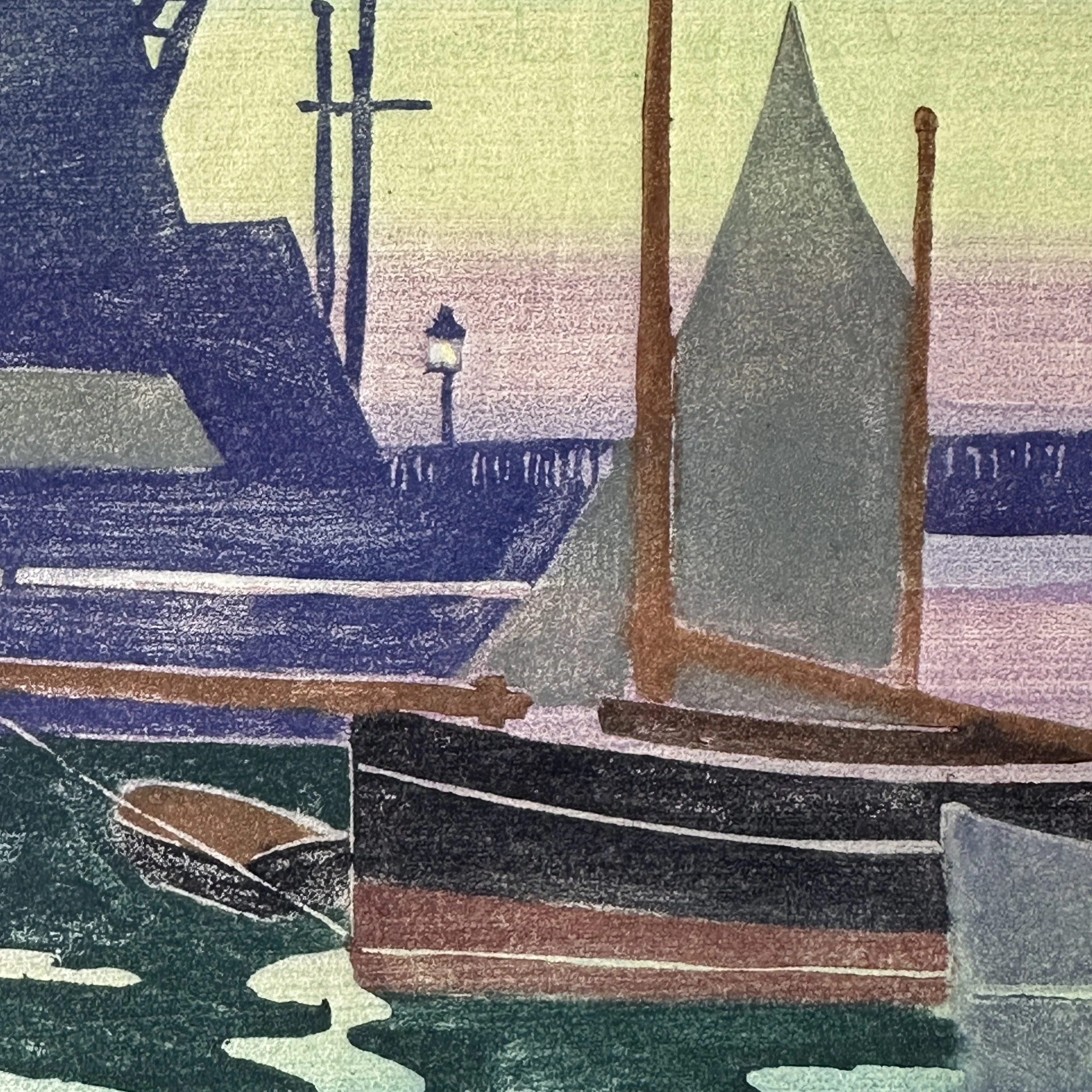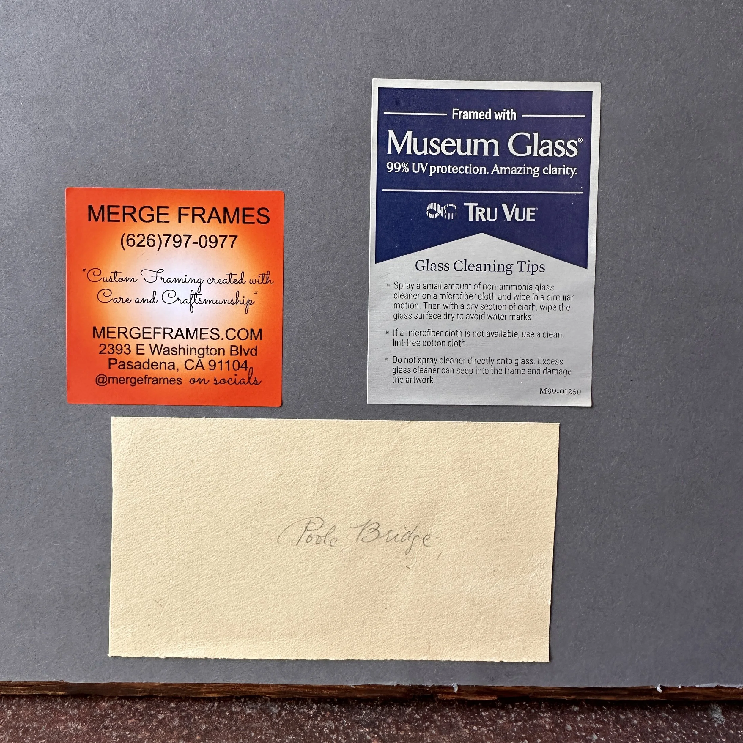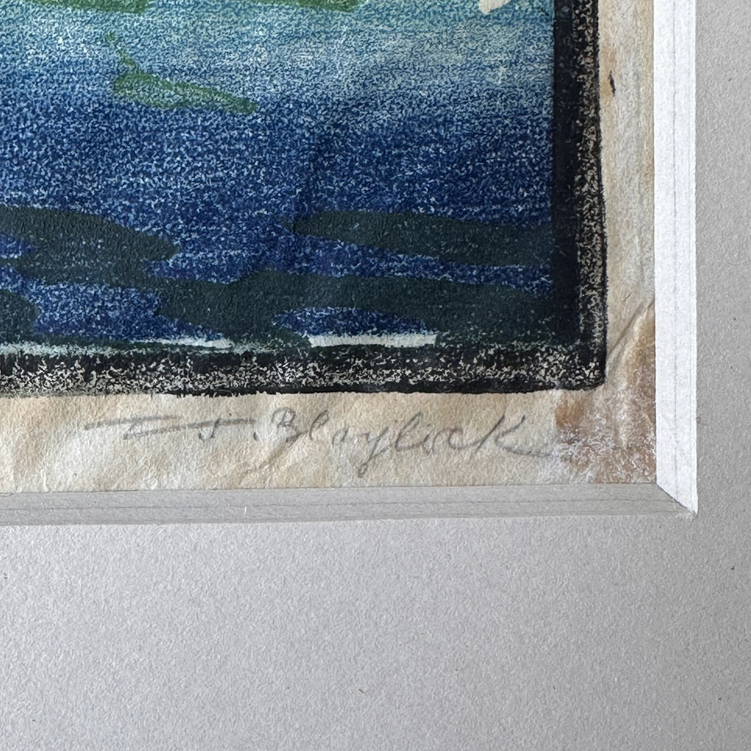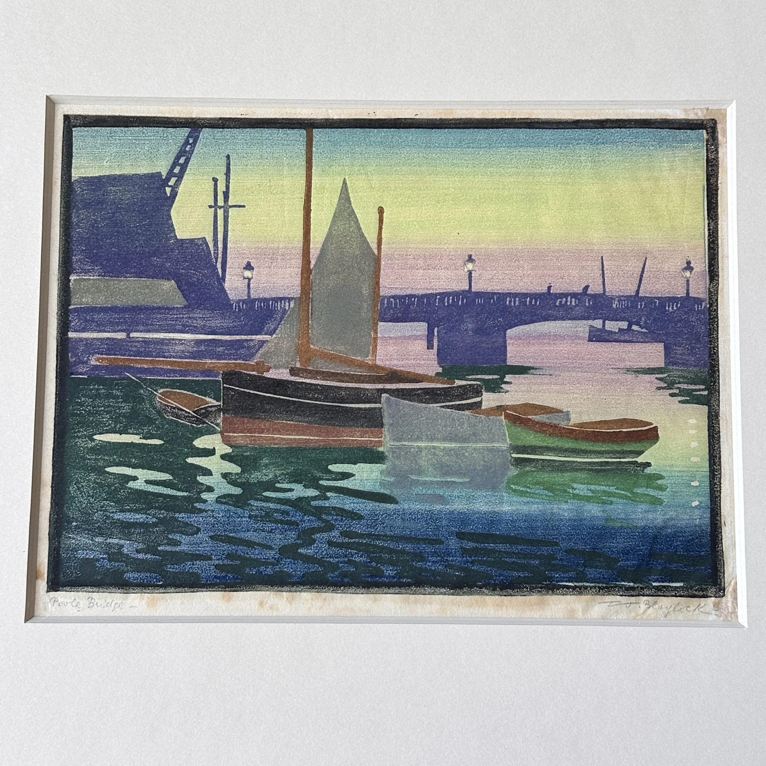 Thomas Todd Blaylock (1876 - 1929) “Poole Bridge” woodblock, Poole England circa 1910. Blaylock was born in Scotland and studied at the Royal Academy of Art in London. His landscape prints are quite rare, this image is one of his finest. Some mild discoloration around the edges, overall excellent condition and unmounted. Newly framed in a large quarter sawn oak period frame under museum glass. Some small scratches to lower edge of frame. Frame measures 20” by 18” tall, image at 9.5” by 6.5” tall. SOLD