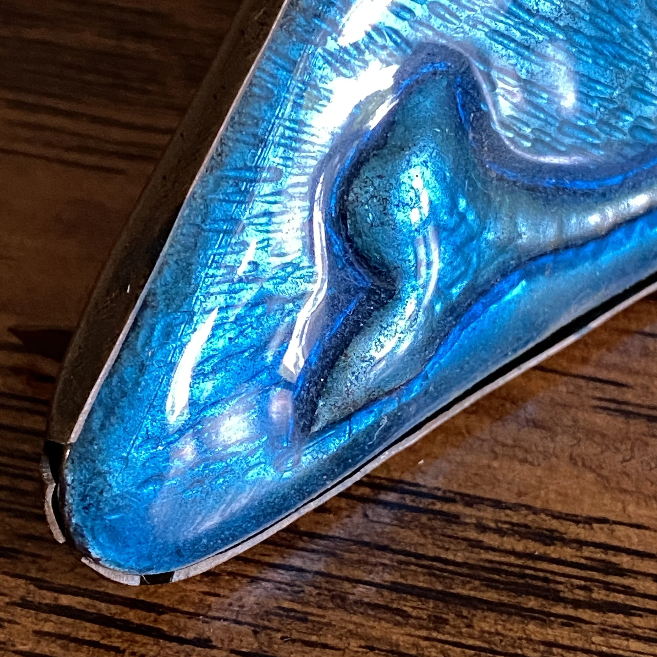 Boston Society of Arts & Crafts enameled blotter corner decorations, Boston circa 1905. We have here a set of three blotter corners (sold individually), each with a heavily hammered viking ship design with a gorgeous blue enamel. These panels are secured to copper backers with original “clips” to secure to a desk pad. We have taken the liberty to gently bend these to create a stand for each panel, perfect for enjoying each one as a standing work of art. These are each unique in design and all in excellent condition. Measure 6” wide & 3.5” tall. $350/each