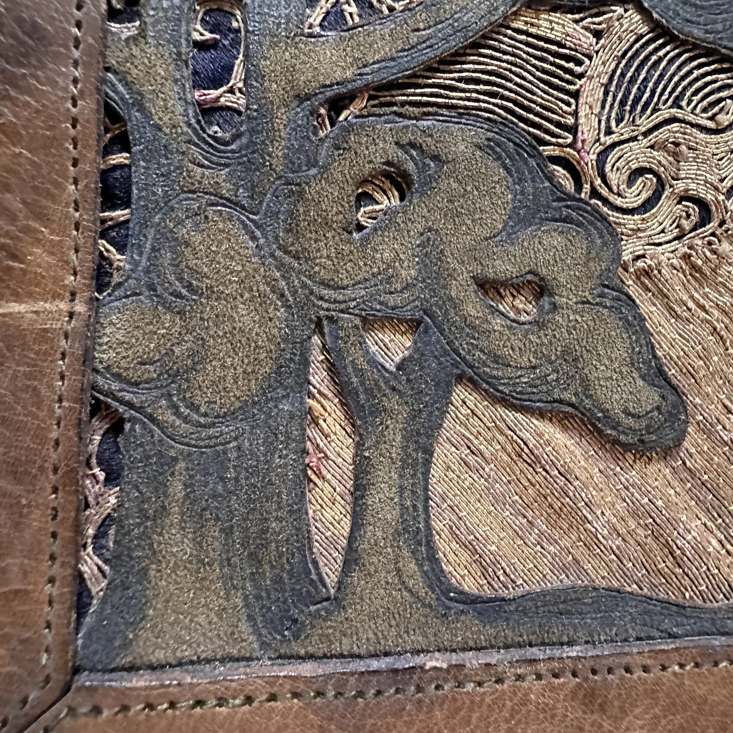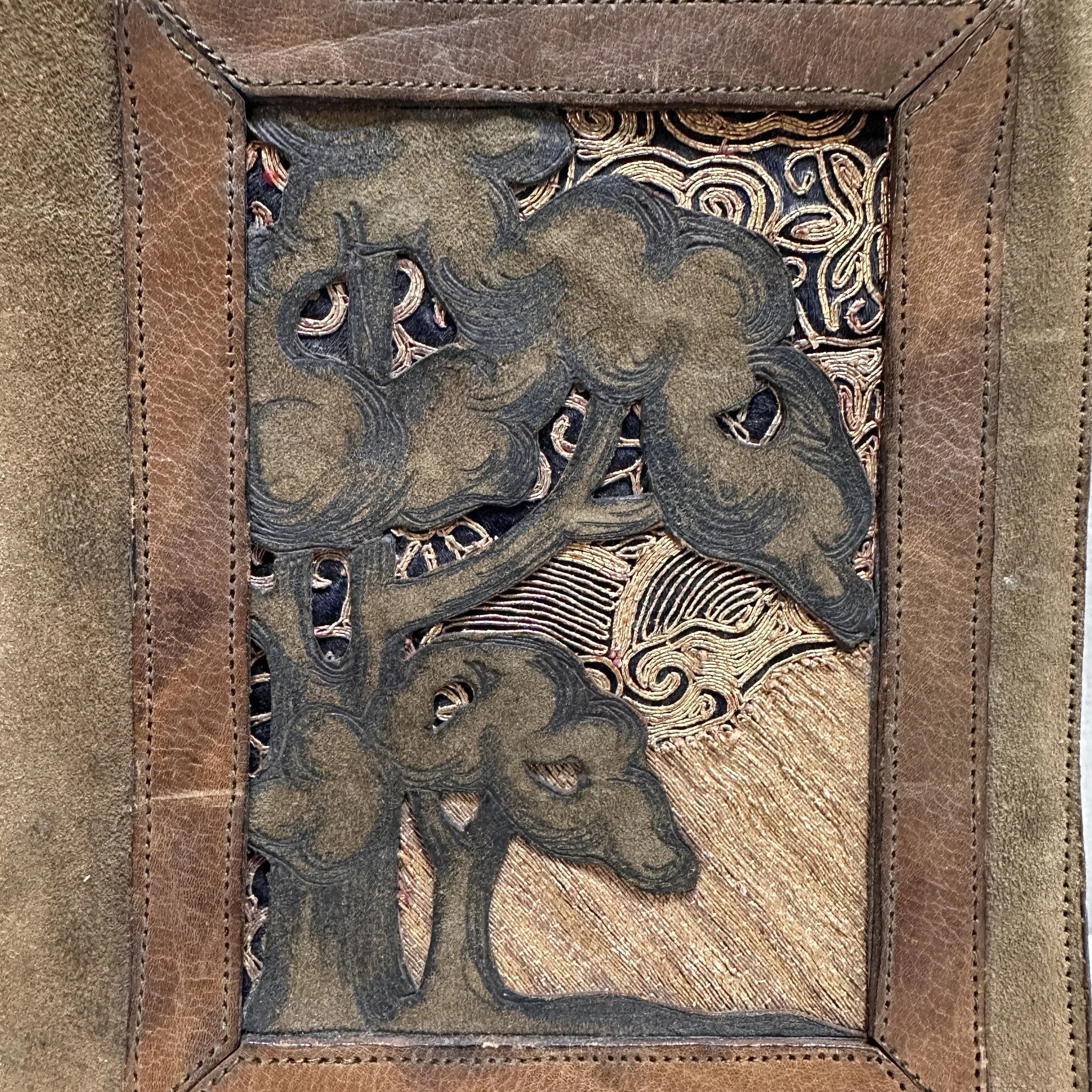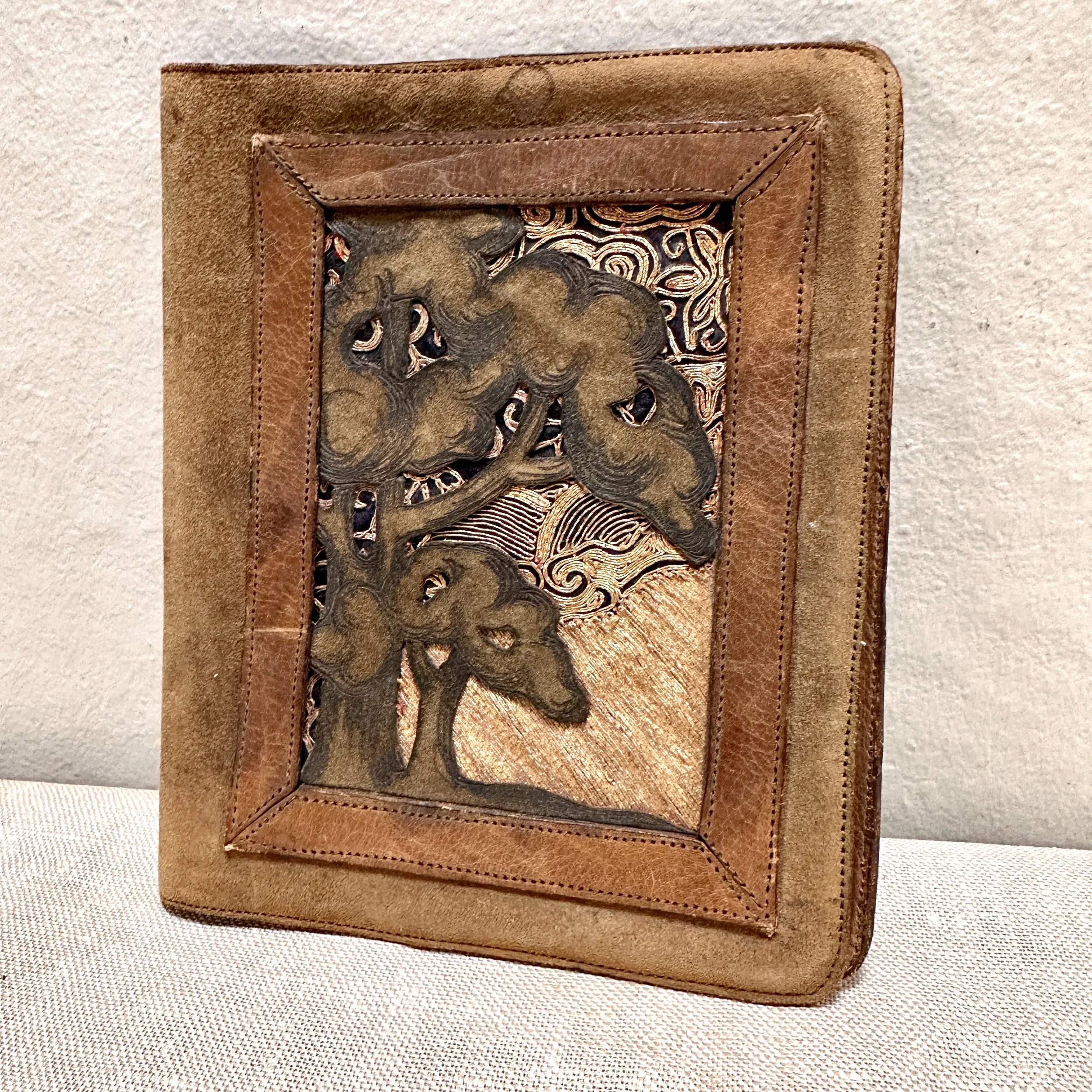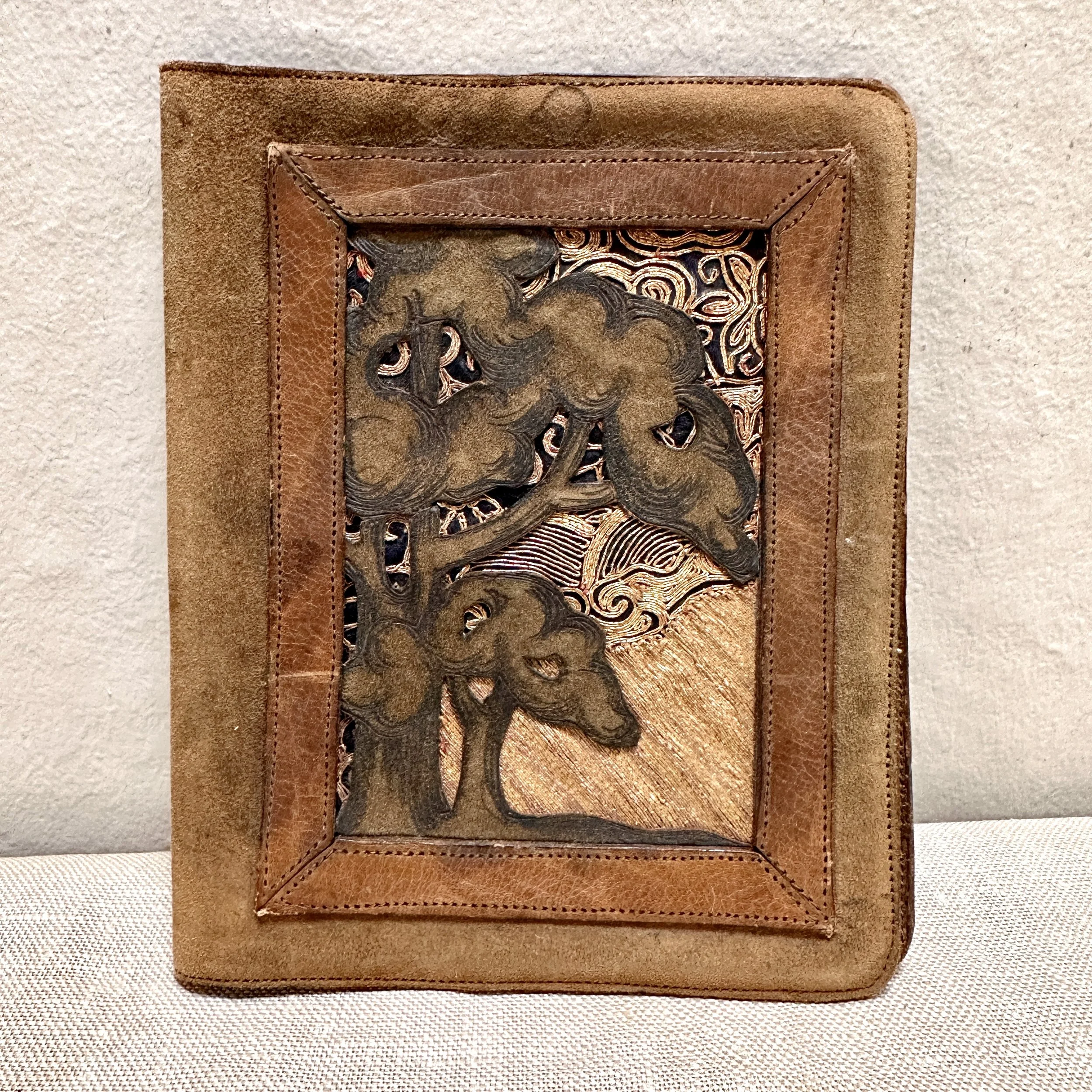 Elizabeth Eaton Burton leather book cover, Santa Barbara circa 1904. Burton had a patent on her “burnt leather” technique as seen in these California oaks, a motif she also crafted in a copper on leather folio (see photo). The design is overlayed on a piece of decorated Chinese silk depicting mountains and clouds in the distance. Overall very good condition, unsigned but fully attributed to Burton. Measures 6” by 5” wide. $450