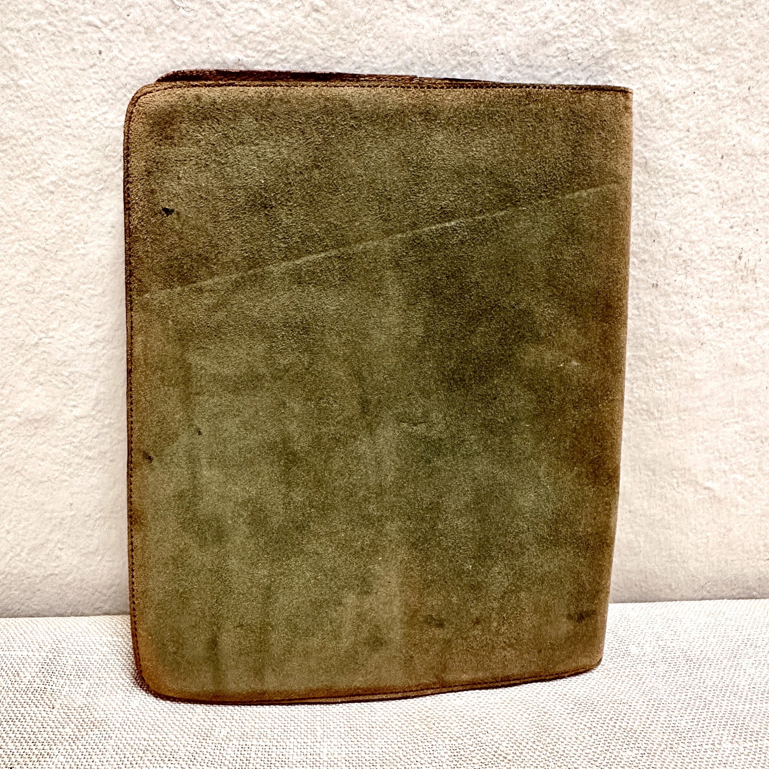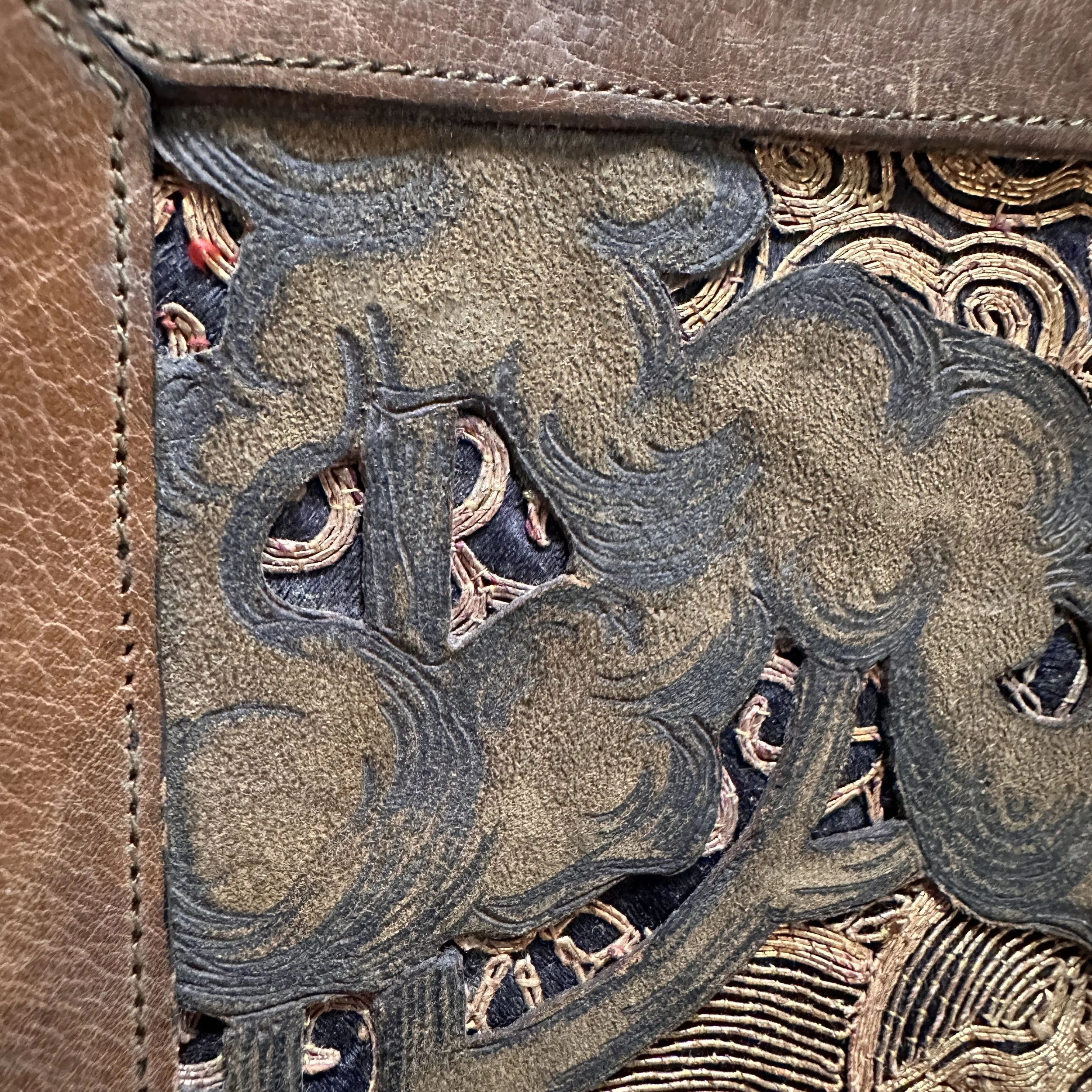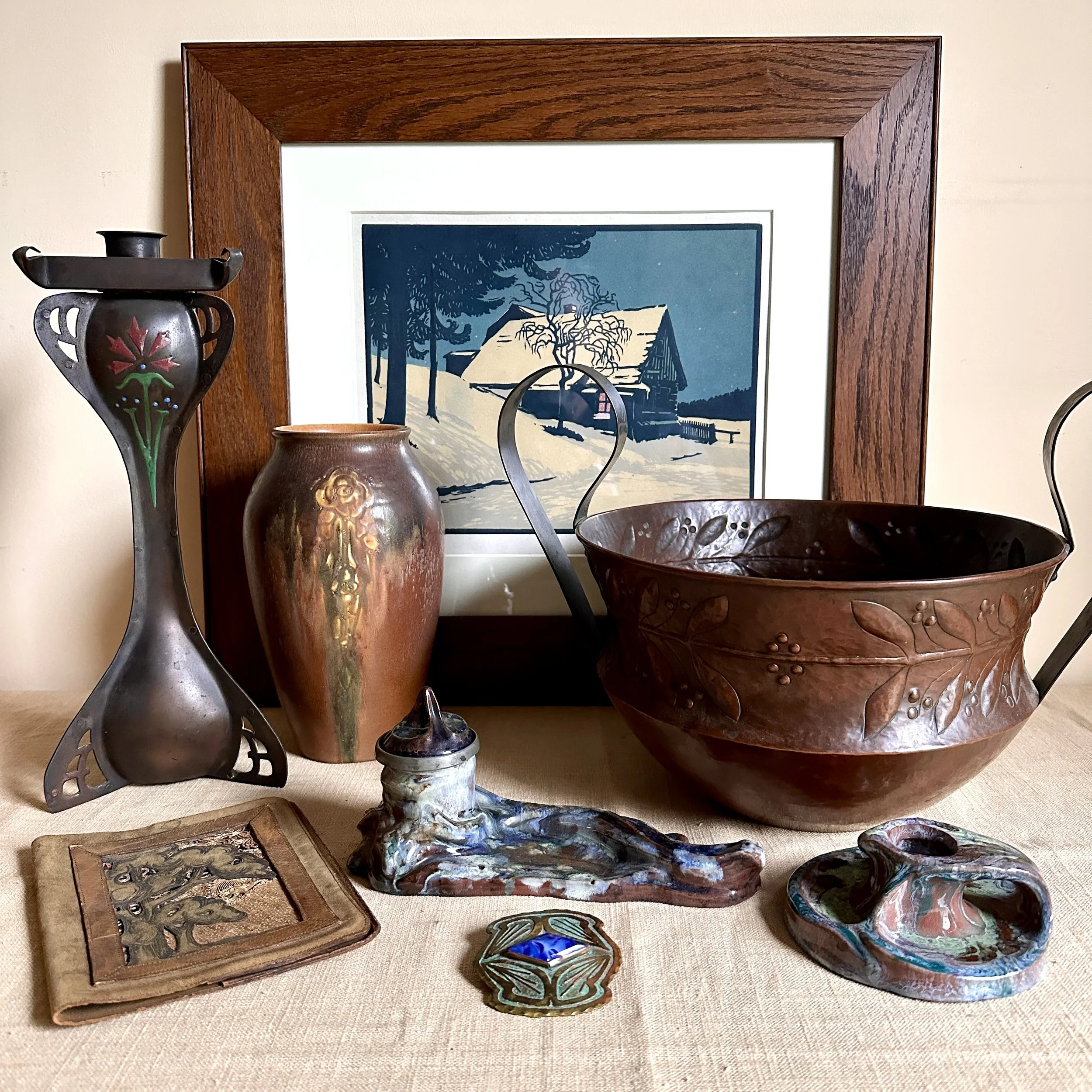 Elizabeth Eaton Burton leather book cover, Santa Barbara circa 1904. Burton had a patent on her “burnt leather” technique as seen in these California oaks, a motif she also crafted in a copper on leather folio (see photo). The design is overlayed on a piece of decorated Chinese silk depicting mountains and clouds in the distance. Overall very good condition, unsigned but fully attributed to Burton. Measures 6” by 5” wide. $450