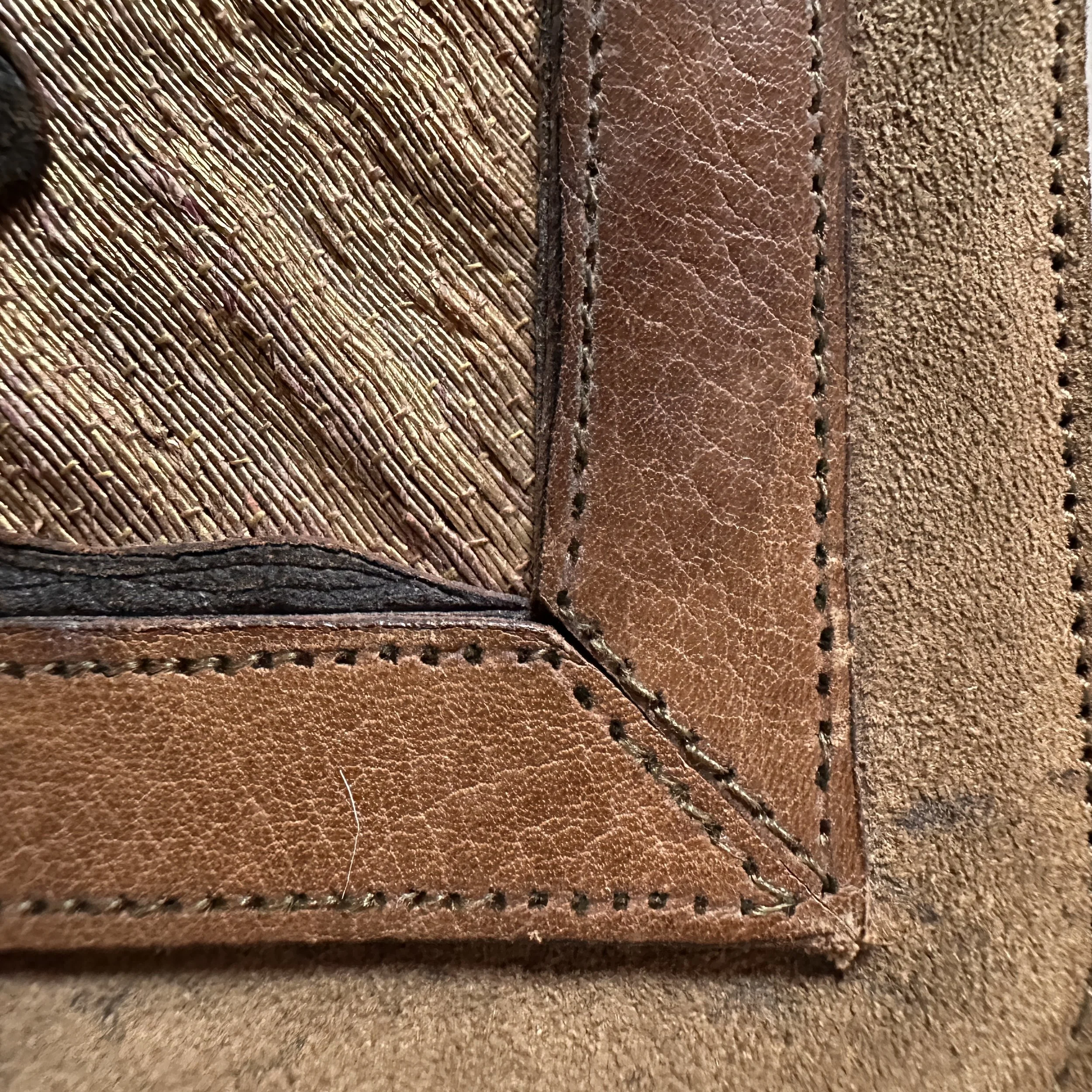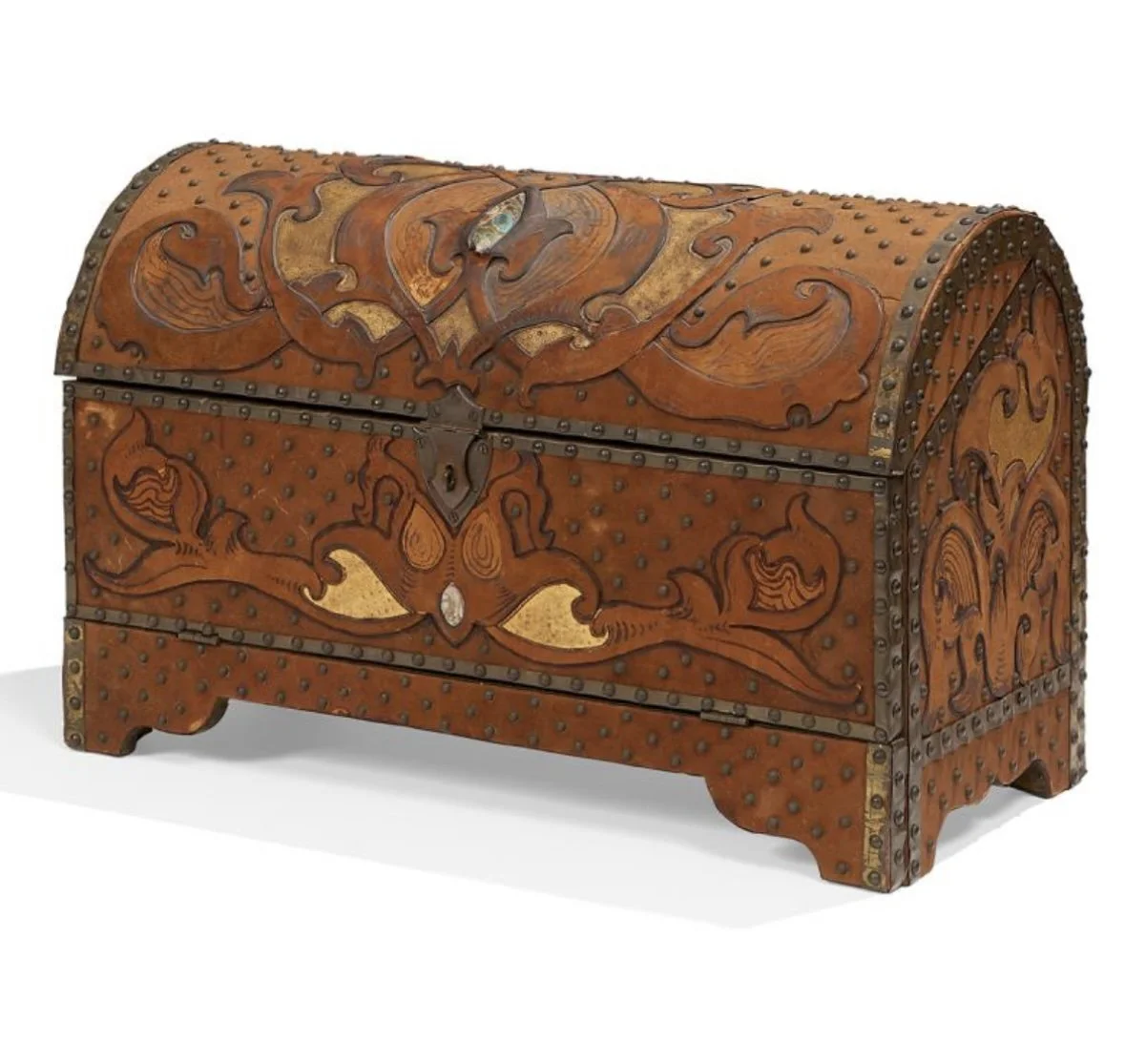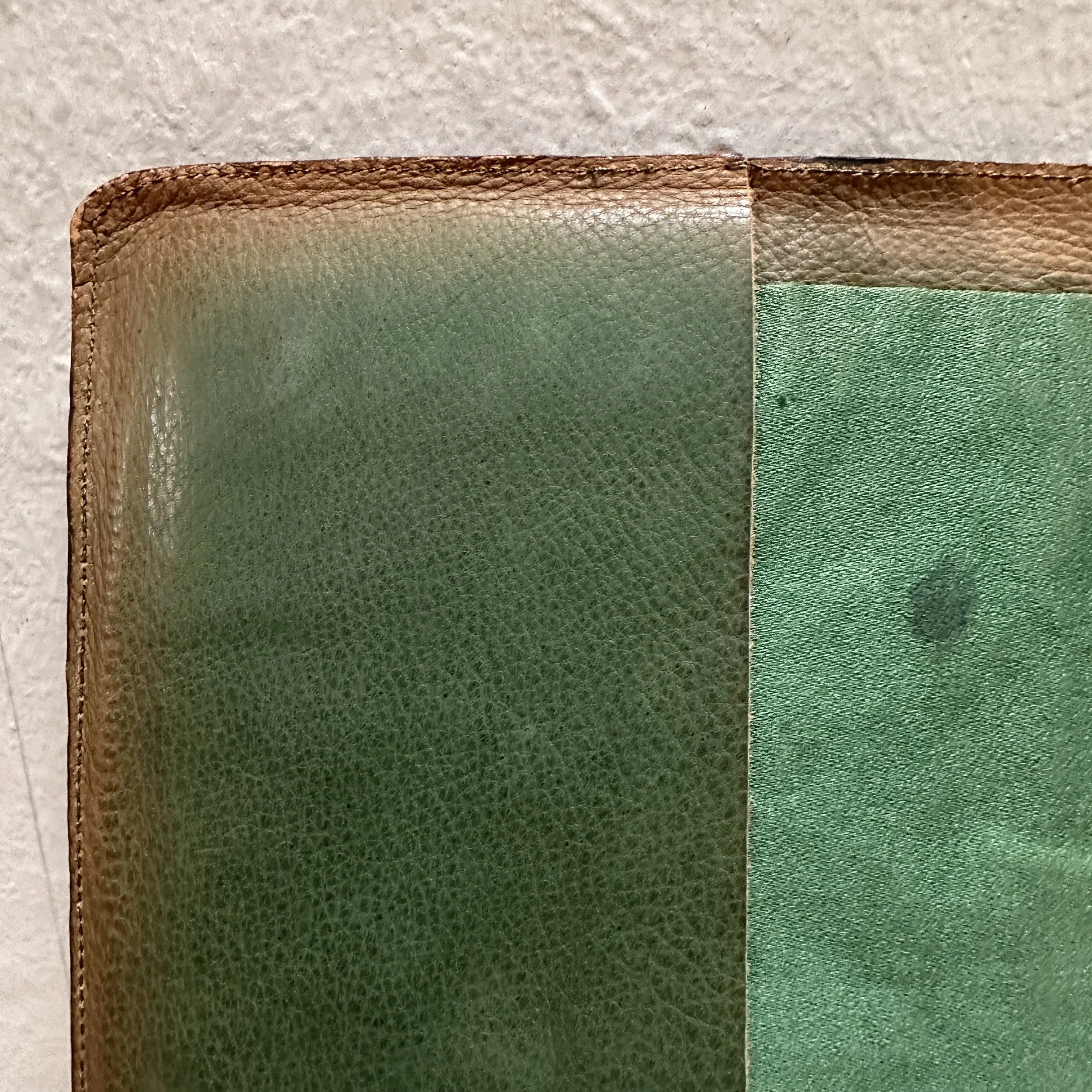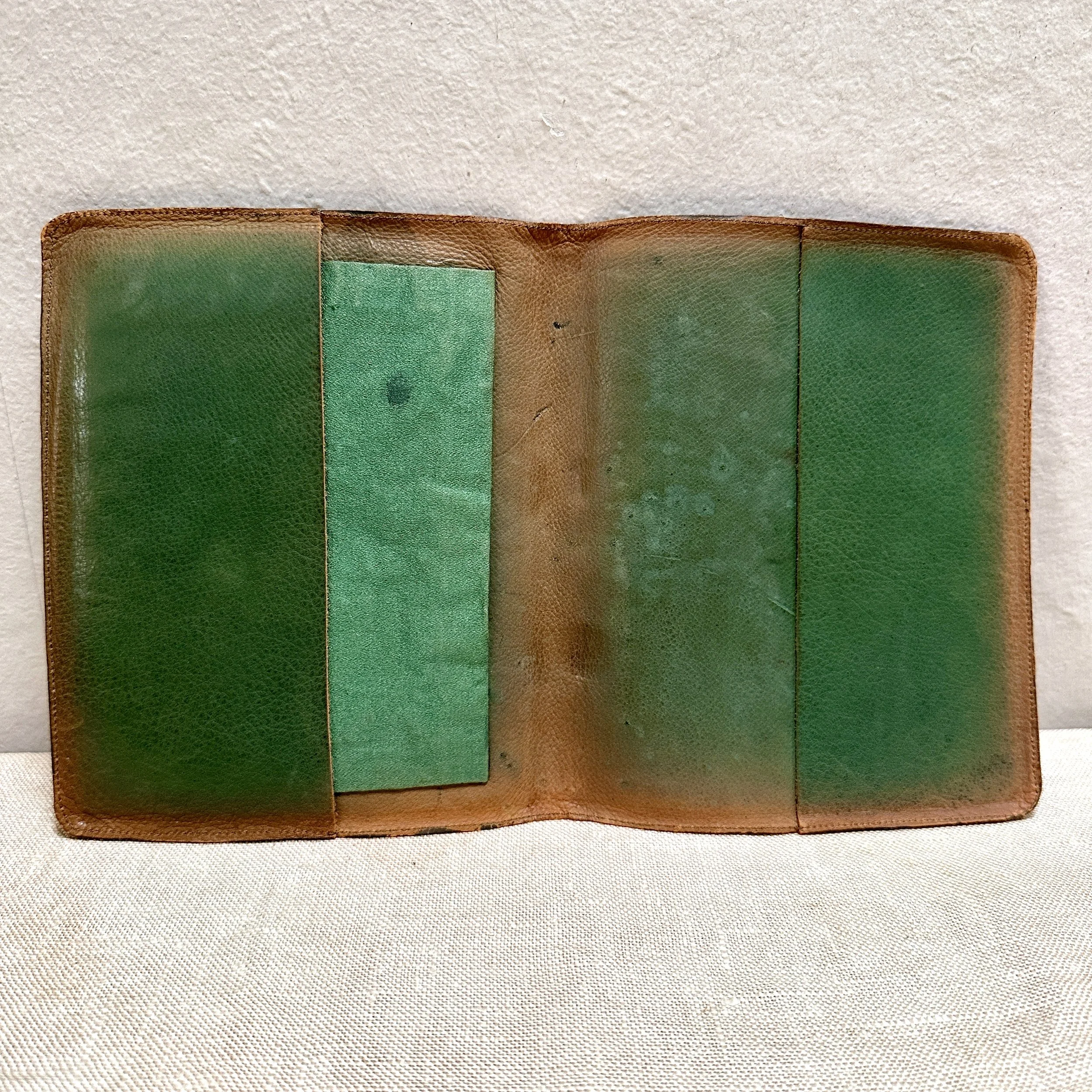 Elizabeth Eaton Burton leather book cover, Santa Barbara circa 1904. Burton had a patent on her “burnt leather” technique as seen in these California oaks, a motif she also crafted in a copper on leather folio (see photo). The design is overlayed on a piece of decorated Chinese silk depicting mountains and clouds in the distance. Overall very good condition, unsigned but fully attributed to Burton. Measures 6” by 5” wide. $450