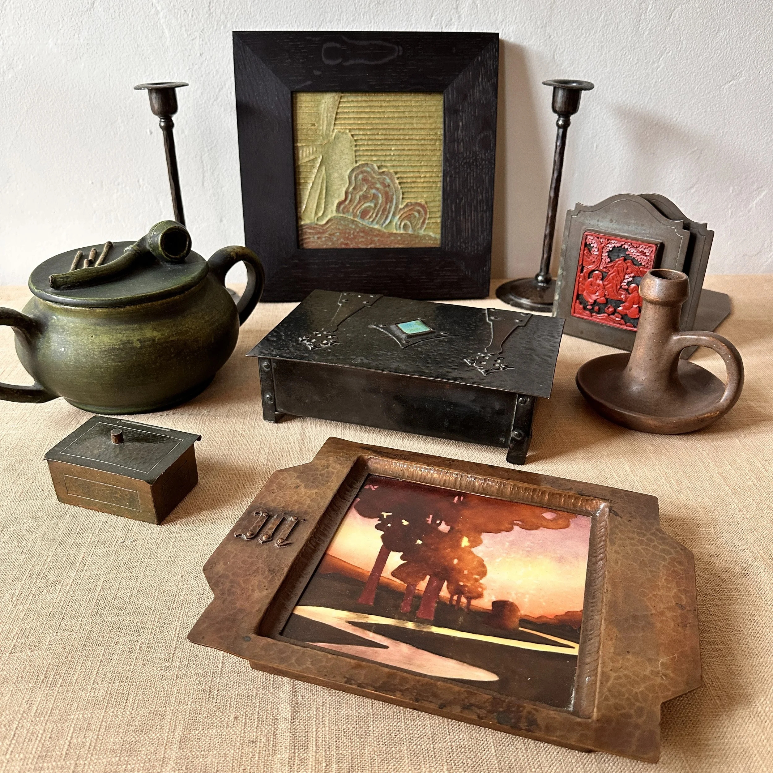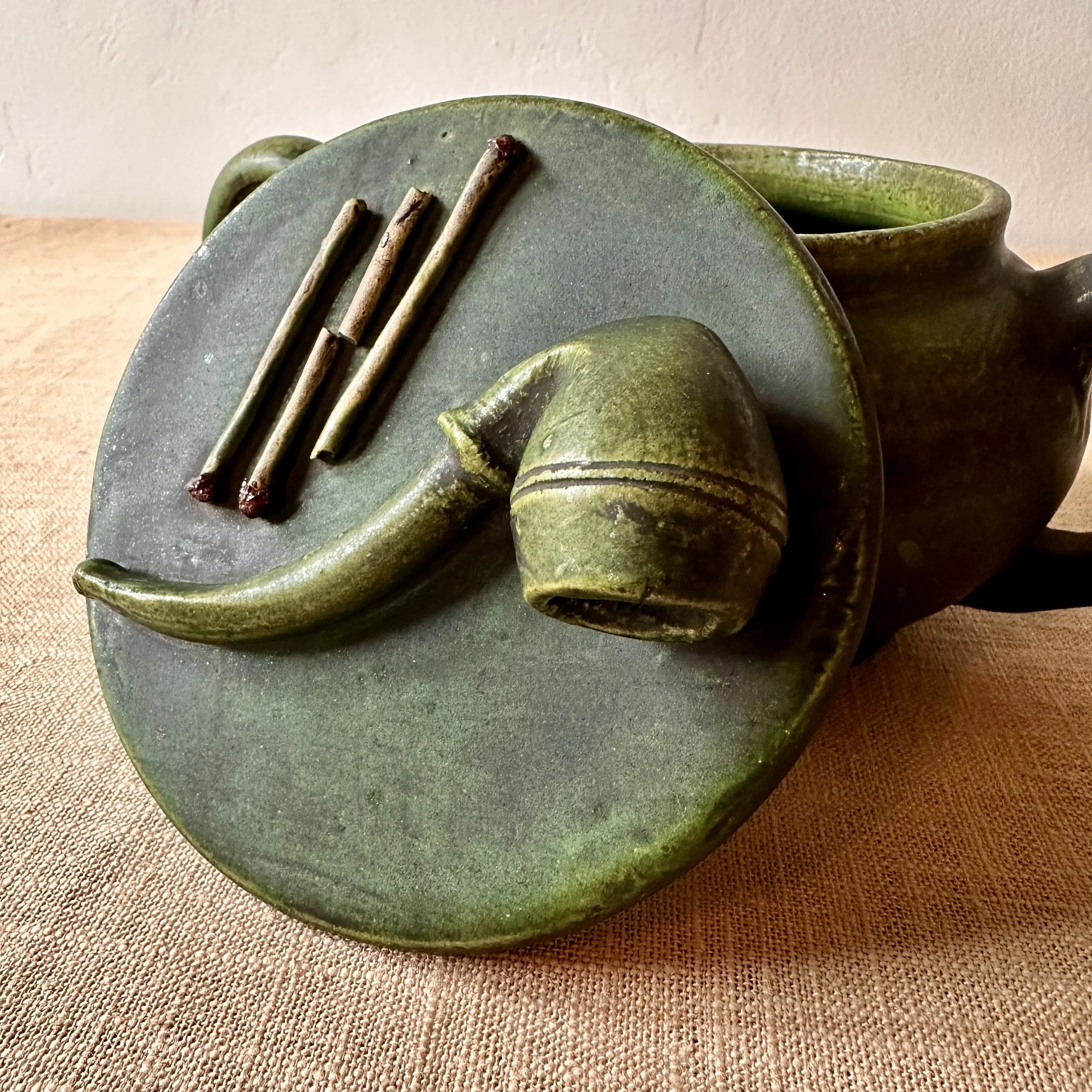 Cambridge Pottery “Otoe” humidor, Cambridge, OH circa 1907. A great Arts & Crafts matte green two-handled covered humidor with applied hand carved pipe and match sticks to lid. Excellent condition, unmarked. Measures 10" wide and 5" tall. $550