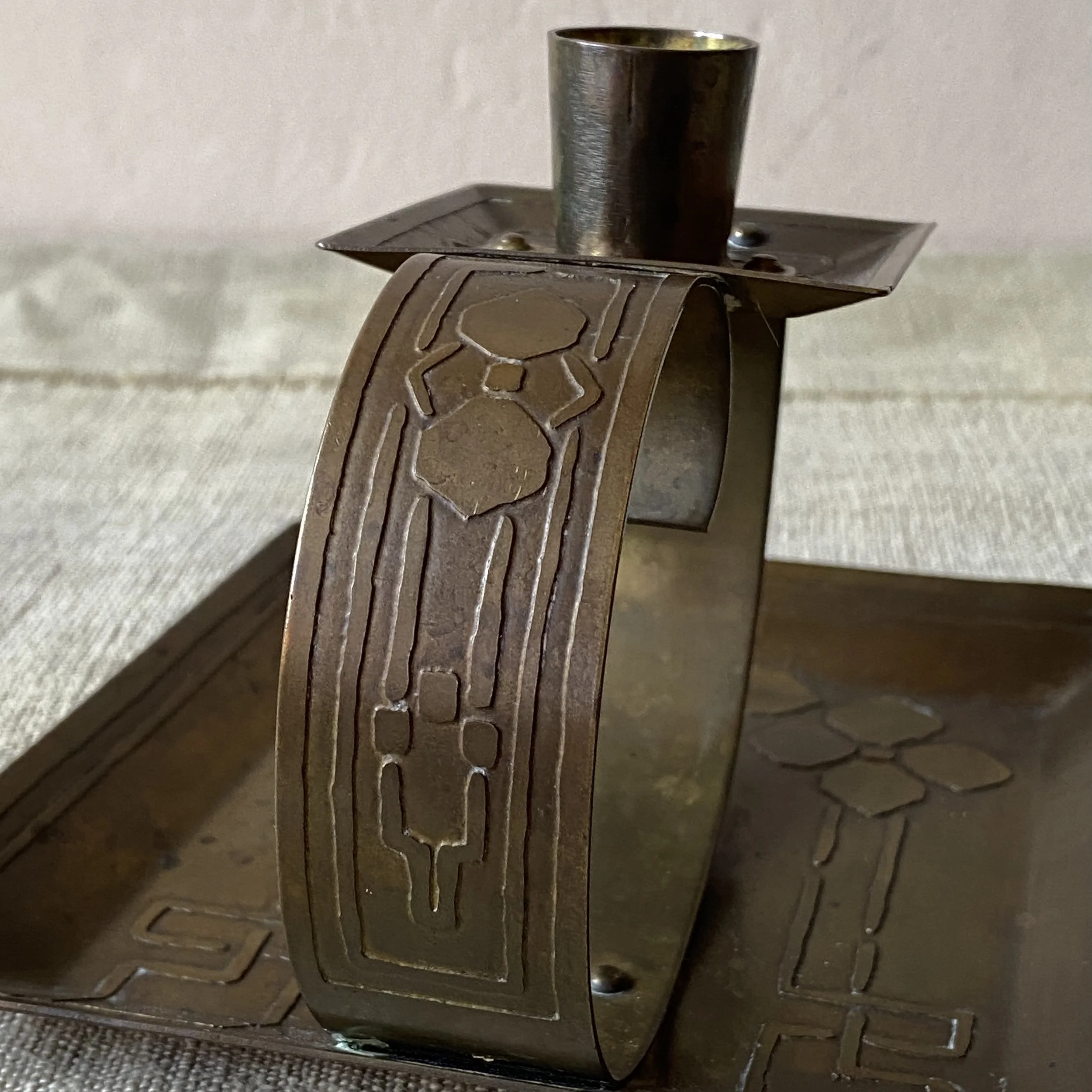The Carence Crafters were located in Chicago and appear to have started around 1908; very little is known about the company today. The majority of Carence Crafters metal was made from copper, brass or German silver (a fine pewter) with the designs acid-etched into the material, leaving a raised or relieved pattern. Subjects ranged from the whimsical (flying dragonflies, crabs, geese) to stylized designs of flowers and trees. They also made a line of silver jewelry with modern Celtic knots set with stones.