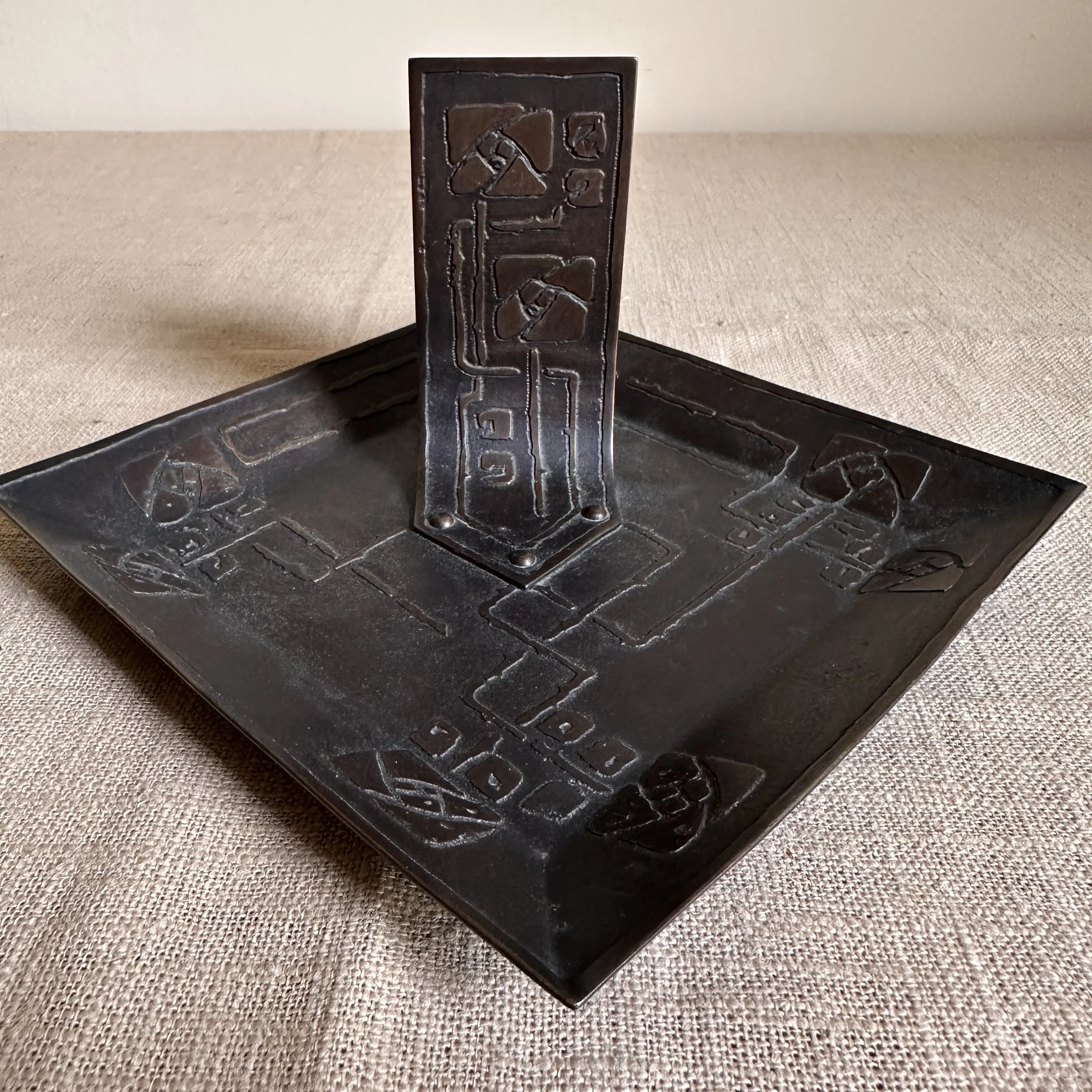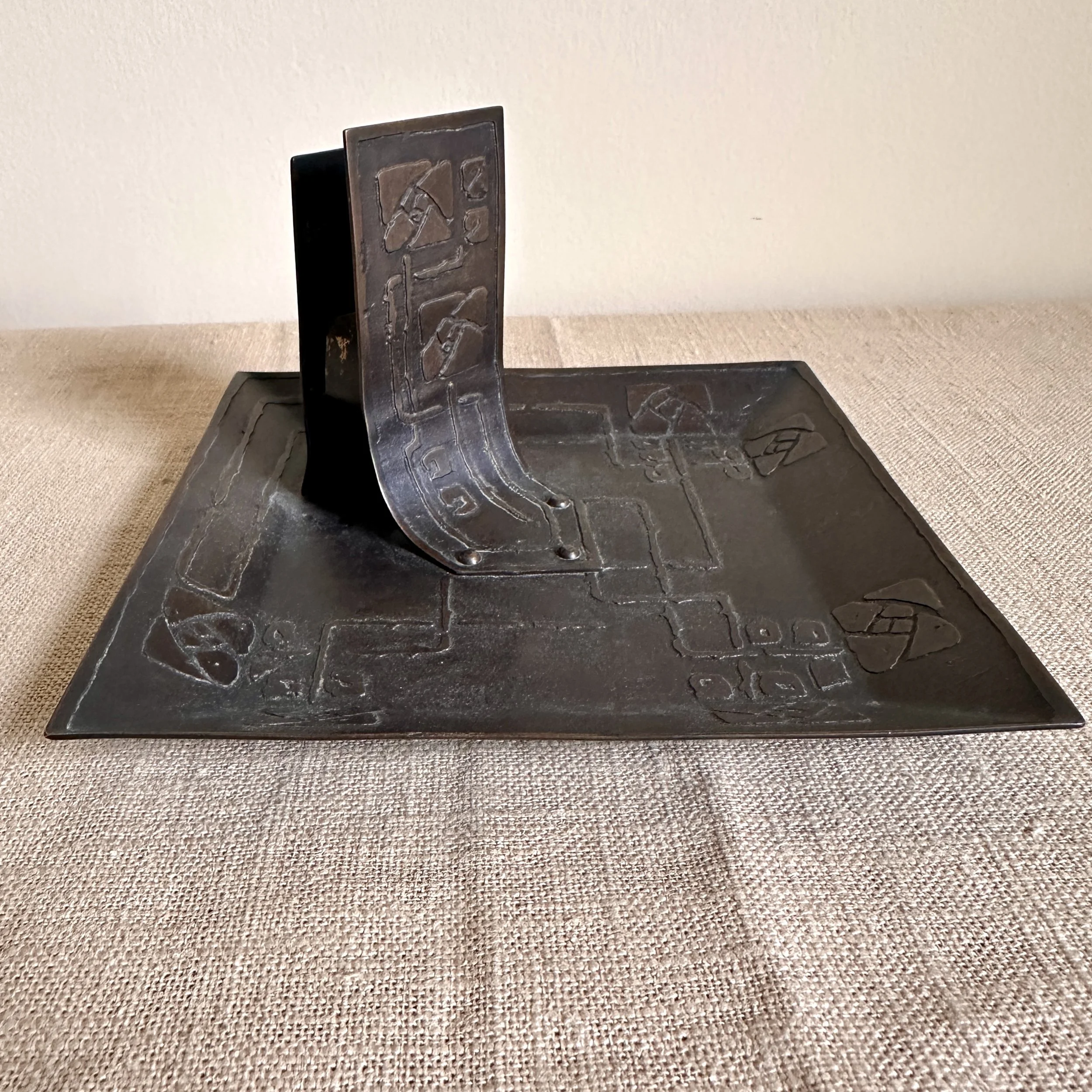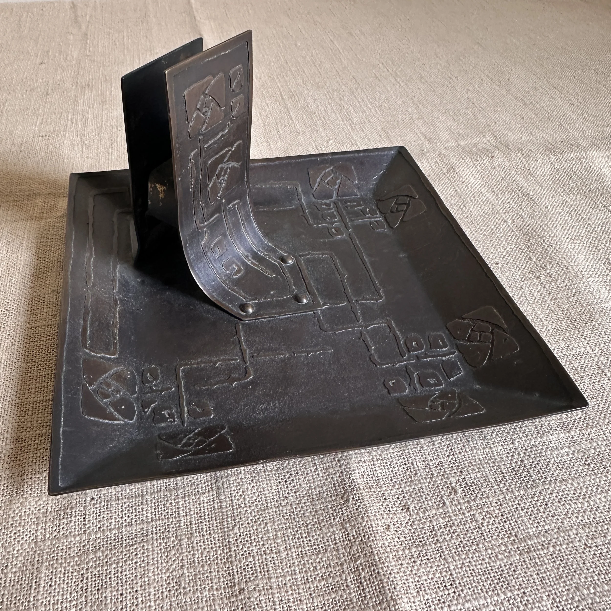 Carence Crafters match holder, Chicago circa 1906. A tray with a raised match holder made of copper with an acid etched Glasgos Rose pattern. Excellent condition with a dark original patina. Unsigned. Measures 5.75” square. $250