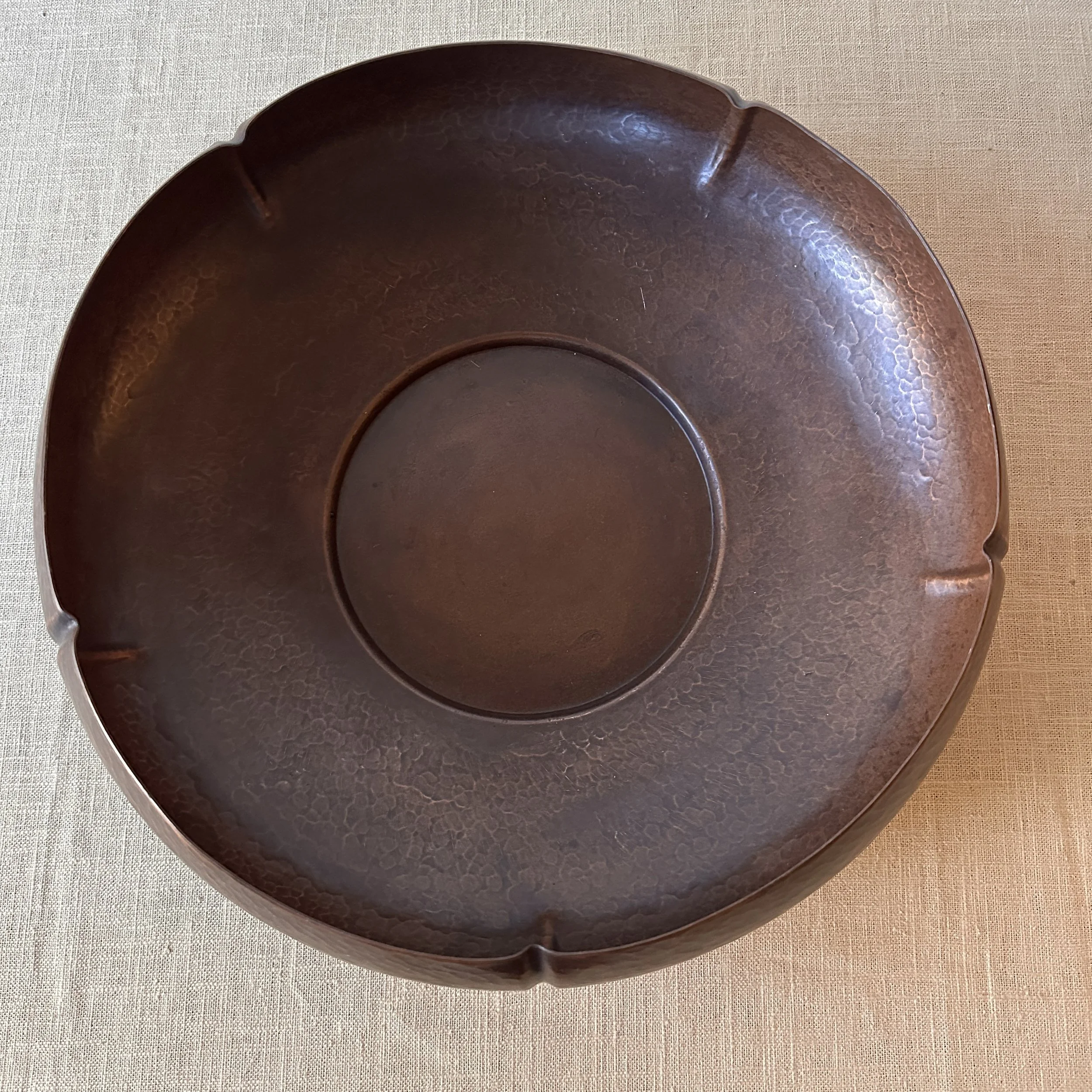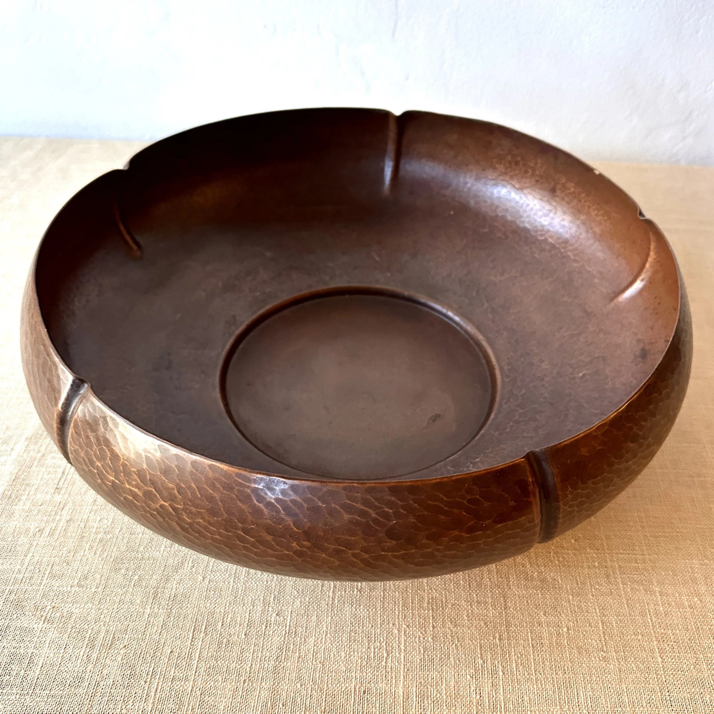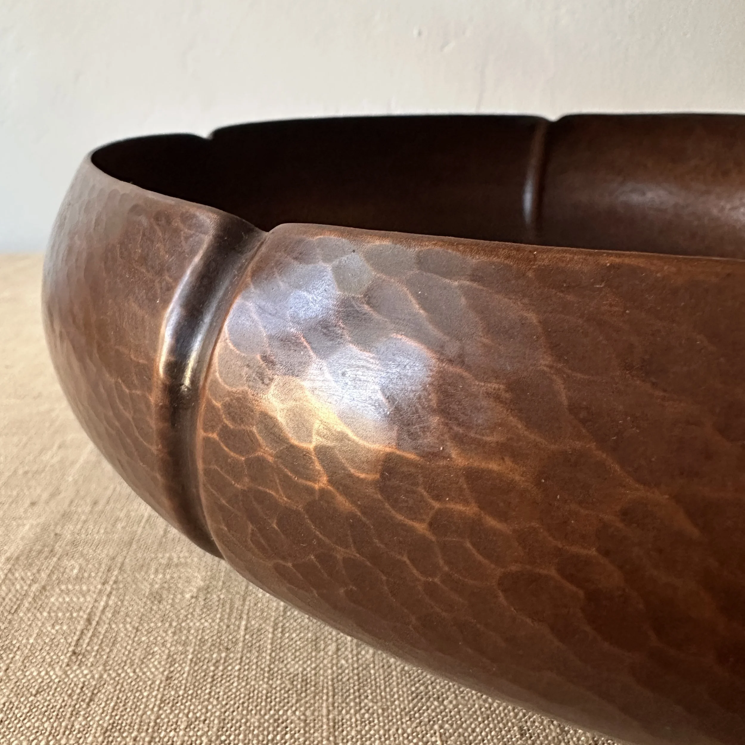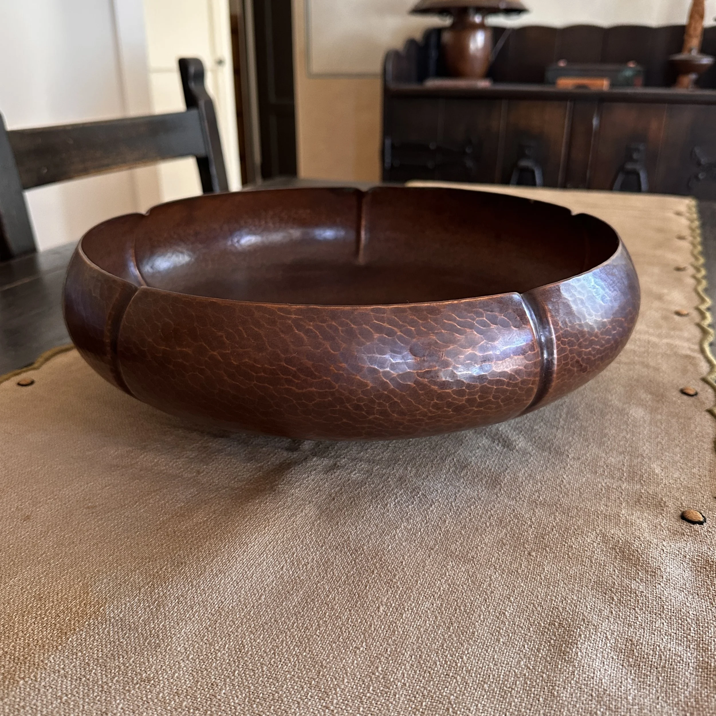 Chicago School console bowl circa 1908. A large and heavy hammered copper bowl with deep lobes and a strong inward shape around the top edge. Exceptional craftsmanship in the form and hammering on this bowl, very reminiscent of the work from Chicago. Makes a beautiful table centerpiece. Excellent new patina, unsigned. Measures 14” wide and 4.25” tall. SOLD