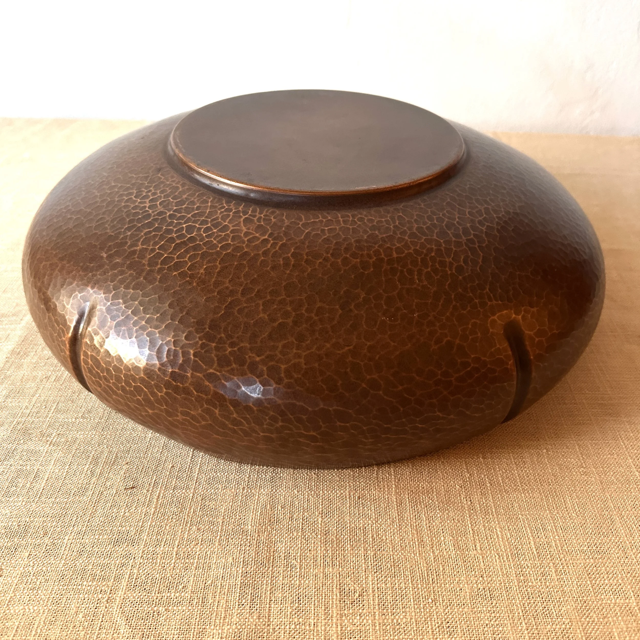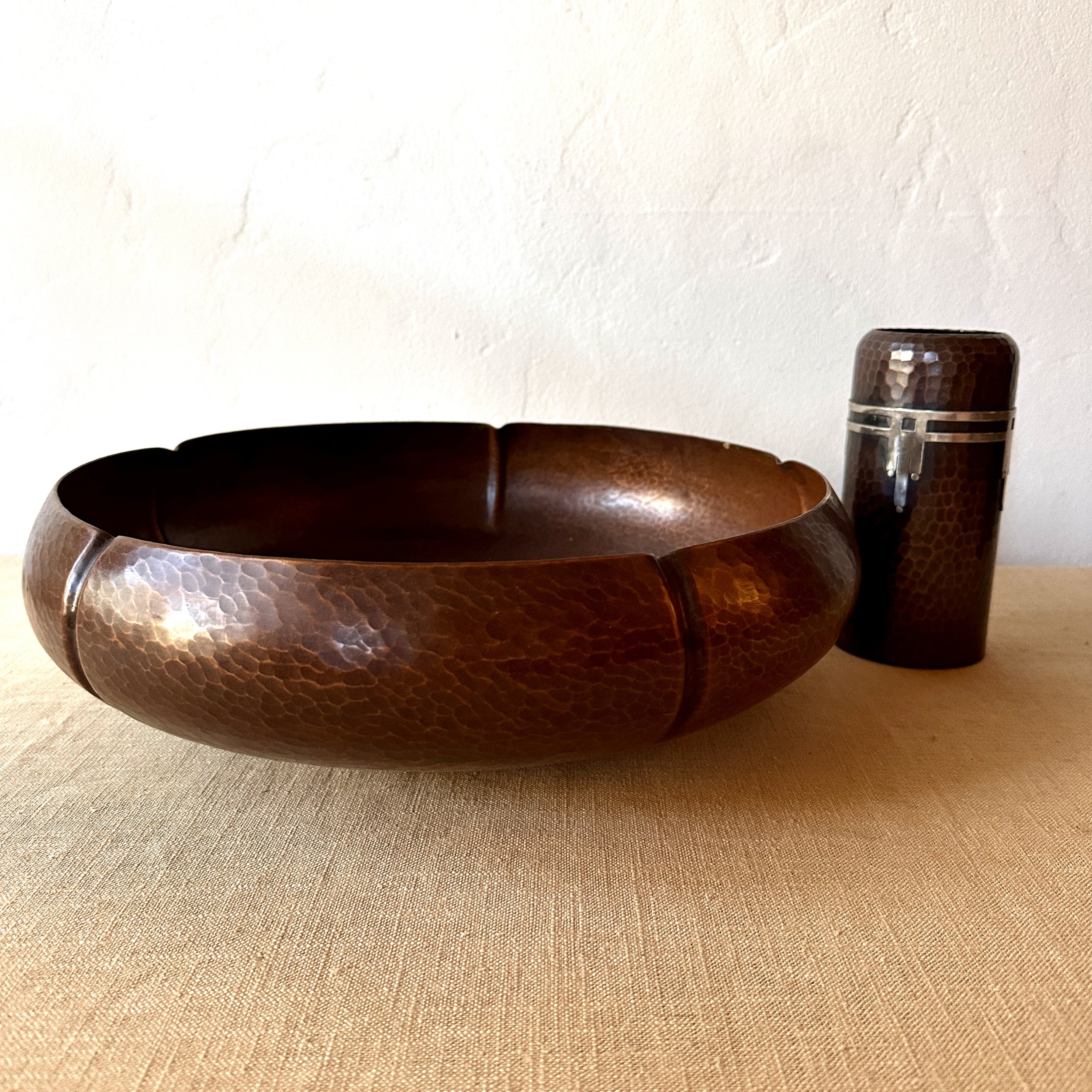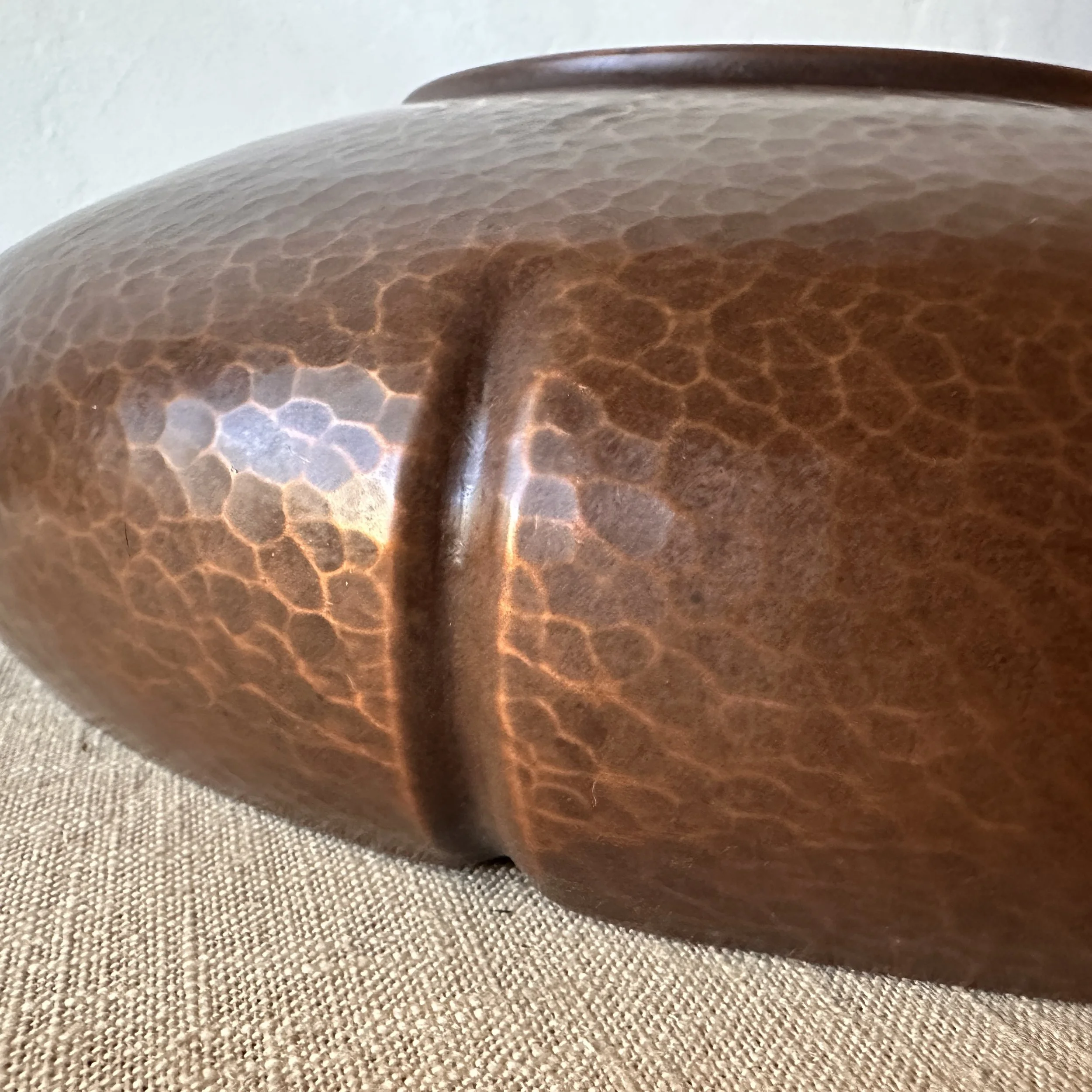 Chicago School console bowl circa 1908. A large and heavy hammered copper bowl with deep lobes and a strong inward shape around the top edge. Exceptional craftsmanship in the form and hammering on this bowl, very reminiscent of the work from Chicago. Makes a beautiful table centerpiece. Excellent new patina, unsigned. Measures 14” wide and 4.25” tall. SOLD