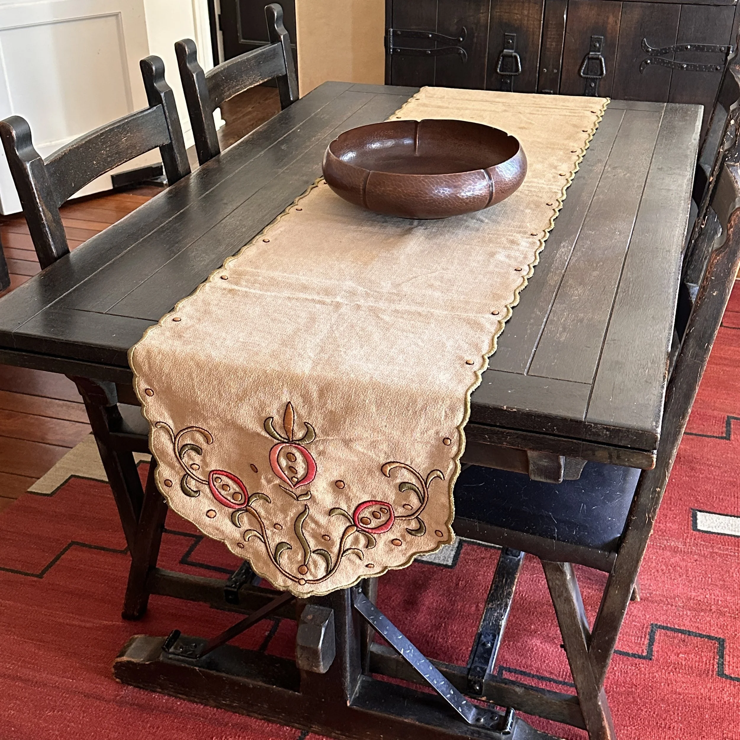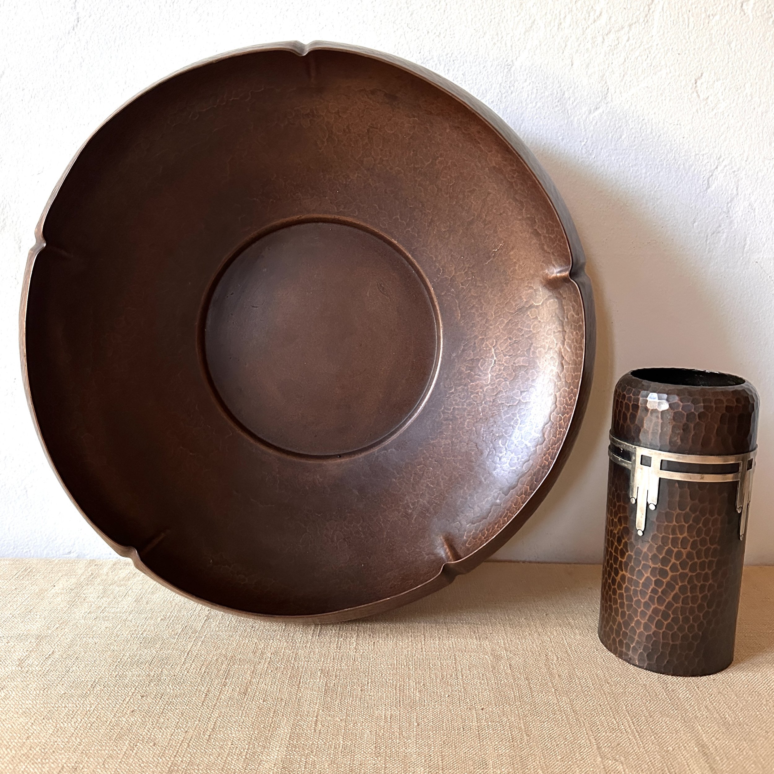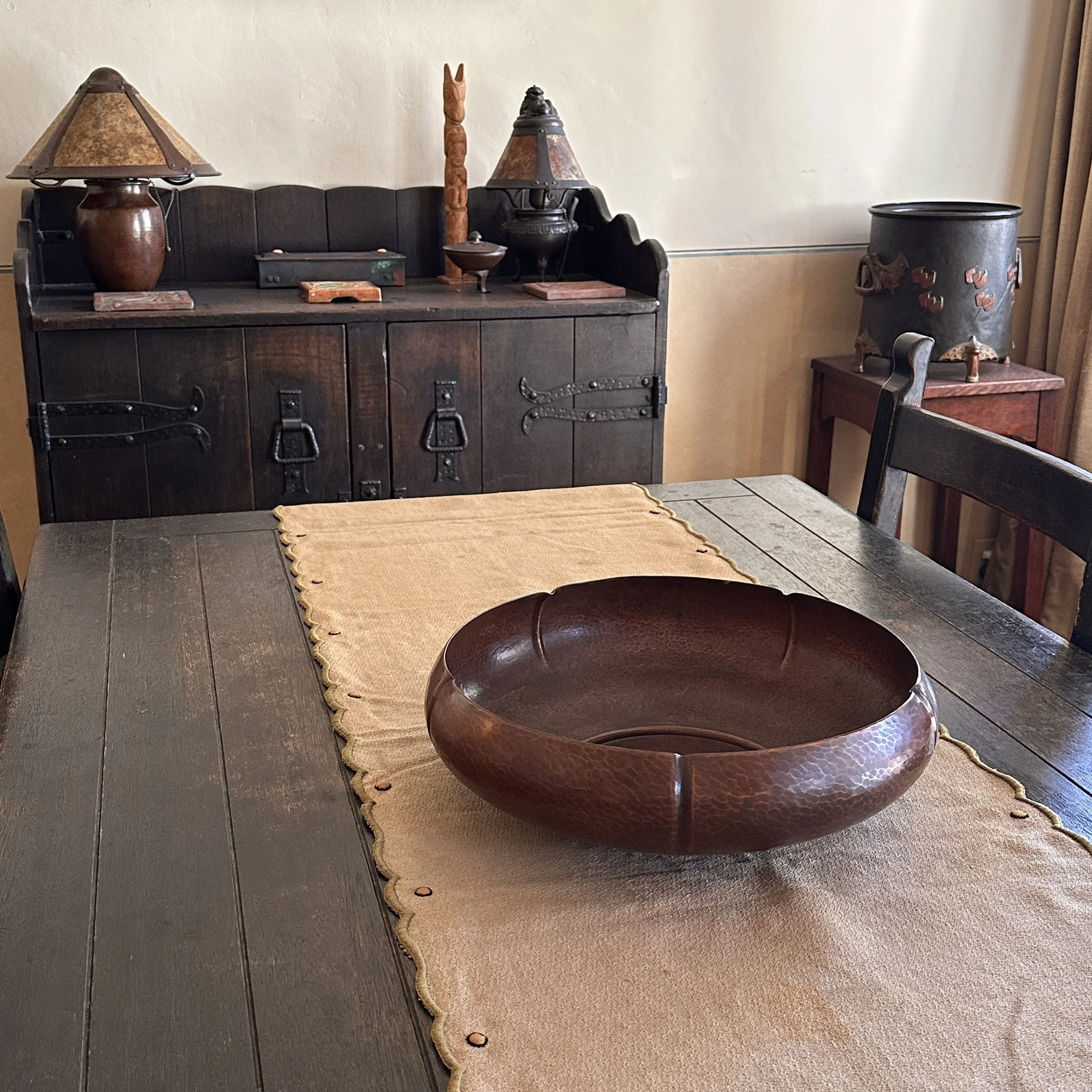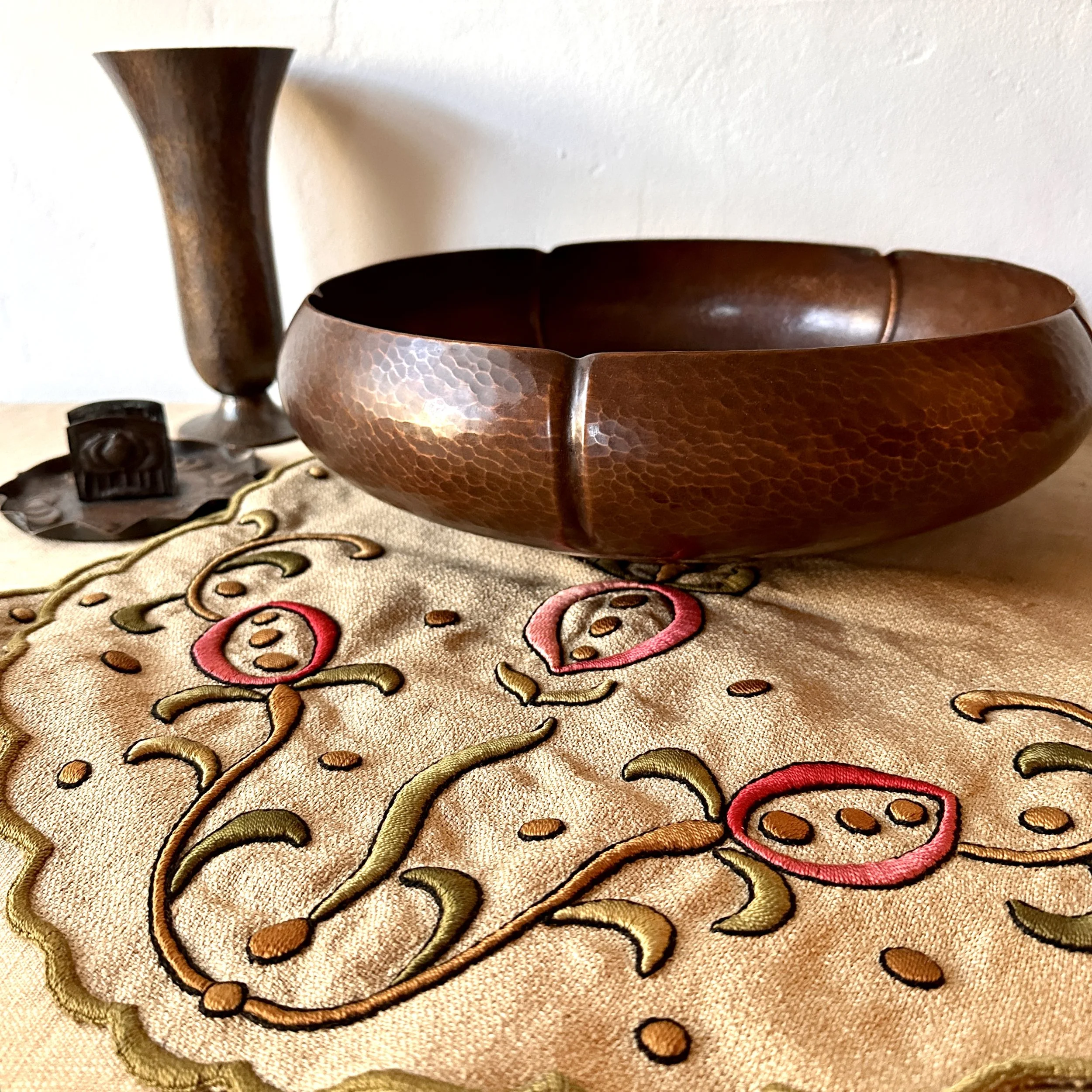 Chicago School console bowl circa 1908. A large and heavy hammered copper bowl with deep lobes and a strong inward shape around the top edge. Exceptional craftsmanship in the form and hammering on this bowl, very reminiscent of the work from Chicago. Makes a beautiful table centerpiece. Excellent new patina, unsigned. Measures 14” wide and 4.25” tall. SOLD