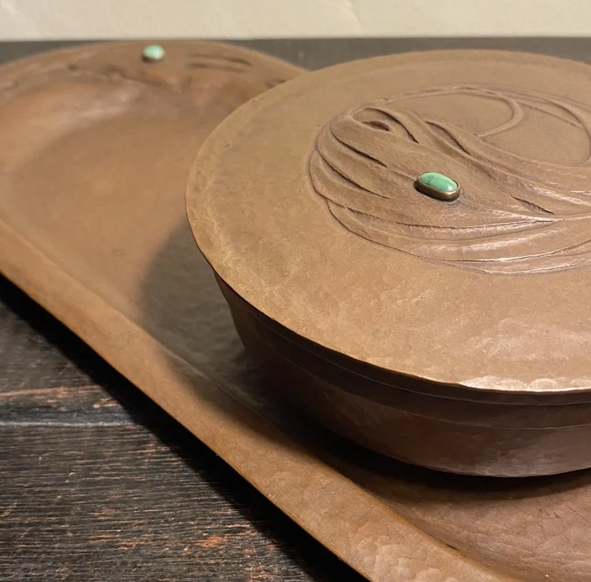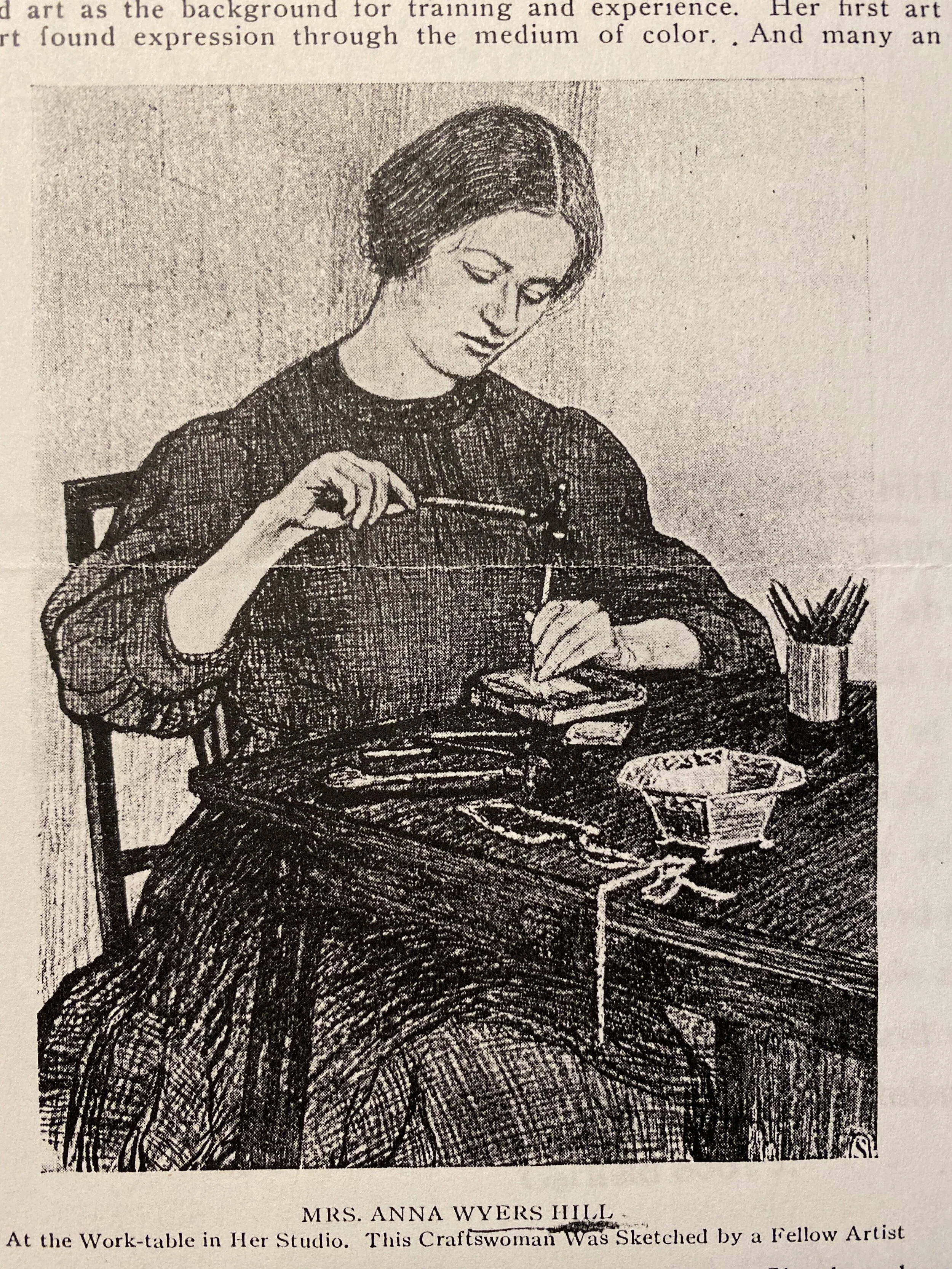 Cleveland Ohio was a major center for Arts & Crafts metalwork during the first 25 years of the 20th century. The most notable makers were Horace Potter and his Potter Studio, The Rokesley Shop, Mildred Watkins, Jane Carson, Frances Barnum, John Sidney Burton and Anna Wyers Hill. These artists exhibited annually at the Cleveland Museum of Art whose yearly exhibit catalog show a wealth of objects crafted in the area.