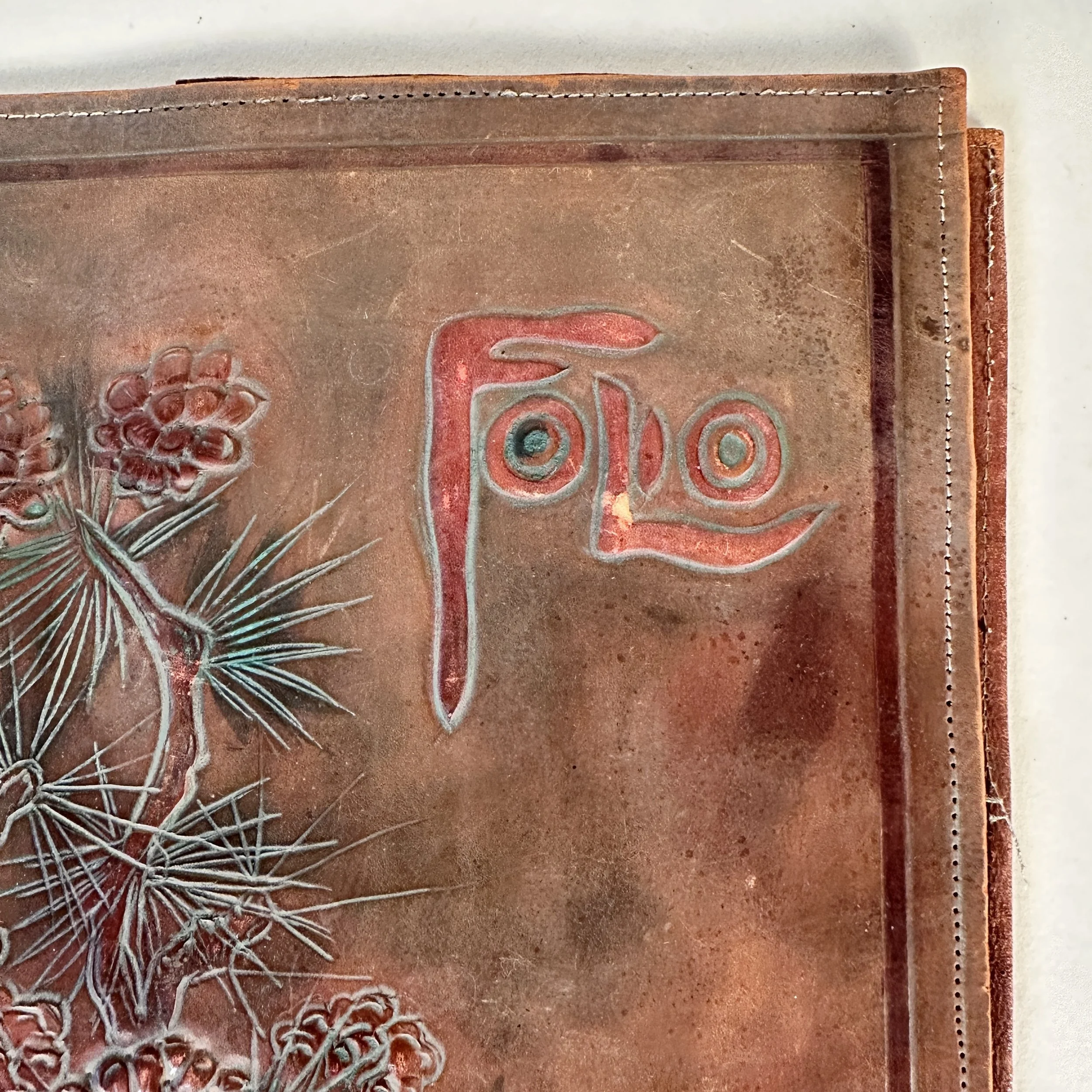 Catherine Comstock / The Companeros leather group, Santa Rosa CA circa 1920/30. Seven (7) items including an unused photo album with a stylized peacock design in 5 stained leather colors, a travel checklist book cover with pinecones, a “Folio” cover with pinecones, a hand purse with flowers, a “Current Number” magazine cover with landscape, an Alaska travel scrapbook and journal cover with Totems and a Mexico travel book used for a US tour. All items are signed with her “CC” monogram and in very good to excellent condition.