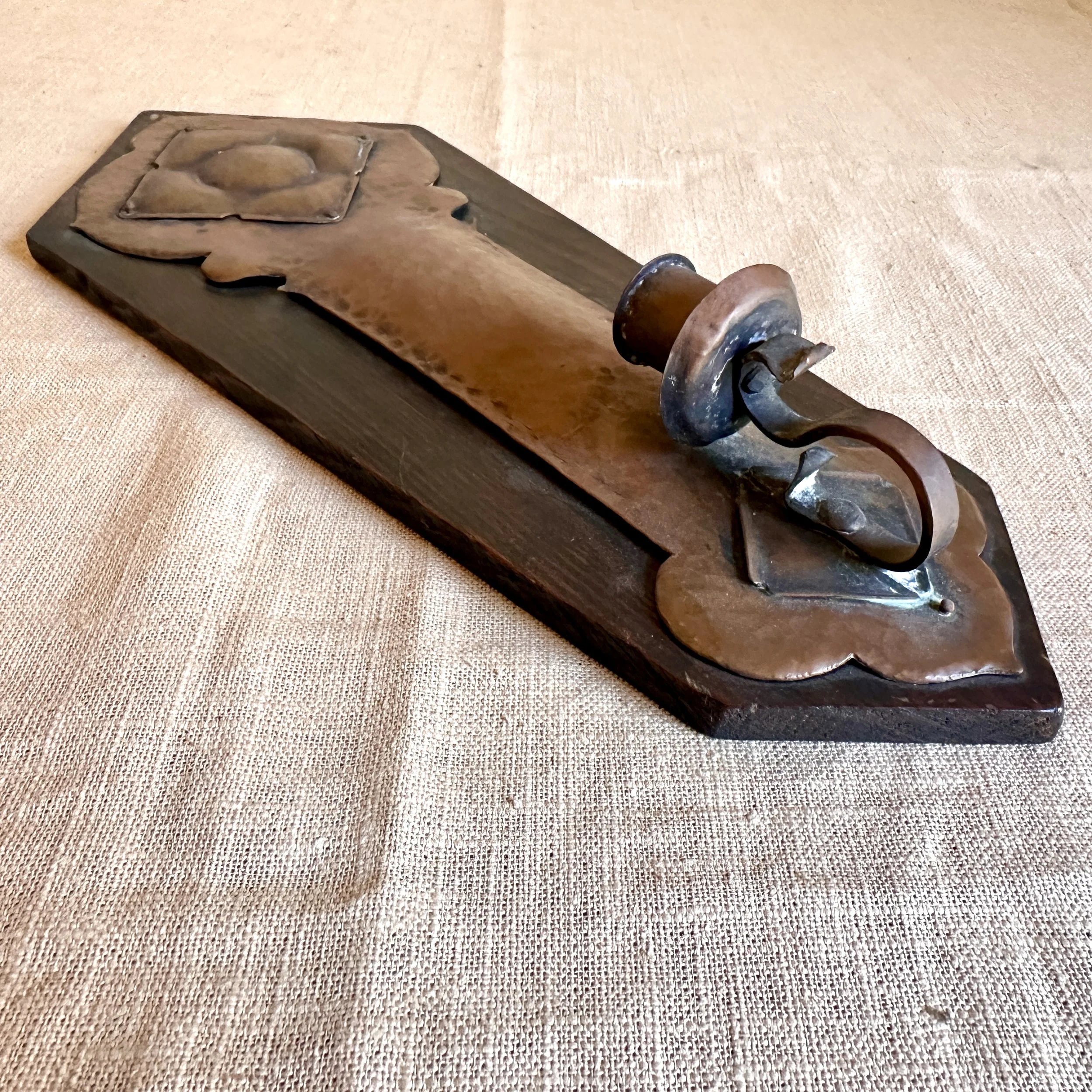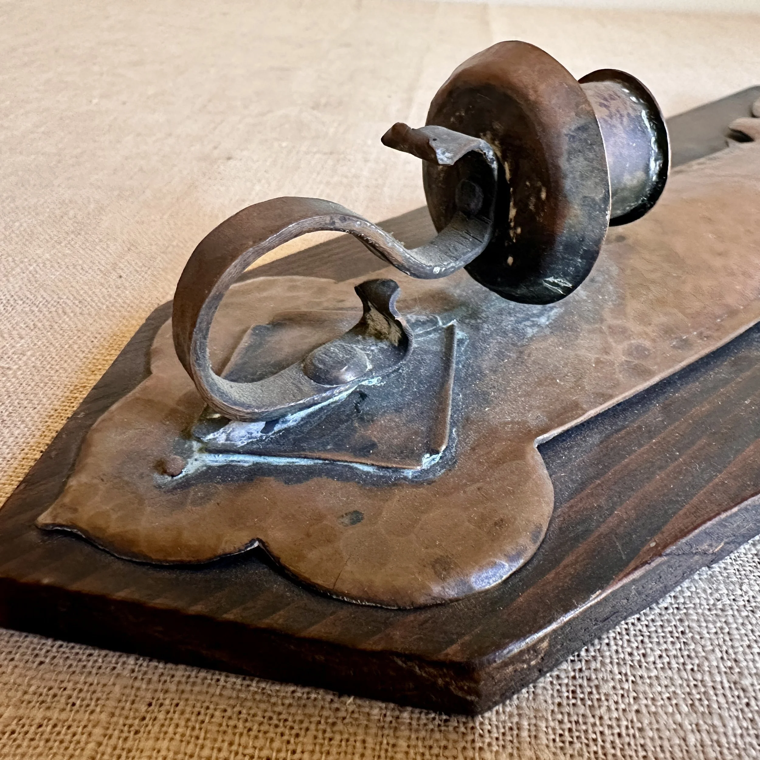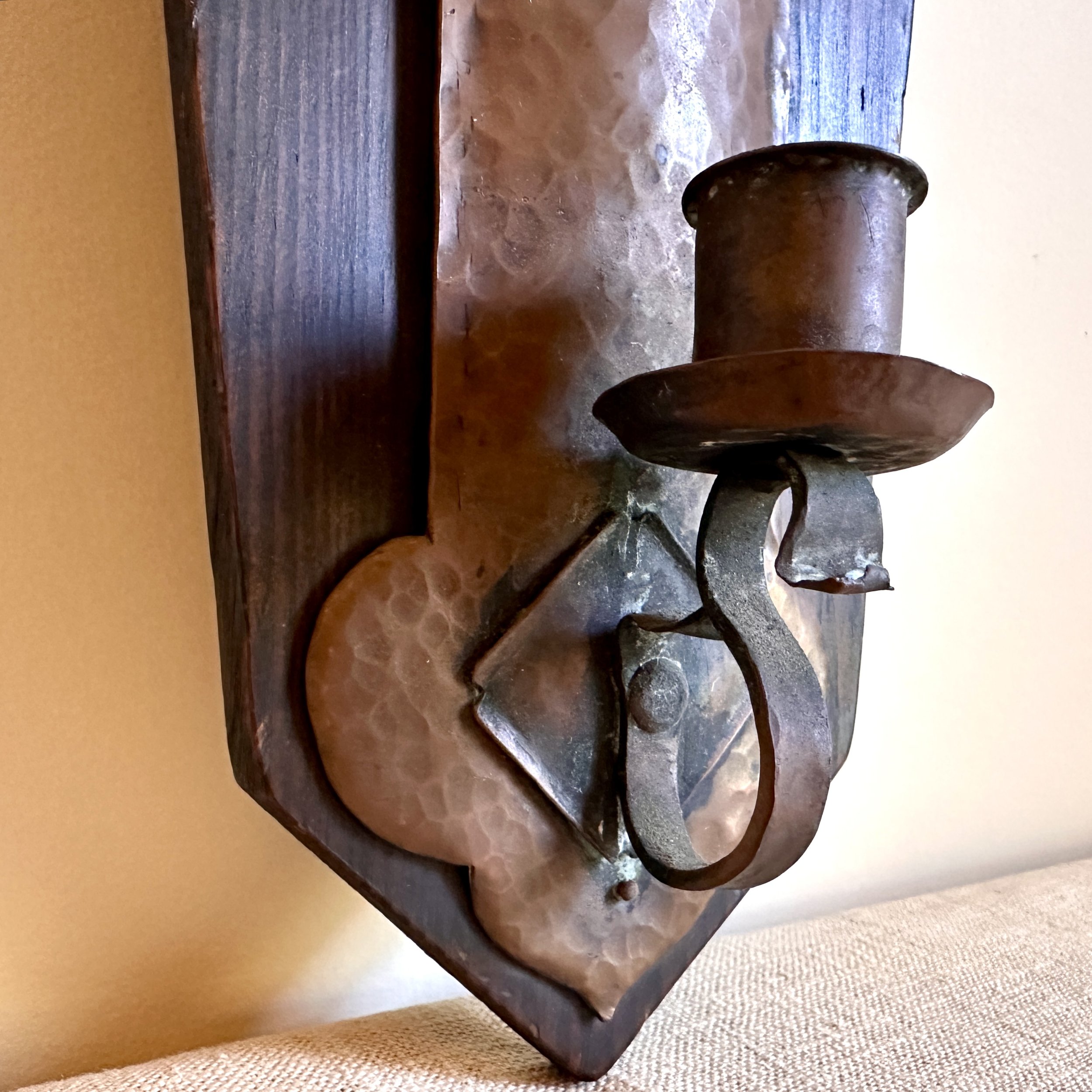Arts & Crafts sconce circa 1905. A large hammered copper sconce mounted on a piece of redwood, the top with a riveted copper floral decoration. Strong design and excellent workmanship, we believe this to be from a California maker. Fine original patina. Measures 14” tall and 5.5” wide at top. $425