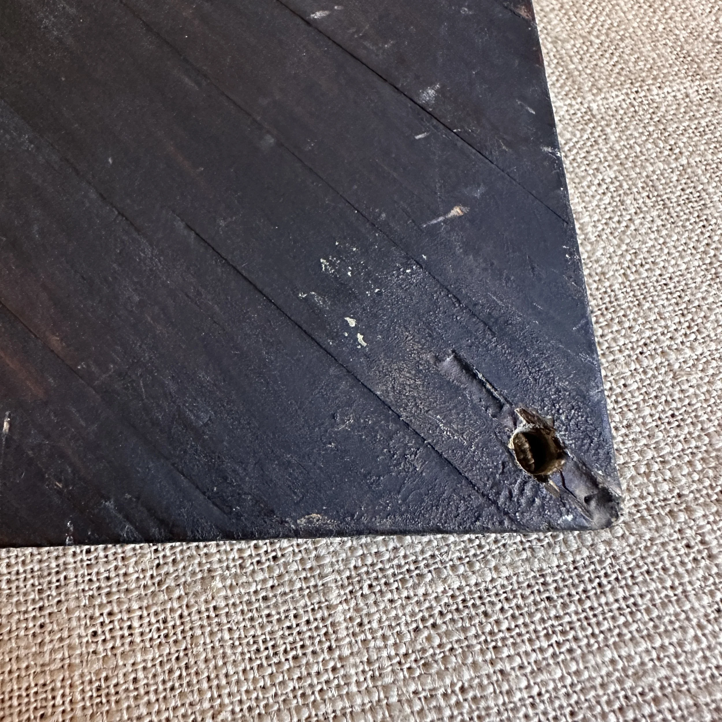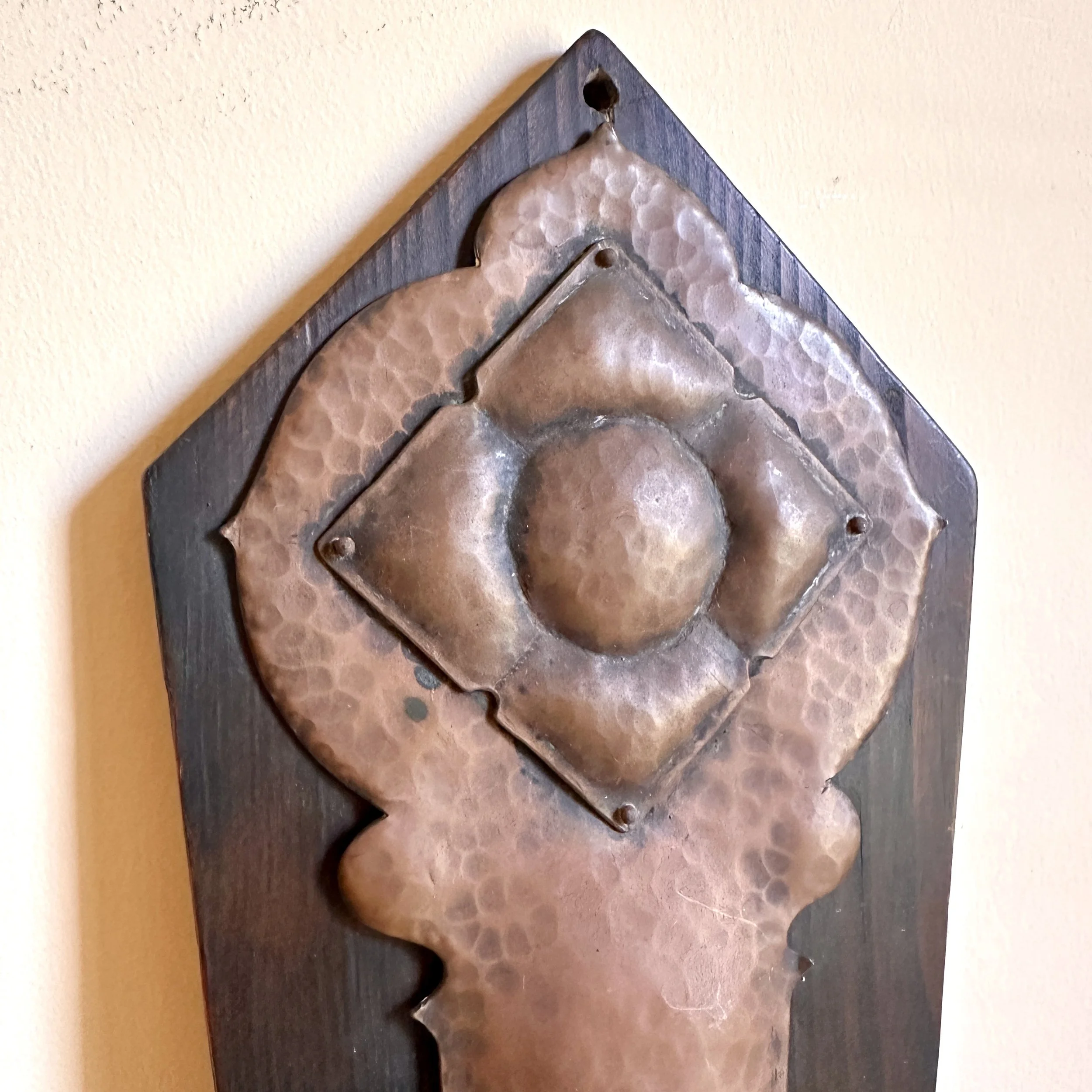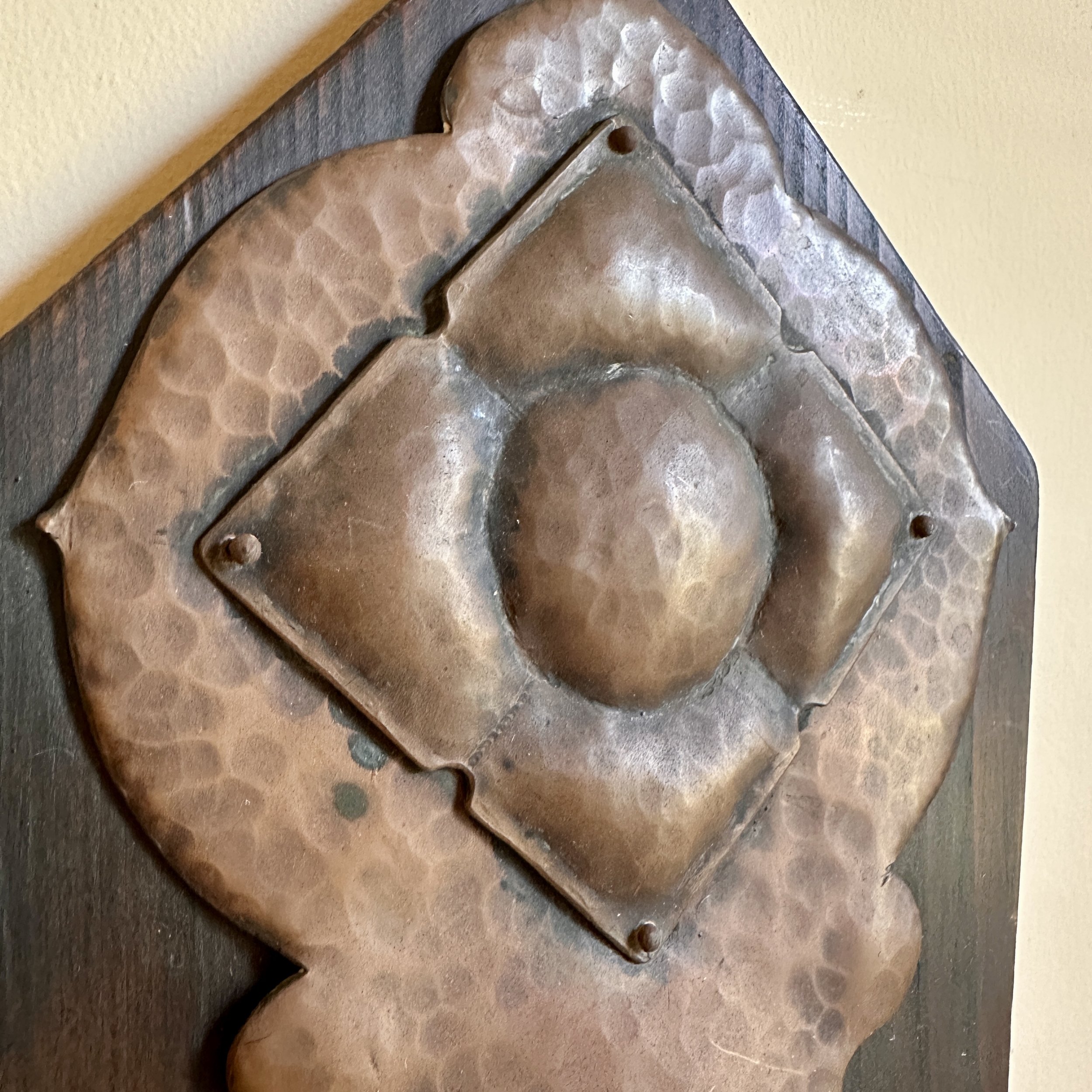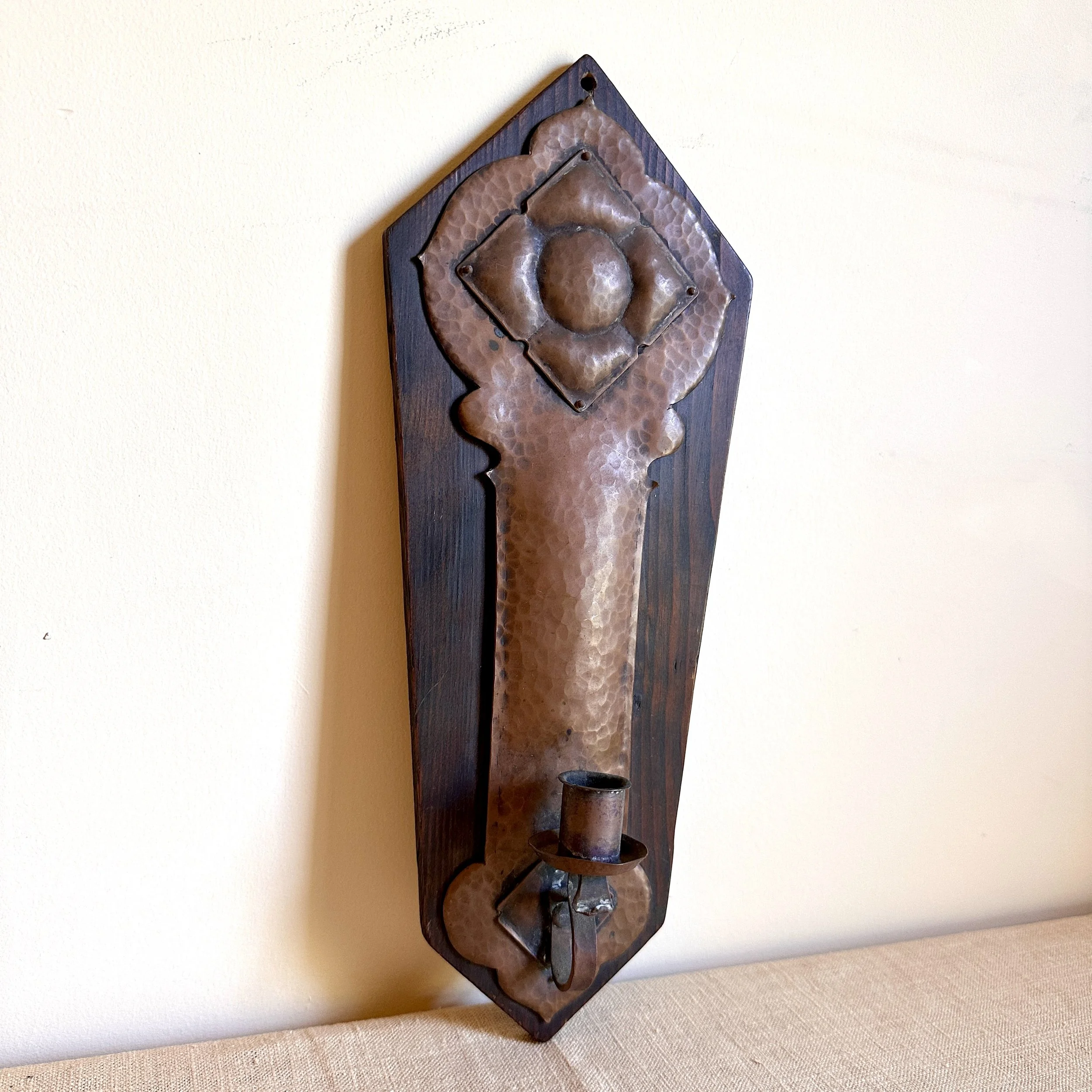 Arts & Crafts sconce circa 1905. A large hammered copper sconce mounted on a piece of redwood, the top with a riveted copper floral decoration. Strong design and excellent workmanship, we believe this to be from a California maker. Fine original patina. Measures 14” tall and 5.5” wide at top. $425