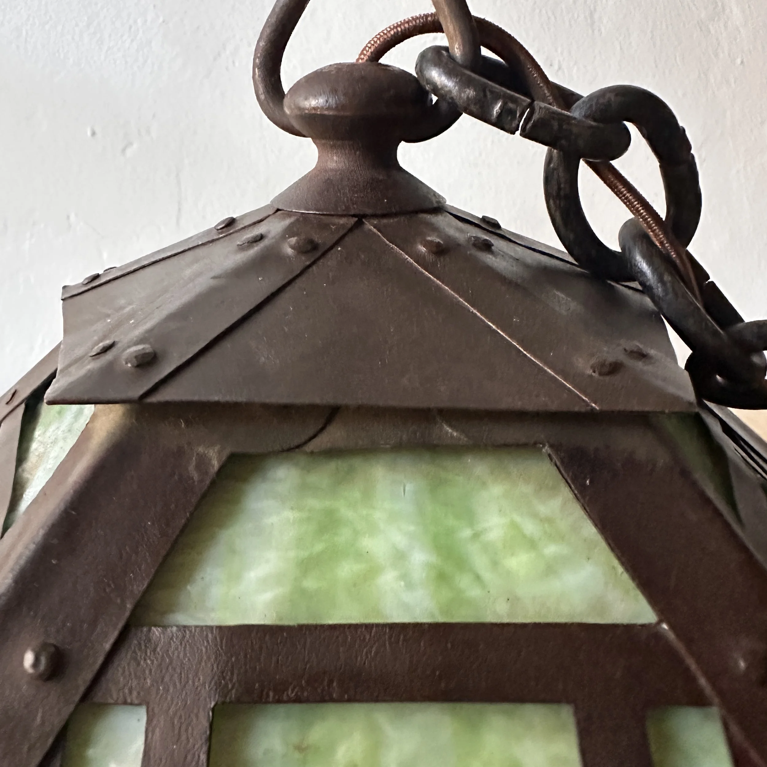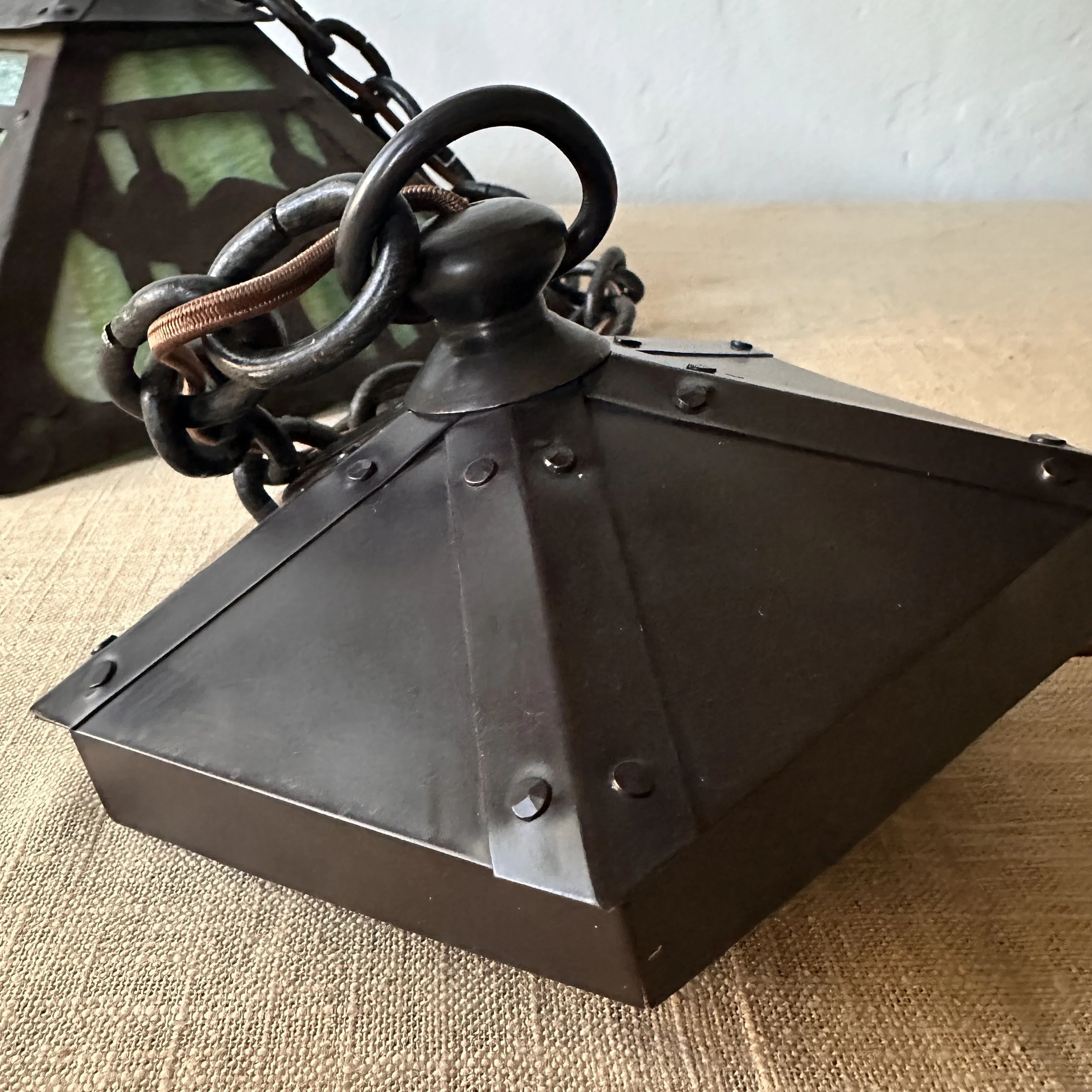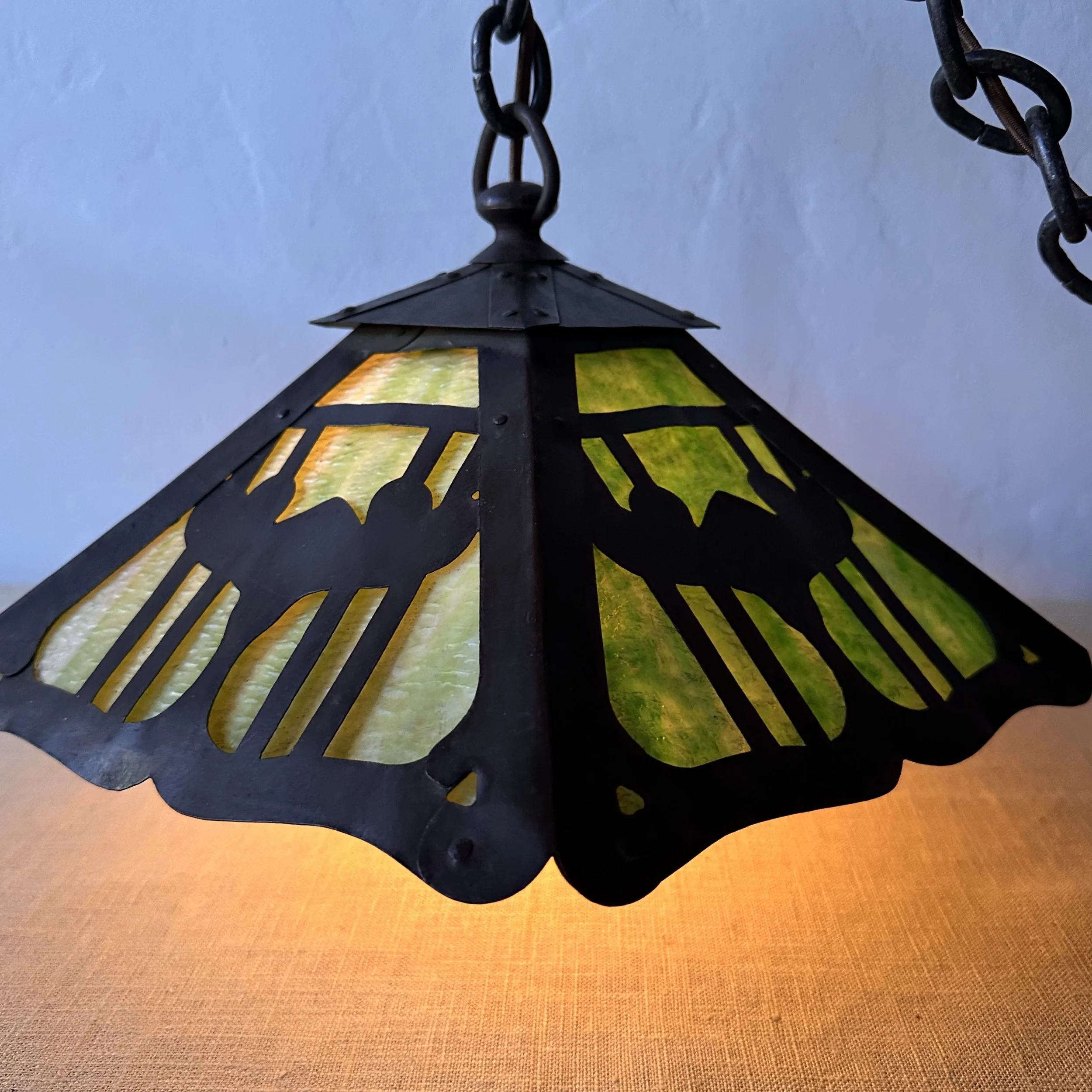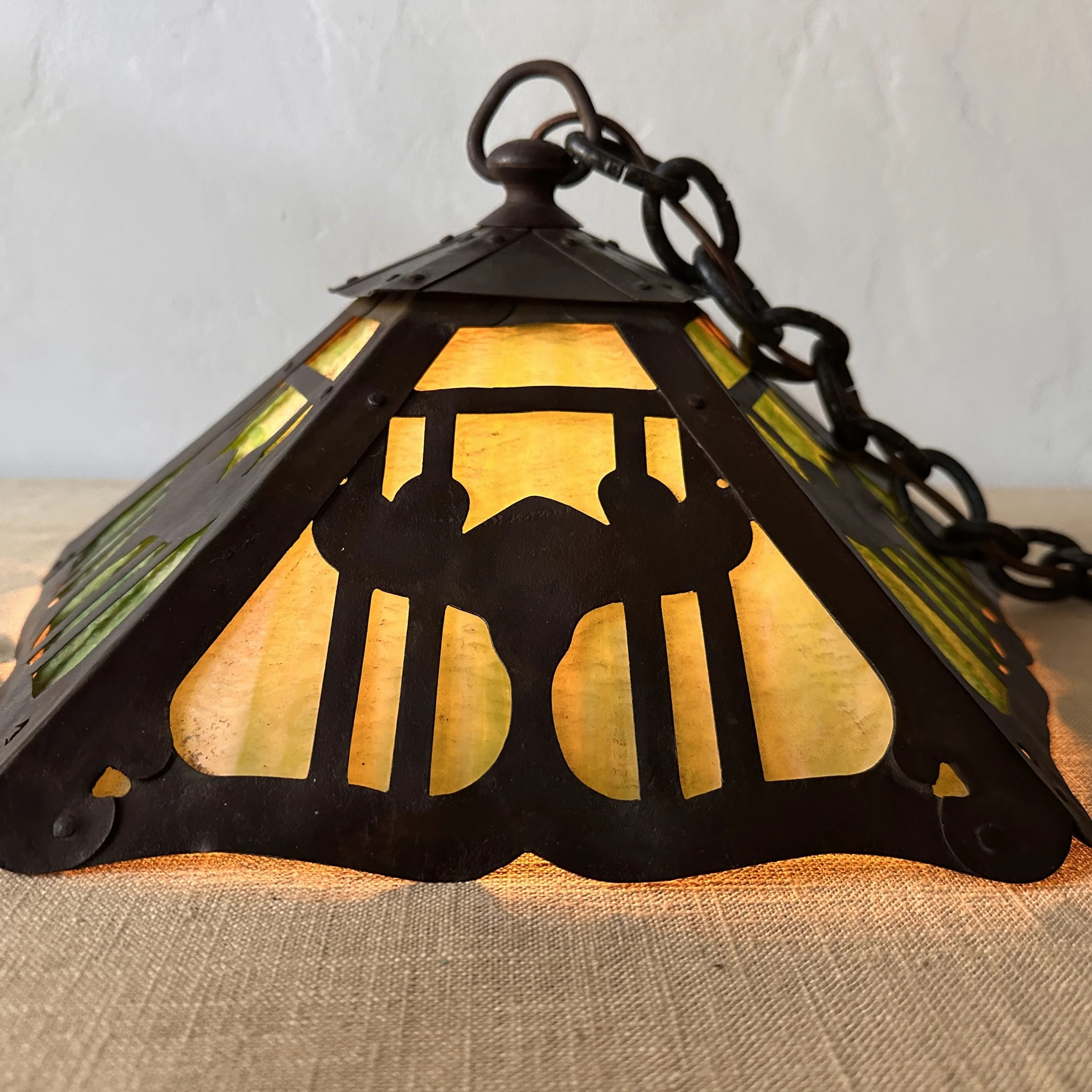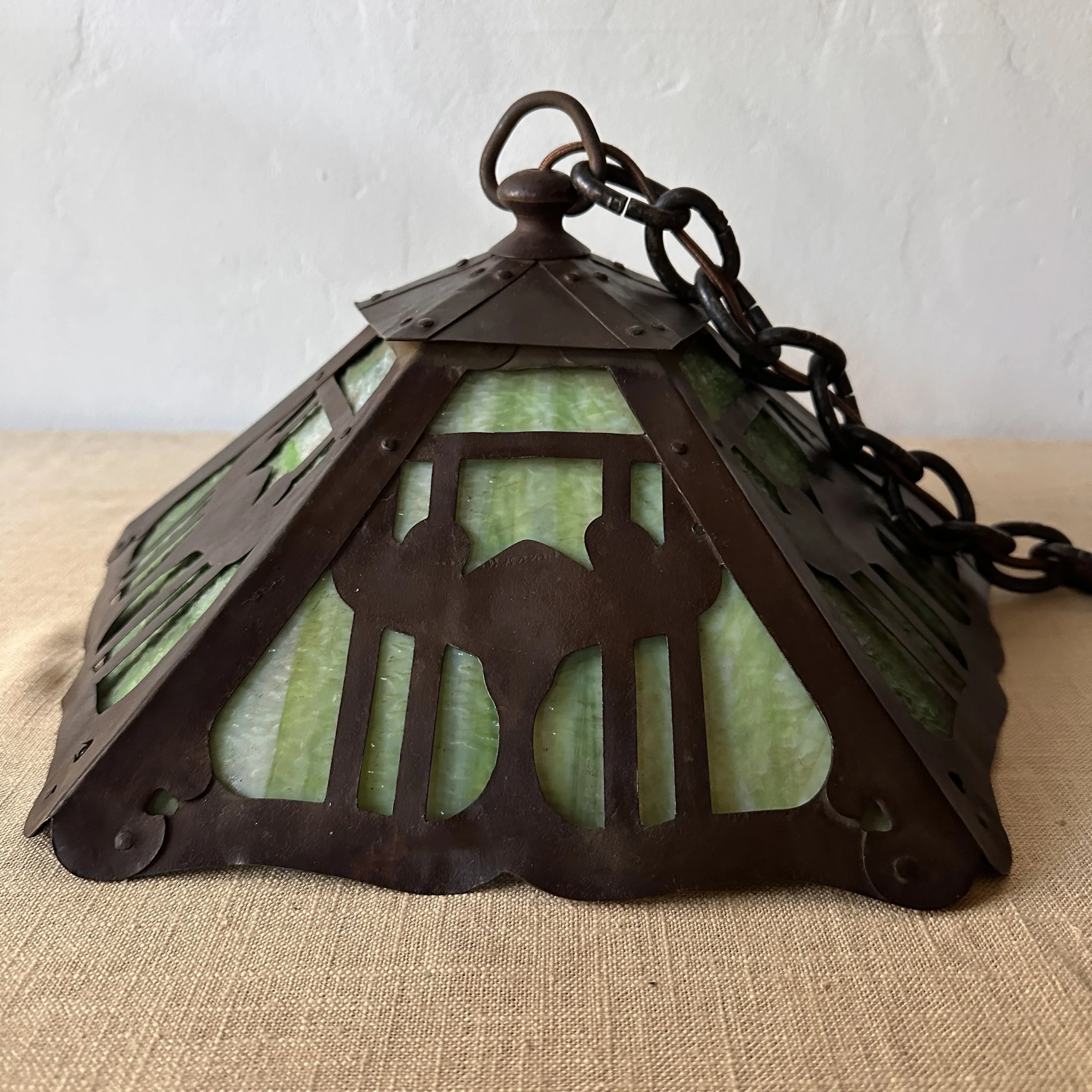 Douglas Donaldson chandelier circa 1910. This design was featured in a article written by Donaldson showcasing his lamp shades while he was working with the Handicraft Guild in Minneapolis (see HERE). The five sided copper shade has an architectural floral pierced decoration, the straps are cut and shaped at each end to mimic the curved edging and leaving his classic dot opening in each corner. The cap has a pagoda overhang design, riveted with seam straps. The ceiling mount matches the pagoda design in reverse. Shade all original condition; patina, glass and socket - even has decades of dirt and residue still present. The ceiling mount has been repatinated, rewired and ready for use. Measures about 35/36” in drop including the mount structure, shade measures 14” wide and 7” tall, mount is roughly 6” wide. Chain could be extended if desired. SOLD