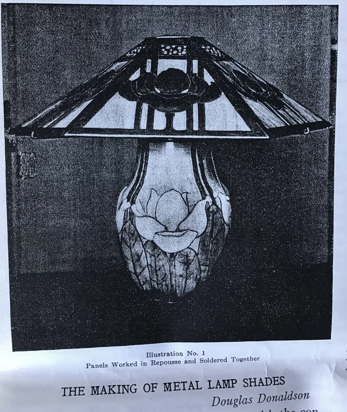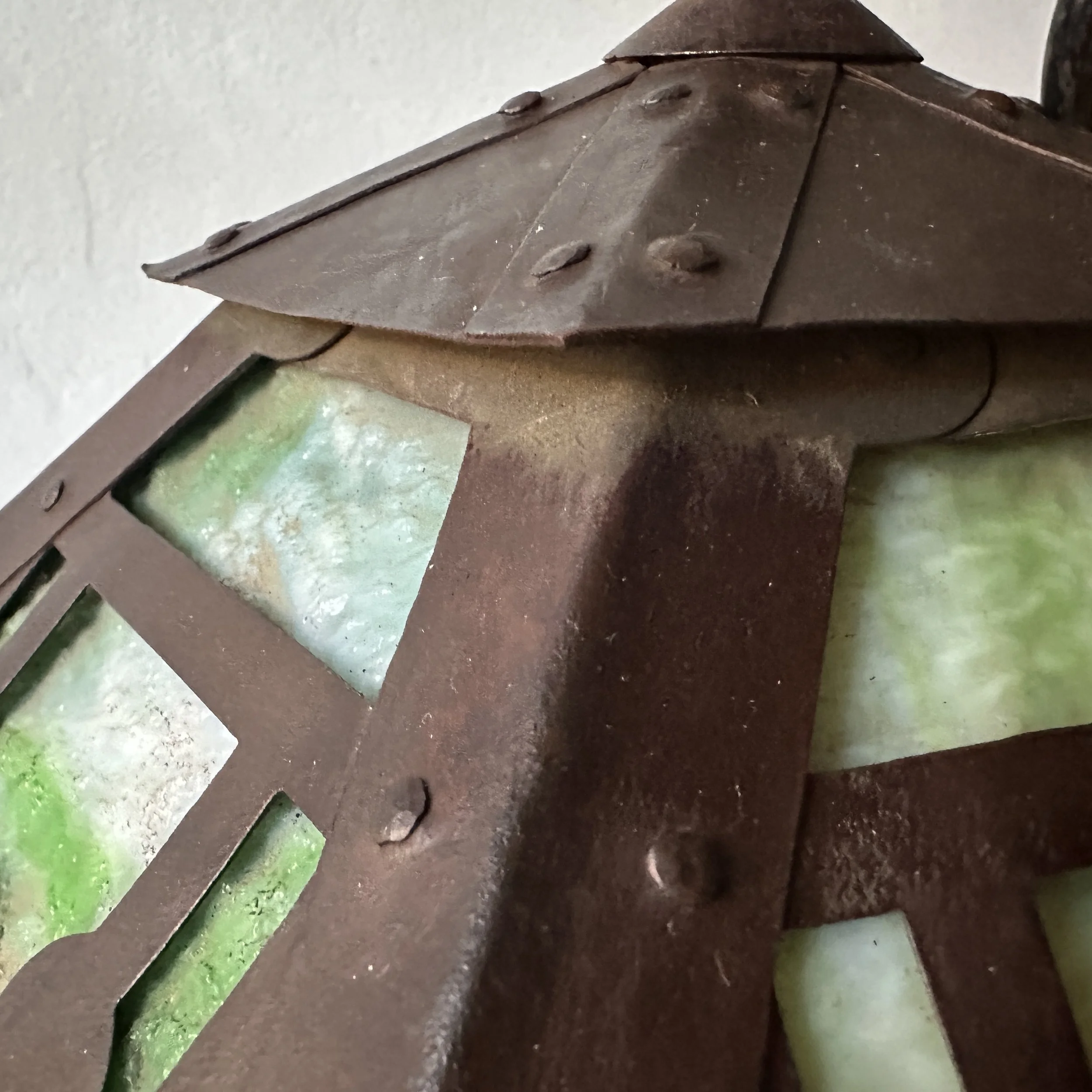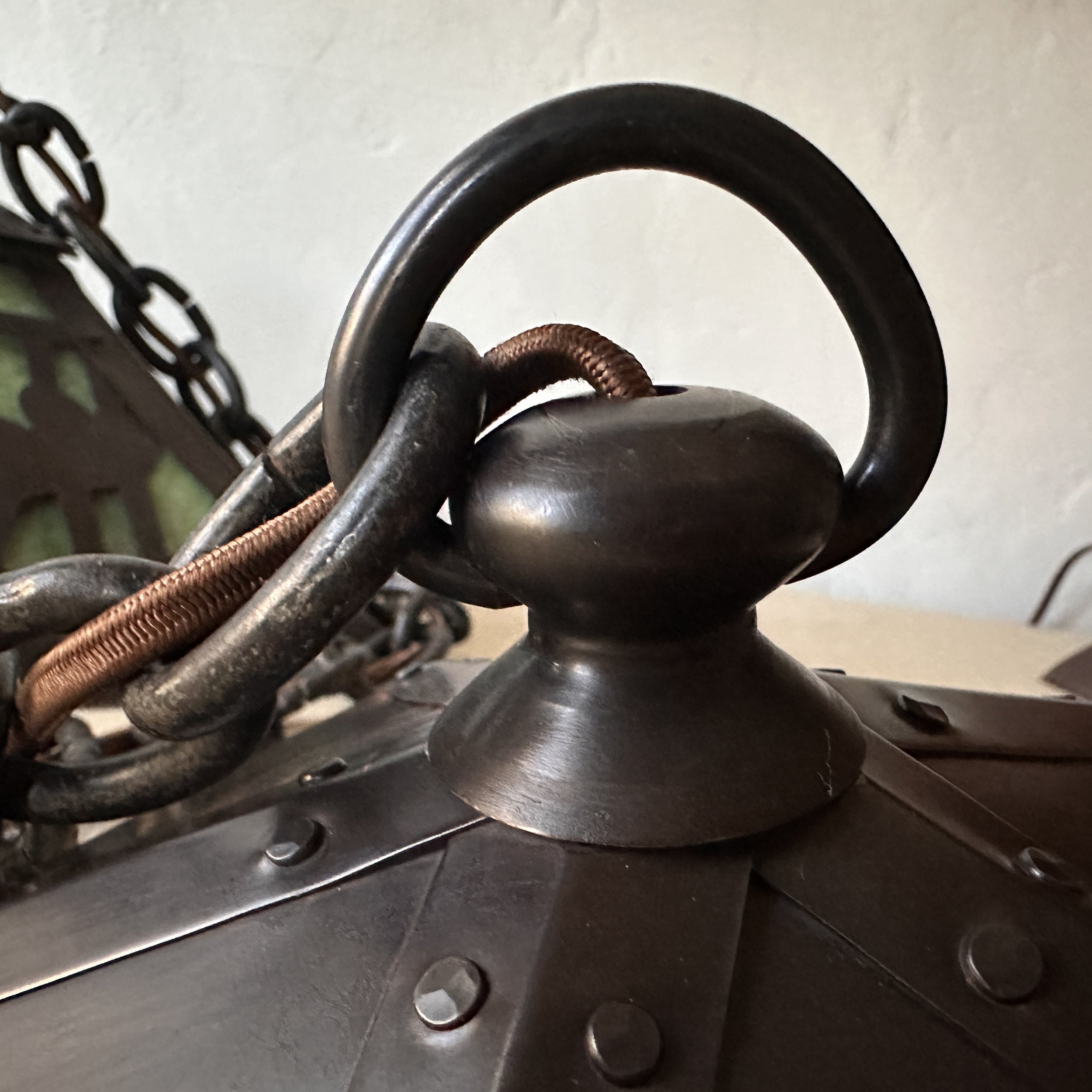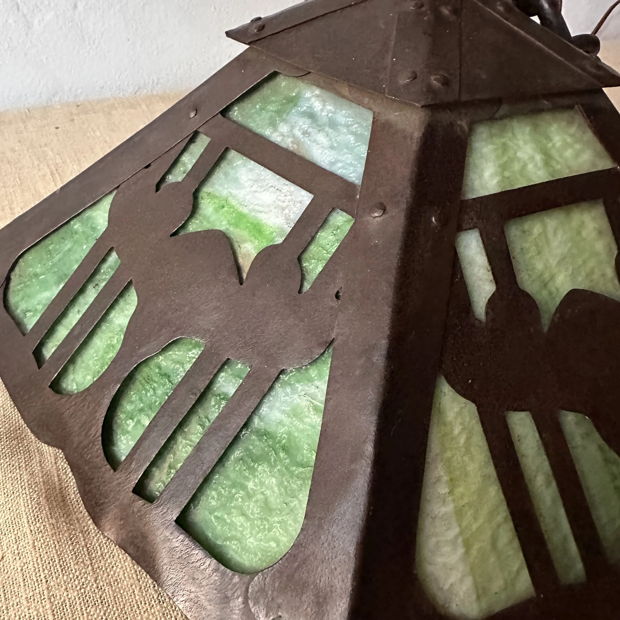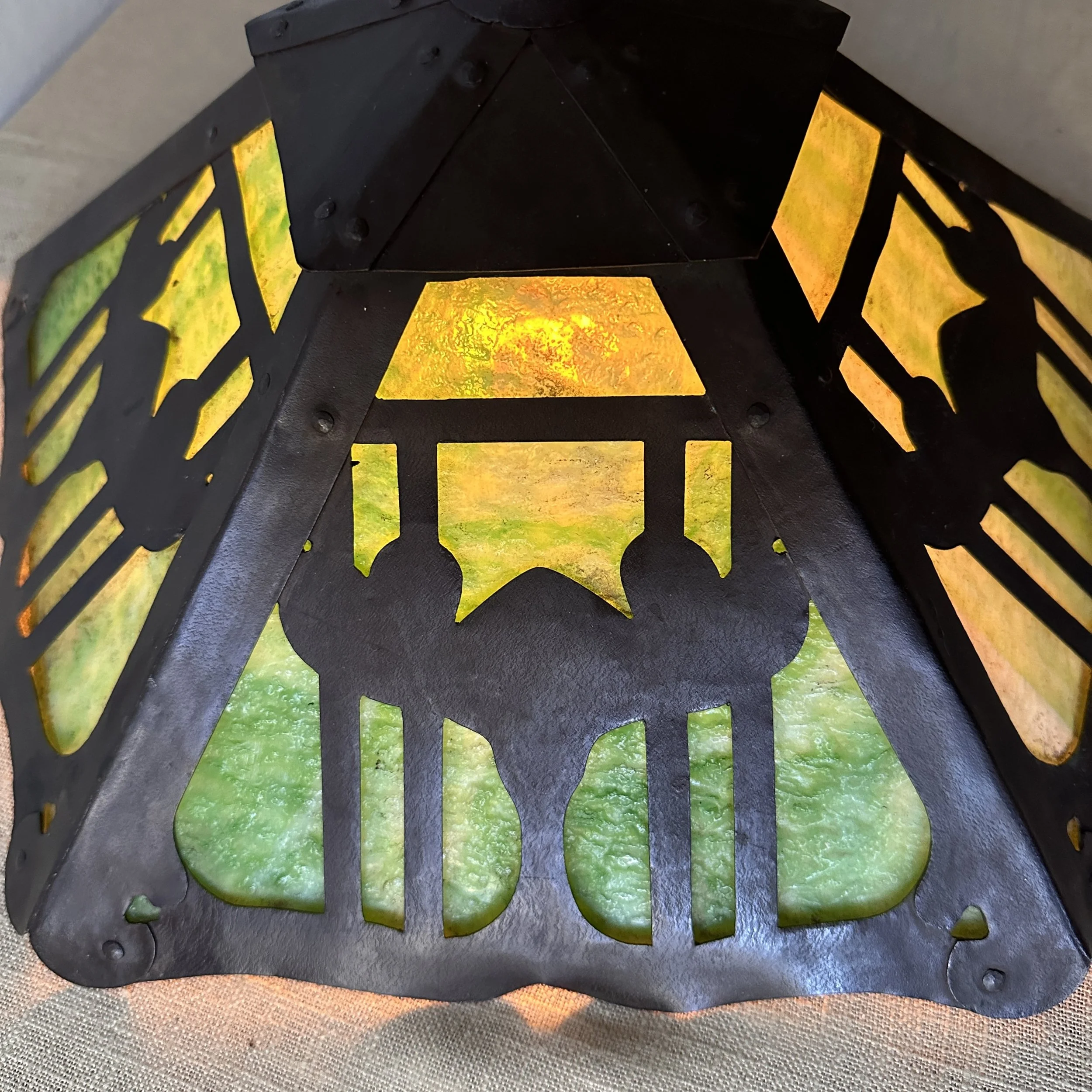 Douglas Donaldson chandelier circa 1910. This design was featured in a article written by Donaldson showcasing his lamp shades while he was working with the Handicraft Guild in Minneapolis (see HERE). The five sided copper shade has an architectural floral pierced decoration, the straps are cut and shaped at each end to mimic the curved edging and leaving his classic dot opening in each corner. The cap has a pagoda overhang design, riveted with seam straps. The ceiling mount matches the pagoda design in reverse. Shade all original condition; patina, glass and socket - even has decades of dirt and residue still present. The ceiling mount has been repatinated, rewired and ready for use. Measures about 35/36” in drop including the mount structure, shade measures 14” wide and 7” tall, mount is roughly 6” wide. Chain could be extended if desired. SOLD