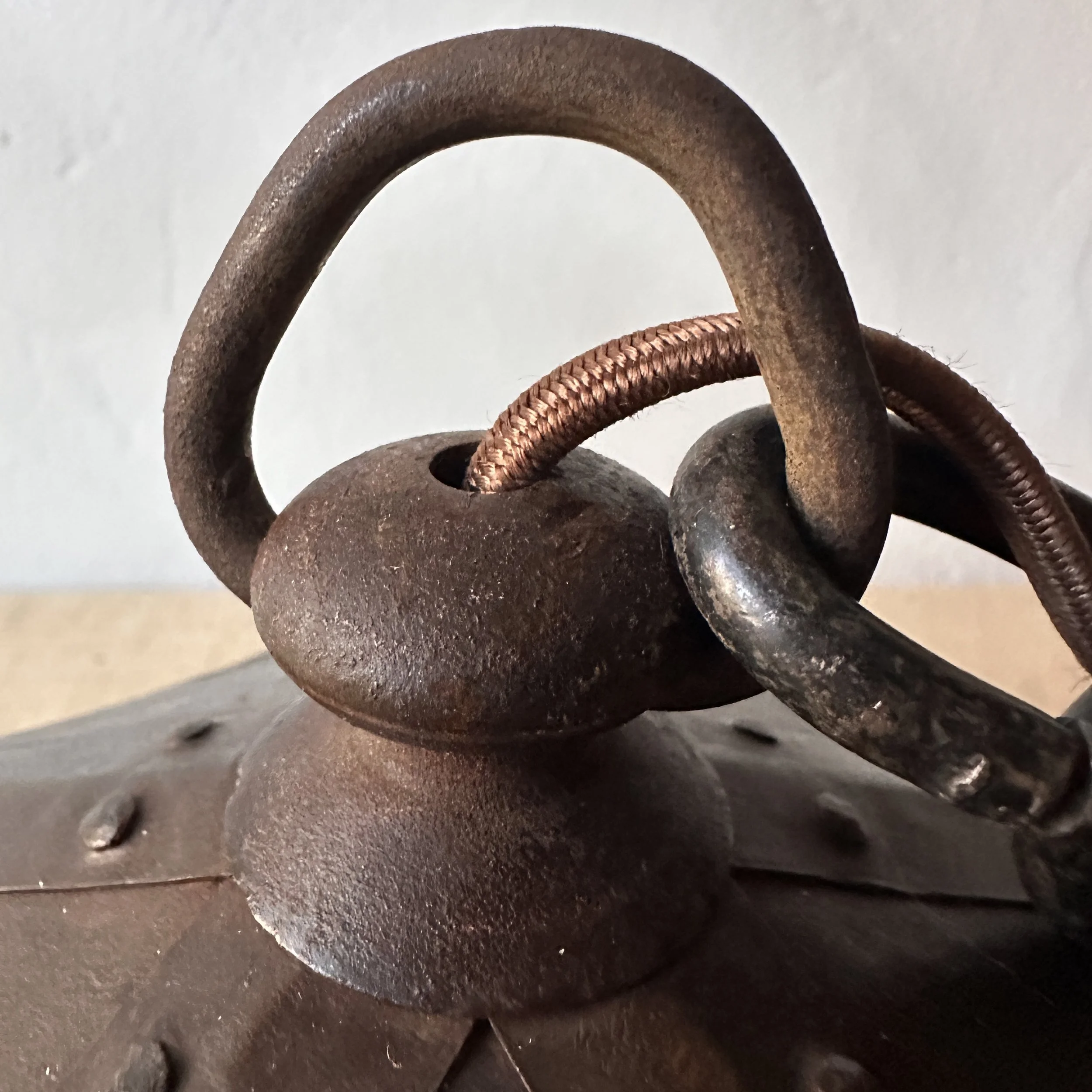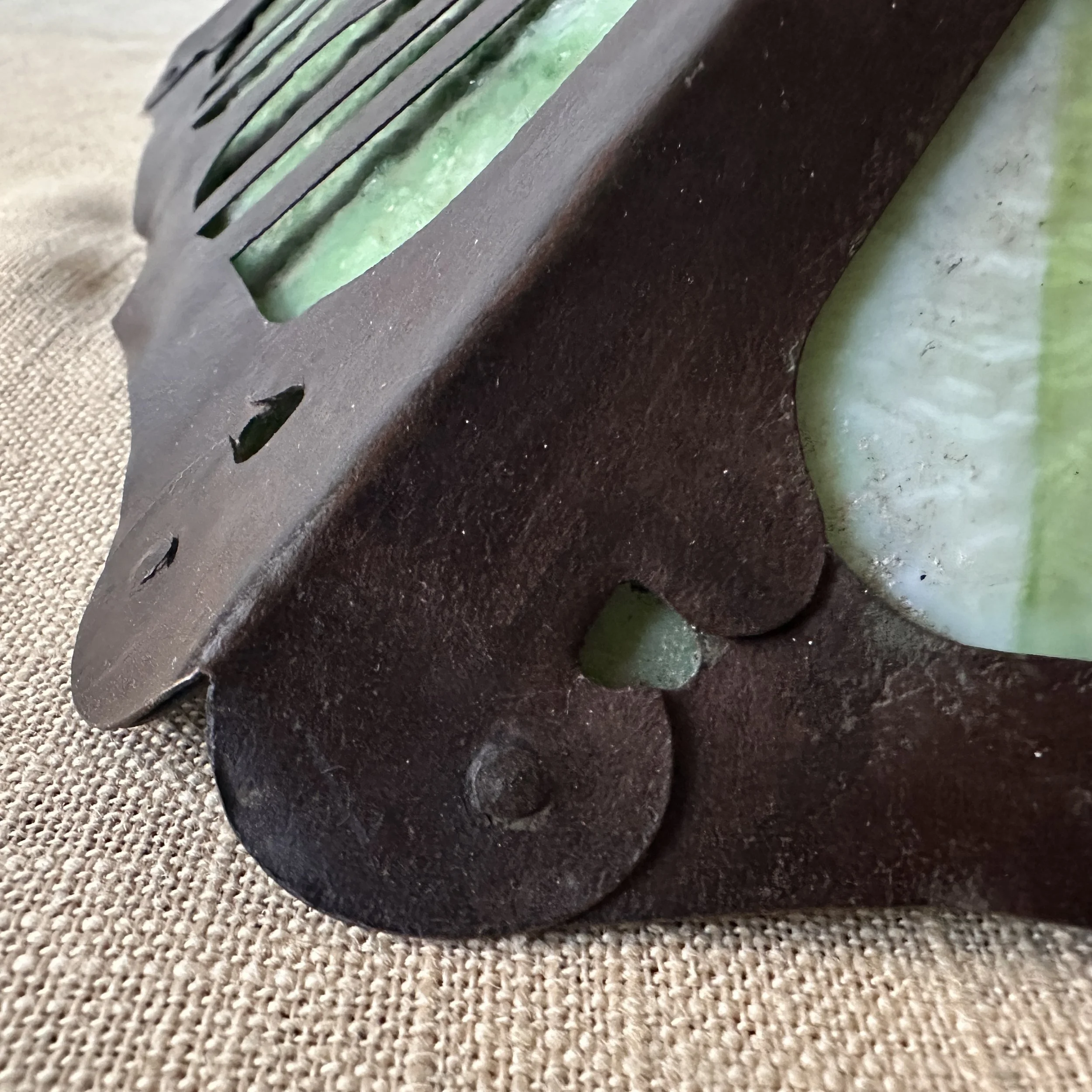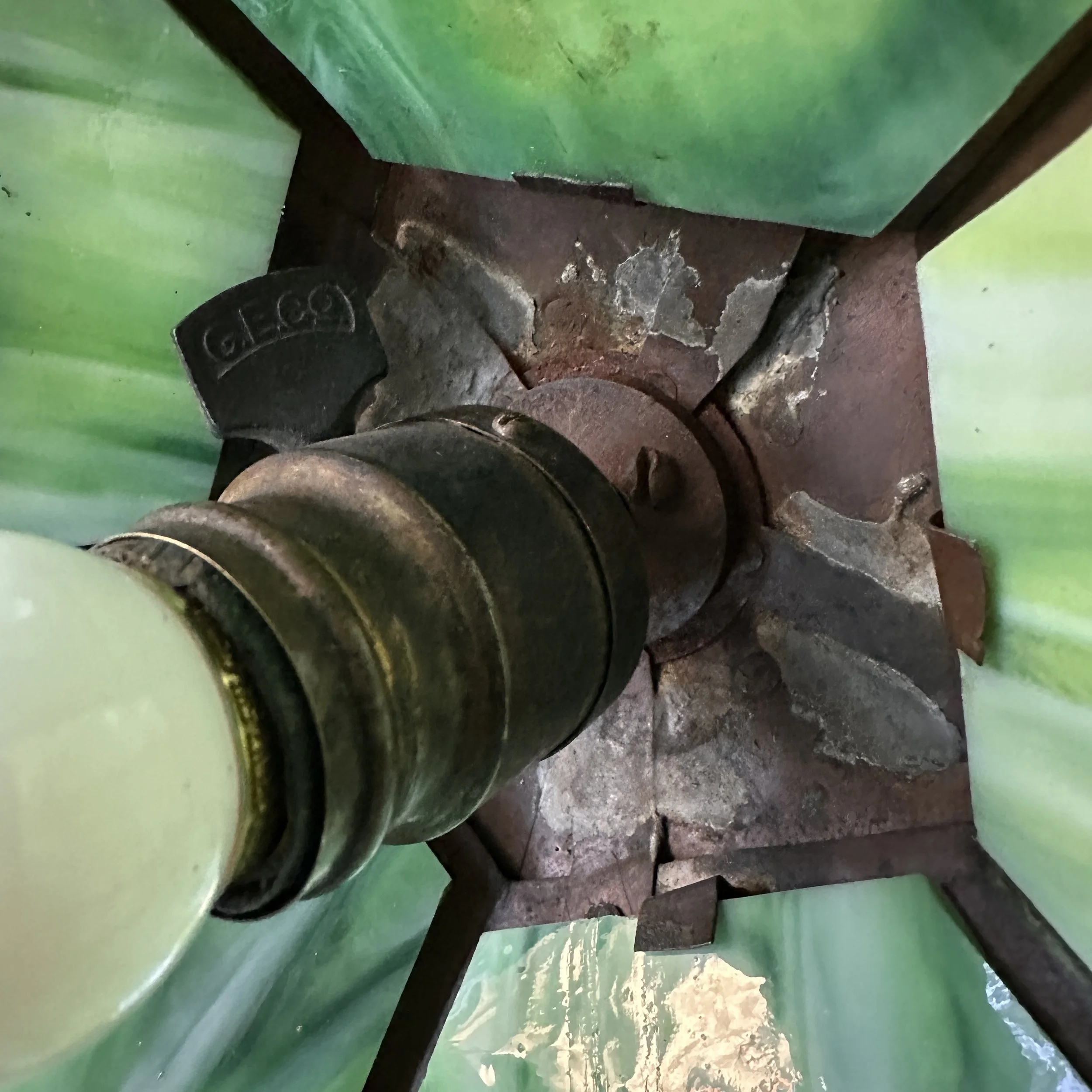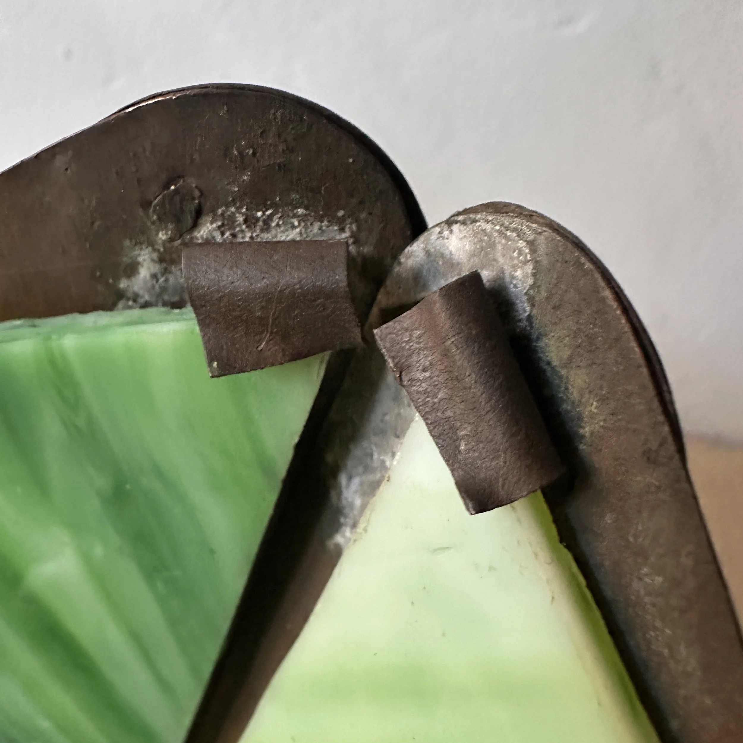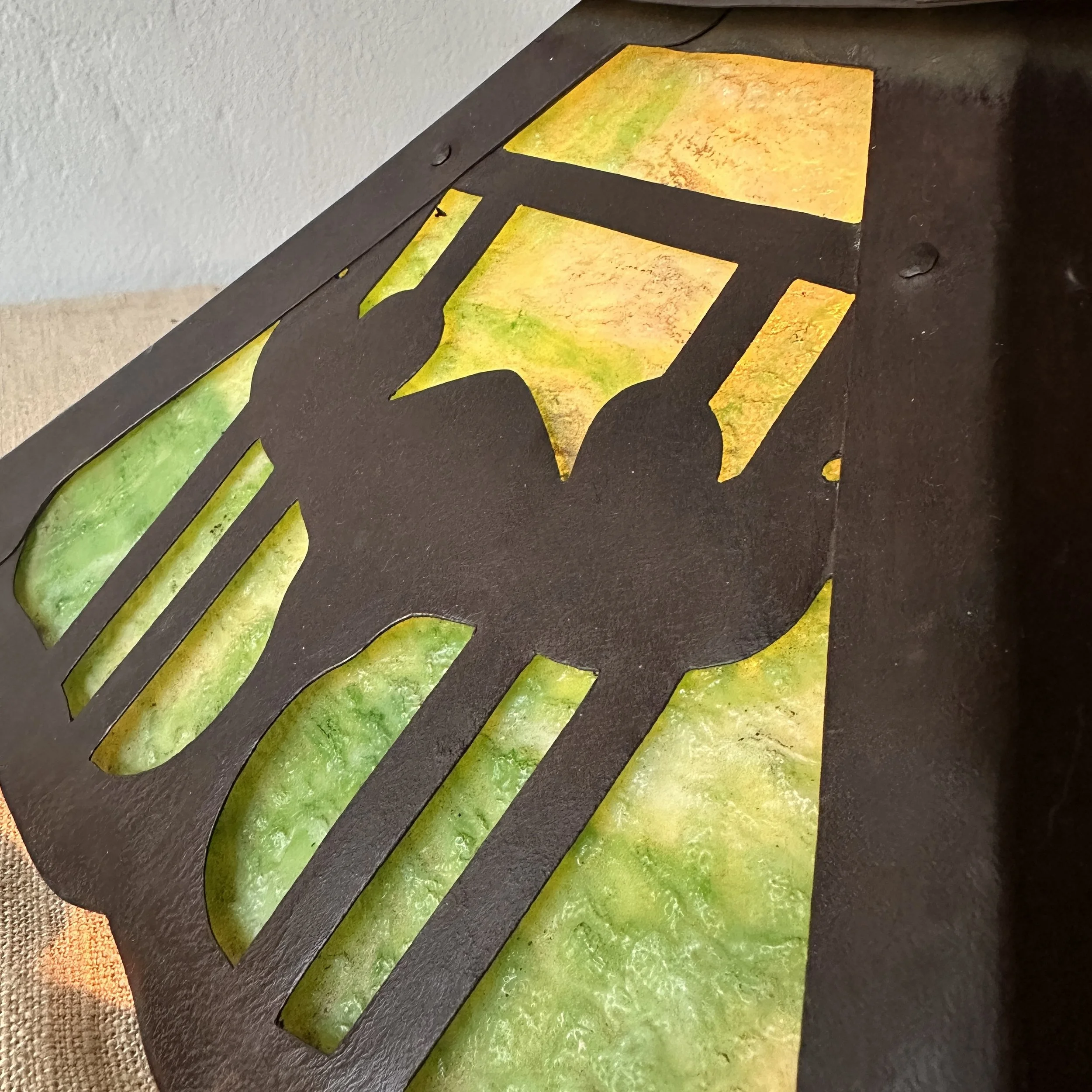 Douglas Donaldson chandelier circa 1910. This design was featured in a article written by Donaldson showcasing his lamp shades while he was working with the Handicraft Guild in Minneapolis (see HERE). The five sided copper shade has an architectural floral pierced decoration, the straps are cut and shaped at each end to mimic the curved edging and leaving his classic dot opening in each corner. The cap has a pagoda overhang design, riveted with seam straps. The ceiling mount matches the pagoda design in reverse. Shade all original condition; patina, glass and socket - even has decades of dirt and residue still present. The ceiling mount has been repatinated, rewired and ready for use. Measures about 35/36” in drop including the mount structure, shade measures 14” wide and 7” tall, mount is roughly 6” wide. Chain could be extended if desired. SOLD