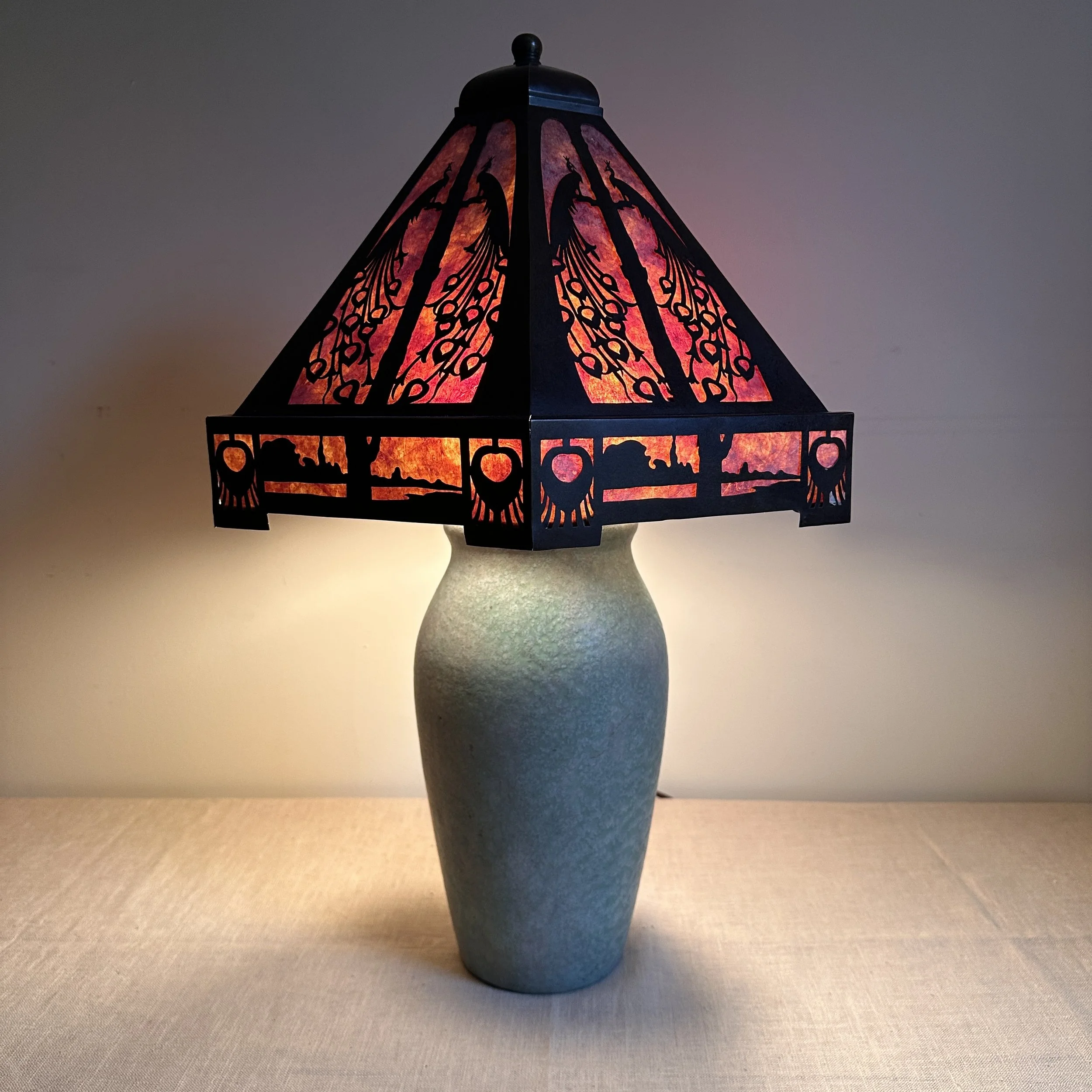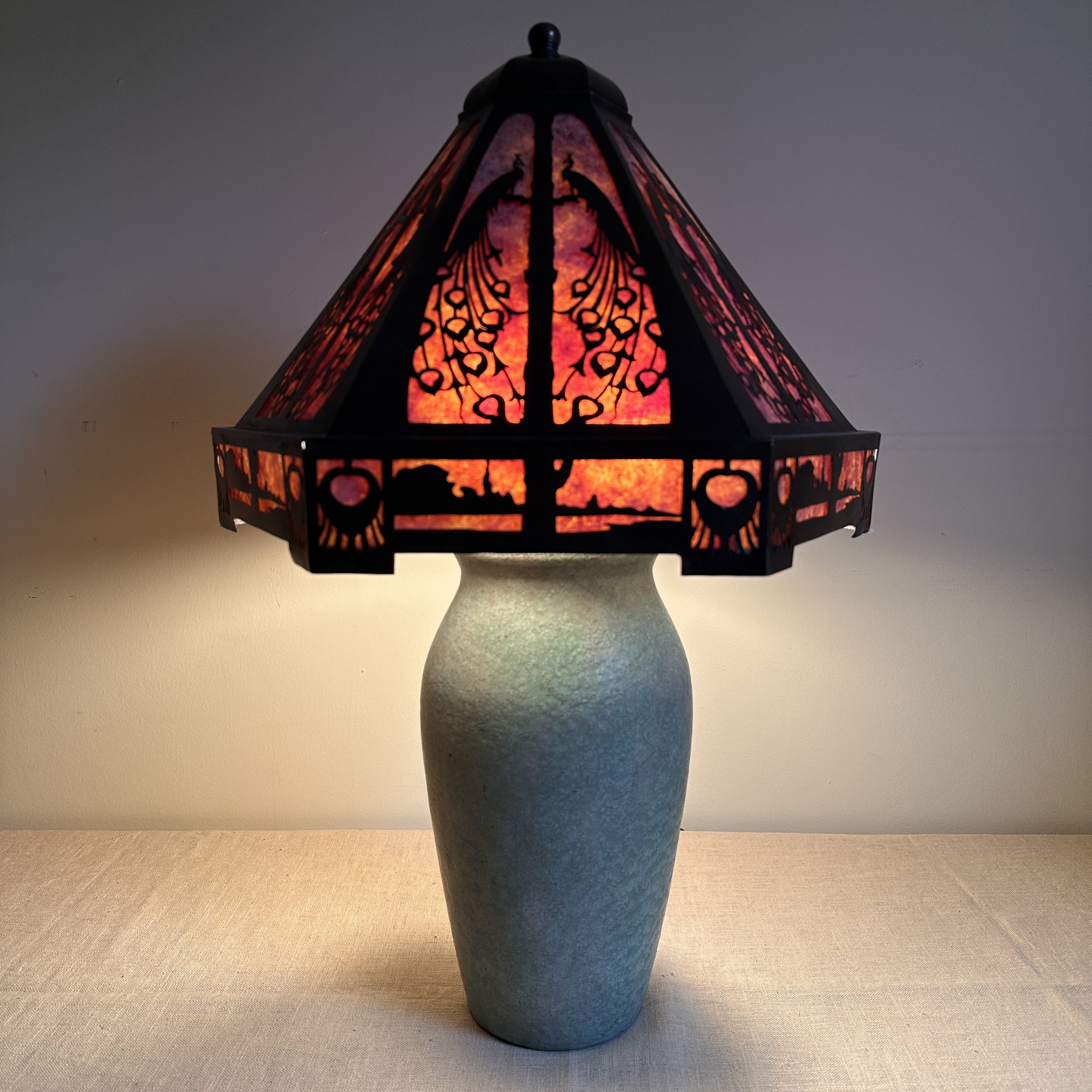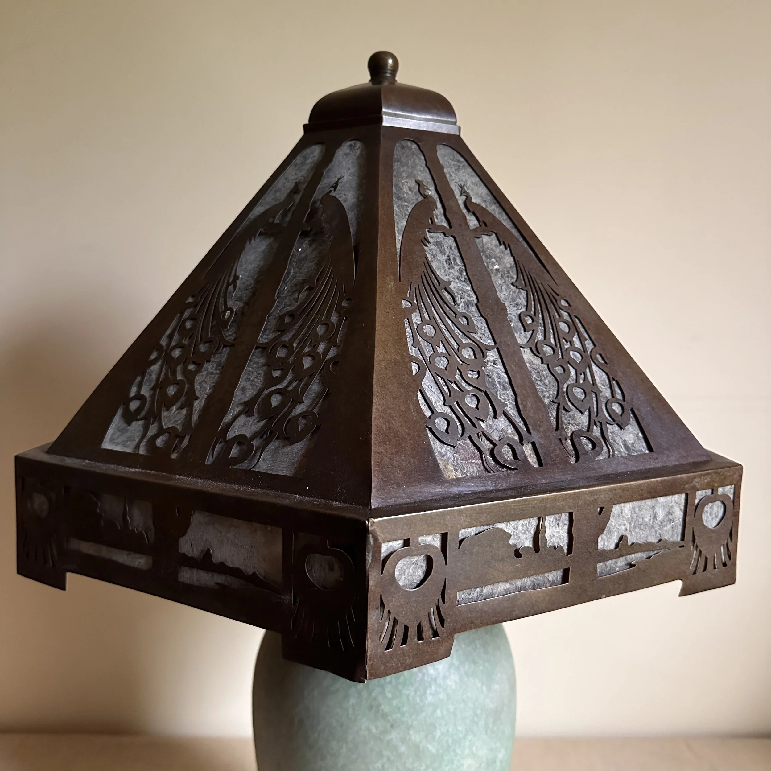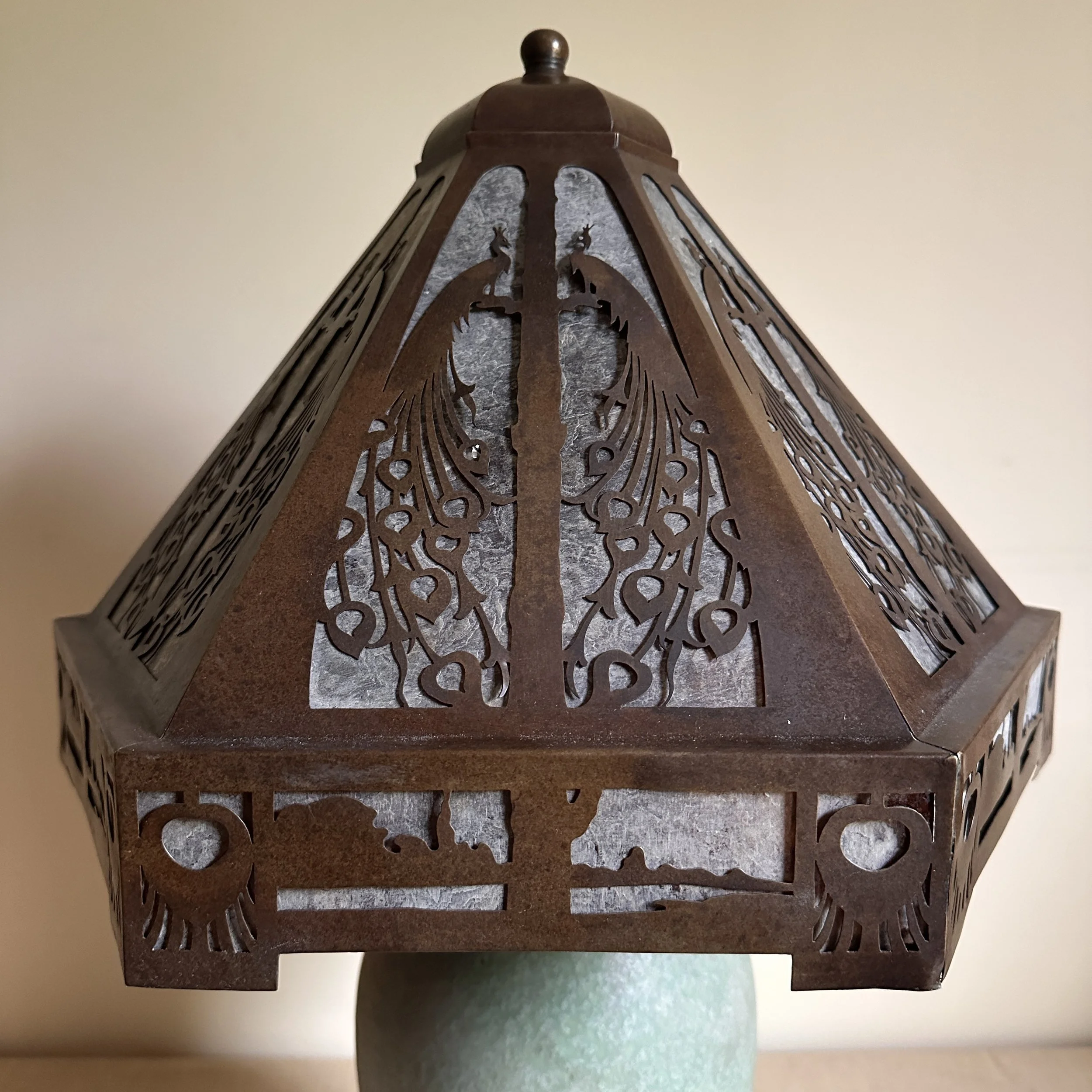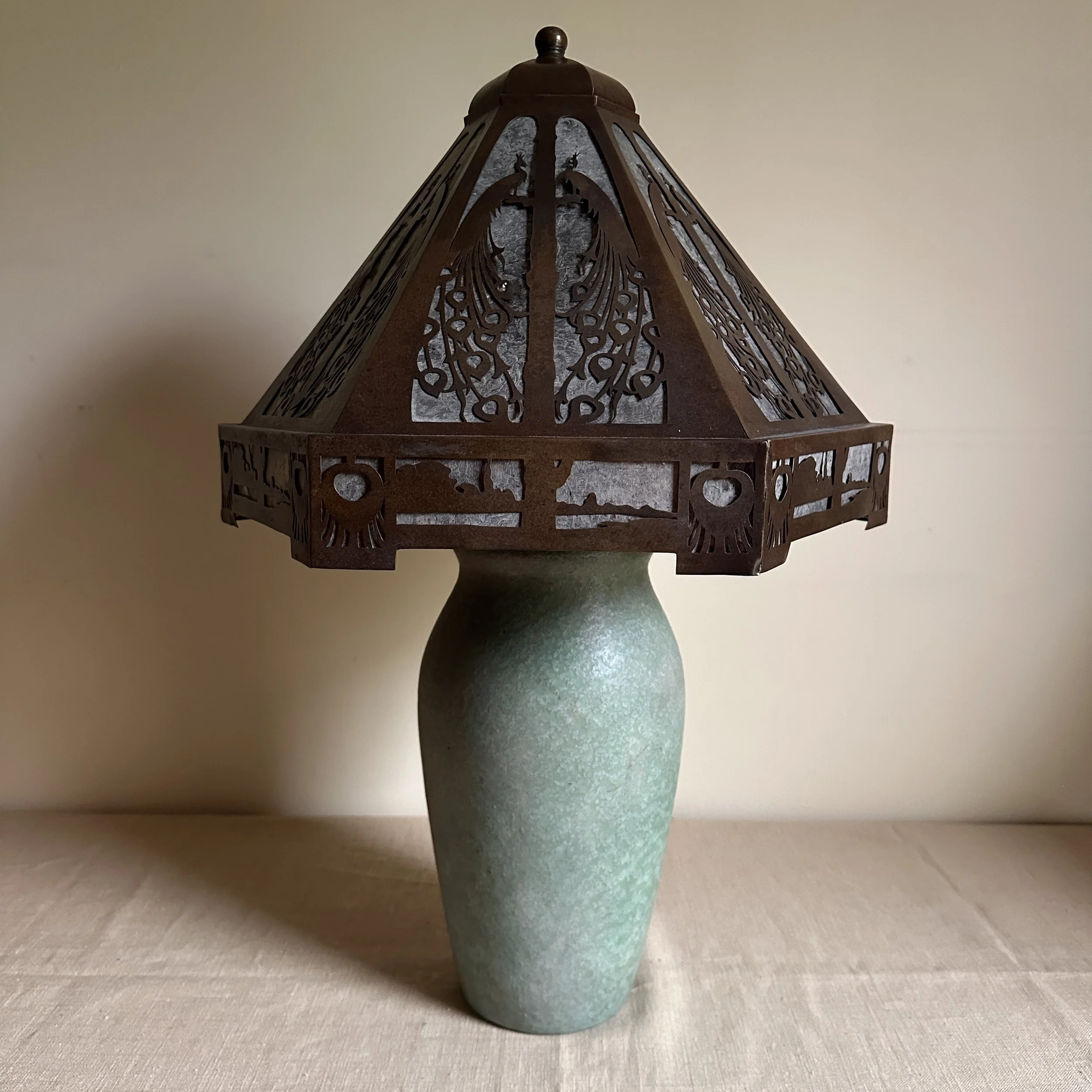 Douglas Donaldson for Handicraft Guild, Minneapolis circa 1910. Six sided lamp shade with roosting peacocks, the central tree below border with landscape background and stylized peacock eyes in each corner. Copper with enhanced original patina and older replaced mica. Some of the peacock heads appear soldered on, due to small size of work. Overall lighter gauge copper shade. Base unmarked, possibly Weller with a green curdled glaze. Original hammered copper mount in pottery, two sockets. Rewired with silk cord and bakelite plug. Overall measures 23.5” tall, shade is 16” at widest and 14” at smallest in width. Base is 12” tall and 7” wide at middle. $3,800
