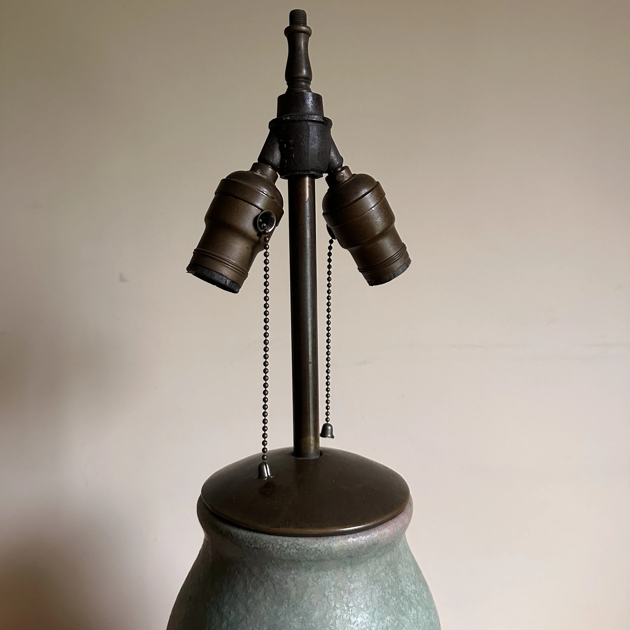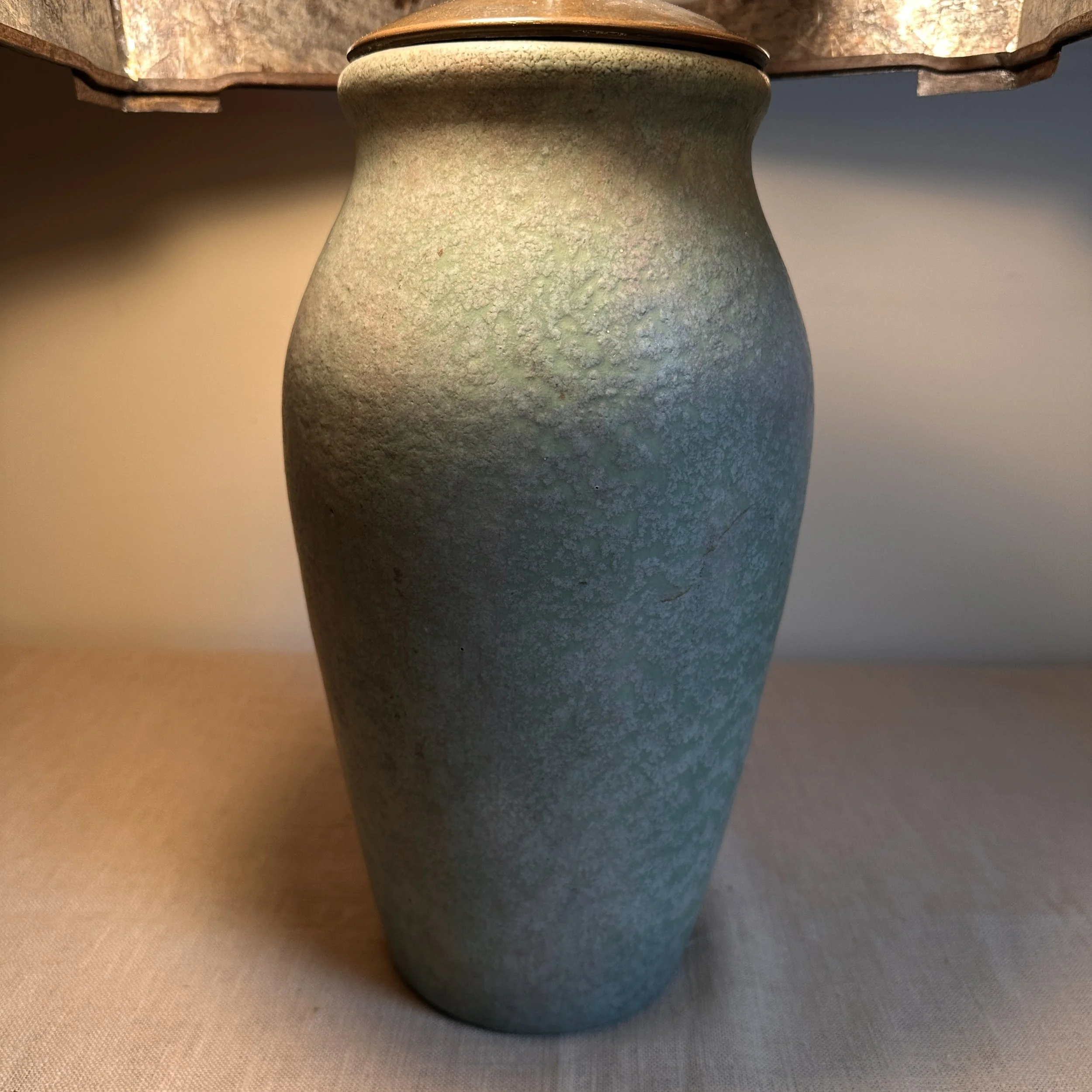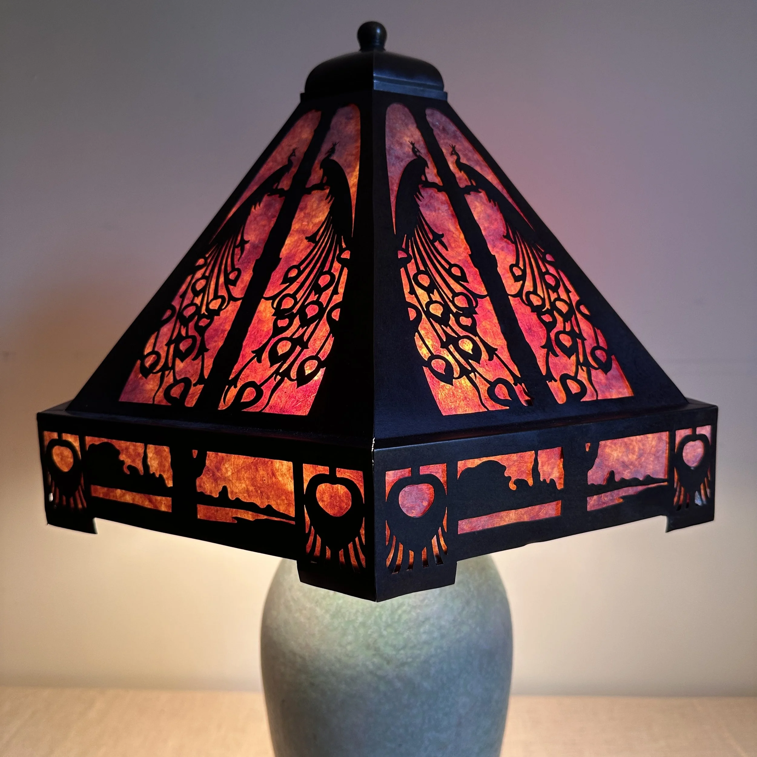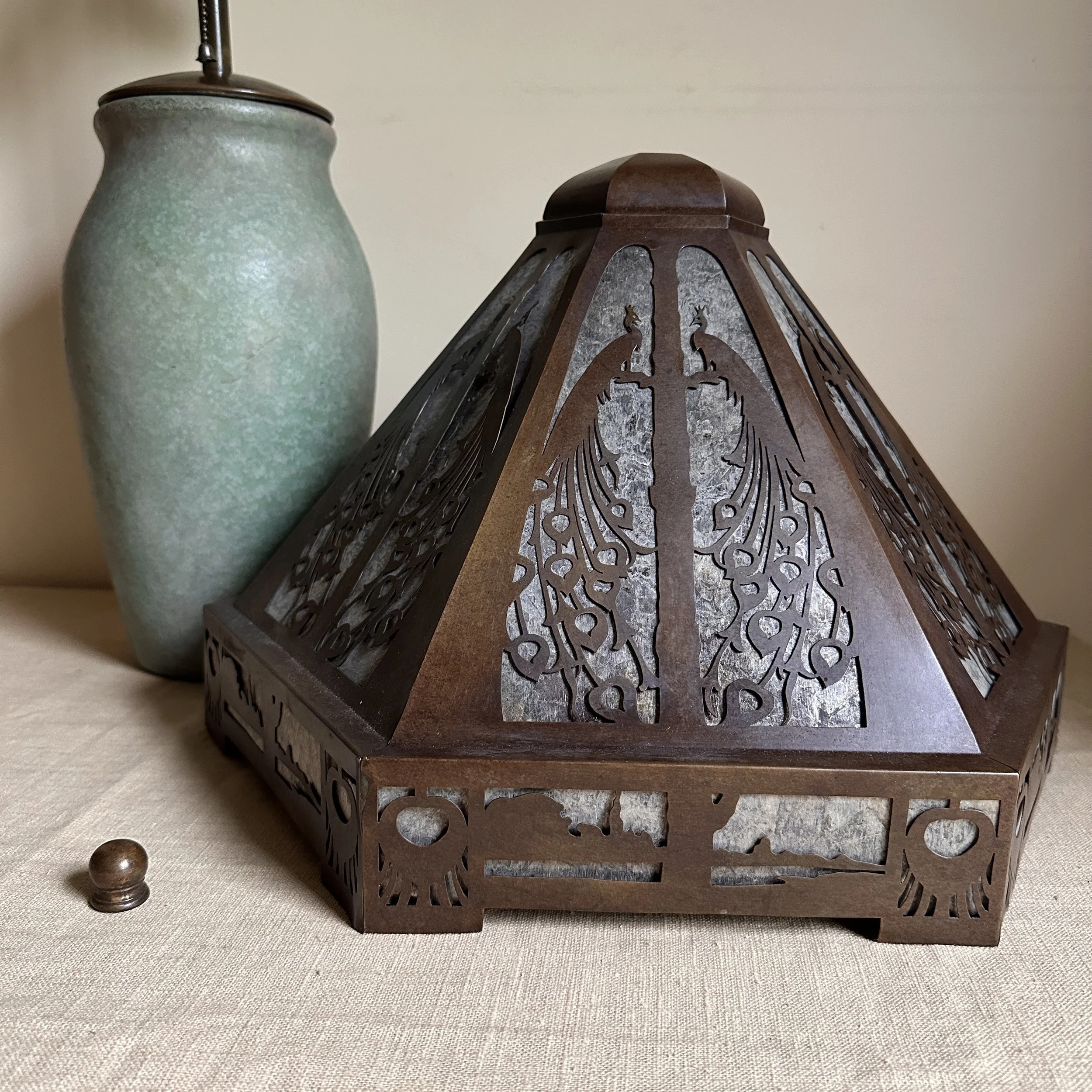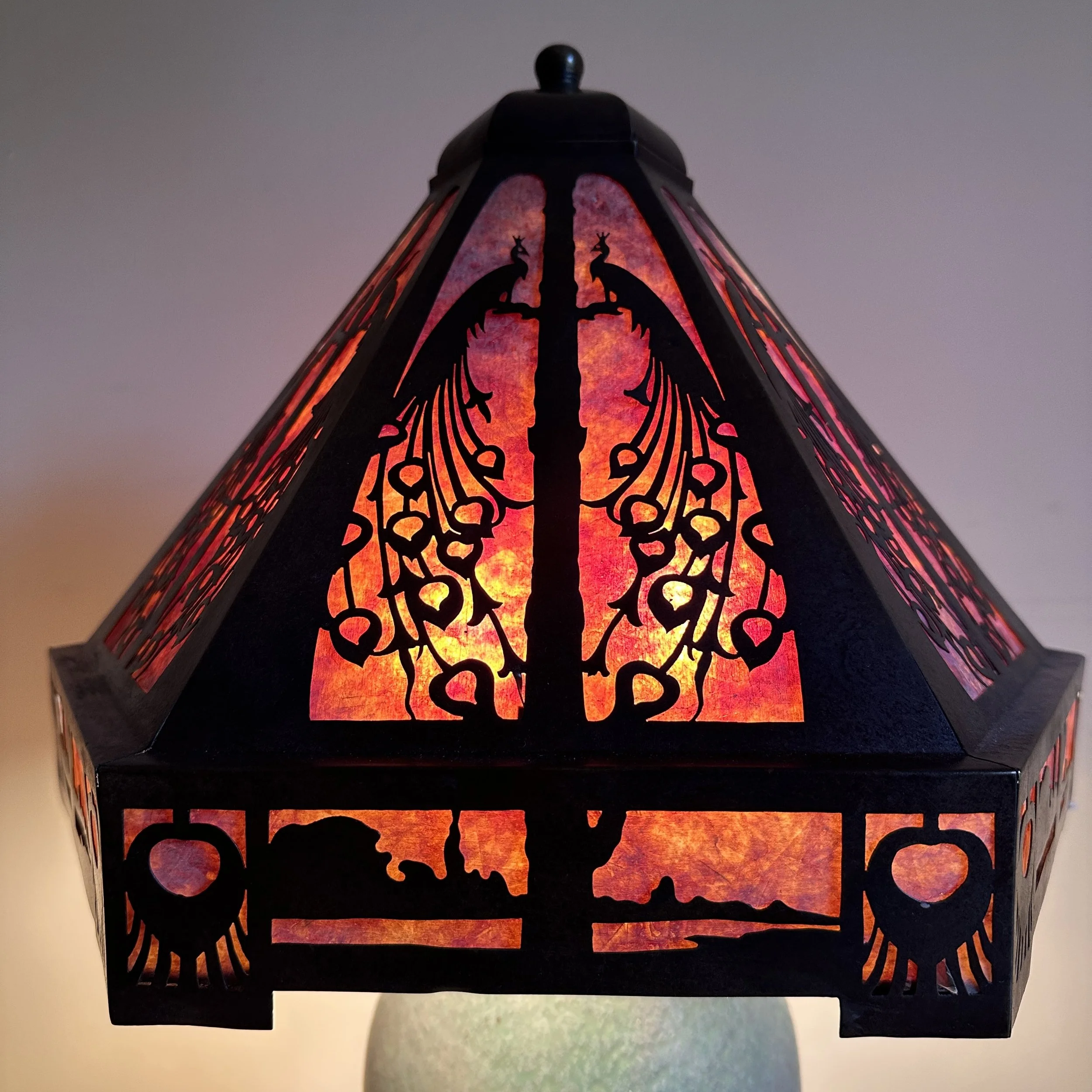 Douglas Donaldson for Handicraft Guild, Minneapolis circa 1910. Six sided lamp shade with roosting peacocks, the central tree below border with landscape background and stylized peacock eyes in each corner. Copper with enhanced original patina and older replaced mica. Some of the peacock heads appear soldered on, due to small size of work. Overall lighter gauge copper shade. Base unmarked, possibly Weller with a green curdled glaze. Original hammered copper mount in pottery, two sockets. Rewired with silk cord and bakelite plug. Overall measures 23.5” tall, shade is 16” at widest and 14” at smallest in width. Base is 12” tall and 7” wide at middle. $3,800