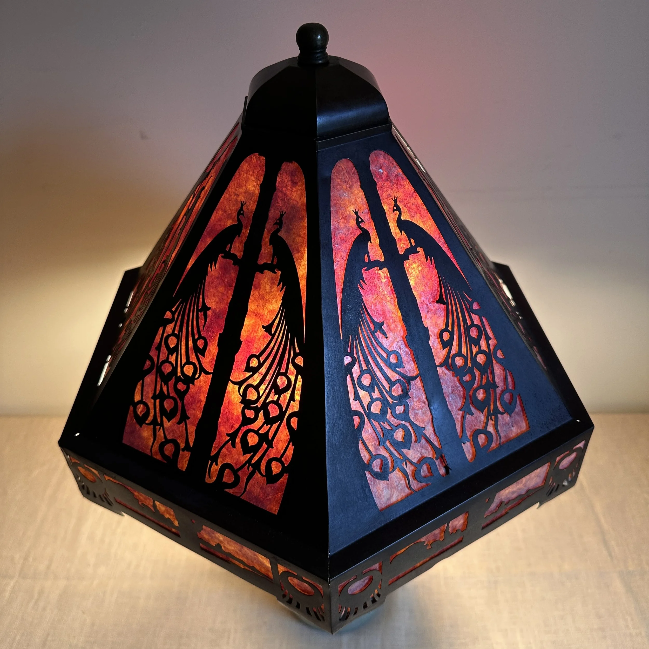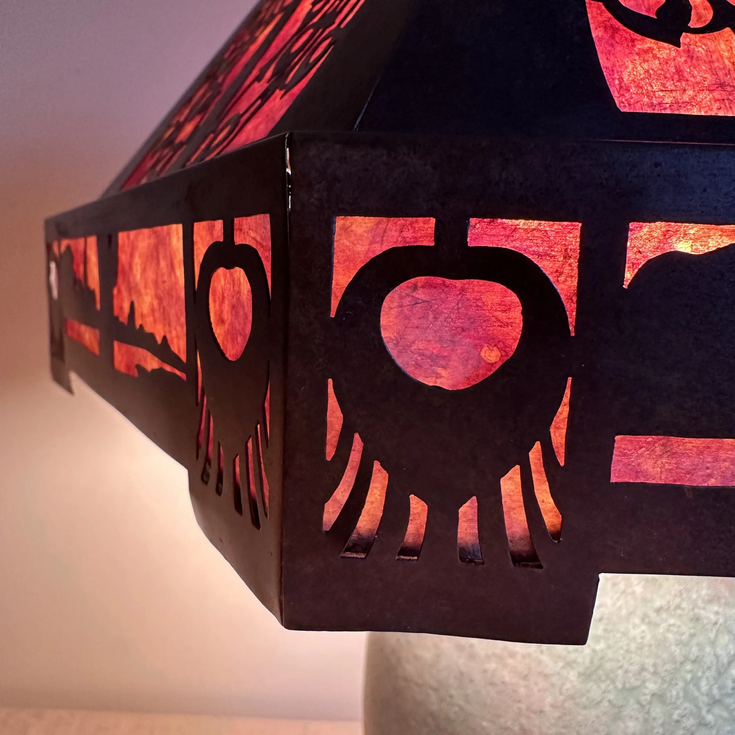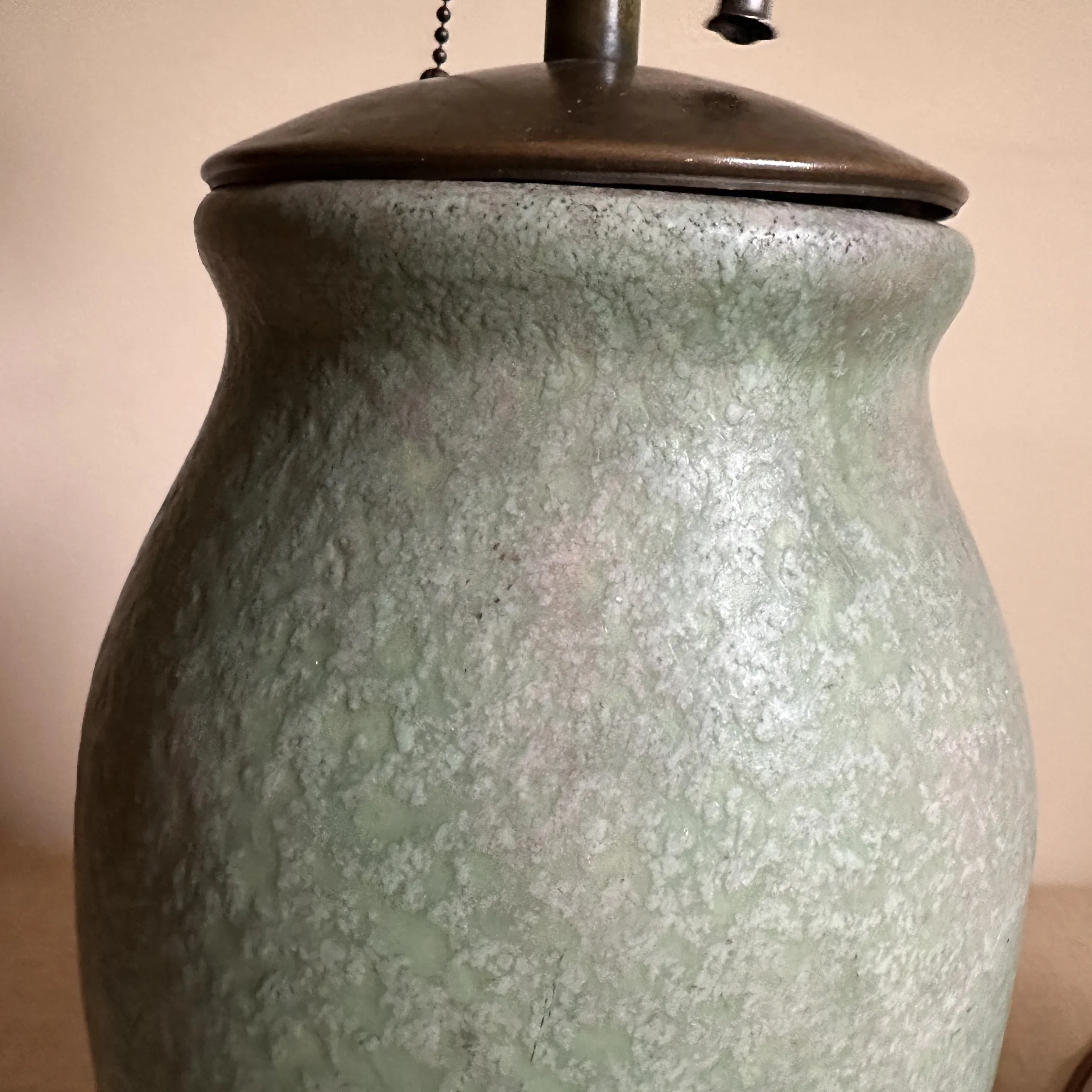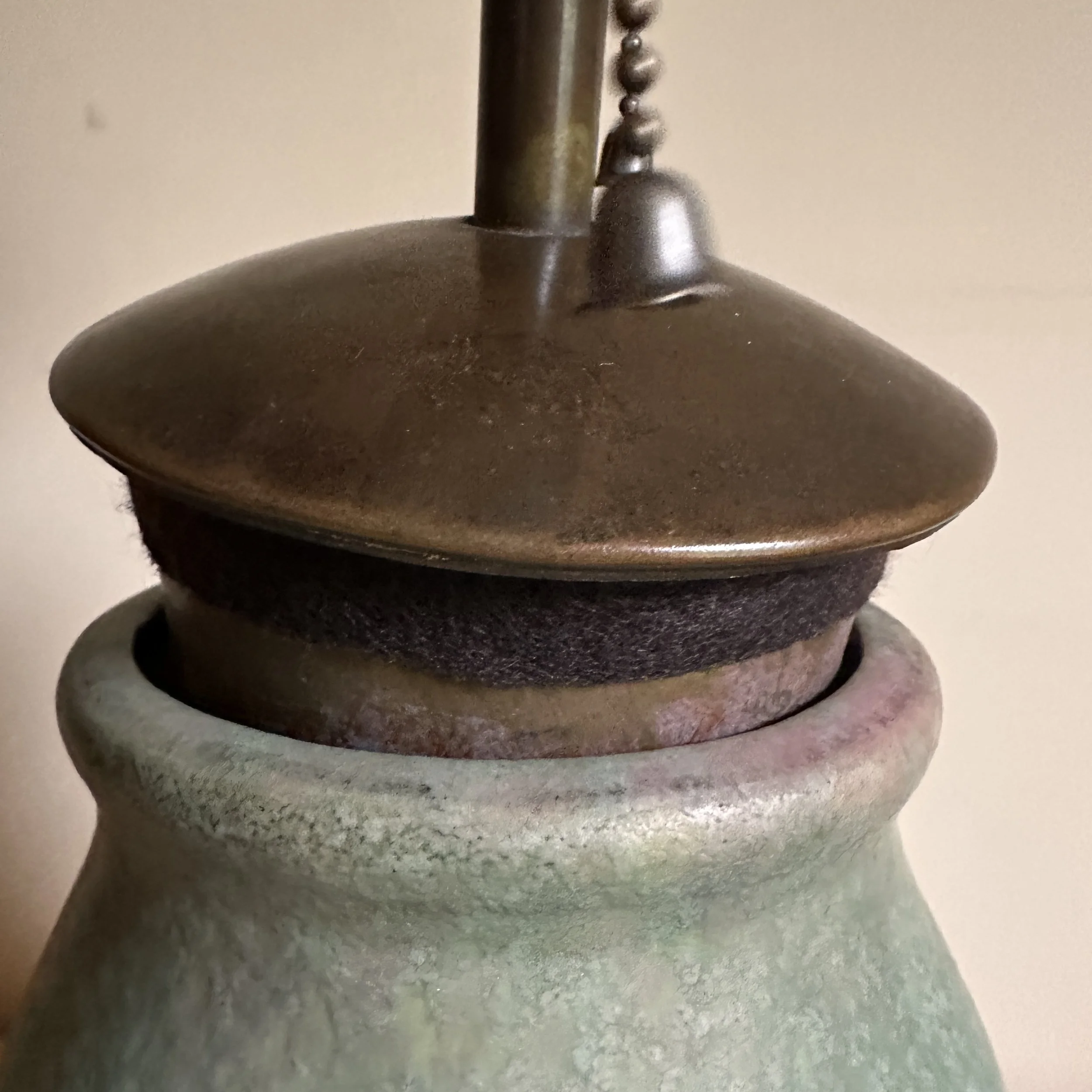 Douglas Donaldson for Handicraft Guild, Minneapolis circa 1910. Six sided lamp shade with roosting peacocks, the central tree below border with landscape background and stylized peacock eyes in each corner. Copper with enhanced original patina and older replaced mica. Some of the peacock heads appear soldered on, due to small size of work. Overall lighter gauge copper shade. Base unmarked, possibly Weller with a green curdled glaze. Original hammered copper mount in pottery, two sockets. Rewired with silk cord and bakelite plug. Overall measures 23.5” tall, shade is 16” at widest and 14” at smallest in width. Base is 12” tall and 7” wide at middle. $3,800