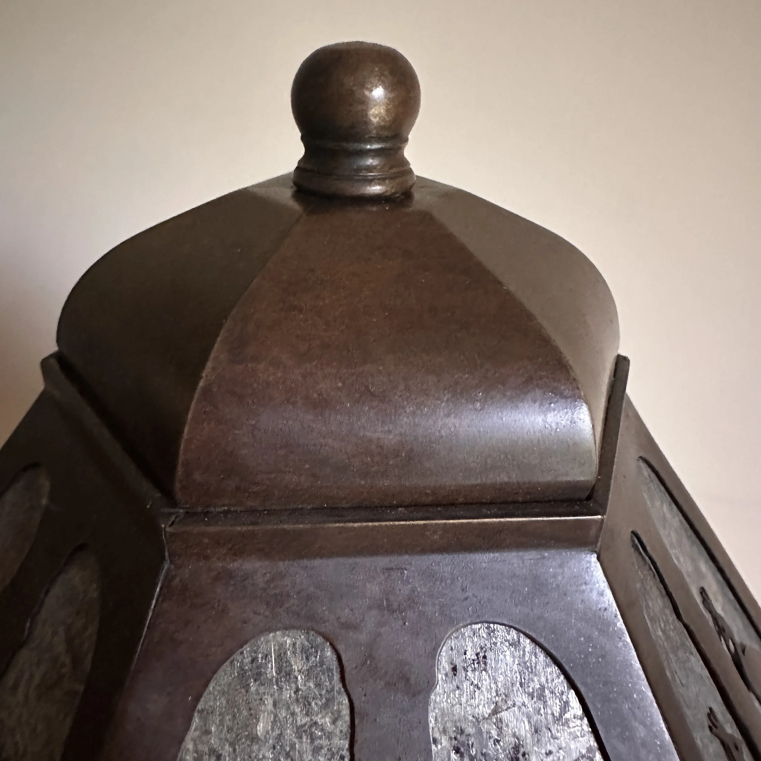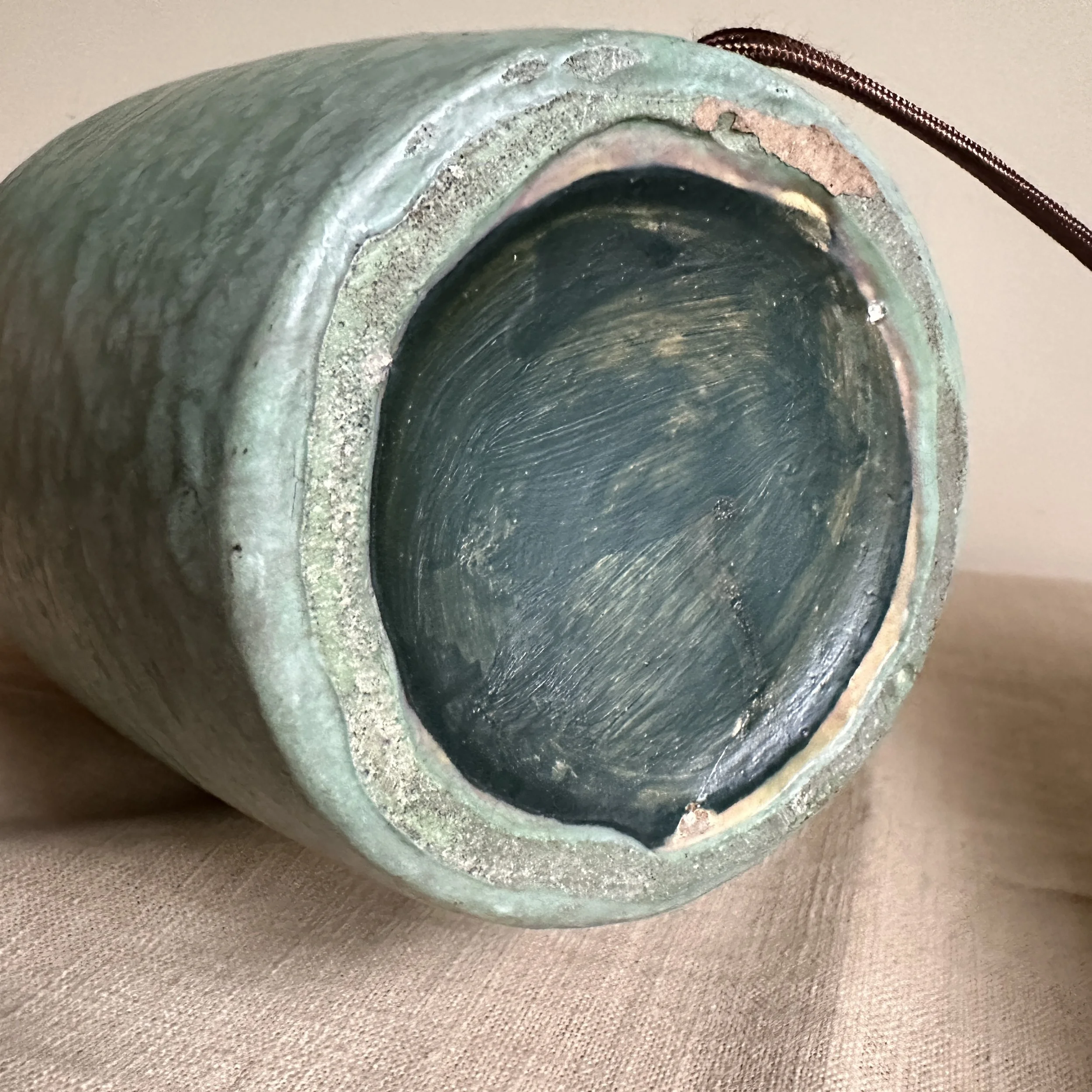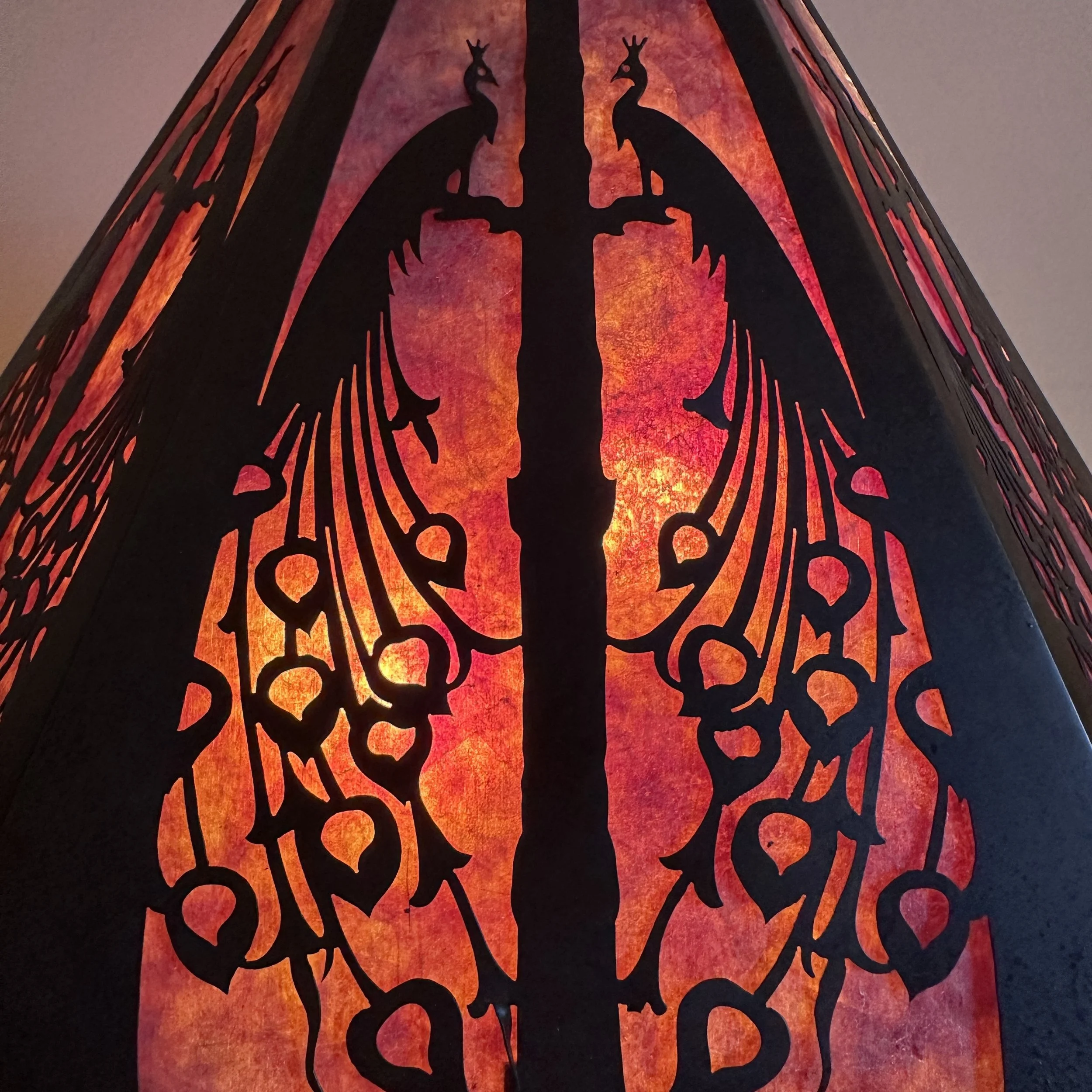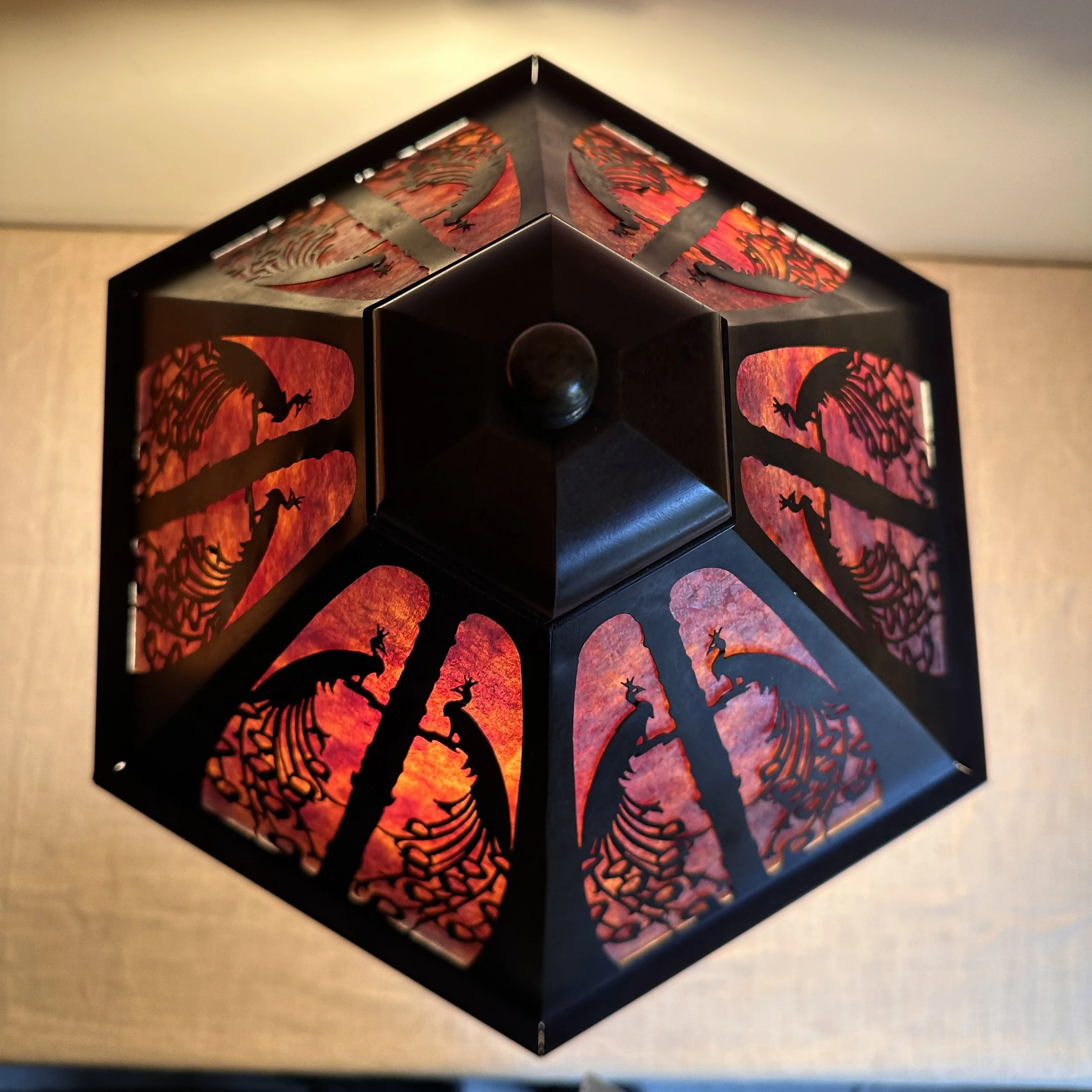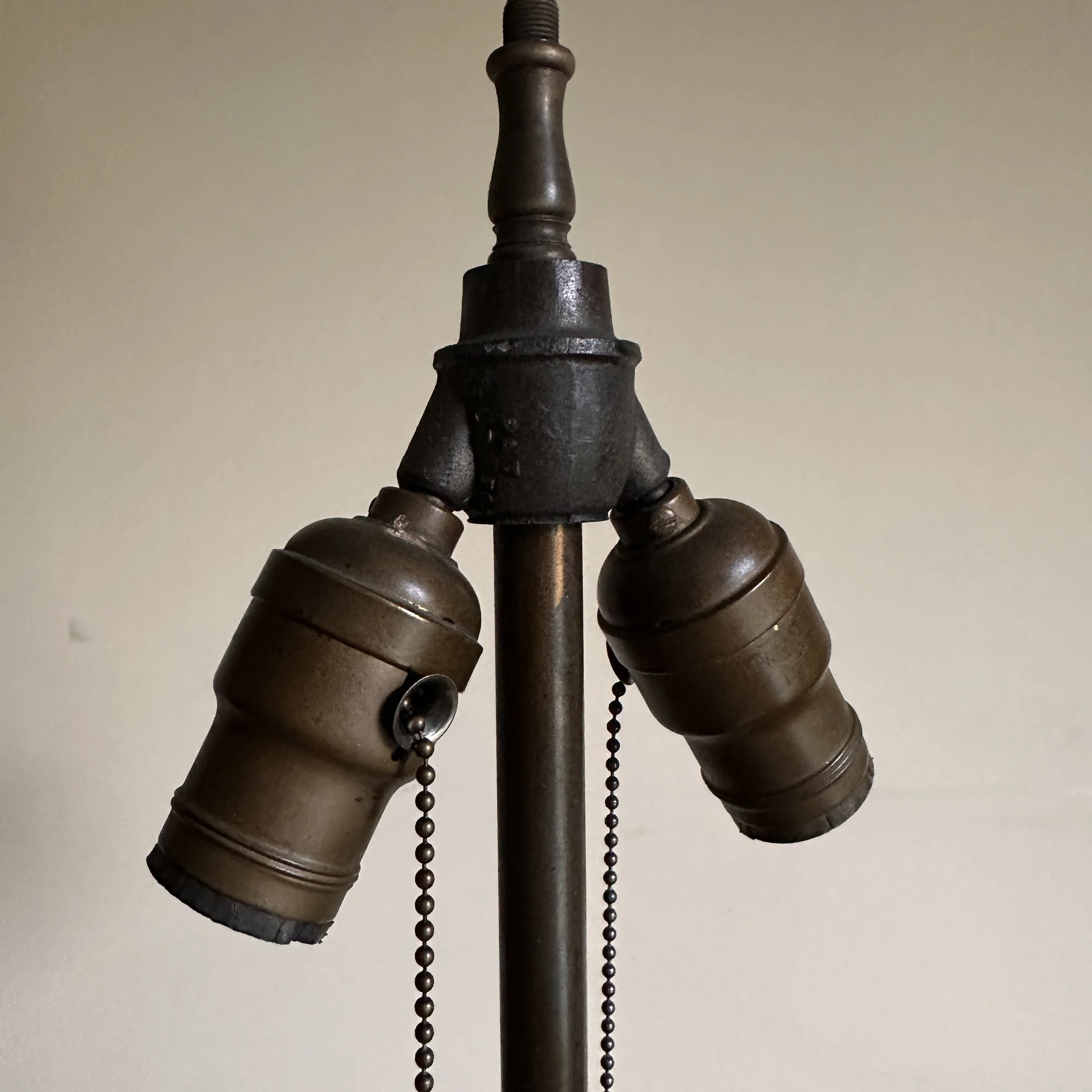 Douglas Donaldson for Handicraft Guild, Minneapolis circa 1910. Six sided lamp shade with roosting peacocks, the central tree below border with landscape background and stylized peacock eyes in each corner. Copper with enhanced original patina and older replaced mica. Some of the peacock heads appear soldered on, due to small size of work. Overall lighter gauge copper shade. Base unmarked, possibly Weller with a green curdled glaze. Original hammered copper mount in pottery, two sockets. Rewired with silk cord and bakelite plug. Overall measures 23.5” tall, shade is 16” at widest and 14” at smallest in width. Base is 12” tall and 7” wide at middle. $3,800