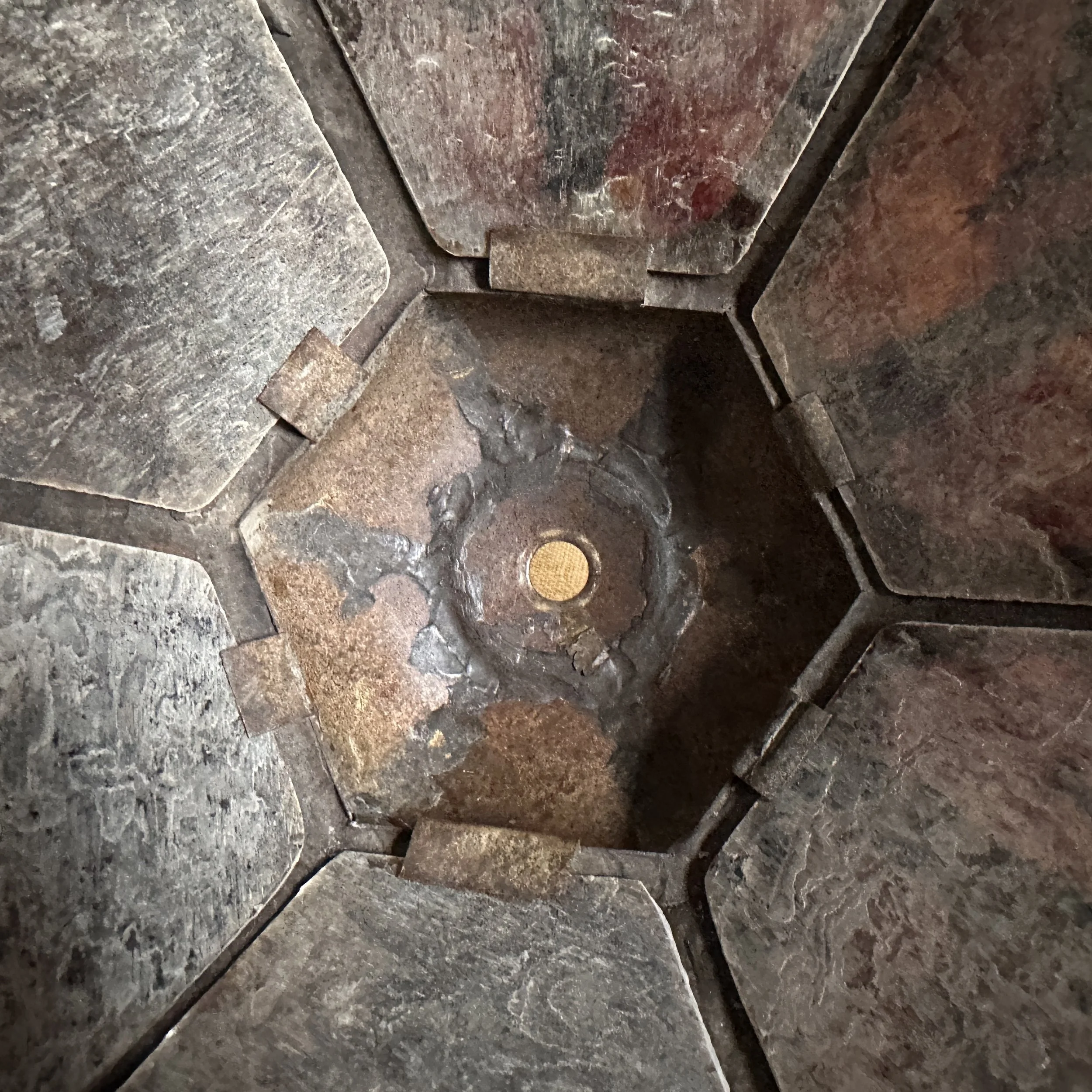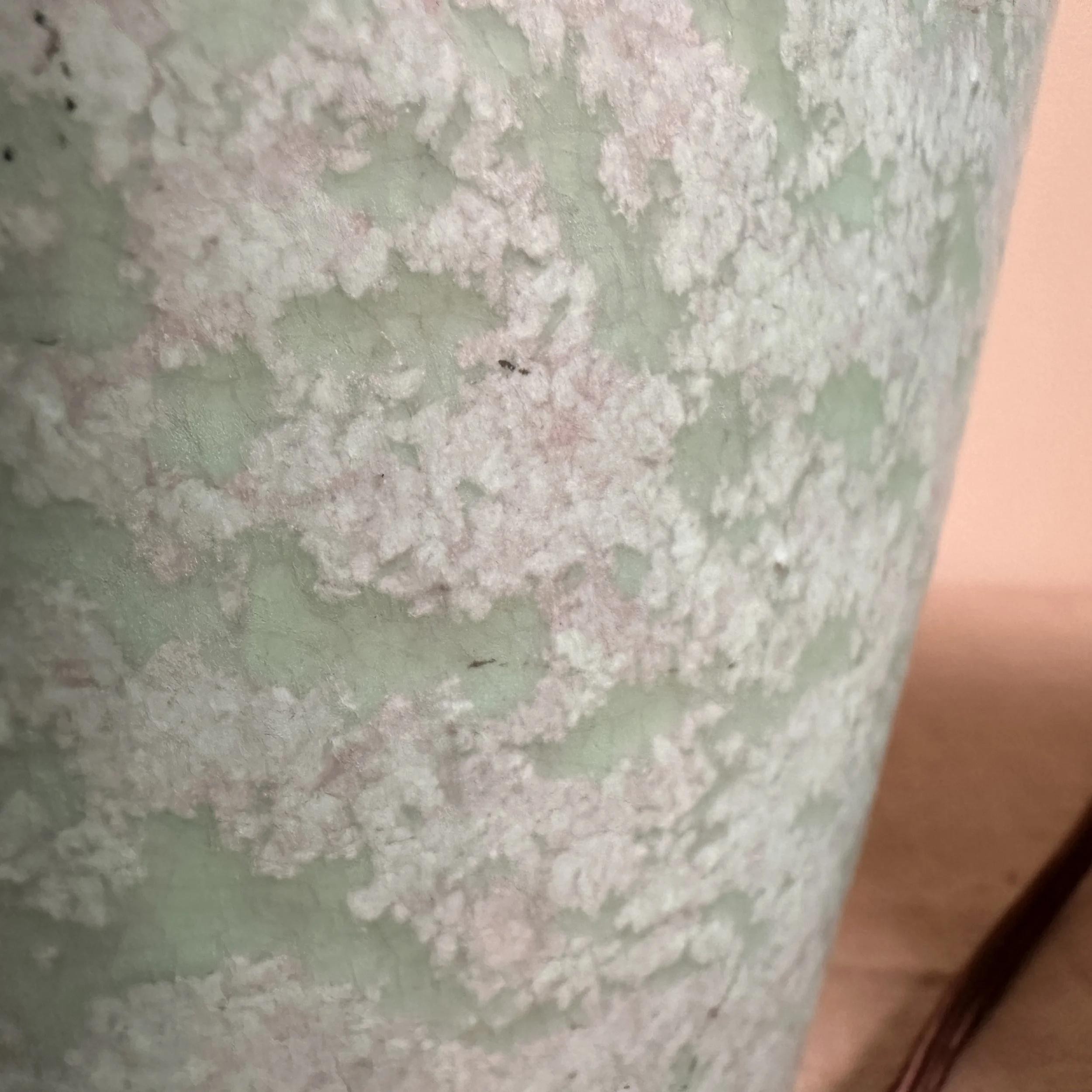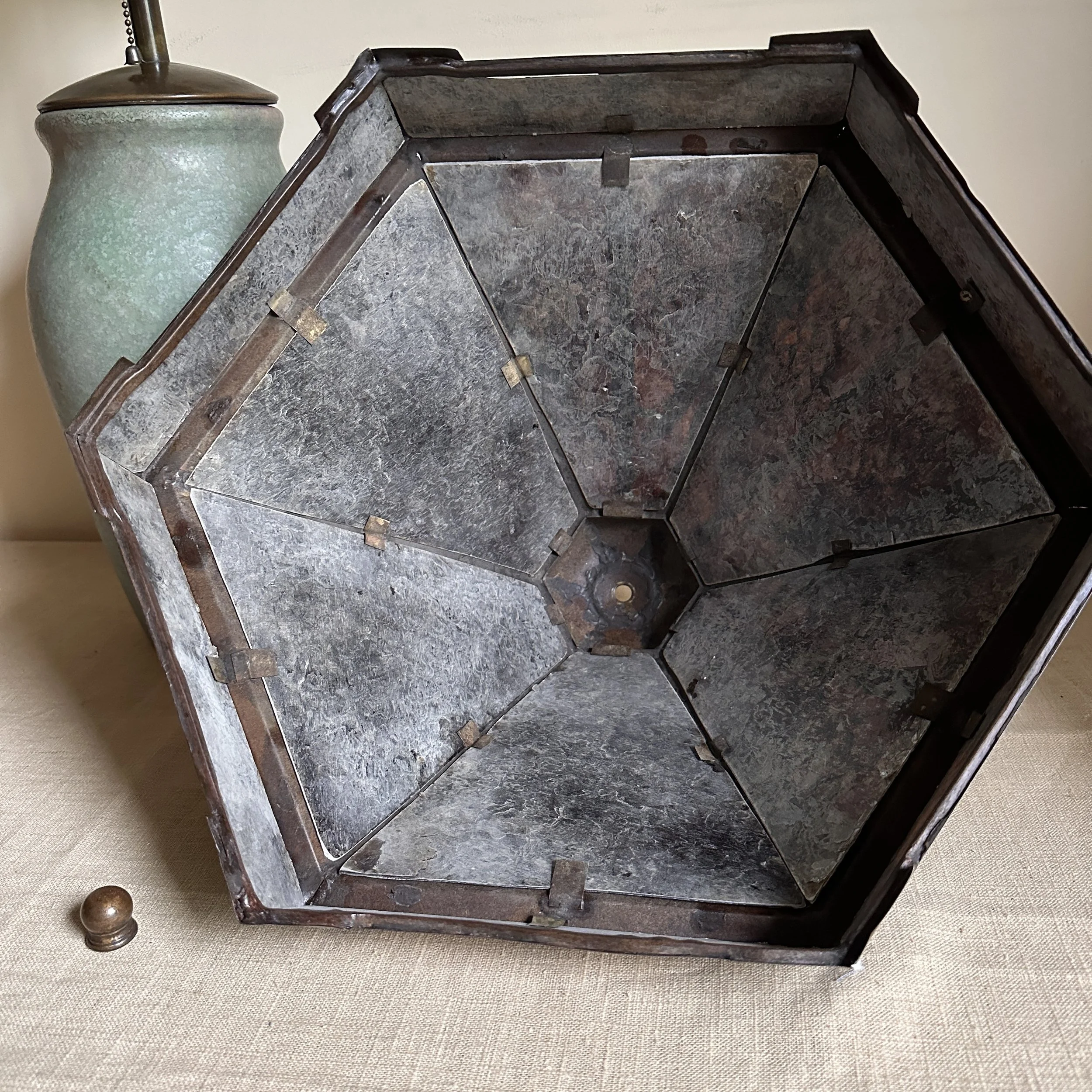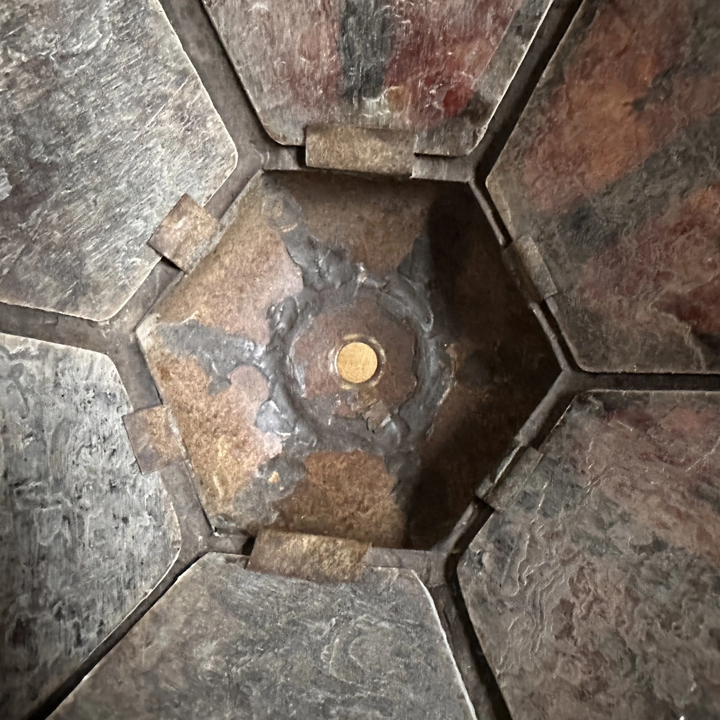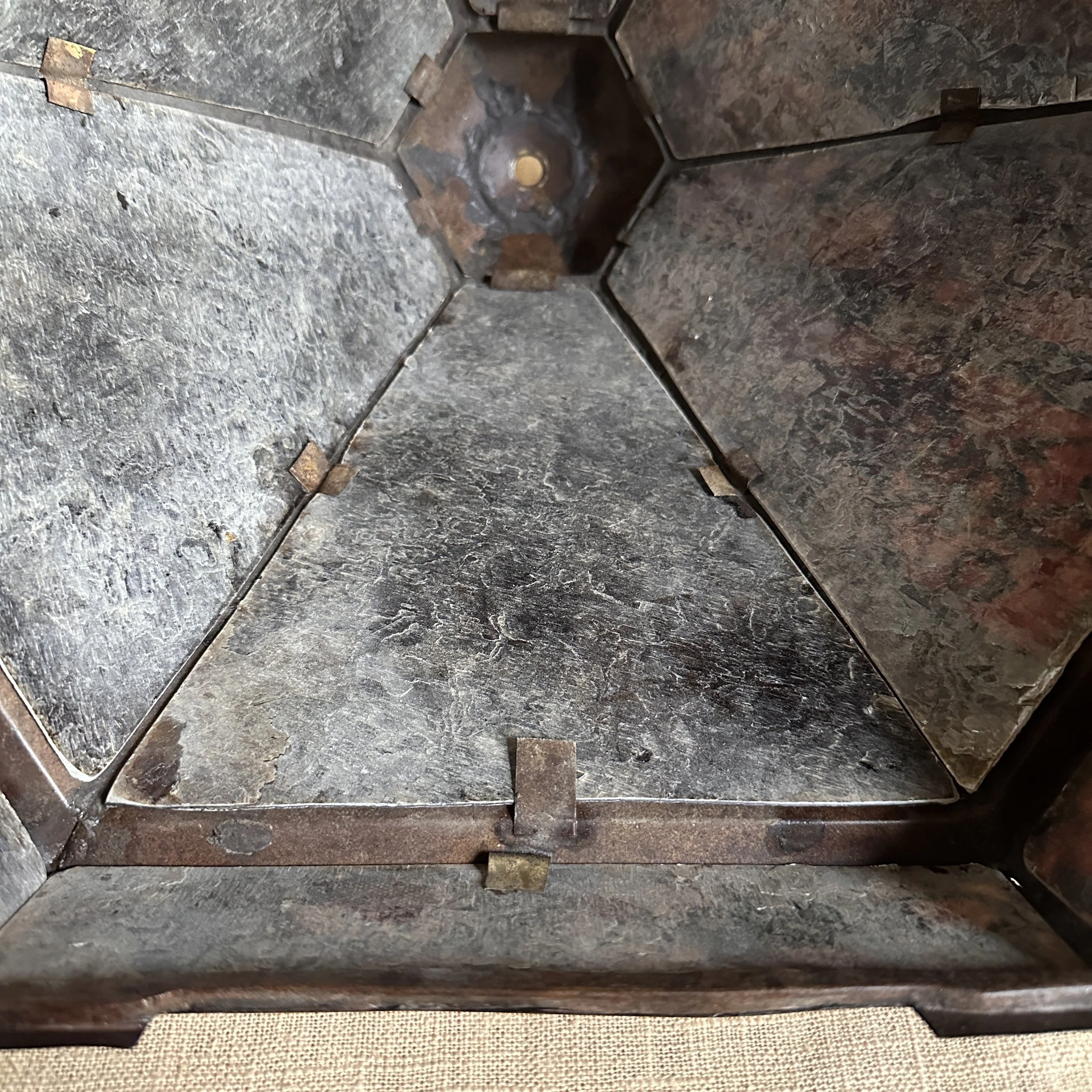 Douglas Donaldson for Handicraft Guild, Minneapolis circa 1910. Six sided lamp shade with roosting peacocks, the central tree below border with landscape background and stylized peacock eyes in each corner. Copper with enhanced original patina and older replaced mica. Some of the peacock heads appear soldered on, due to small size of work. Overall lighter gauge copper shade. Base unmarked, possibly Weller with a green curdled glaze. Original hammered copper mount in pottery, two sockets. Rewired with silk cord and bakelite plug. Overall measures 23.5” tall, shade is 16” at widest and 14” at smallest in width. Base is 12” tall and 7” wide at middle. $3,800
