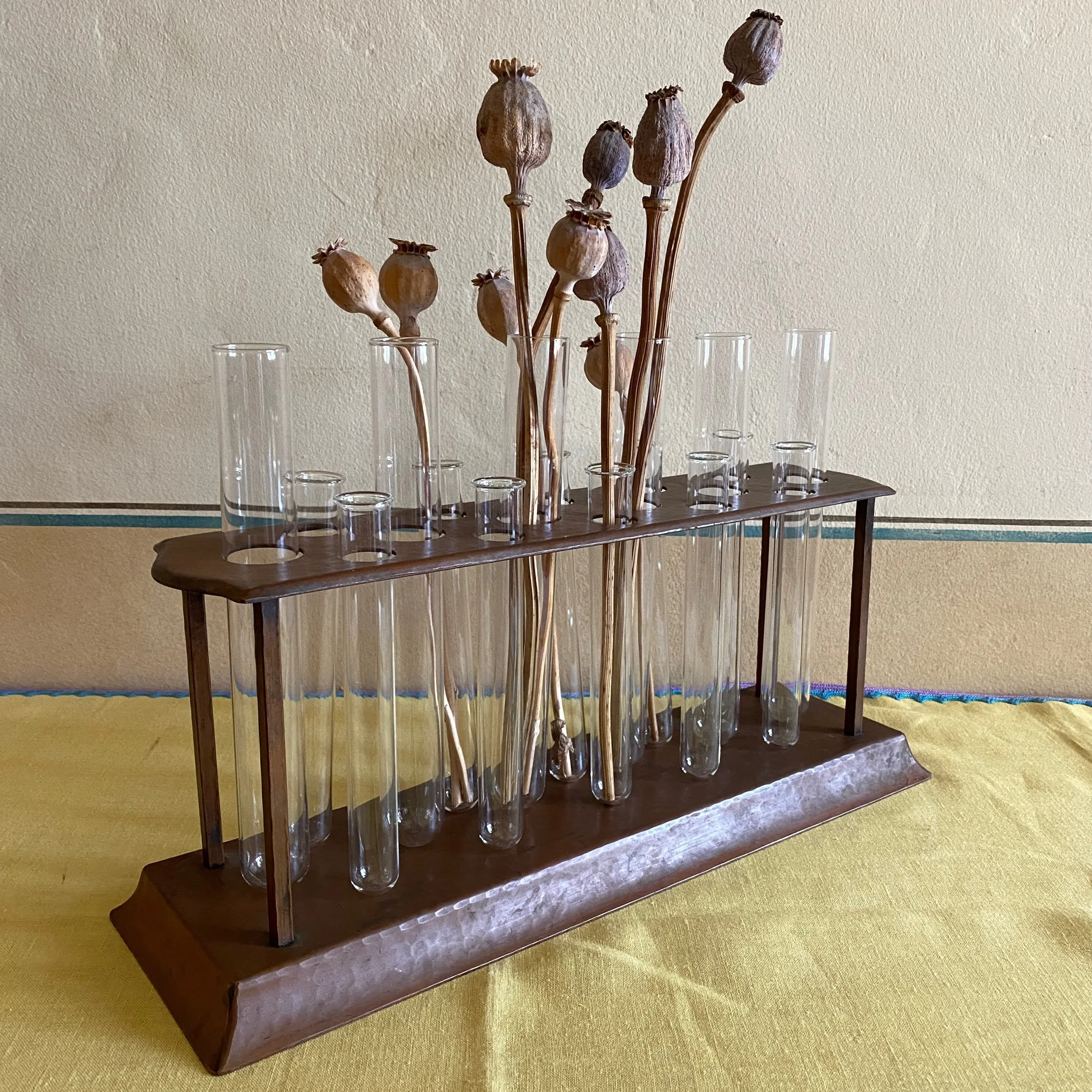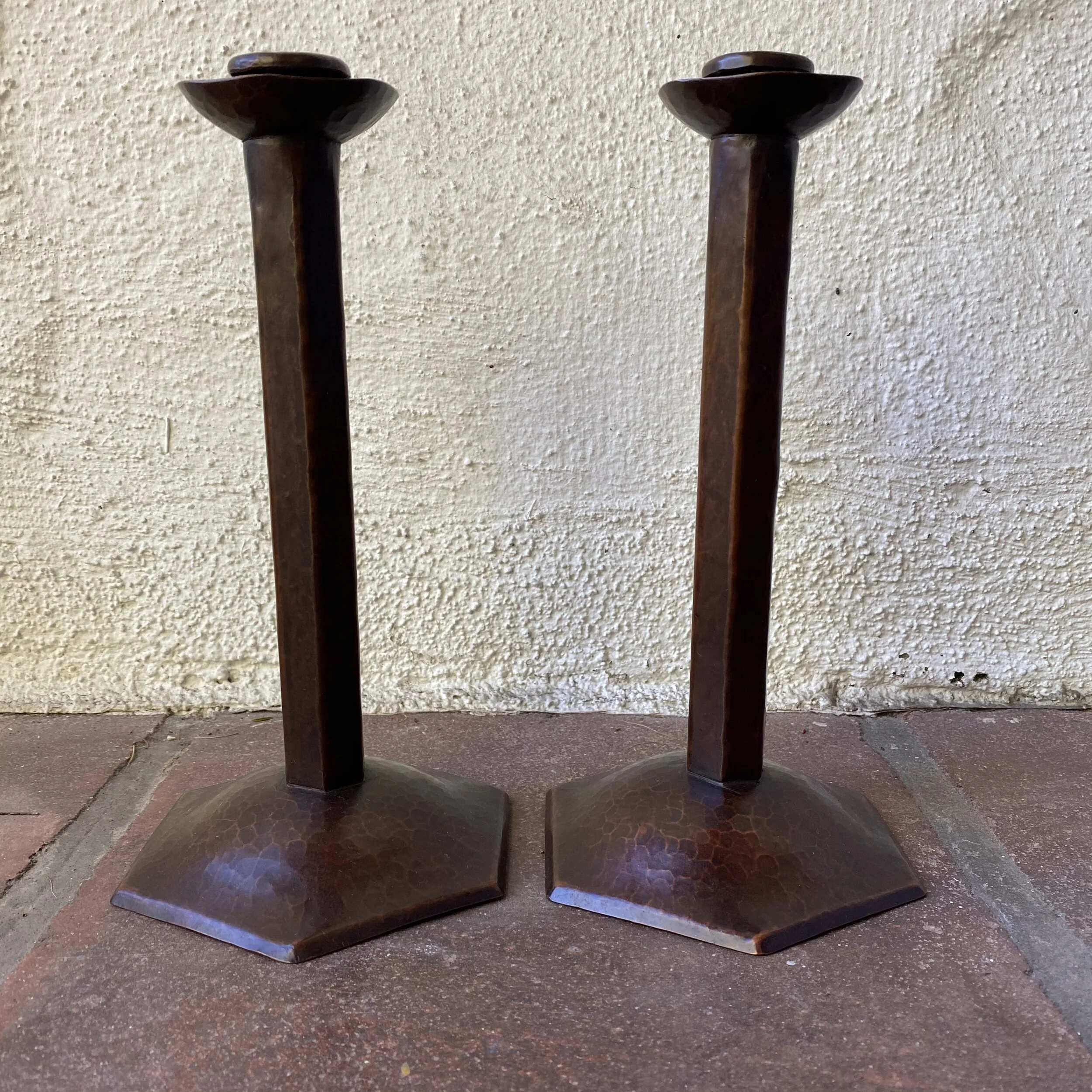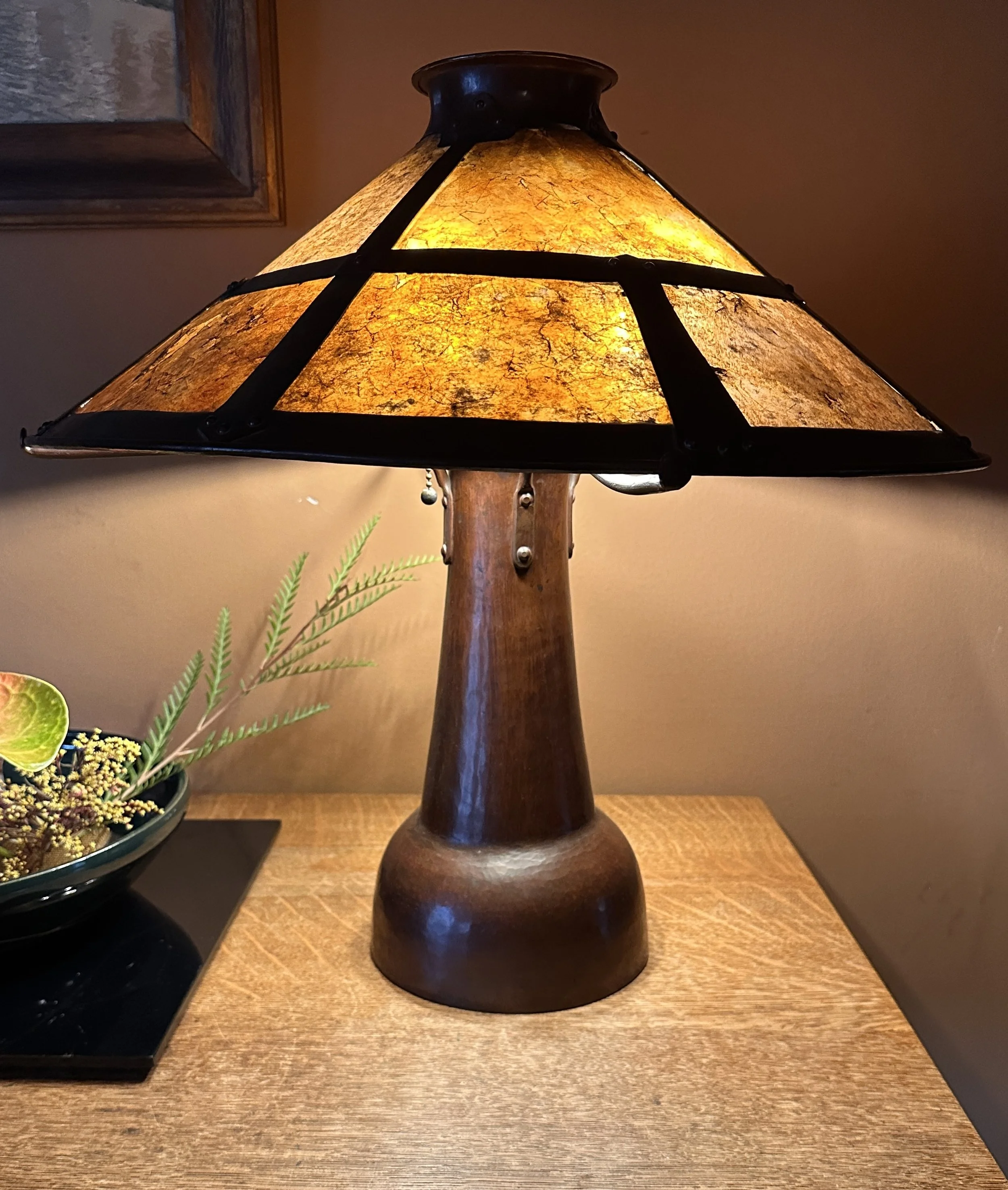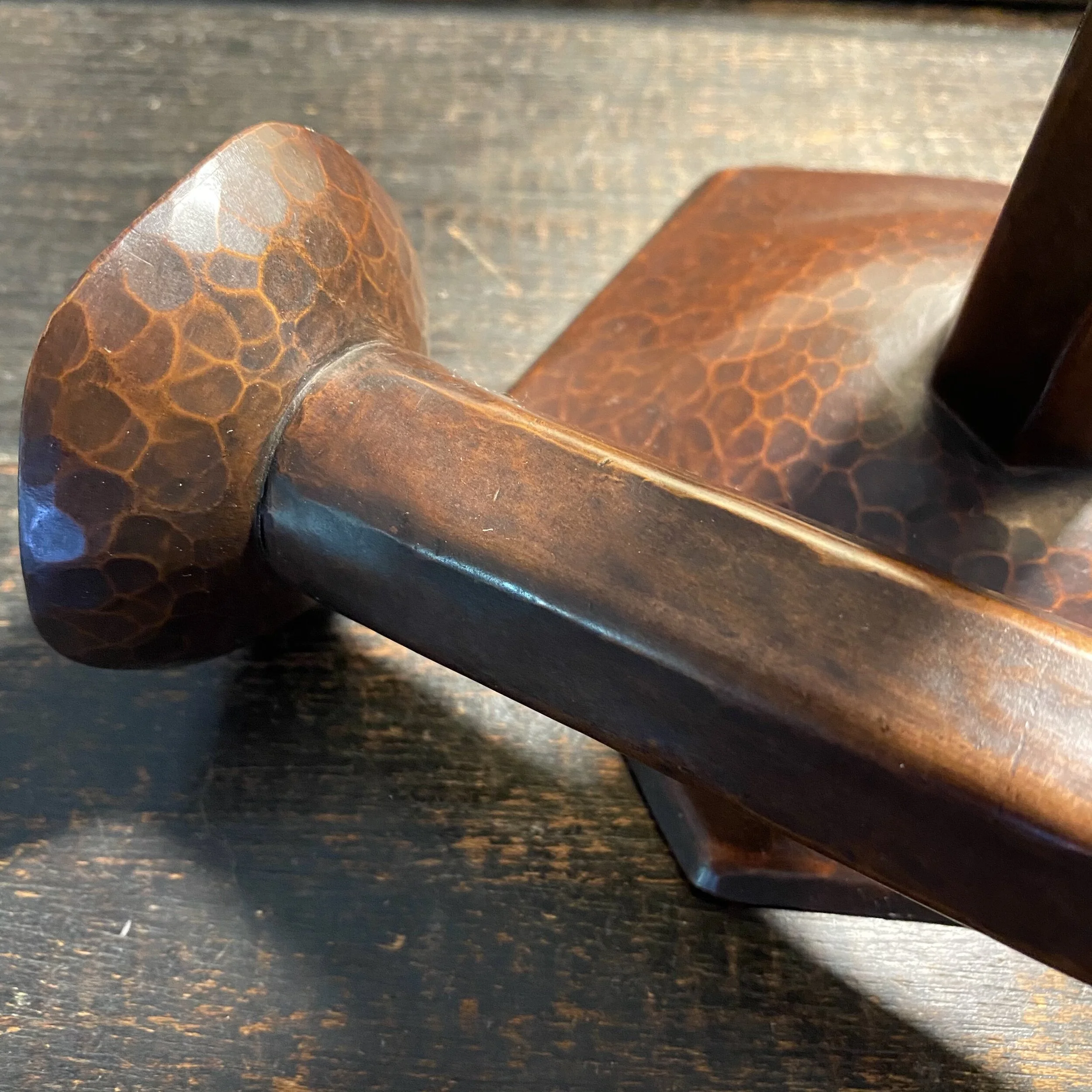 An immigrant from Holland who arrived in the United States in 1886, Dirk Van Erp opened his San Fransisco shop in 1908. He is best known for the exquisite hammered copper lamps with mica shades, yet also crafted vases, bowls, desk sets, candlesticks & much more.