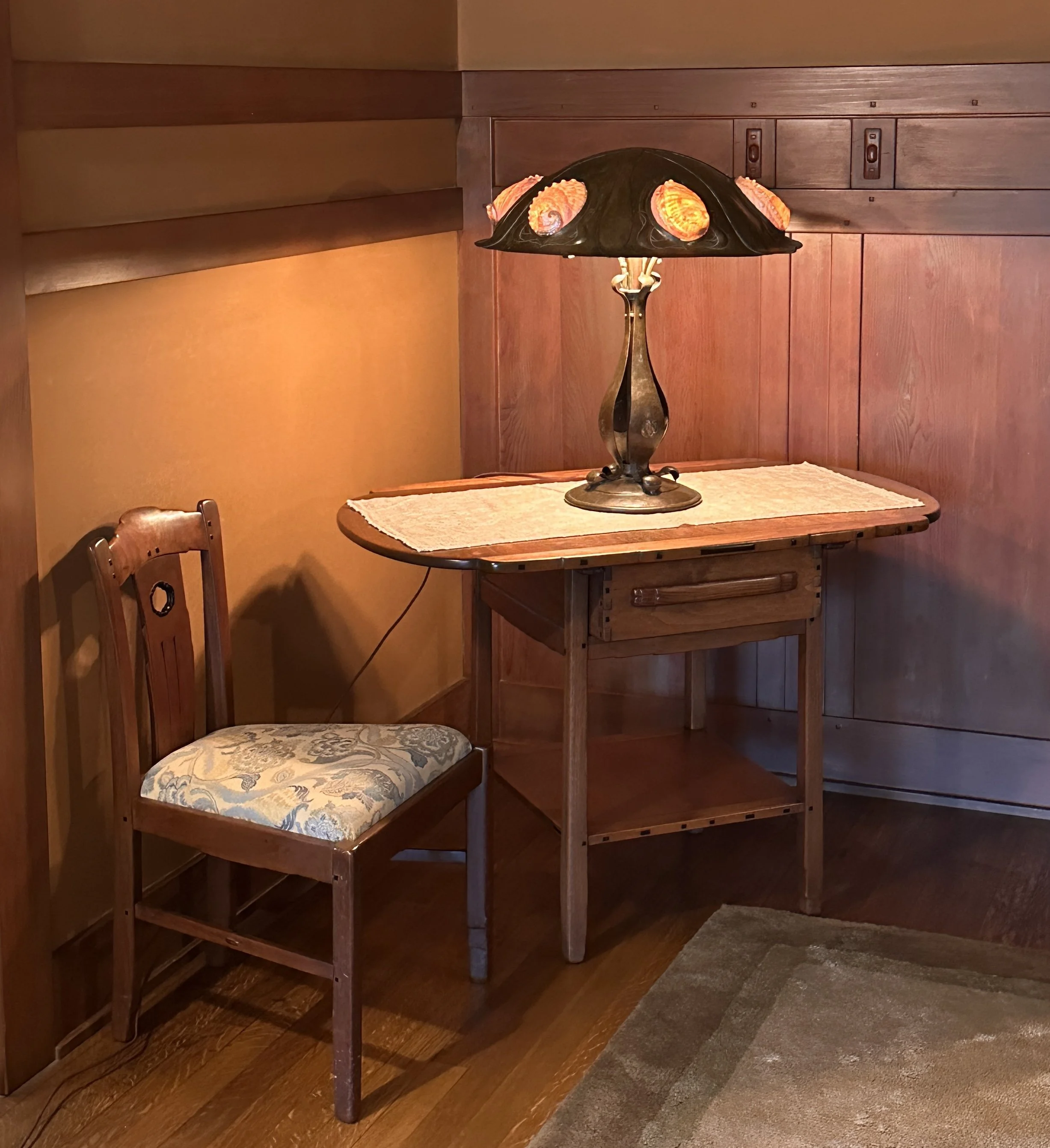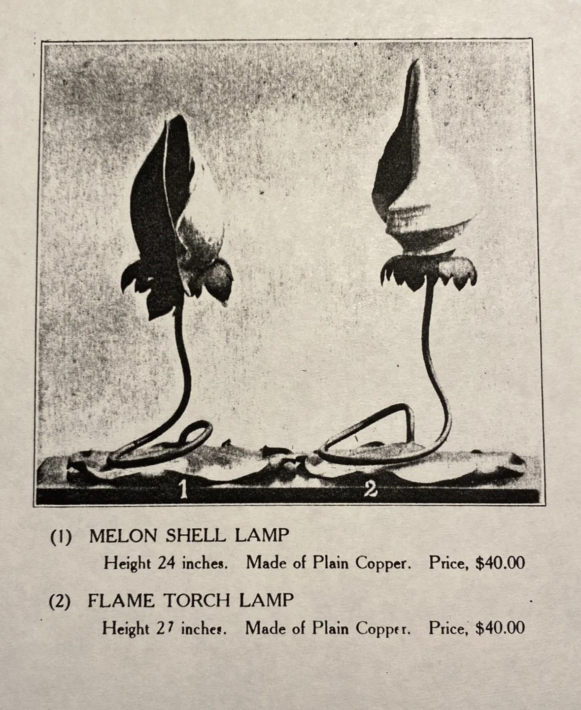 Elizabeth Eaton Burton was a prolific artist based in Santa Barbara California working from around 1895 through the 1920s. She is most well known for her hammered copper lamps set with sea shells but also created unique woodcuts, watercolors, bookbindings, tooled leather décor, screens and stained glass. Much of her work is unsigned yet can be easily identified by her craftsmanship & design elements. She is closely associated with her father, Charles Frederick Eaton.