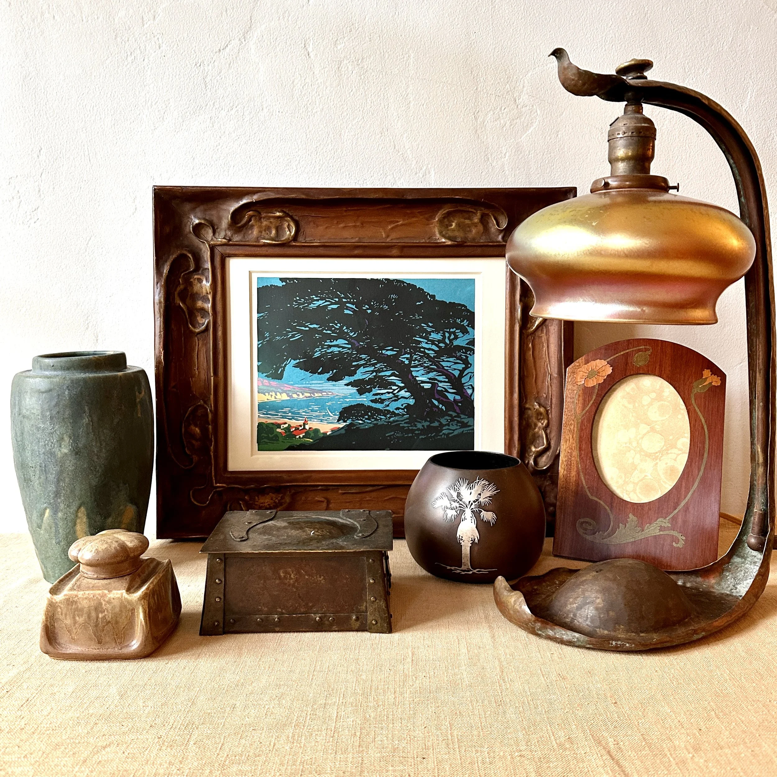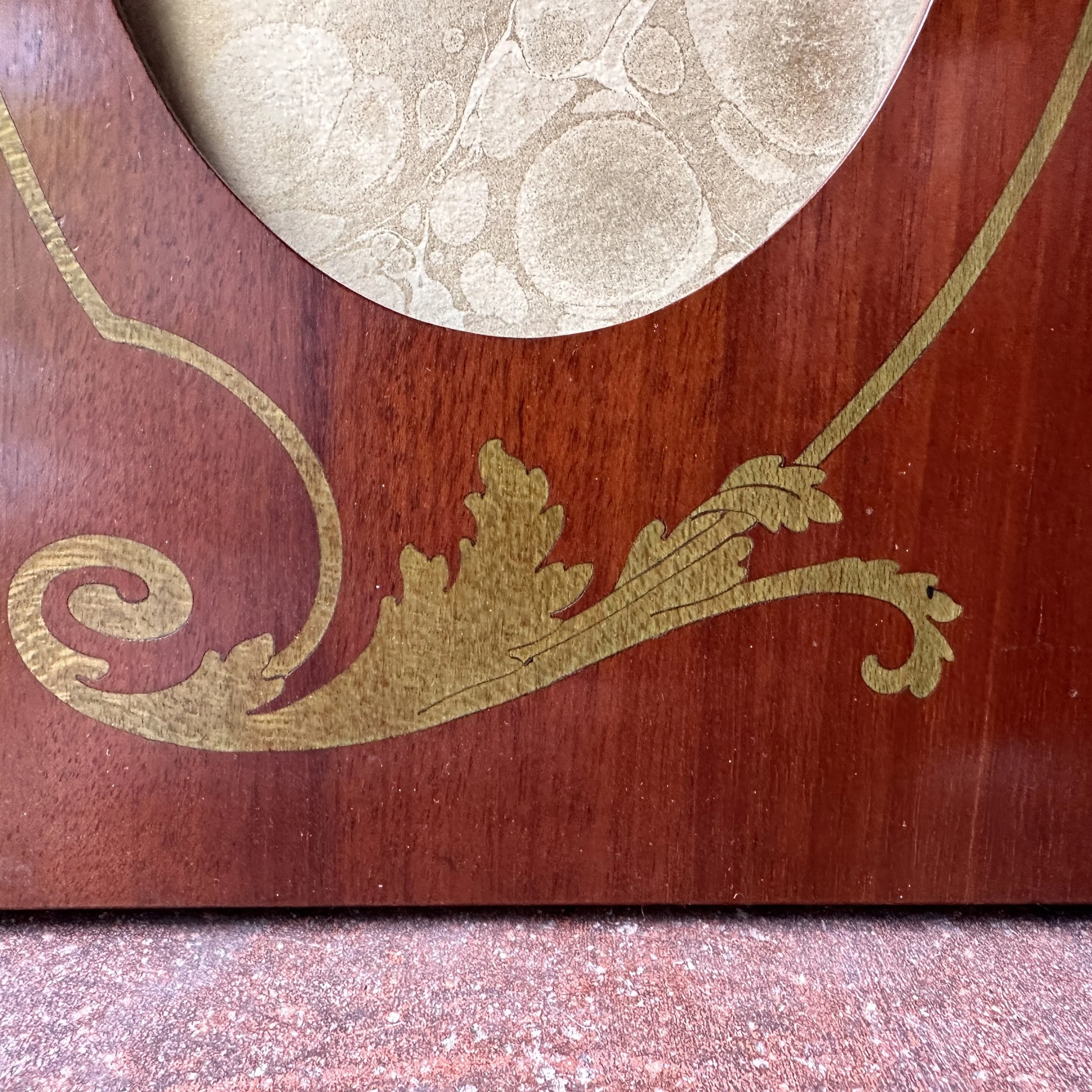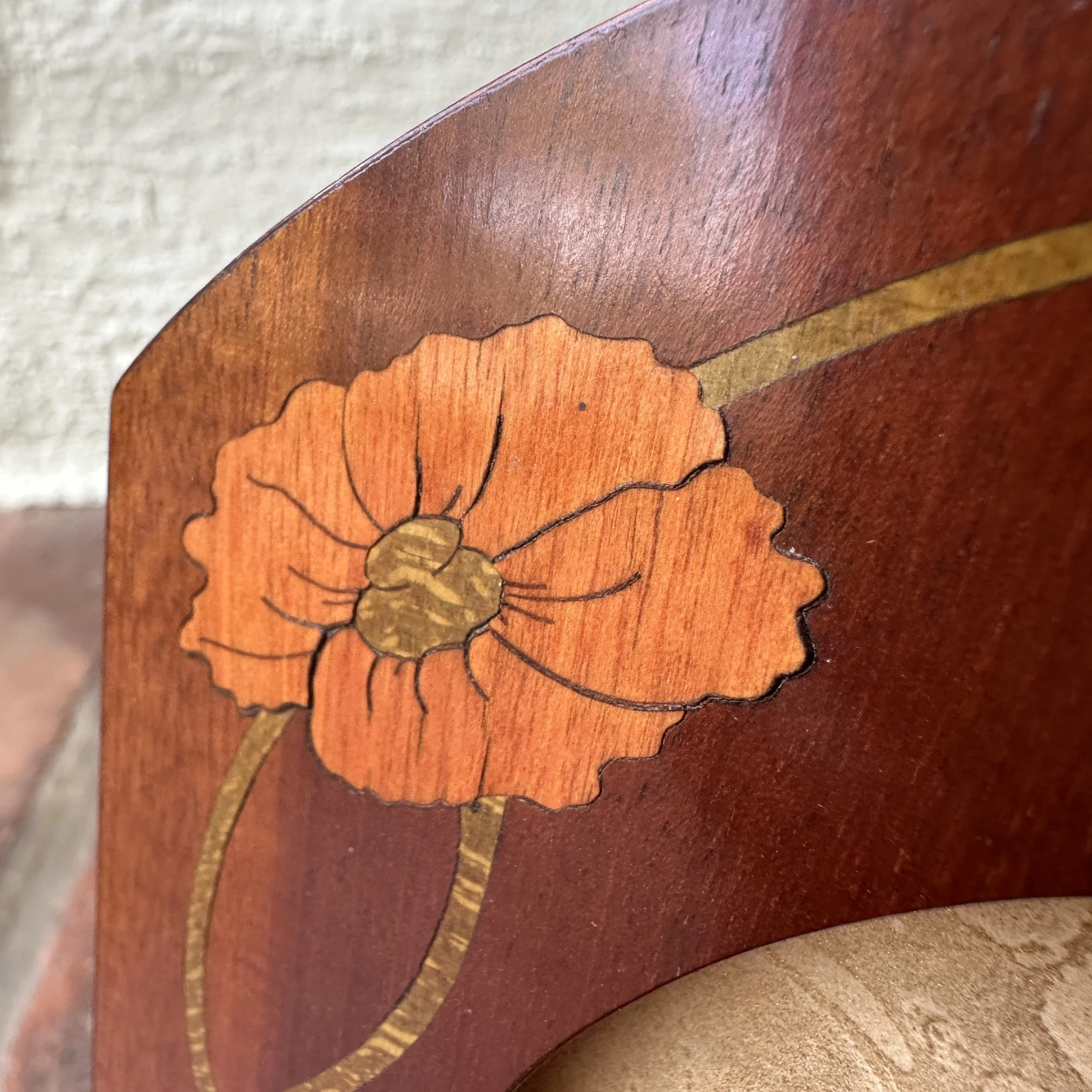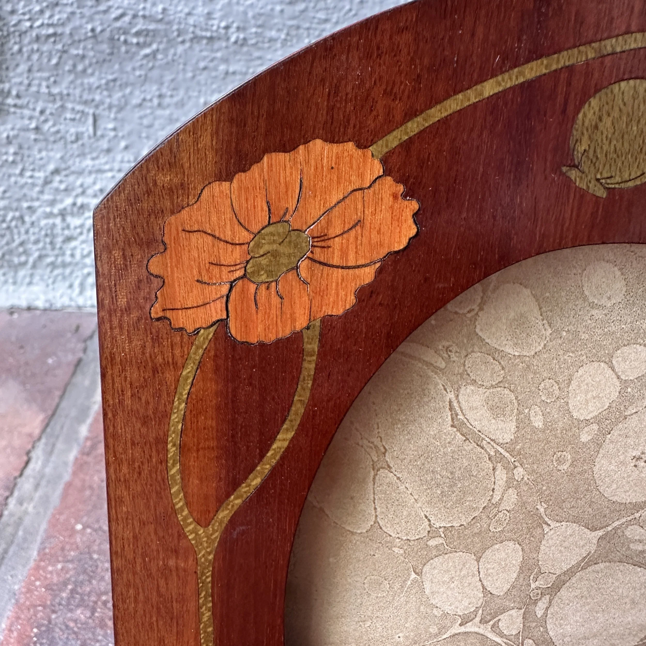 English Art Nouveau wood frame circa 1900. A fruitwood frame inlaid with flowing poppy designs. Excellent condition. Measures 9.5” tall and 6.25” wide, holds a 4x6 image. SOLD