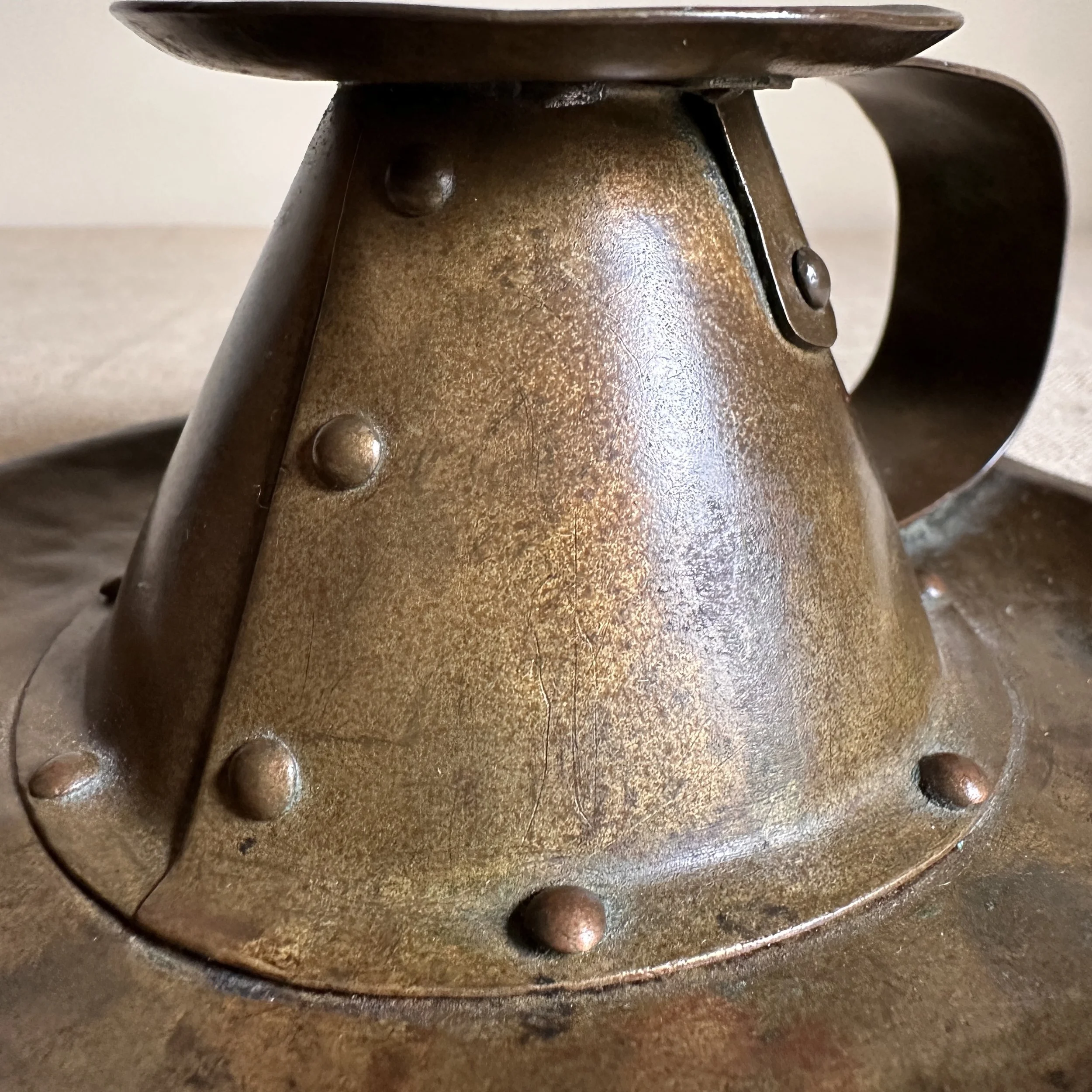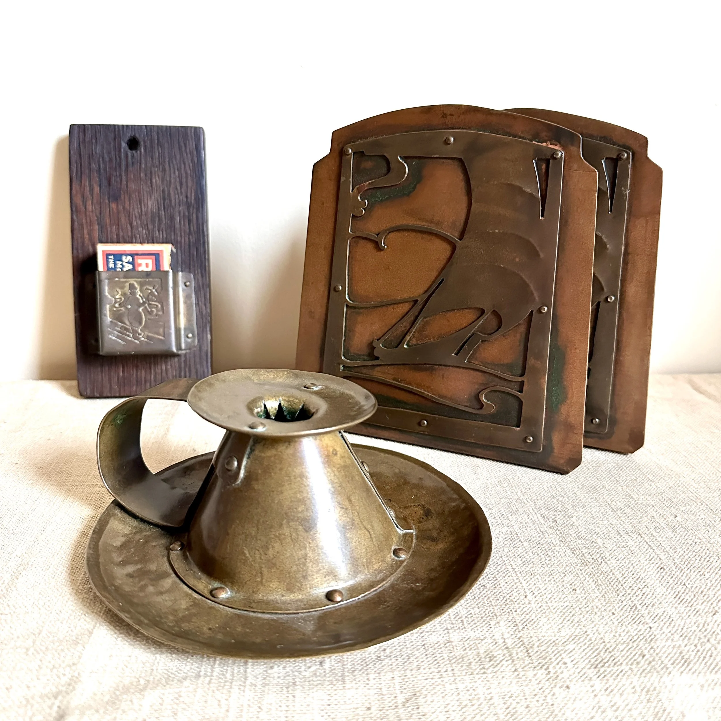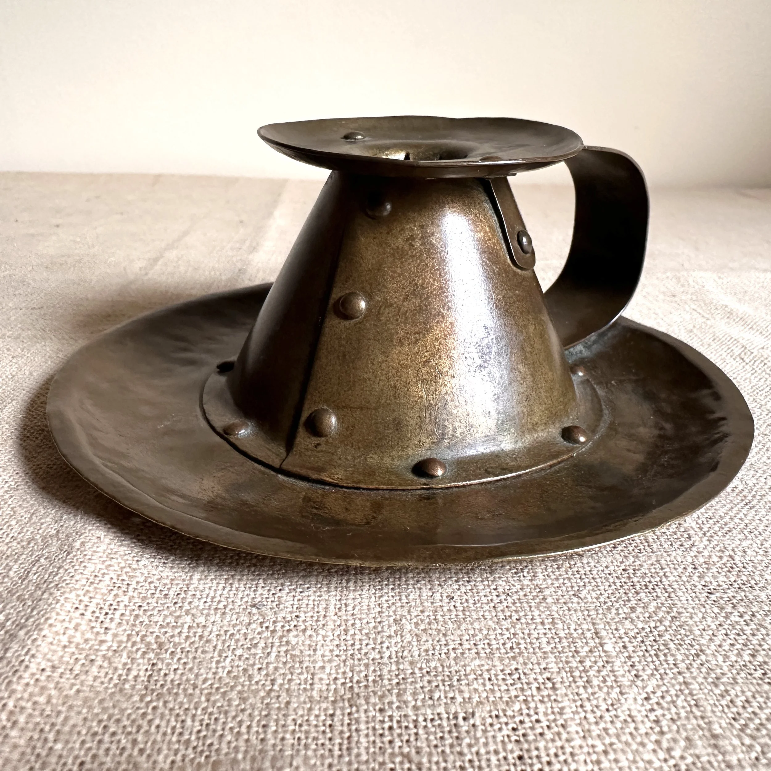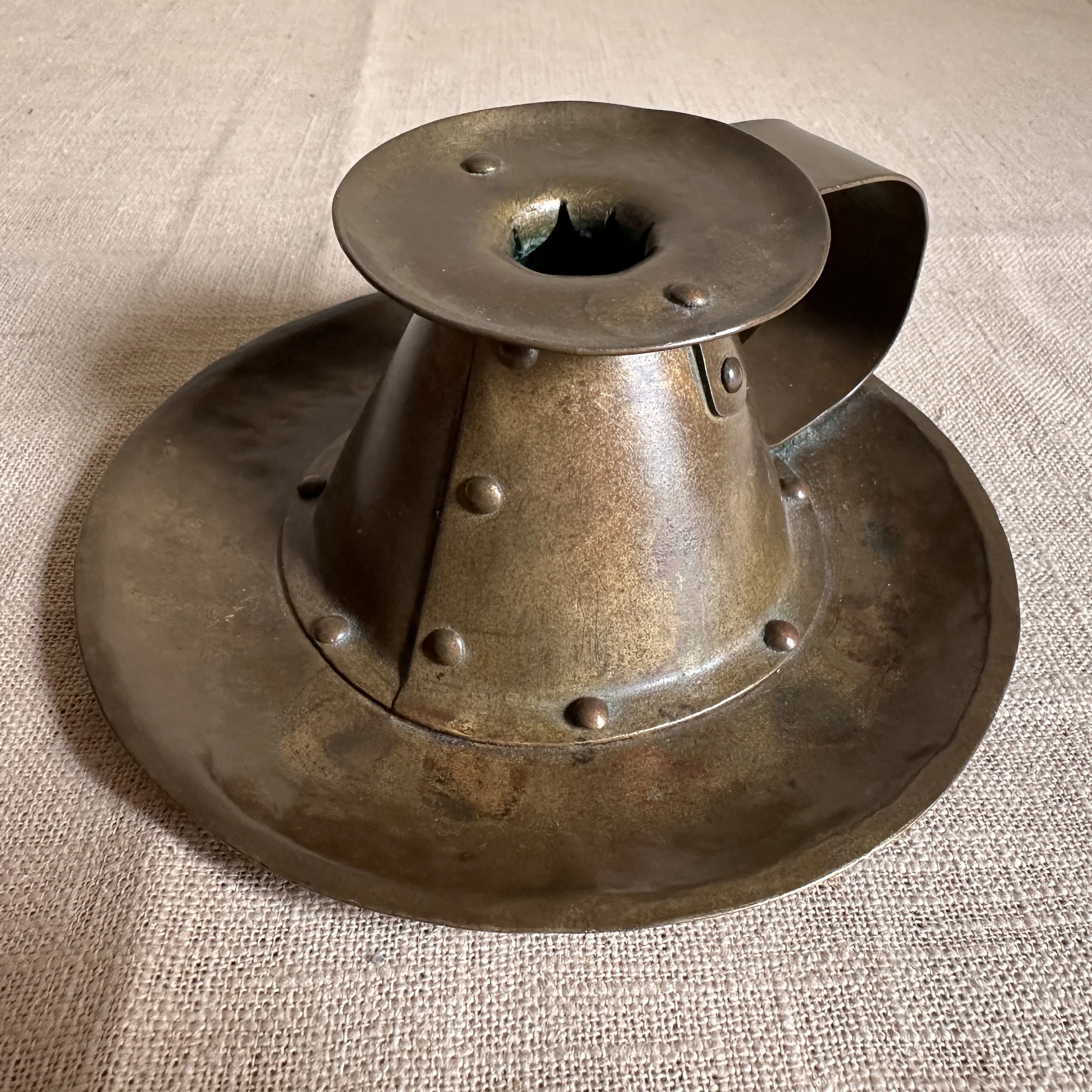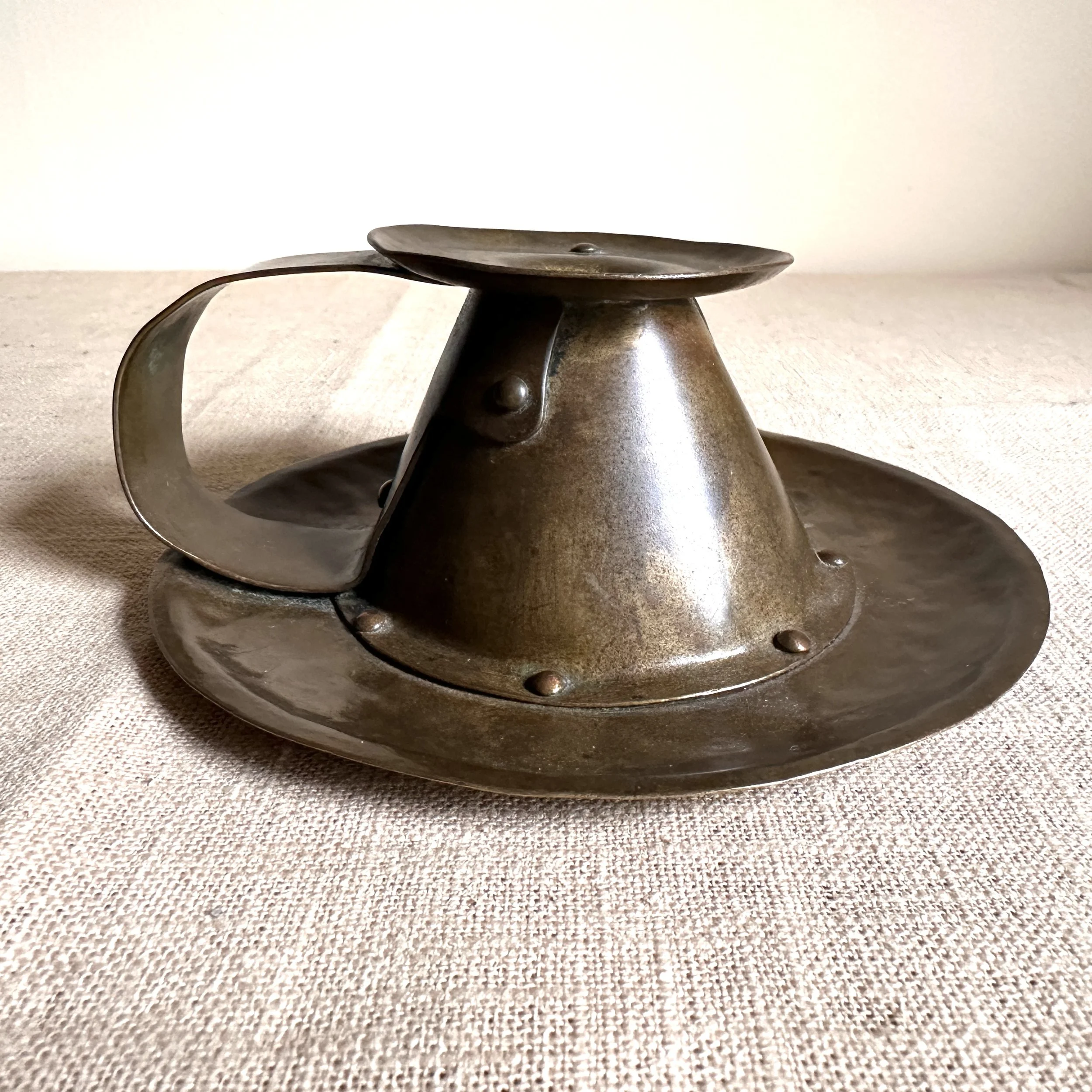 Forest Craft Guild chamberstick, Grand Rapids circa 1908. A hammered brass raised chamberstick with riveted and arched handle. Unsigned, but typical of the work from the Guild. Excellent condition and dark patina. Measures 5.75” wide and 2.5” tall. $275