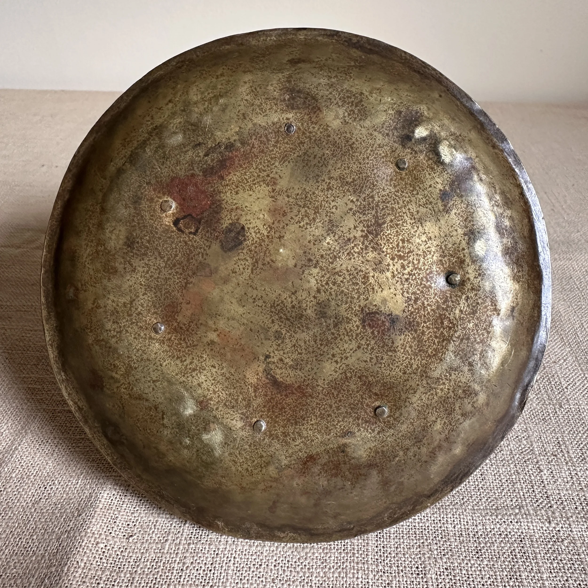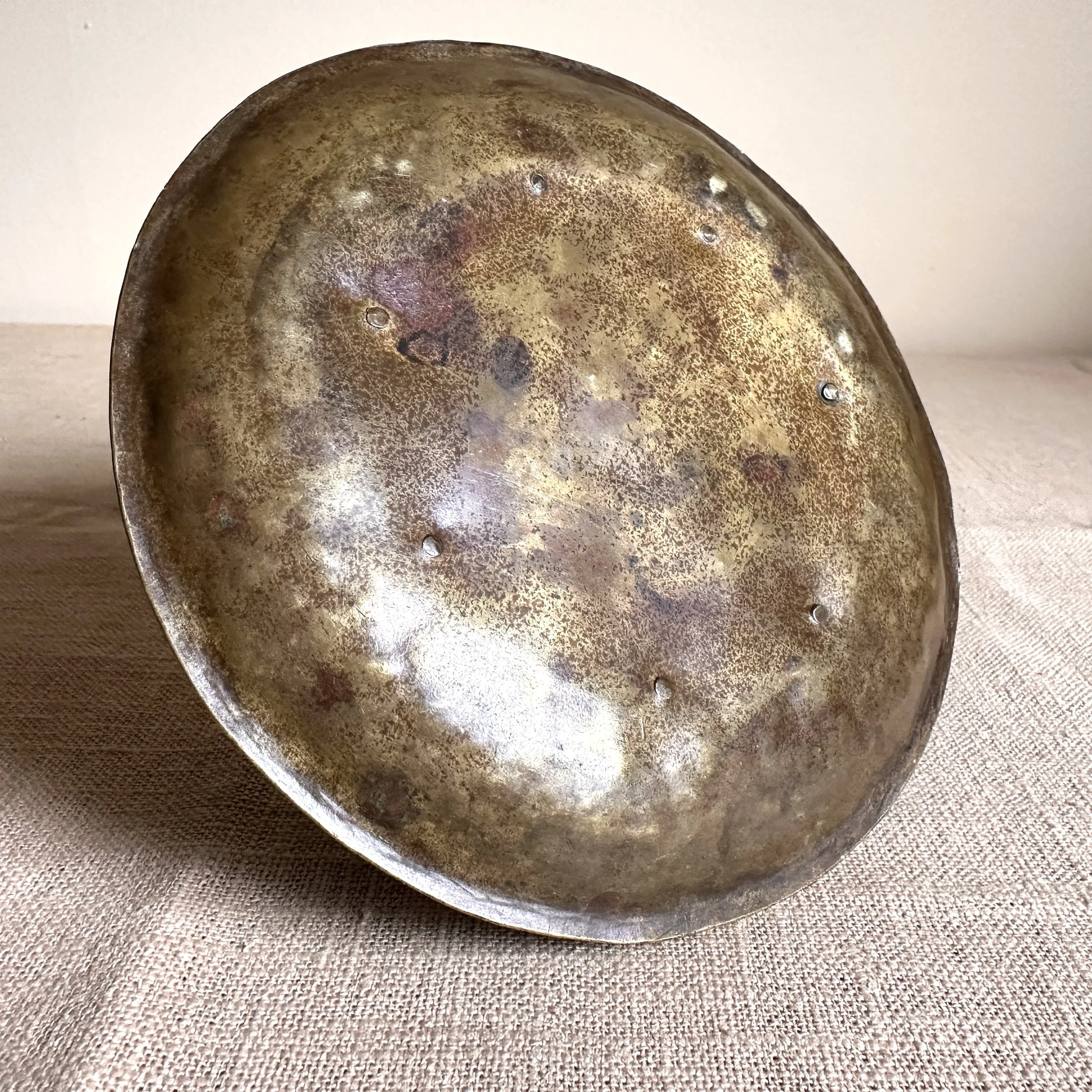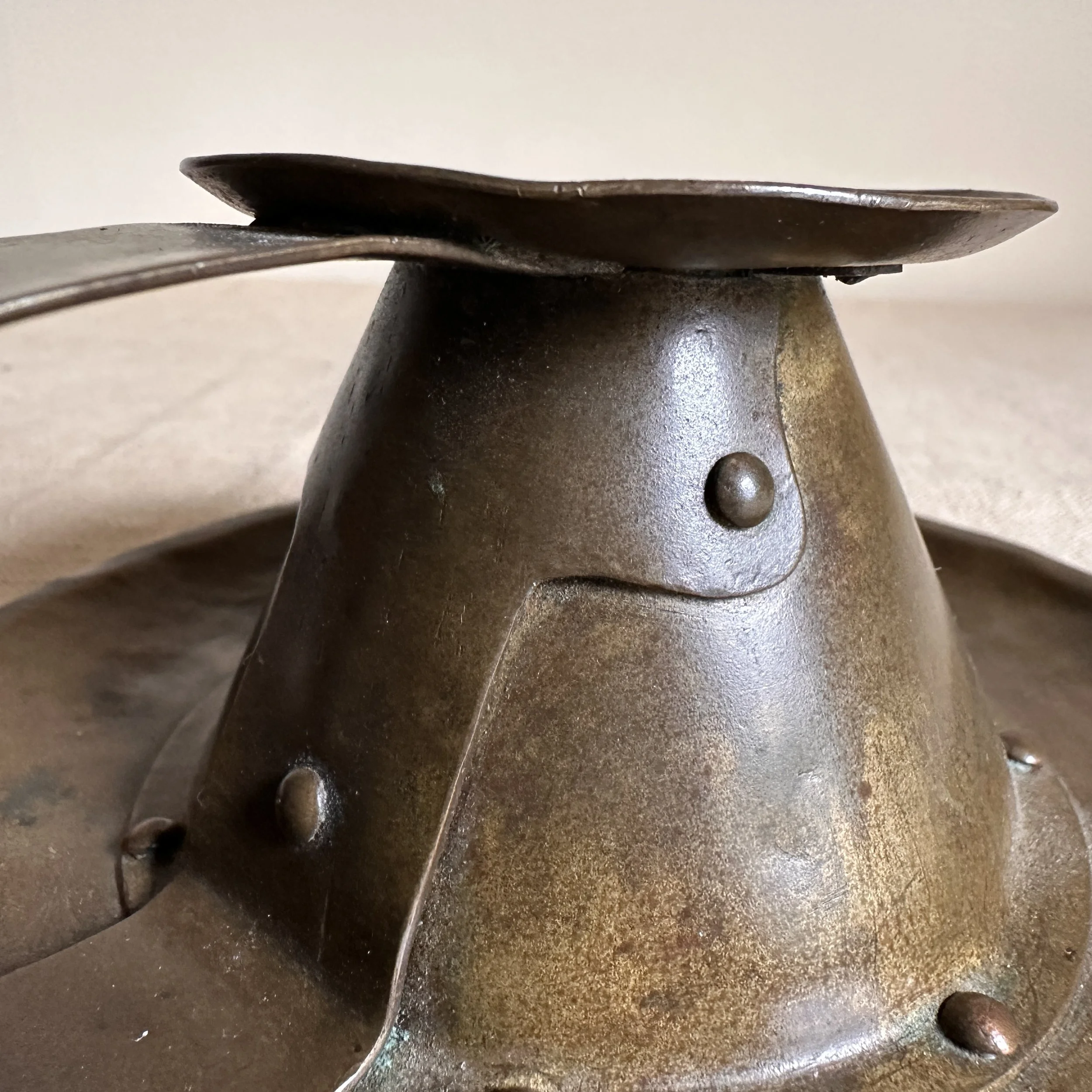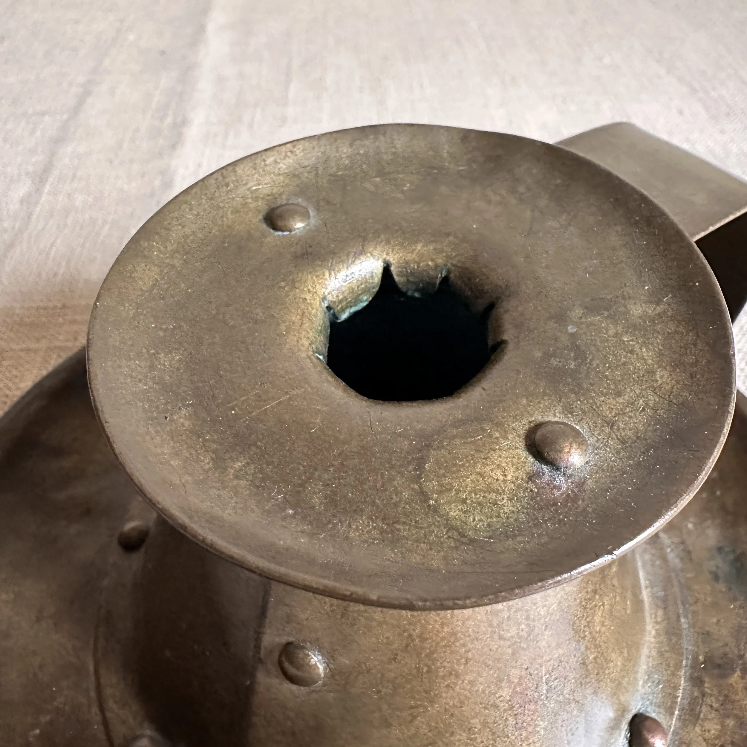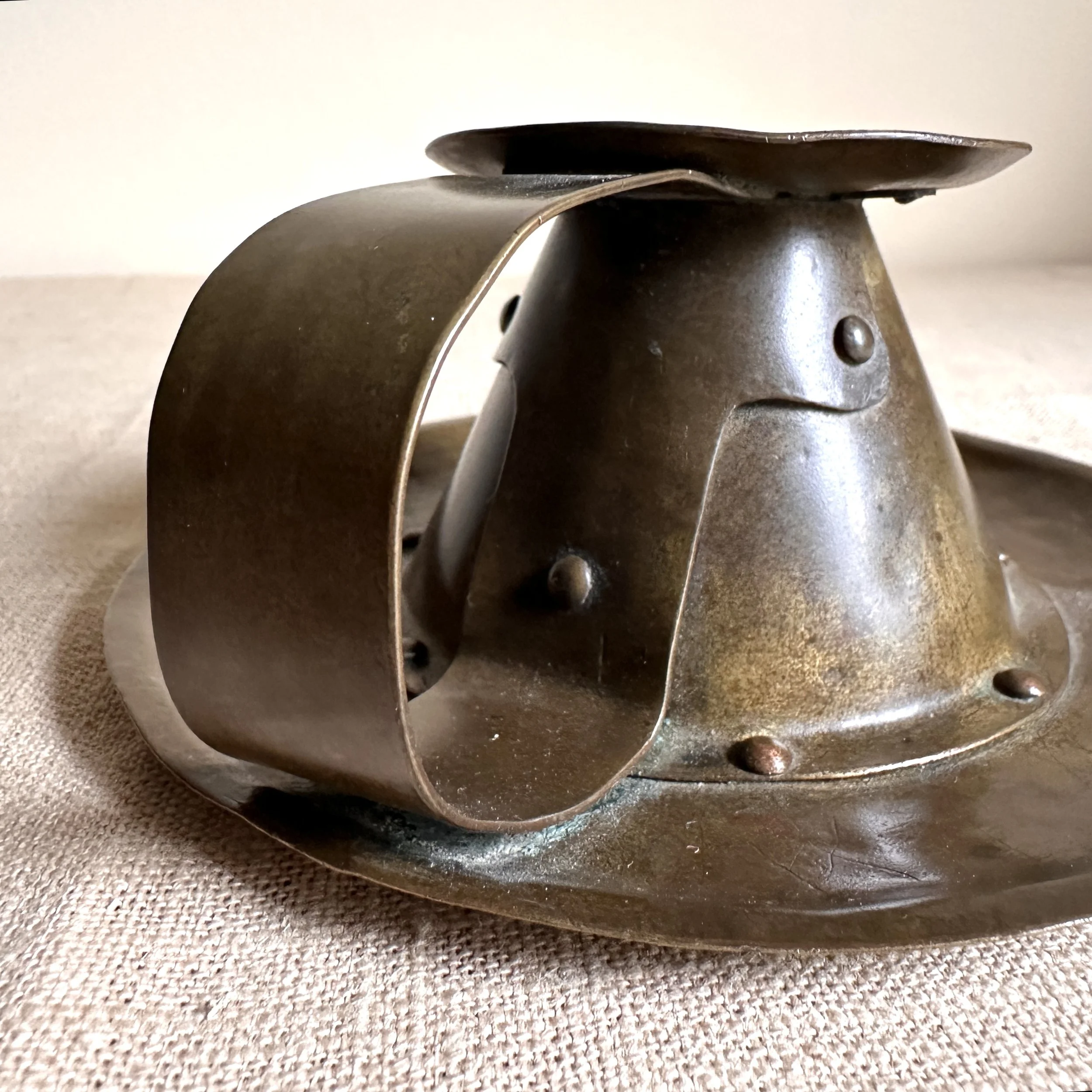 Forest Craft Guild chamberstick, Grand Rapids circa 1908. A hammered brass raised chamberstick with riveted and arched handle. Unsigned, but typical of the work from the Guild. Excellent condition and dark patina. Measures 5.75” wide and 2.5” tall. $275