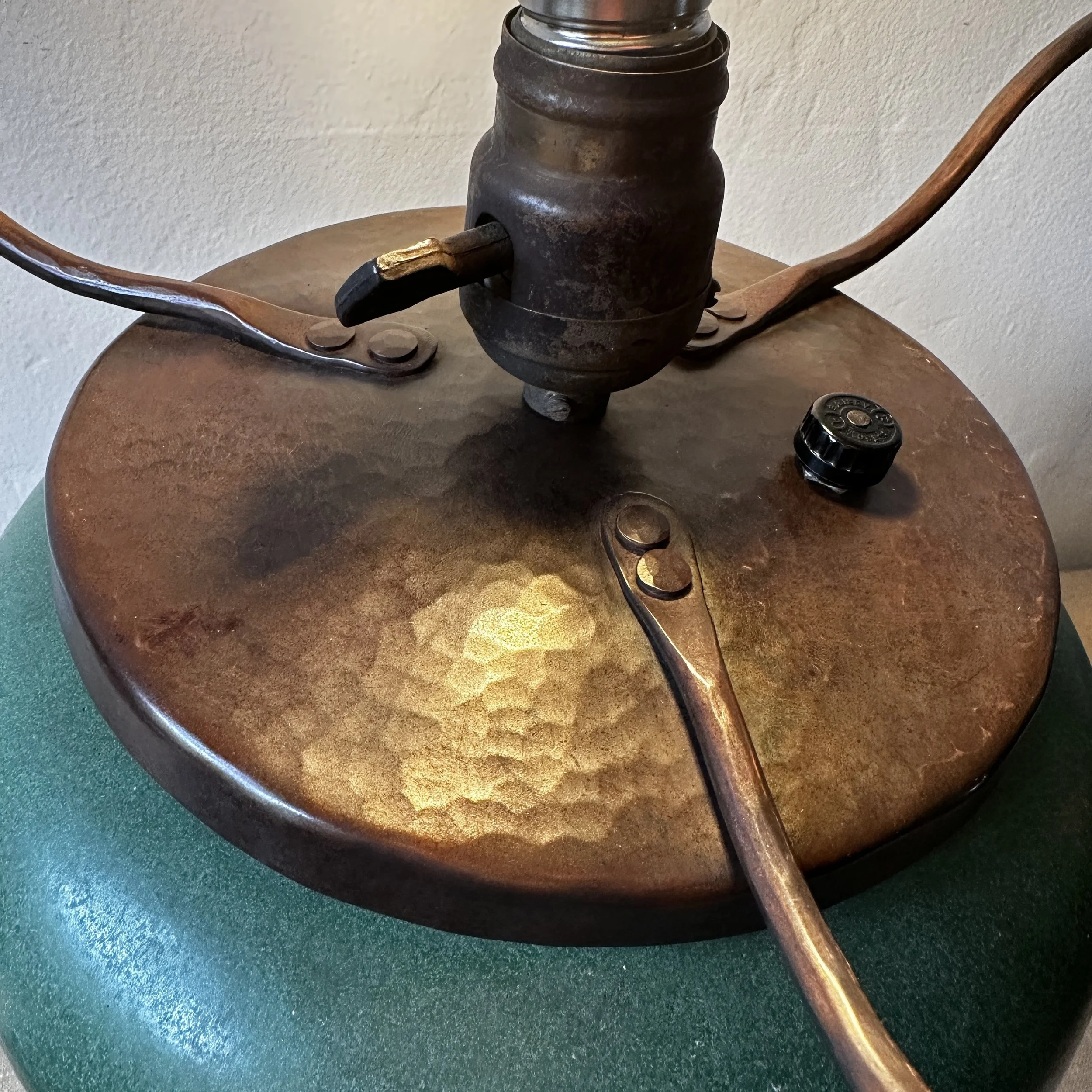 Forest Craft Guild / Grand Rapids School of Applied Arts large table lamp, Grand Rapids MI circa 1907. Attributed to the work taught and crafted by Forest Emerson Mann, founder of the Forest Craft Guild, who prior to its founding was the director of the Grand Rapids School of Applied Arts. In a 1907 article in Home Needlework Magazine, Mann wrote about these copper lamp shades with reticulated designs paired with Ohio pottery bases (see images). This shade has masterful hand cut work in the design of stylized pinecones and needles, six individual panels riveted together with a unique peaked pyramid shape, similar to one illustrated in a FCG ad from 1911. The shade lined in mica rests on three hammered copper arms extending from a hammered copper cap which wraps around the rim of this large mat green base. Single socket with a bakelite turn switch mounted in the copper. The large pot is in excellent condition and mounted from below on a wood riser. A rare & unique period lamp. Measures 23” tall, shade is 16” wide & 10” tall, base is 10” wide in center. SOLD