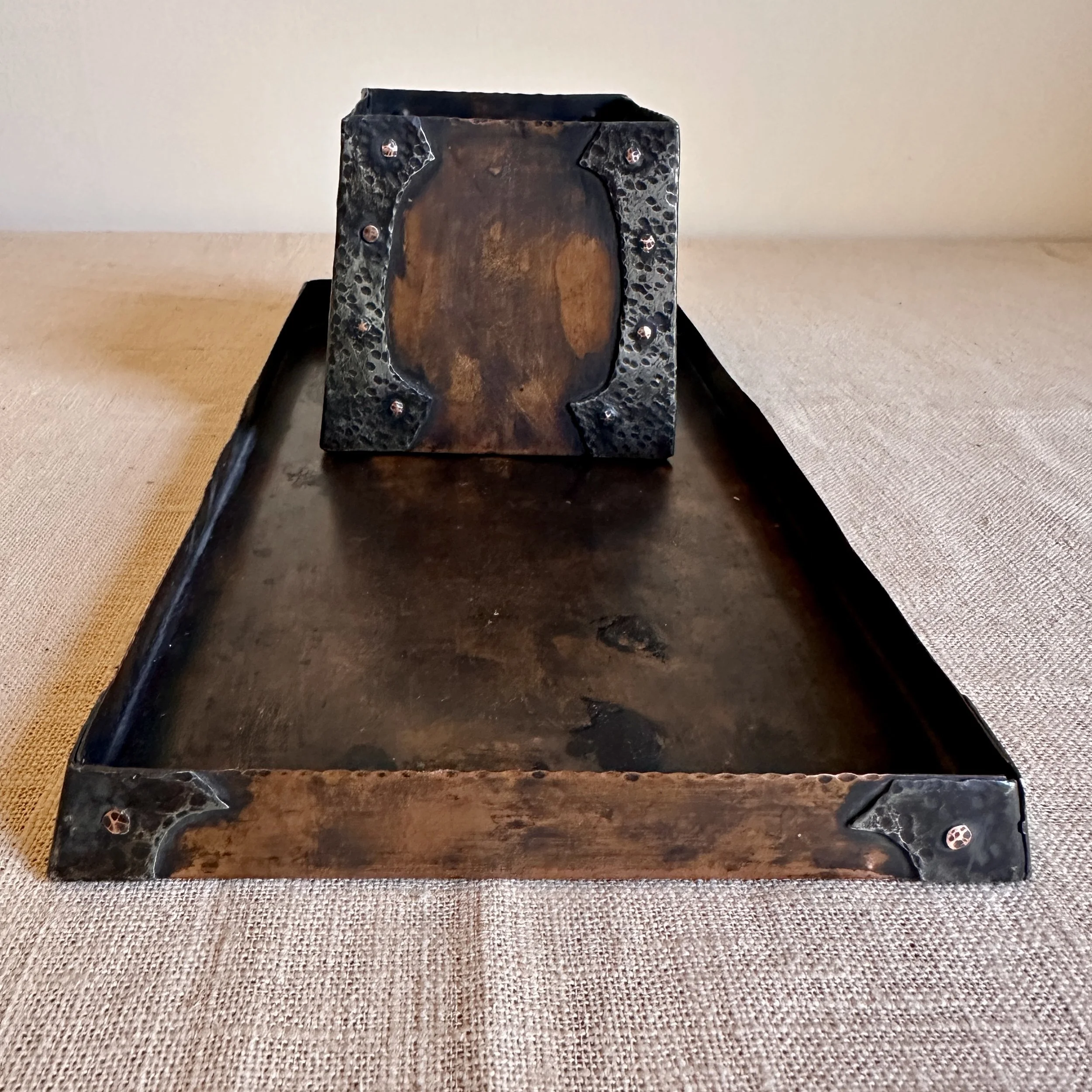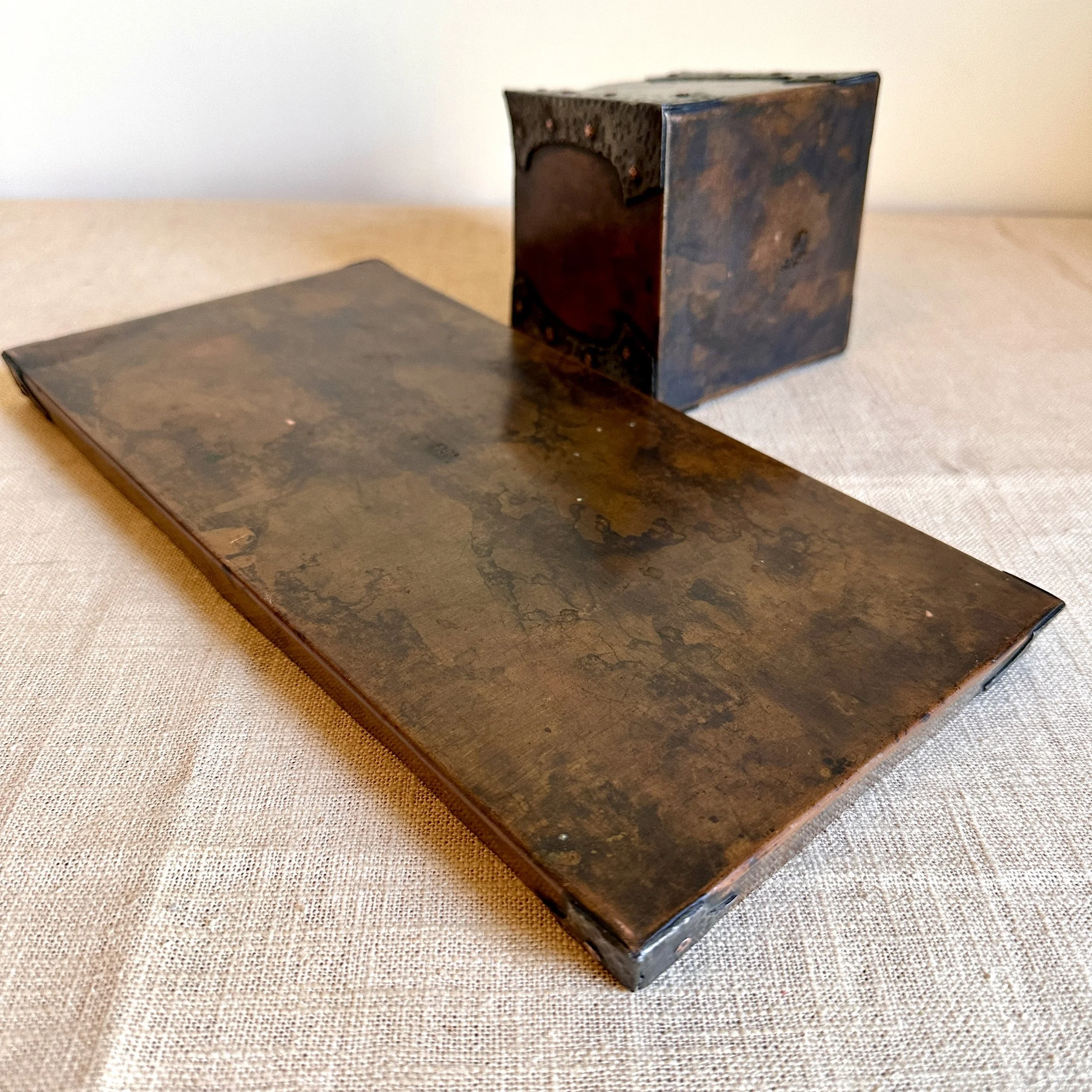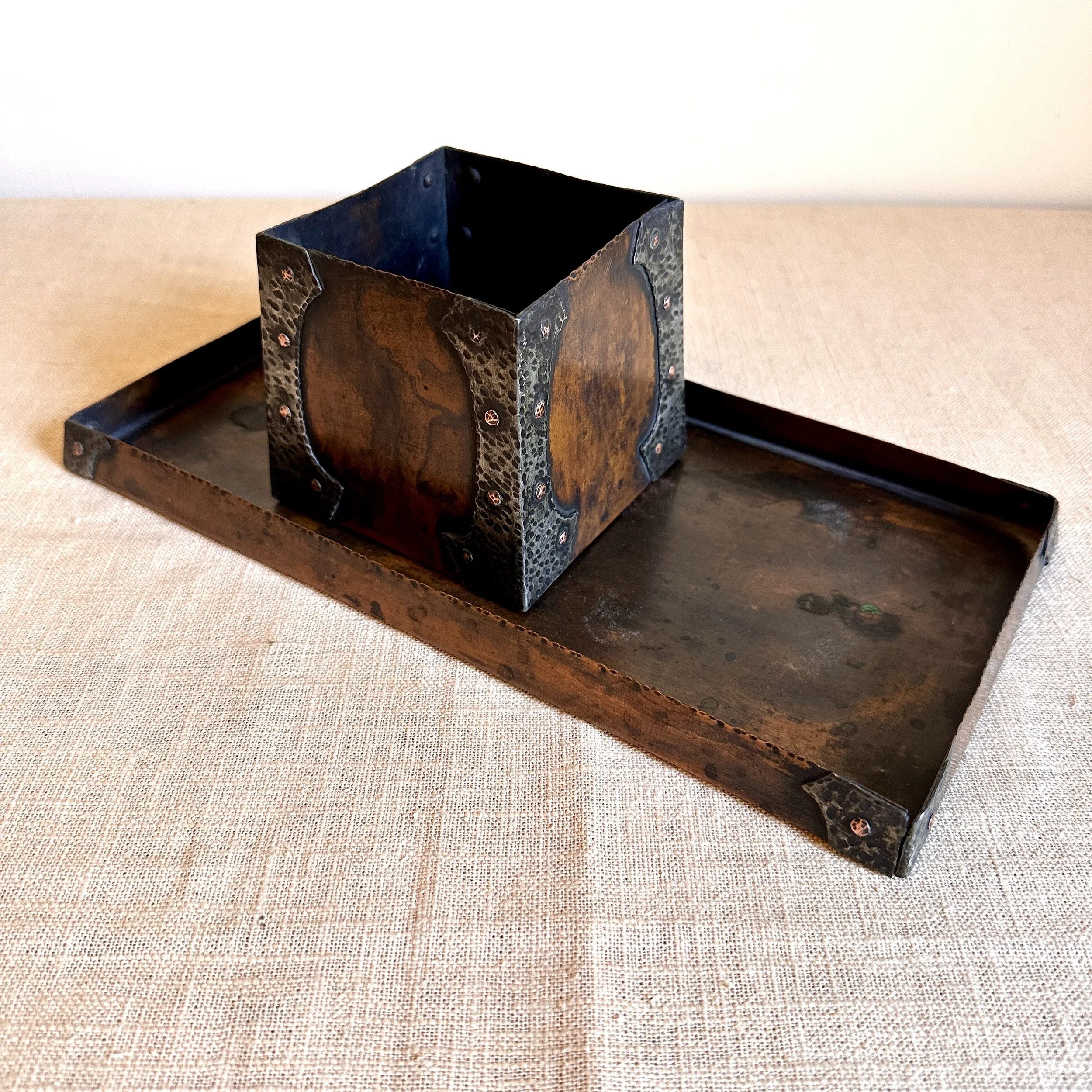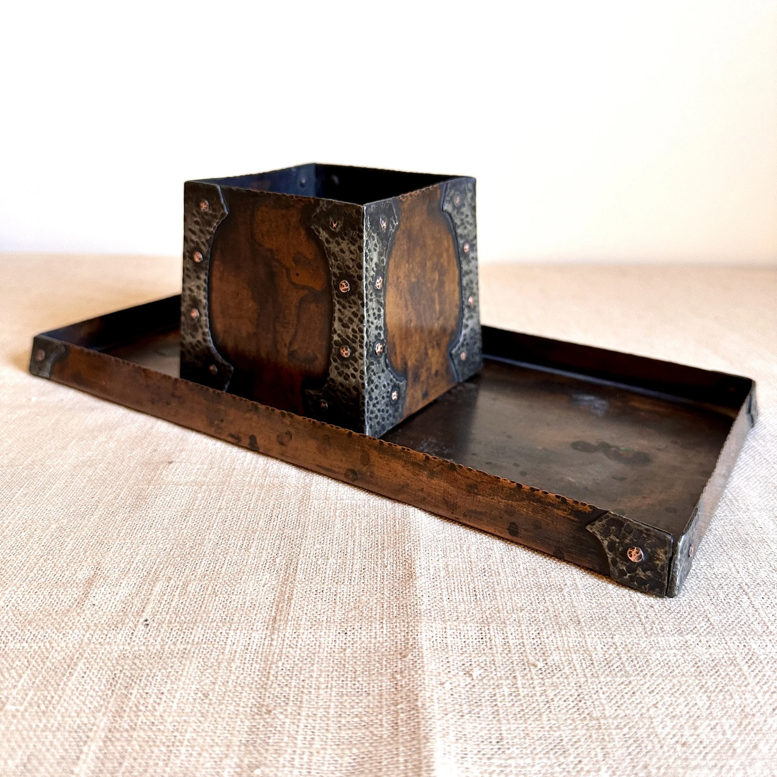 Forest Craft Guild desk items, Grand Rapids MI circa 1906. A hammered copper tray and container box, the corners finished with riveted hammered german silver. Original patina, large tray signed on bottom. Tray measures 11” by 6” and box is 3.75” by 3.5” tall. $600