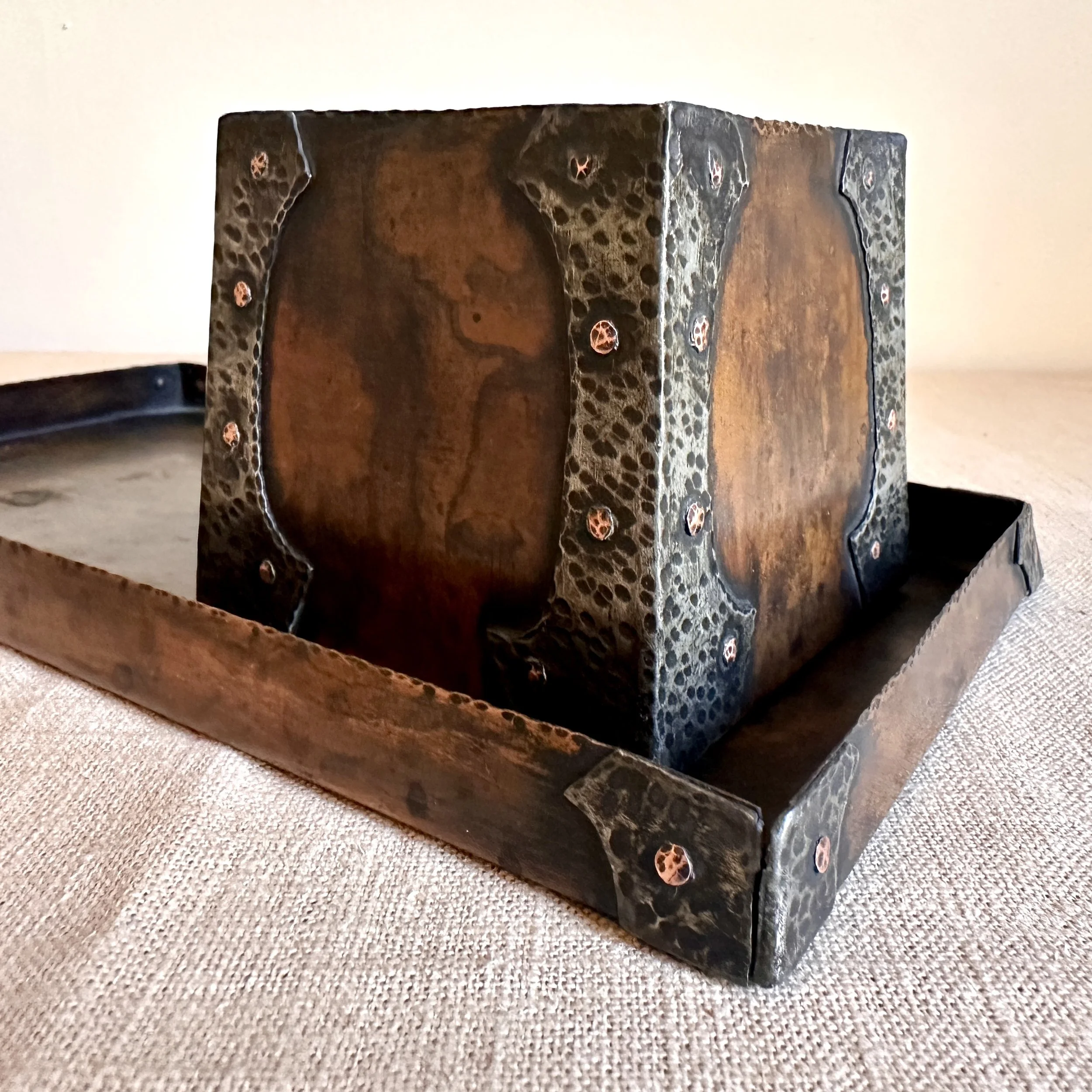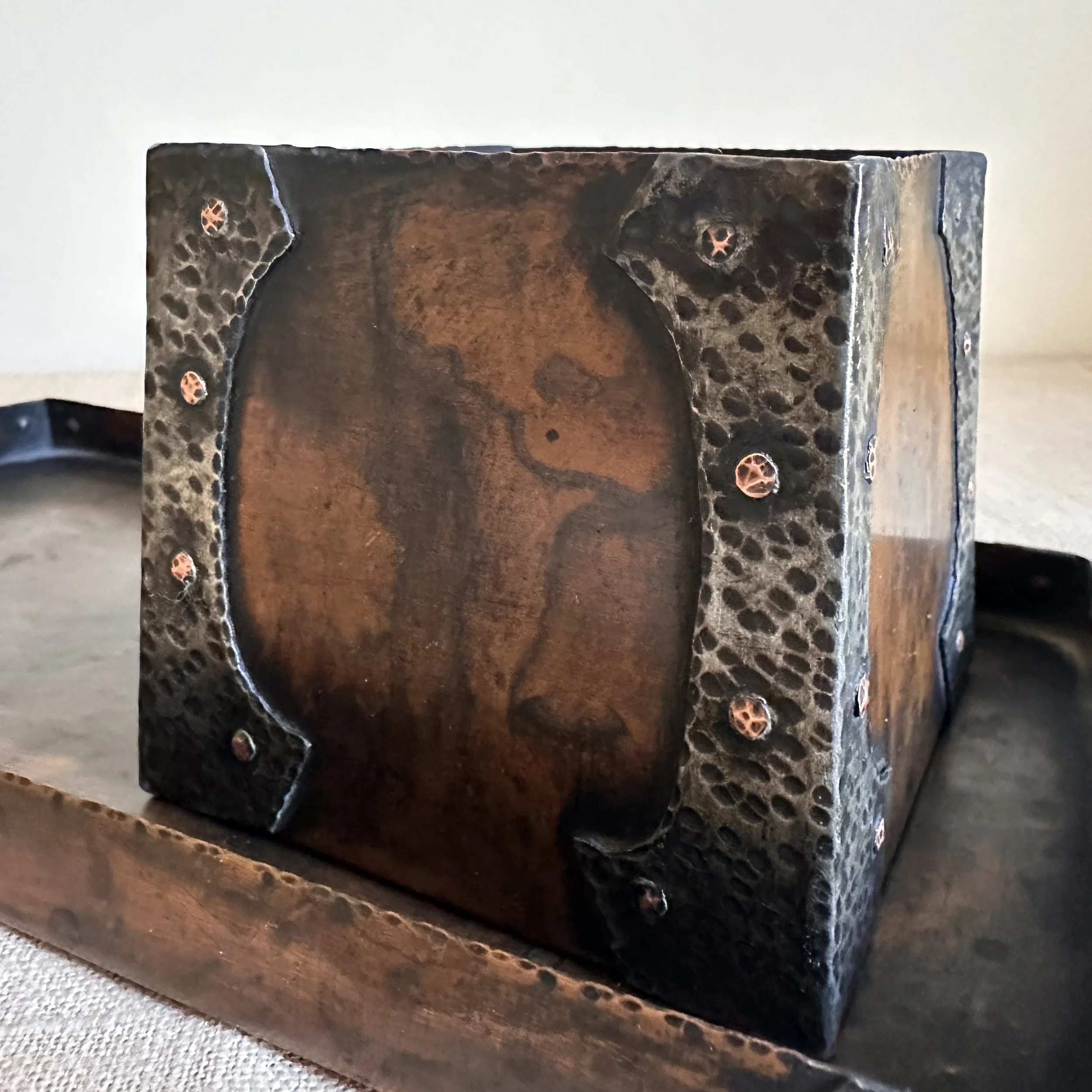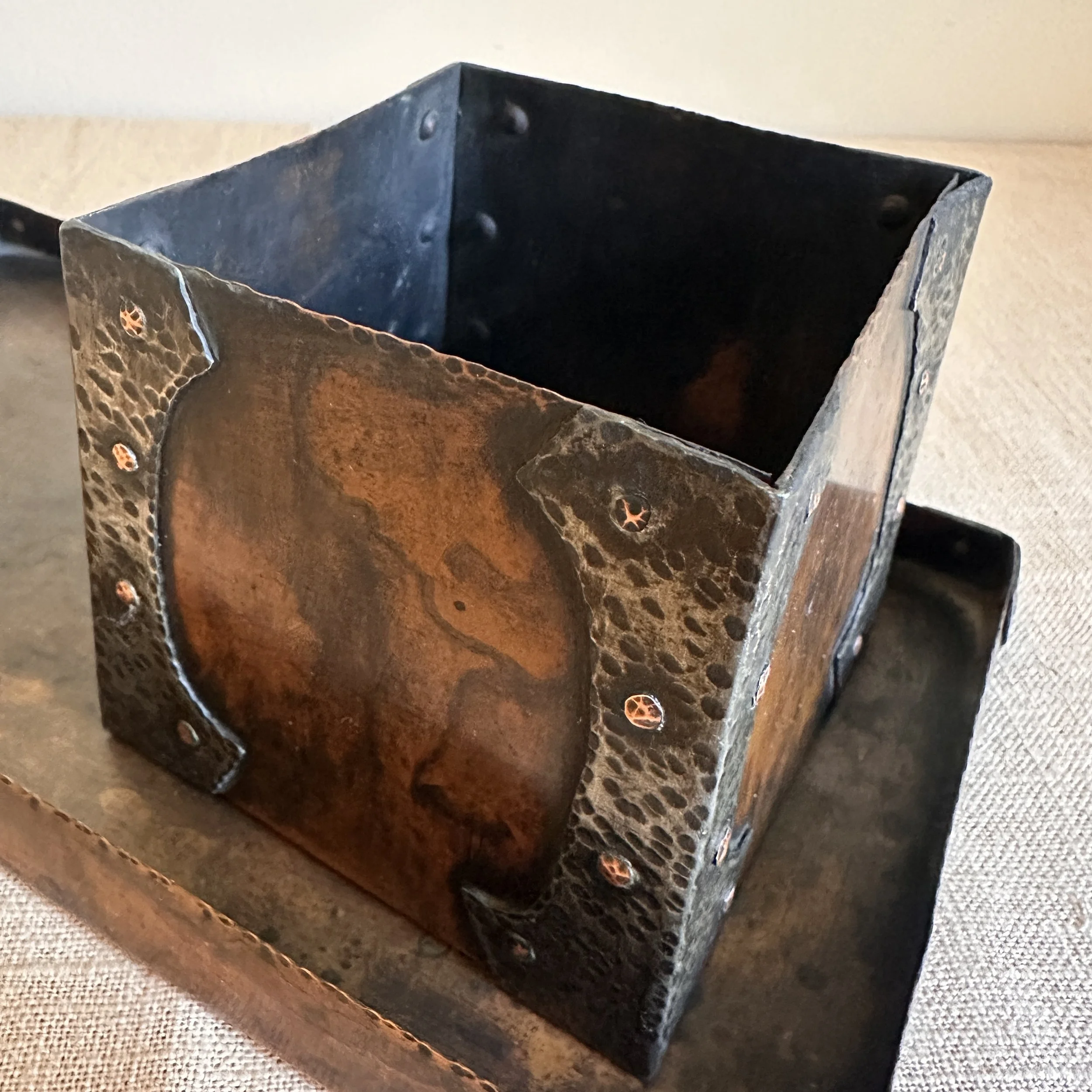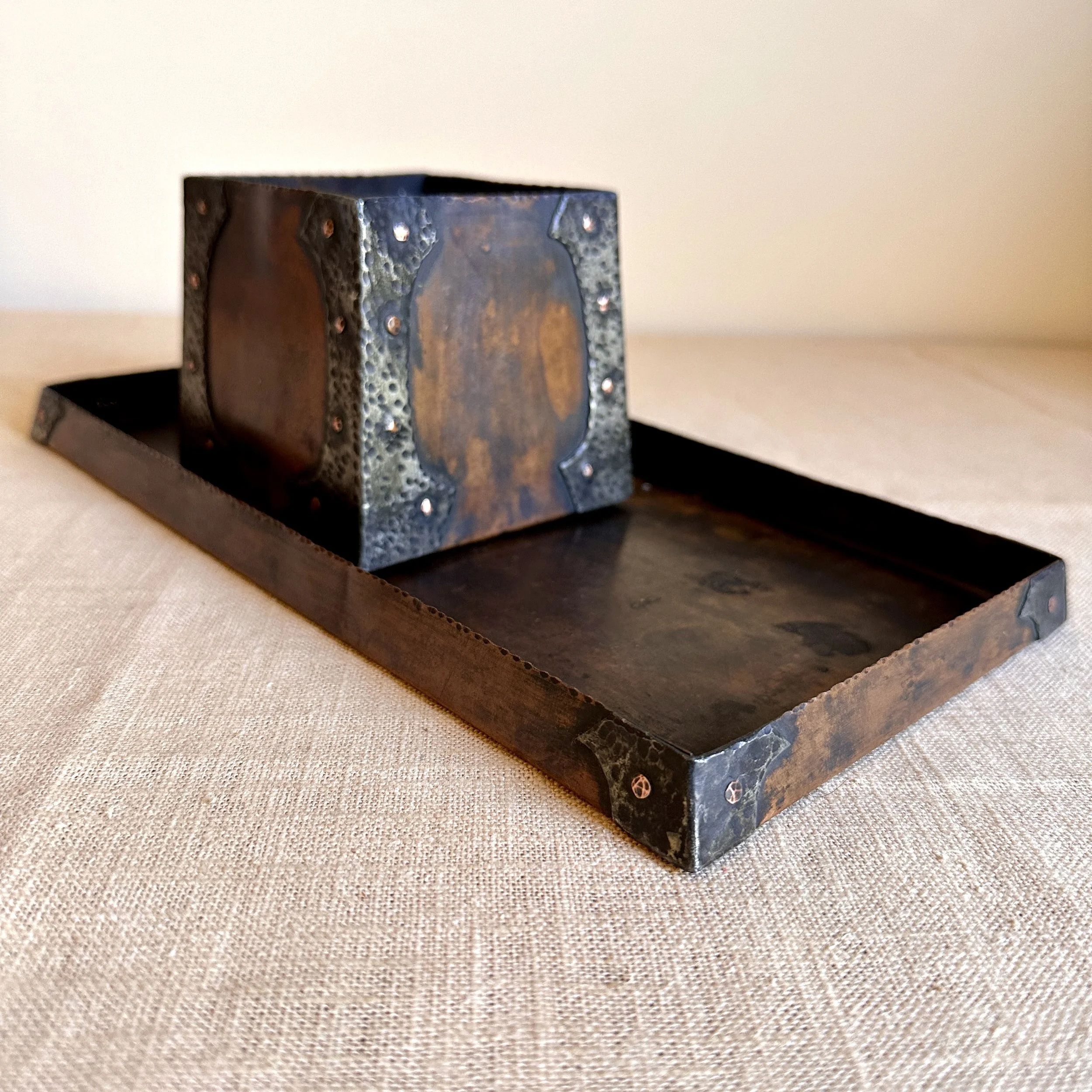 Forest Craft Guild desk items, Grand Rapids MI circa 1906. A hammered copper tray and container box, the corners finished with riveted hammered german silver. Original patina, large tray signed on bottom. Tray measures 11” by 6” and box is 3.75” by 3.5” tall. $600