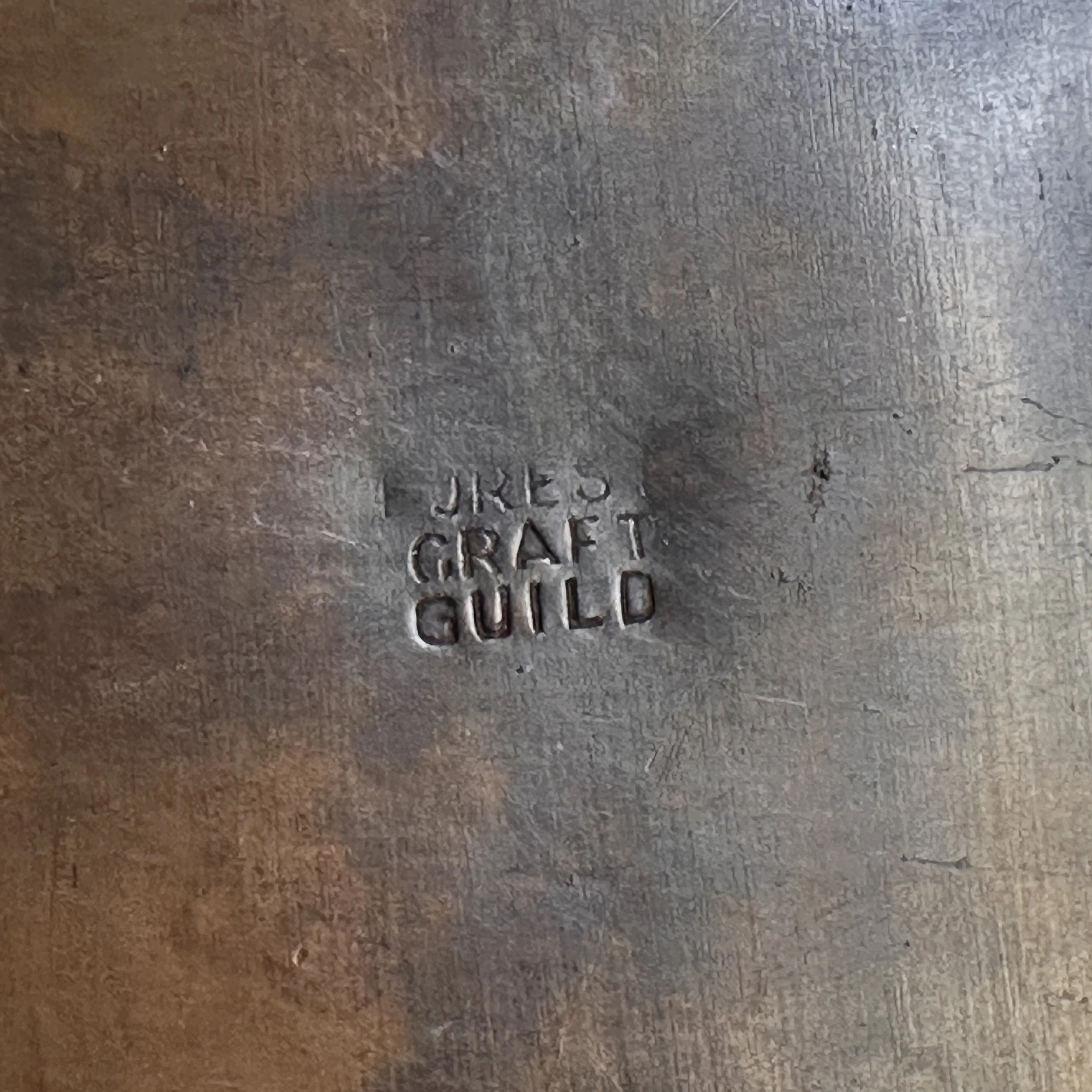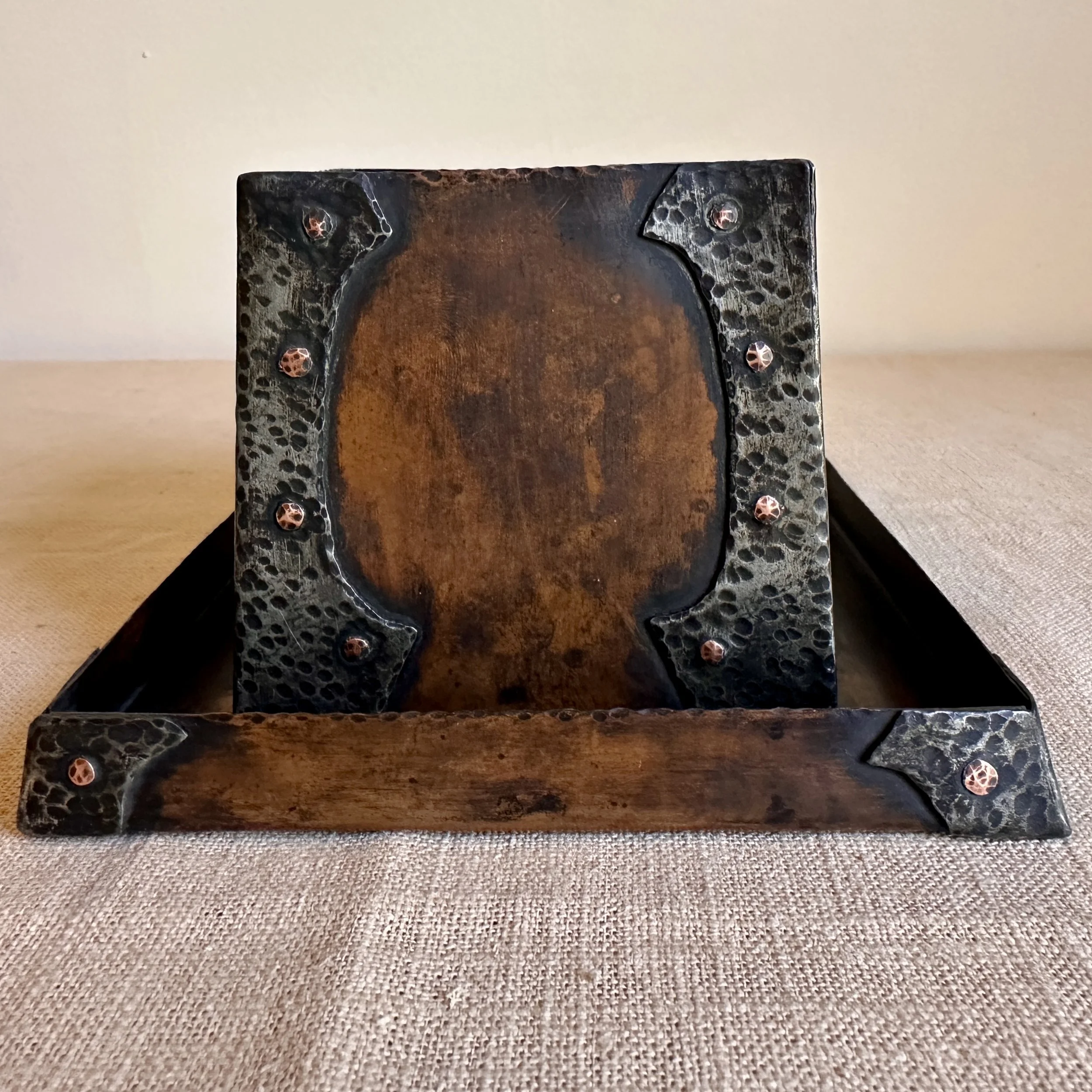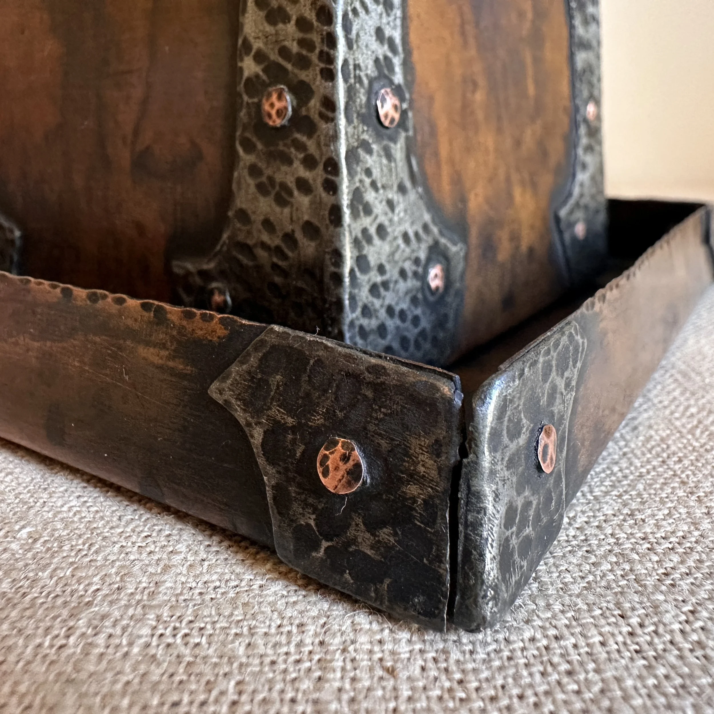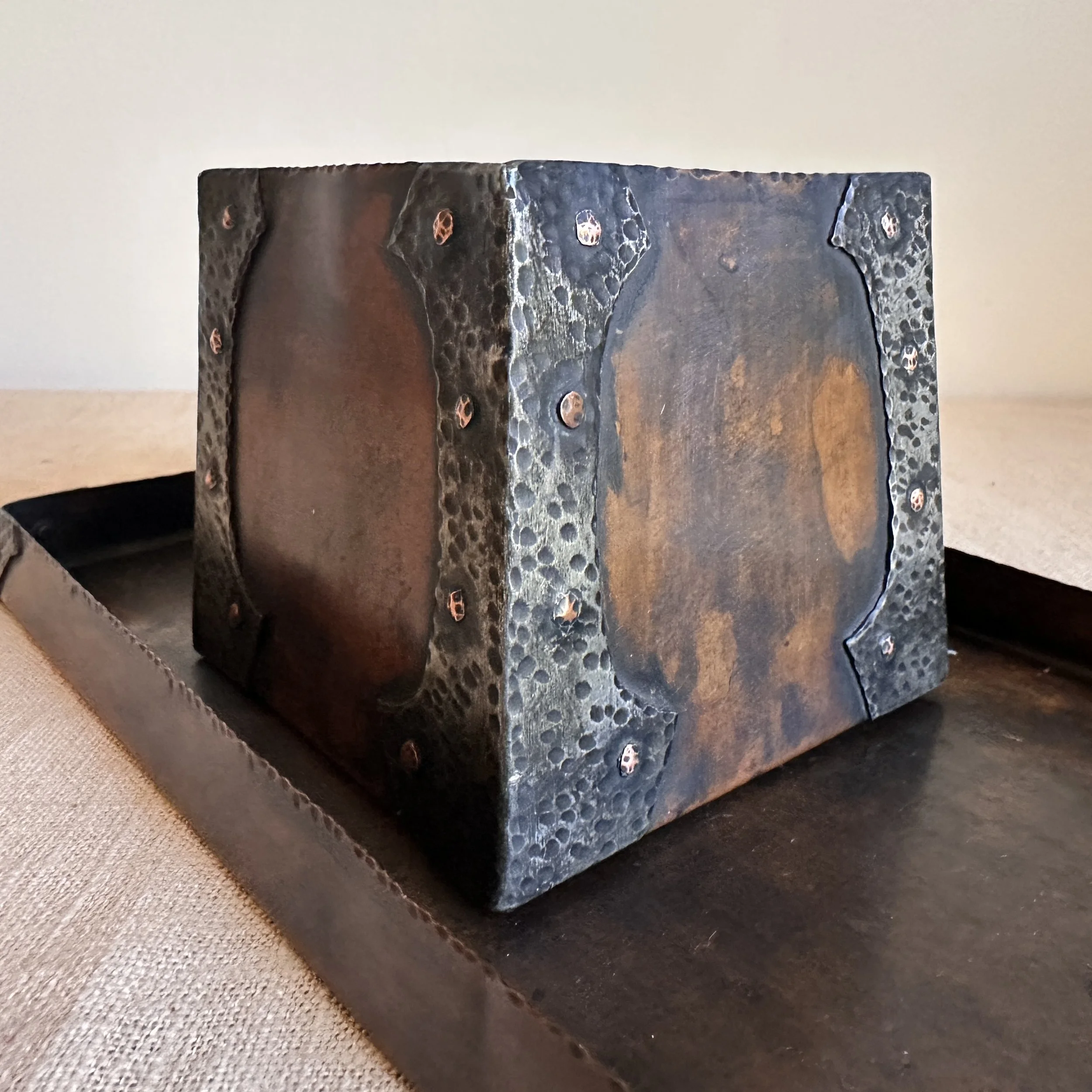 Forest Craft Guild desk items, Grand Rapids MI circa 1906. A hammered copper tray and container box, the corners finished with riveted hammered german silver. Original patina, large tray signed on bottom. Tray measures 11” by 6” and box is 3.75” by 3.5” tall. $600