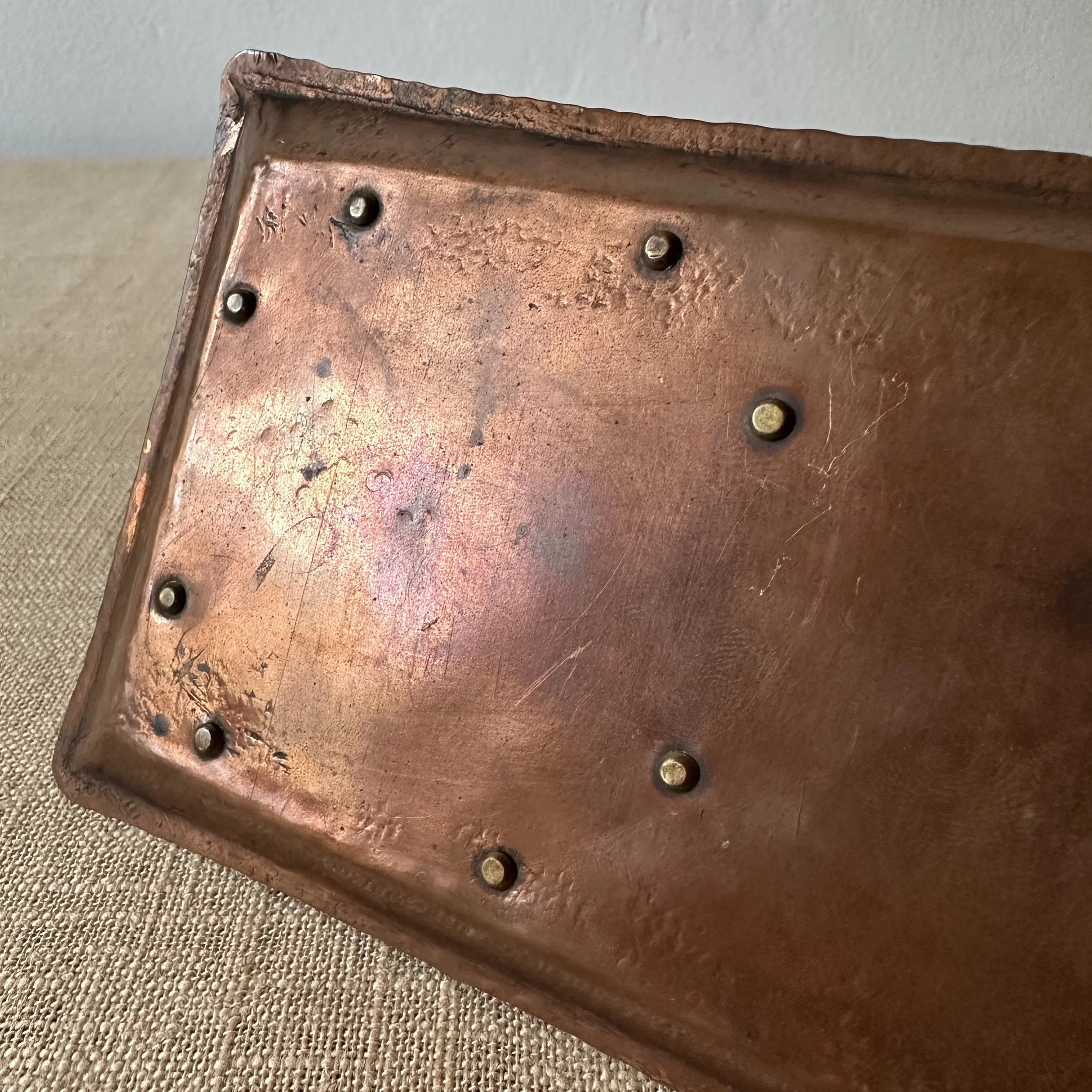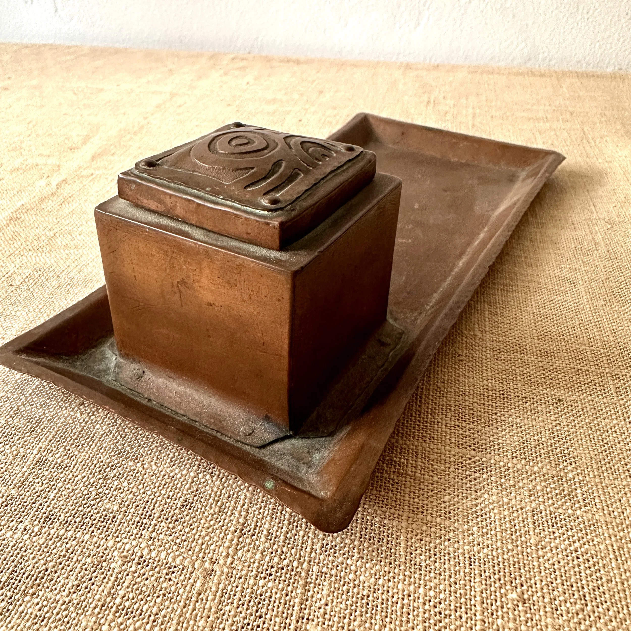 Forest Craft Guild desk set, Grand Rapids MI circa 1908. A hammered and etched copper letter file and combination inkwell / pen tray. The Guild was quite modern in their abstract design work as seen here with swirling circle and line work. The front of file and inkwell lid are both hammered out for added depth, both retain the original brown patina. Unmarked, but well documented FCG forms. Inkwell measures 9” by 4” and 2.5” tall, file is 6” by 4” and 2.5” deep. $450