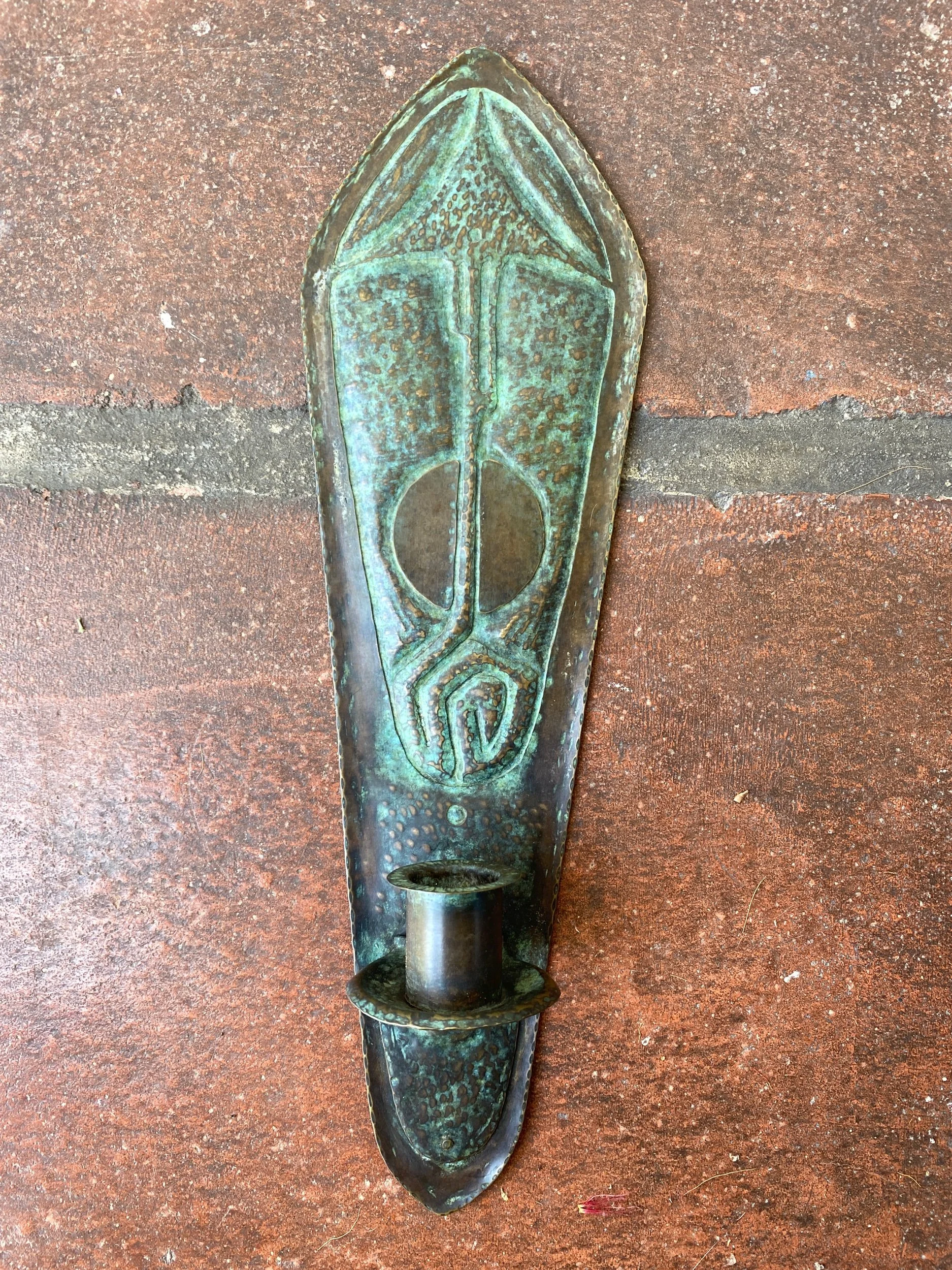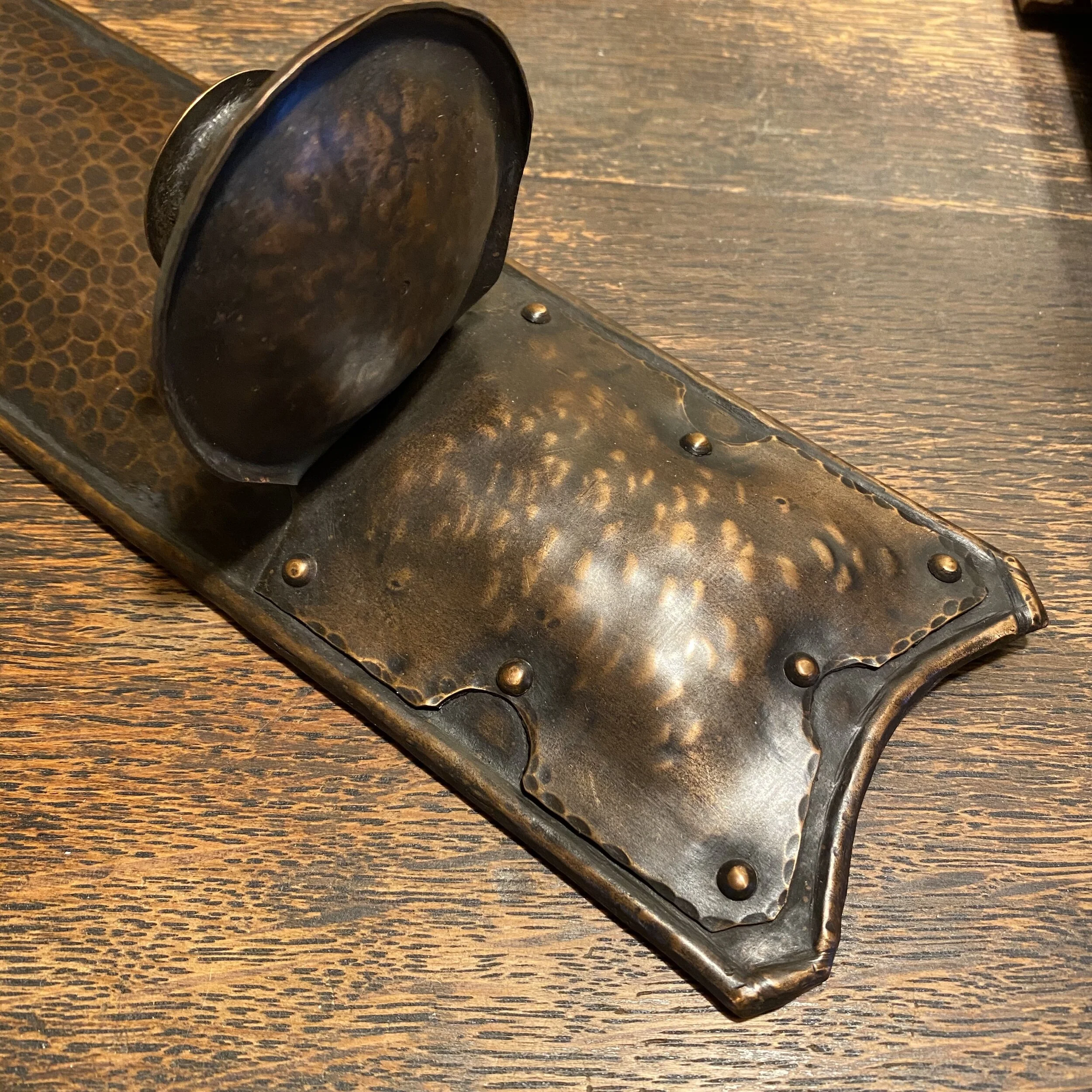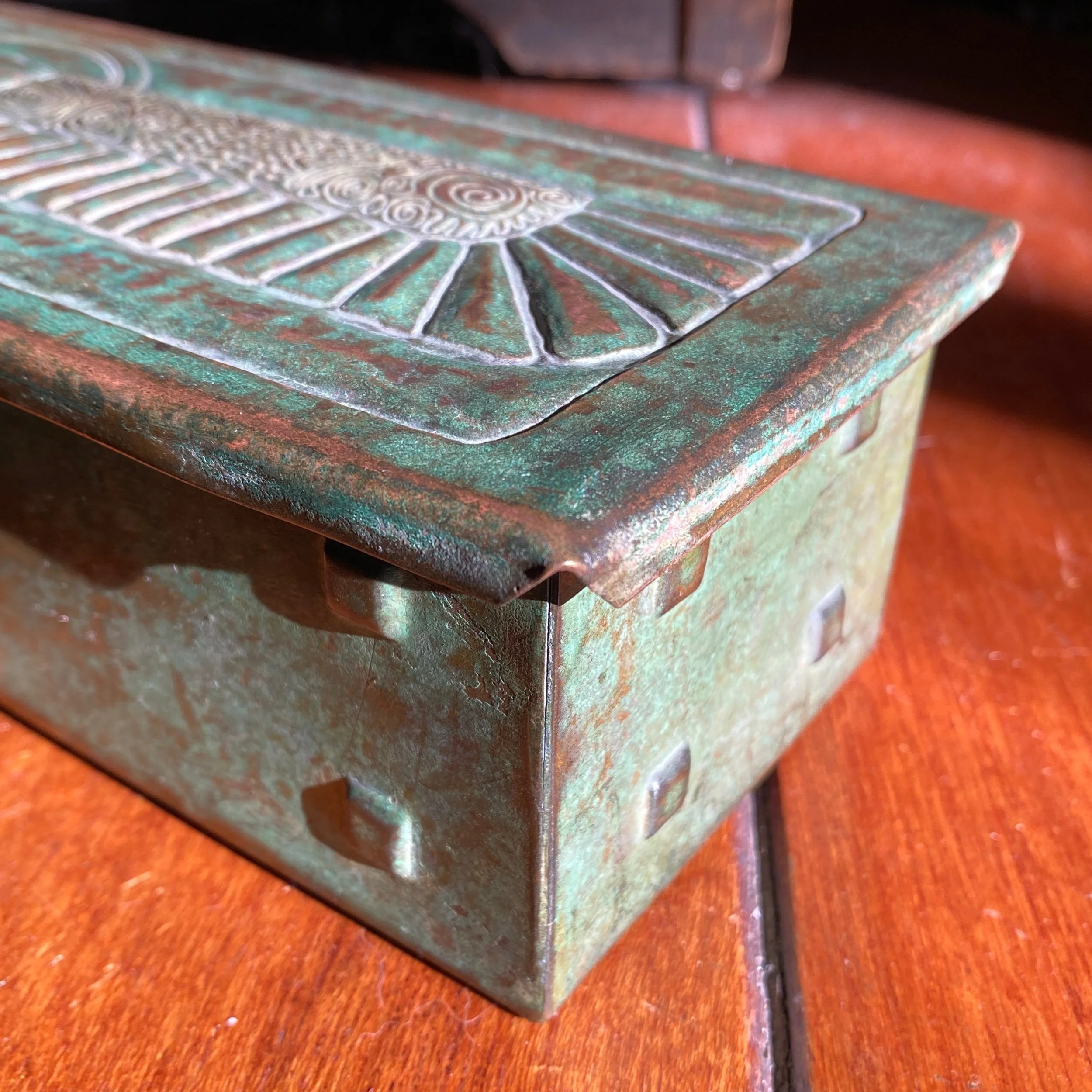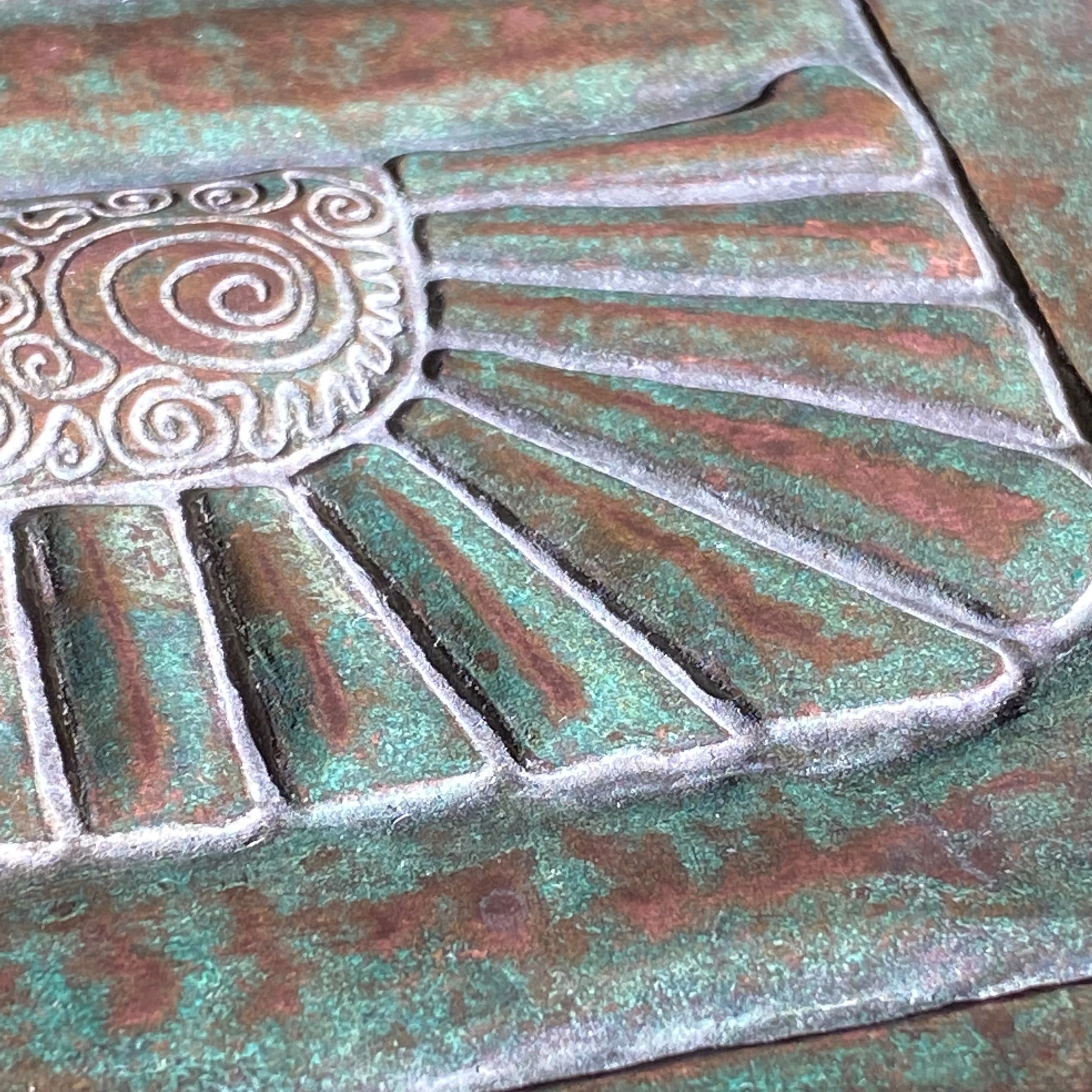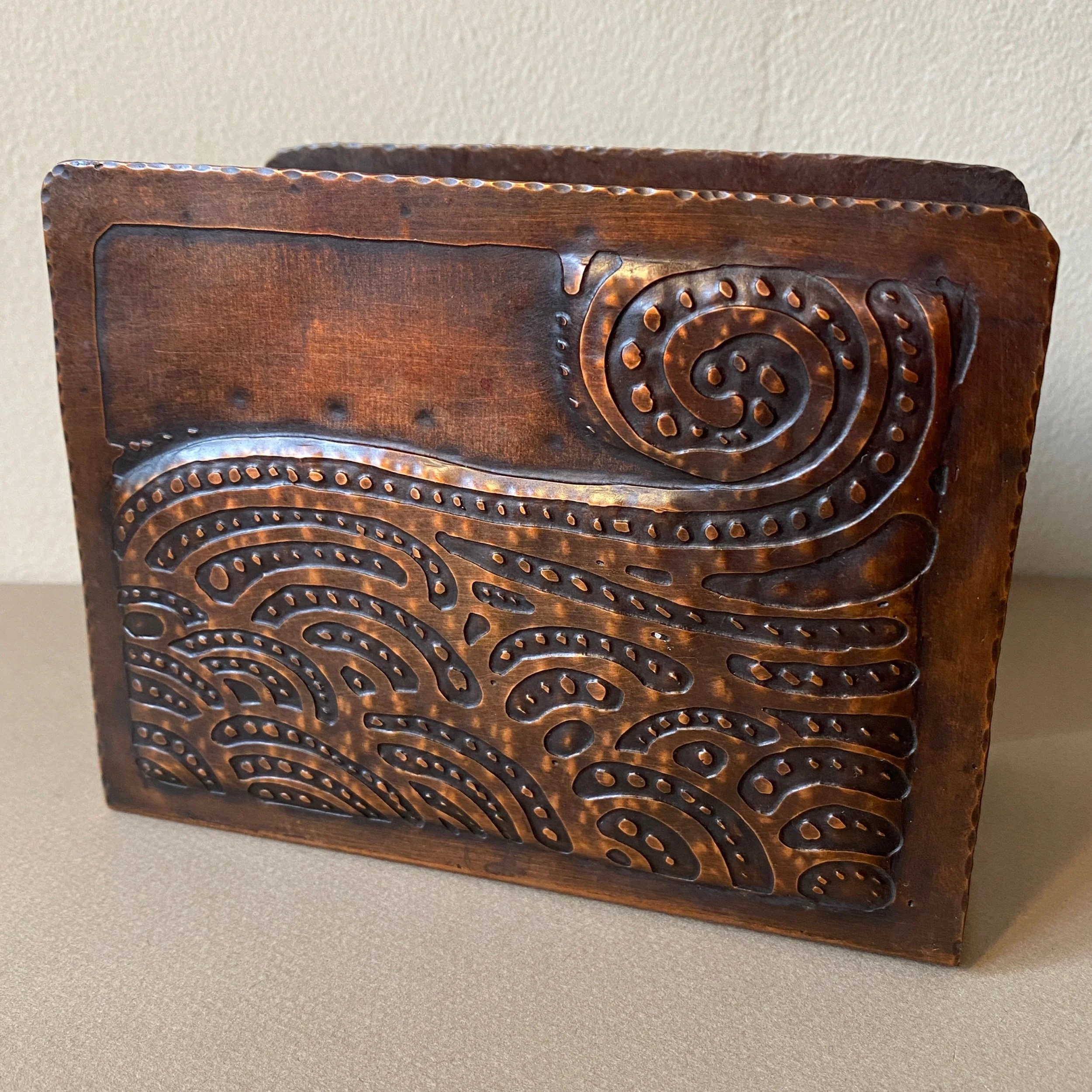 Forest Craft Guild copper & brass pieces will have a finely finished edge; a subtle hammering all the way around the borders. Unmarked pieces can be identified by their standard patterns and designs. As evident in the photos here, look for square & dot repoussé patterns; scarab motifs; dragons, abstract whiplash, Celtic, or geometric acid-etched work; stones of the same color/size; and reticulated scenes that repeat in various objects.