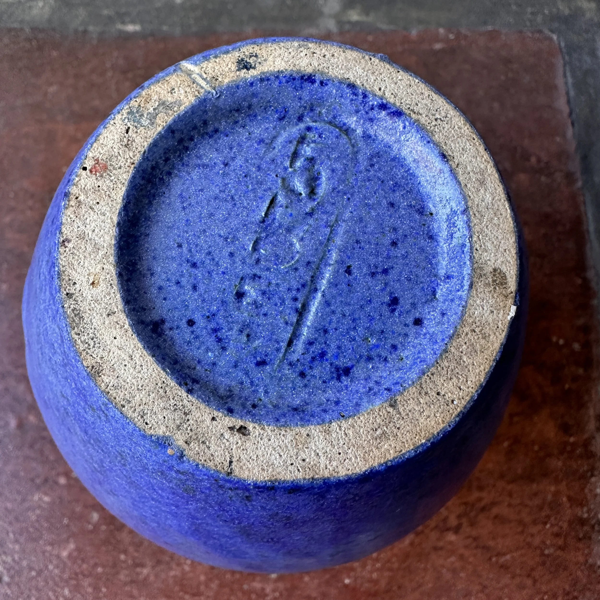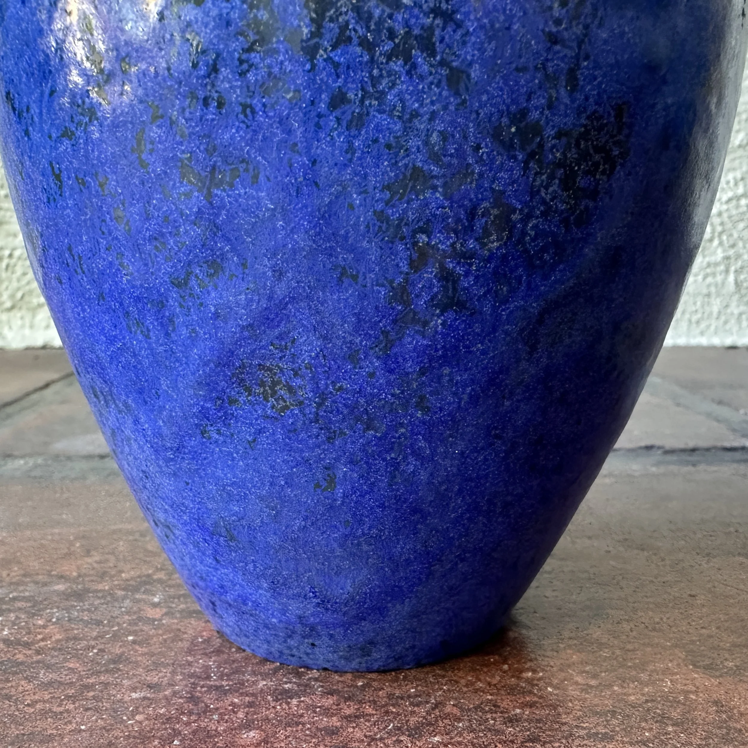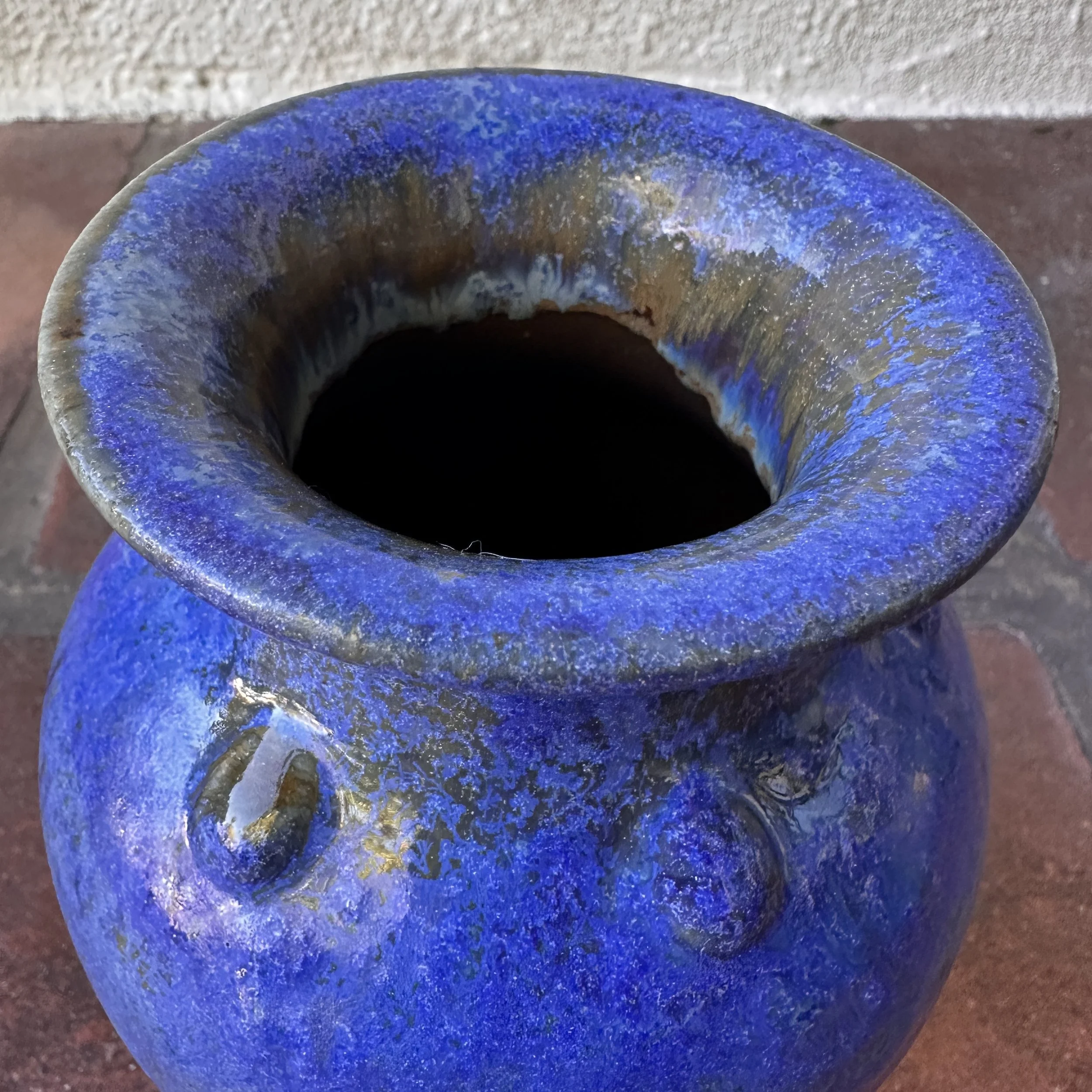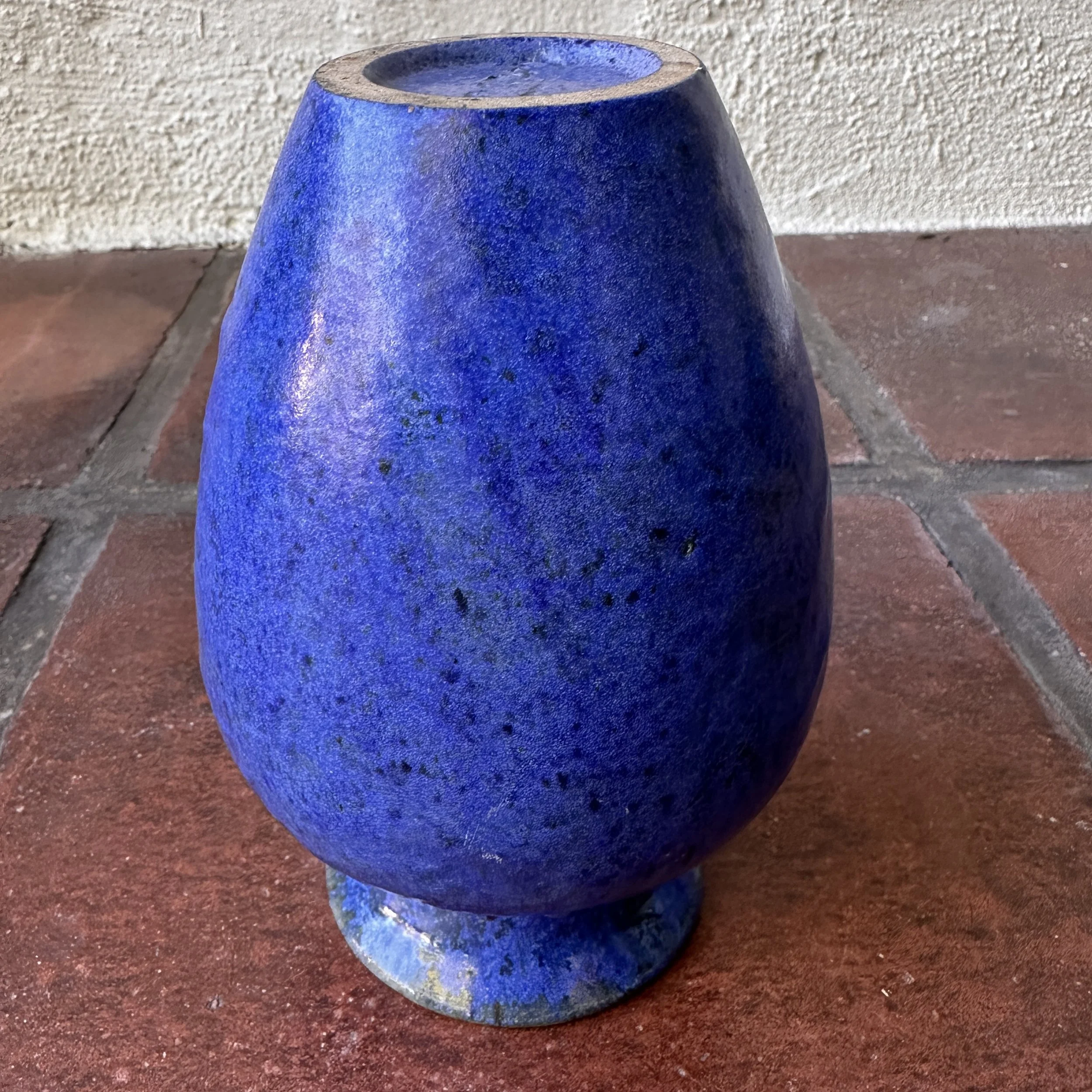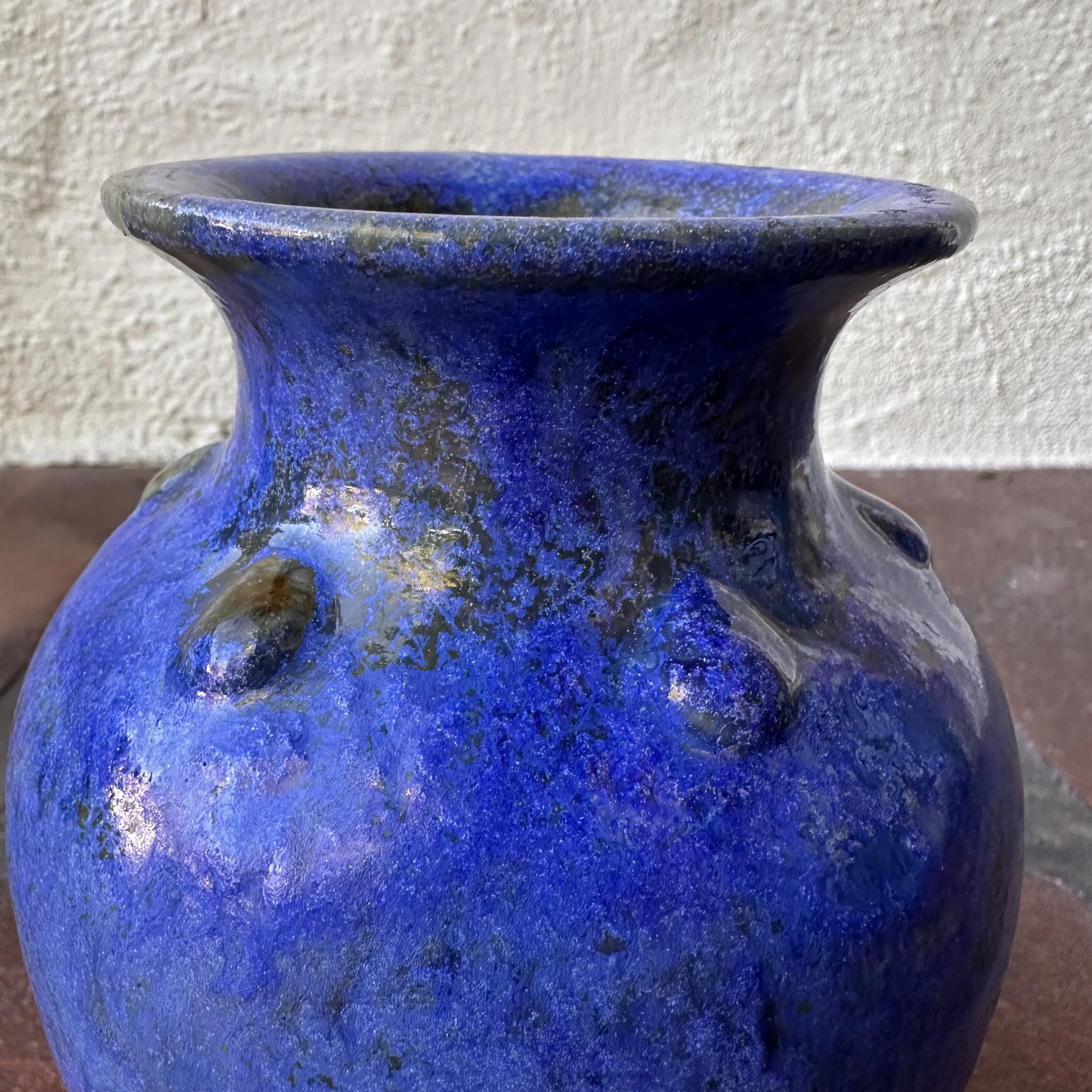 Fulper Pottery vase, Flemington NY circa 1920. An unusual form with the added raised buttons around the top, body covered in a thick blue glaze with a darker blackish-green underglaze. Signed on base, excellent condition. Measures 7.25” tall and 5” wide. $250